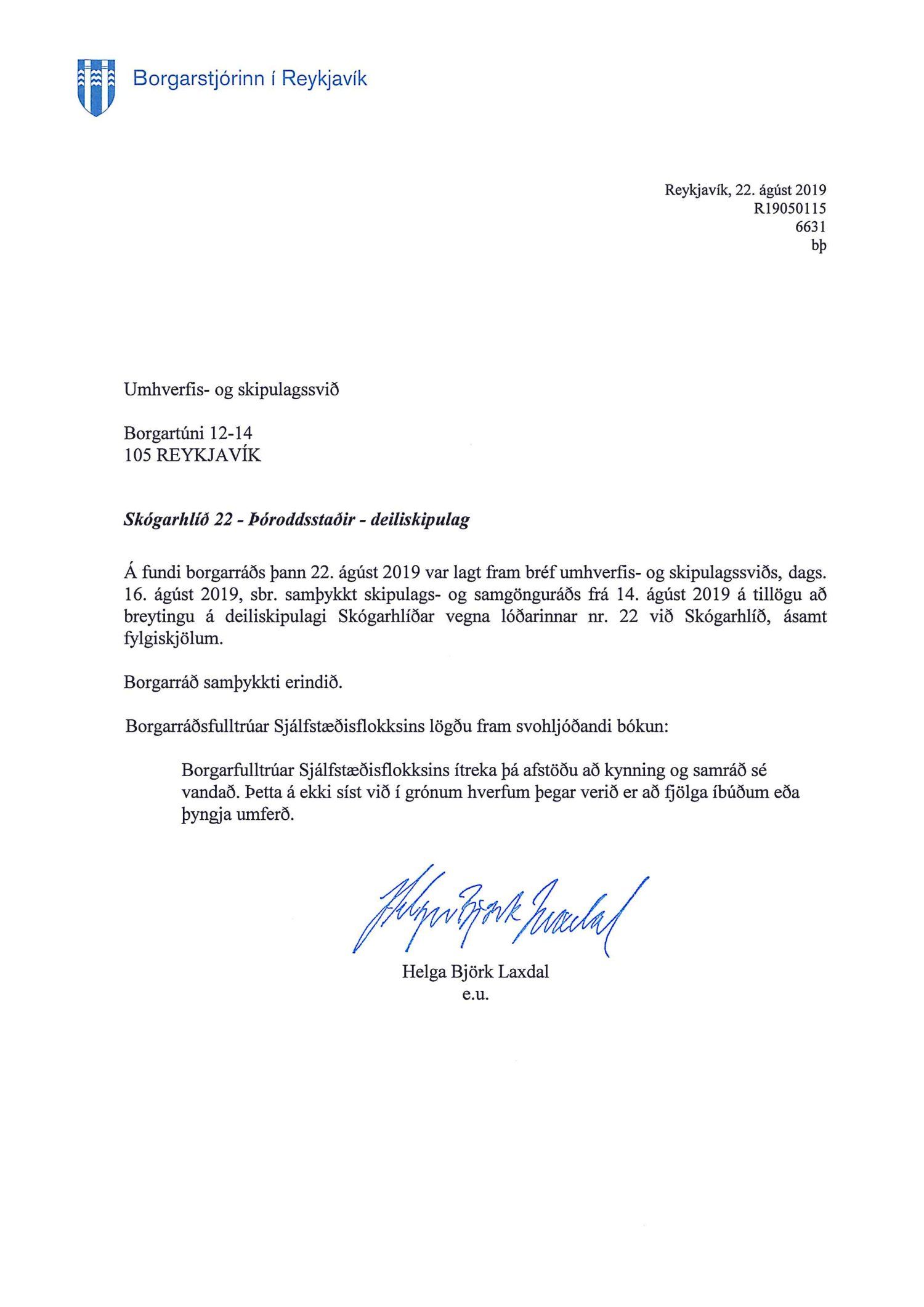 Lagt fram bréf borgarstjóra dags. 22. ágúst 2019 vegna samþykktar borgarráðs frá s.d. á tillögu að breytingu á deiliskipulagi Skógarhlíðar vegna lóðarinnar nr. 22 við Skógarhlíð.