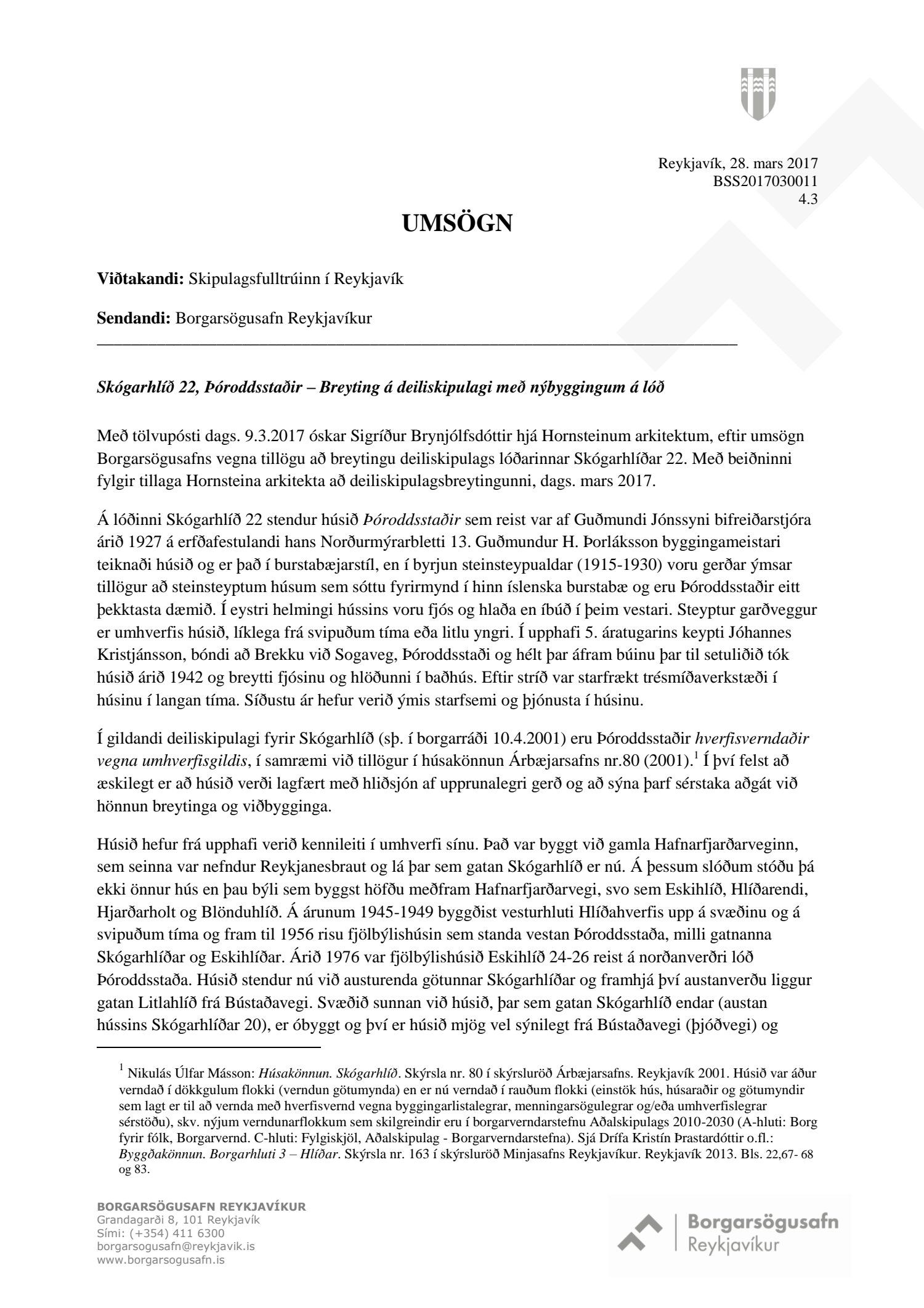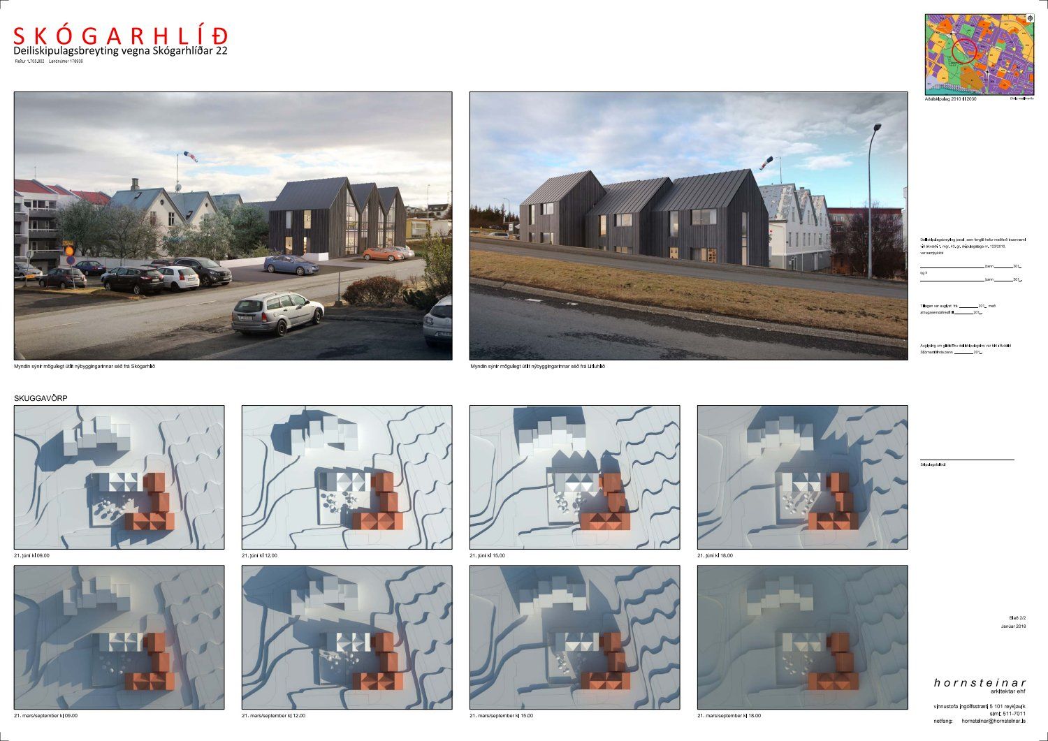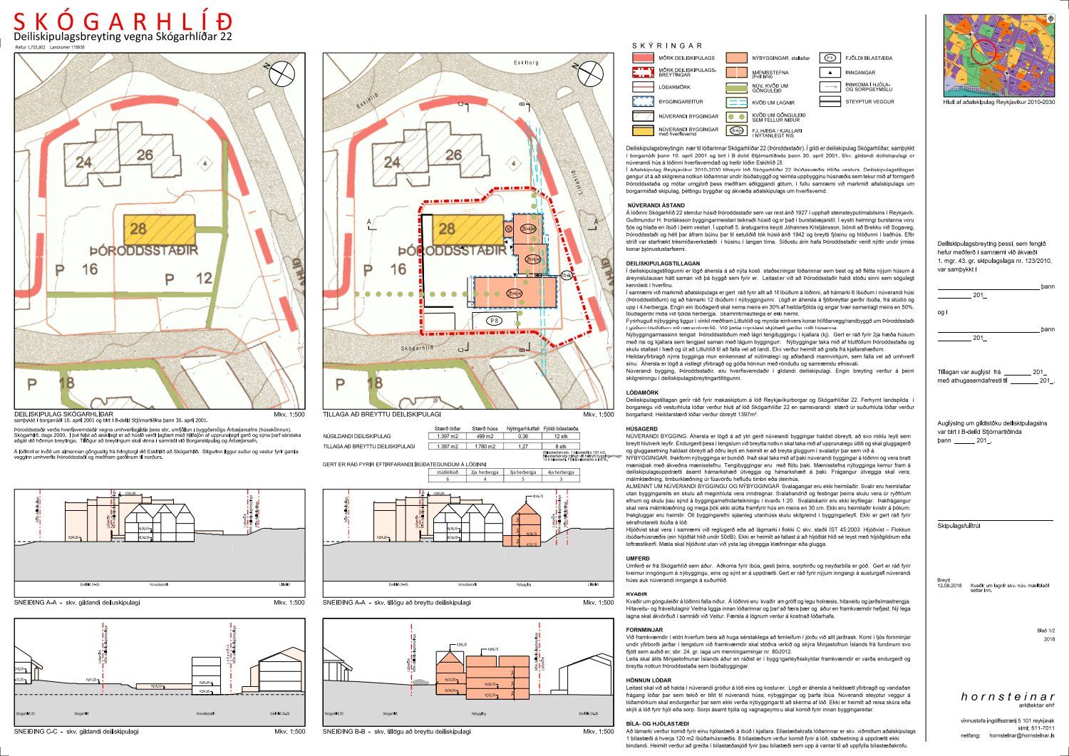 mótt. 1. desember 2016 varðandi breytingu á deiliskipulagi Skógarhlíðar vegna lóðarinnar nr. 22 við Skógarhlíð. Í breytingunni felst að að skilgreina notkun lóðarinnar undir íbúðabyggð og heimila uppbyggingu húsnæðis sem tekur mið af formgerð Þóroddsstaða. Heimilt verði að byggja allt að 18 íbúðir á lóðinni, að hámarki 6 íbúðir í núverandi húsi (Þóroddsstöðum) og að hámarki 12 íbúðir í nýbyggingunni, samkvæmt deiliskipulags- og skýringaruppdr.