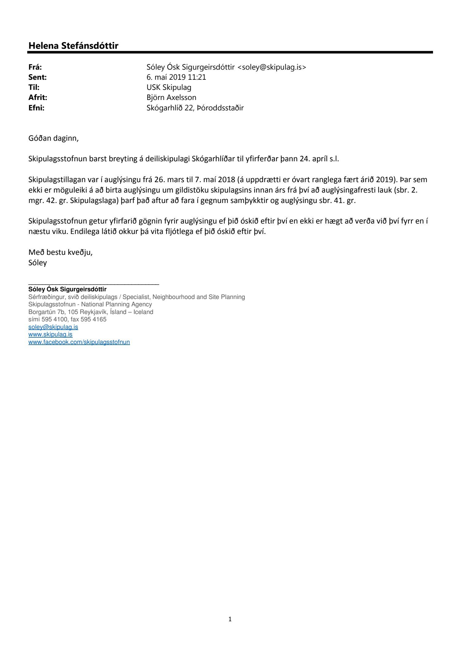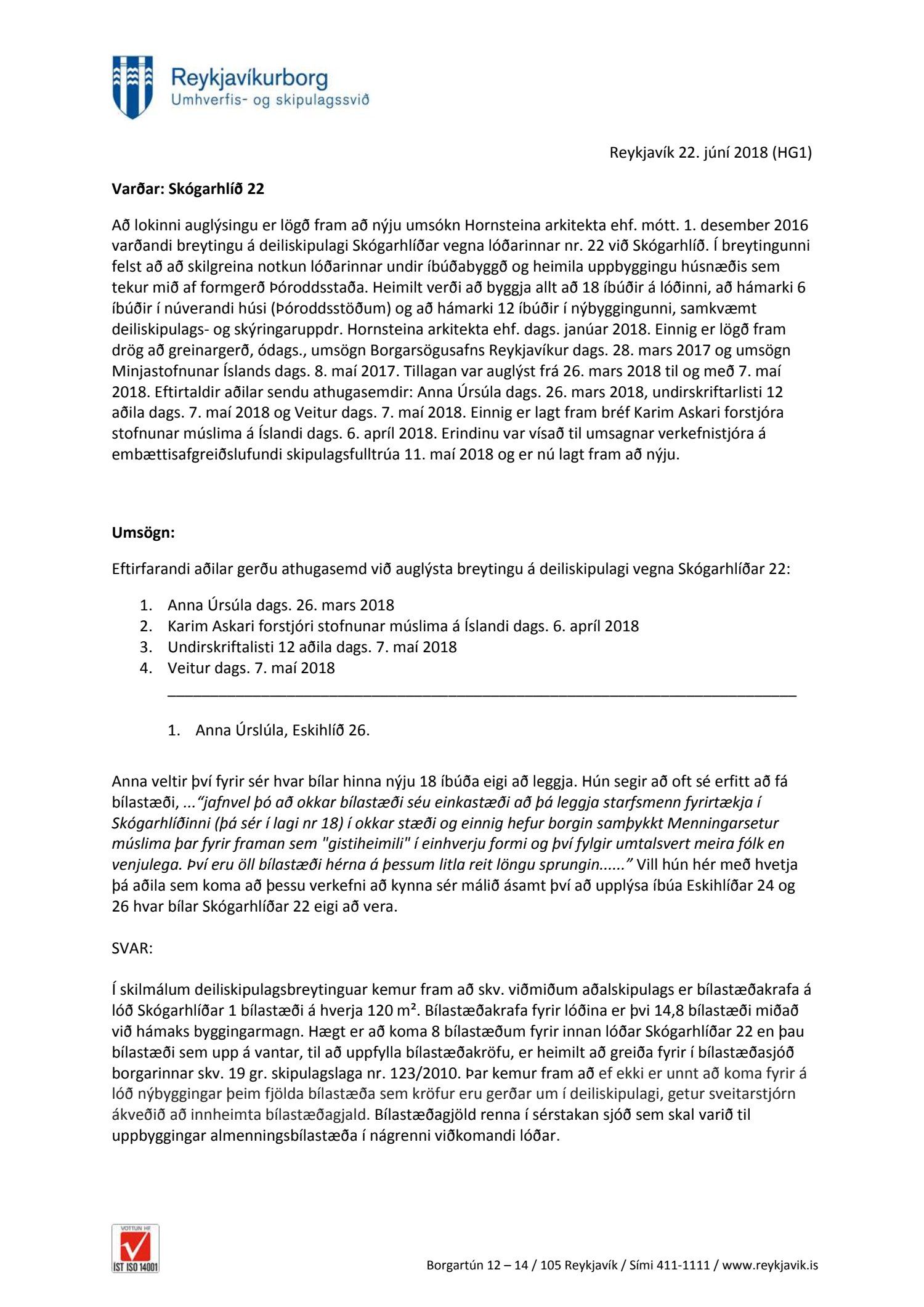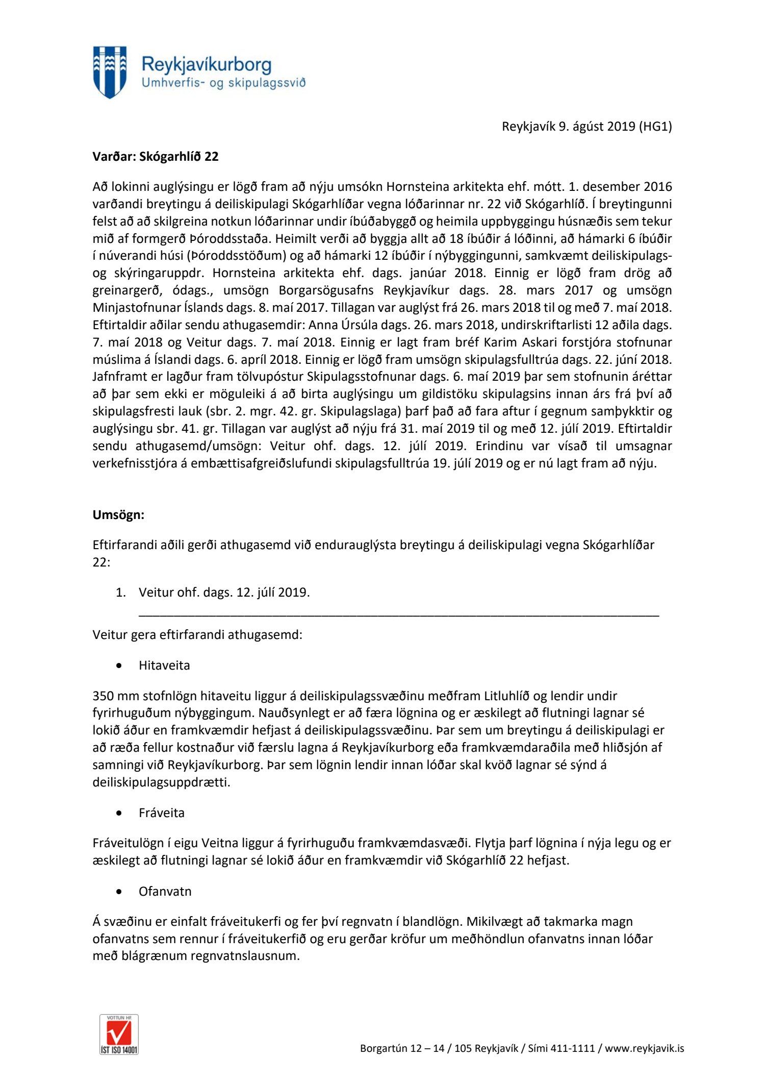 dags. janúar 2018. Einnig er lögð fram drög að greinargerð, ódags., umsögn Borgarsögusafns Reykjavíkur dags. 28. mars 2017 og umsögn Minjastofnunar Íslands dags. 8. maí 2017. Tillagan var auglýst frá 26. mars 2018 til og með 7. maí 2018. Eftirtaldir aðilar sendu athugasemdir: Anna Úrsúla dags. 26. mars 2018, undirskriftarlisti 12 aðila dags. 7. maí 2018 og Veitur dags. 7. maí 2018. Einnig er lagt fram bréf Karim Askari forstjóra stofnunar múslima á Íslandi dags. 6. apríl 2018. Einnig er lögð fram umsögn skipulagsfulltrúa dags. 22. júní 2018. Jafnframt er lagður fram tölvupóstur Skipulagsstofnunar dags. 6. maí 2019 þar sem stofnunin áréttar að þar sem ekki er möguleiki á að birta auglýsingu um gildistöku skipulagsins innan árs frá því að skipulagsfresti lauk (sbr. 2. mgr. 42. gr. Skipulagslaga) þarf það að fara aftur í gegnum samþykktir og auglýsingu sbr. 41. gr. Tillagan var auglýst að nýju frá 31. maí 2019 til og með 12. júlí 2019. Eftirtaldir sendu athugasemd/umsögn: