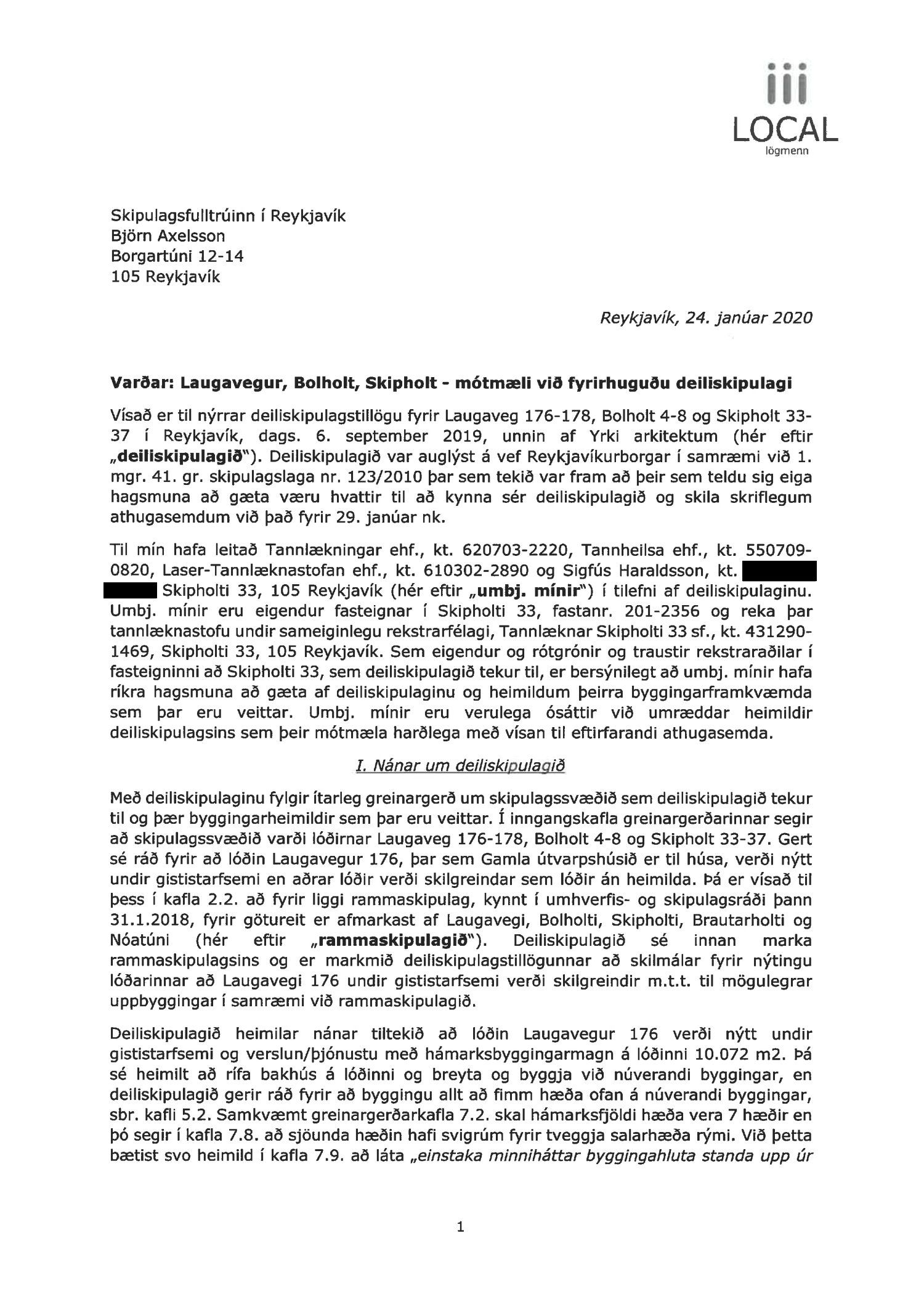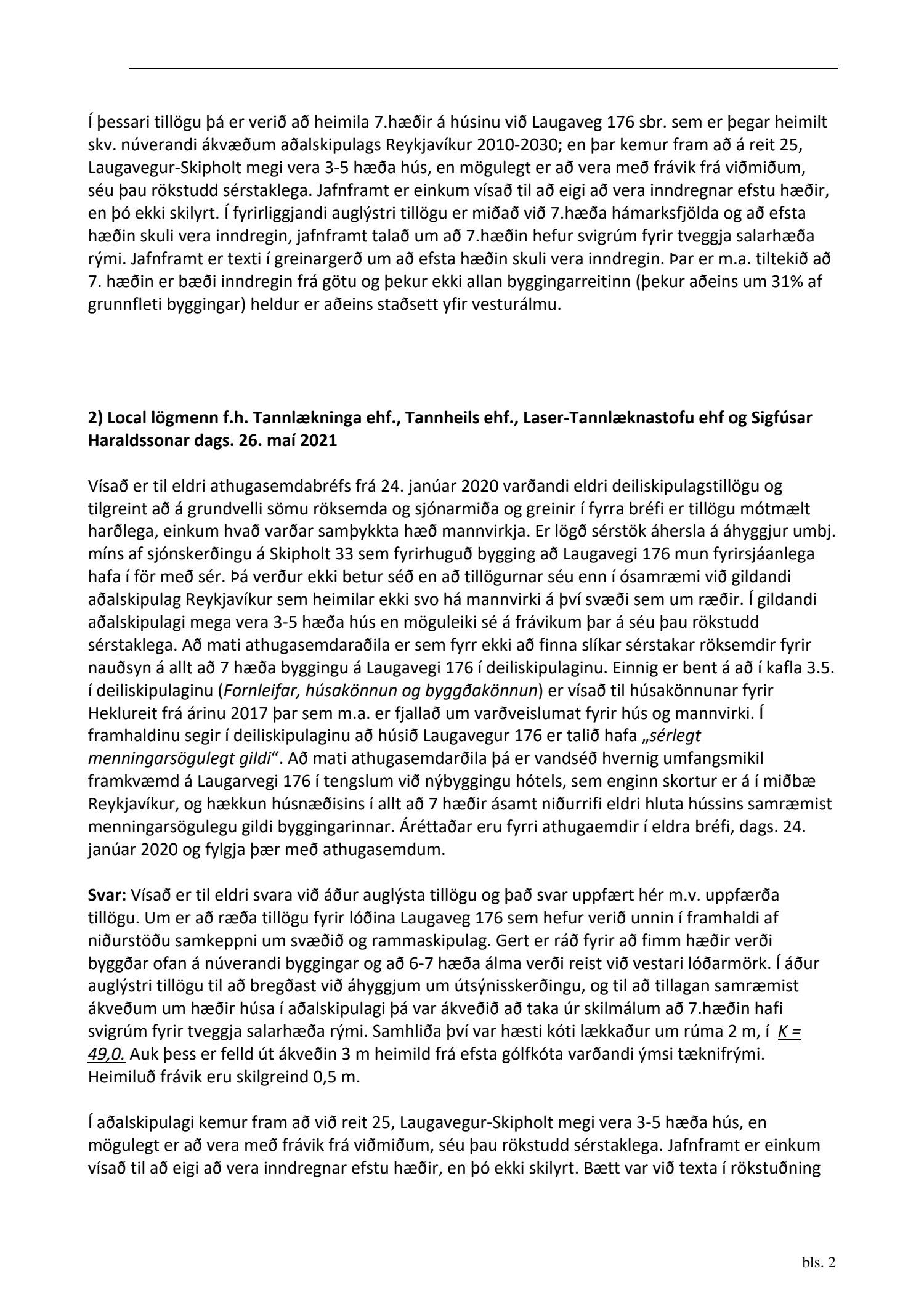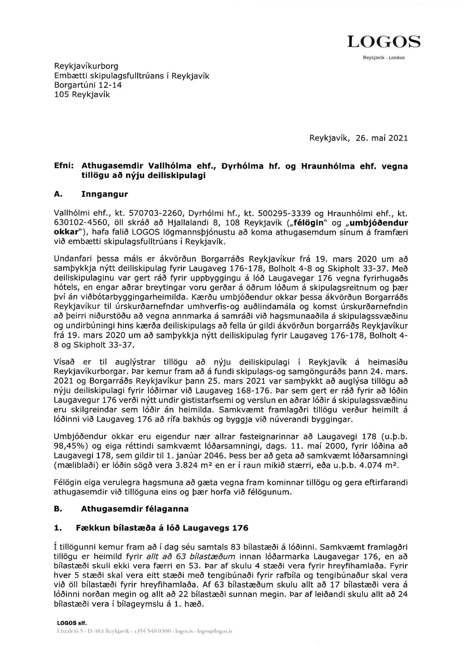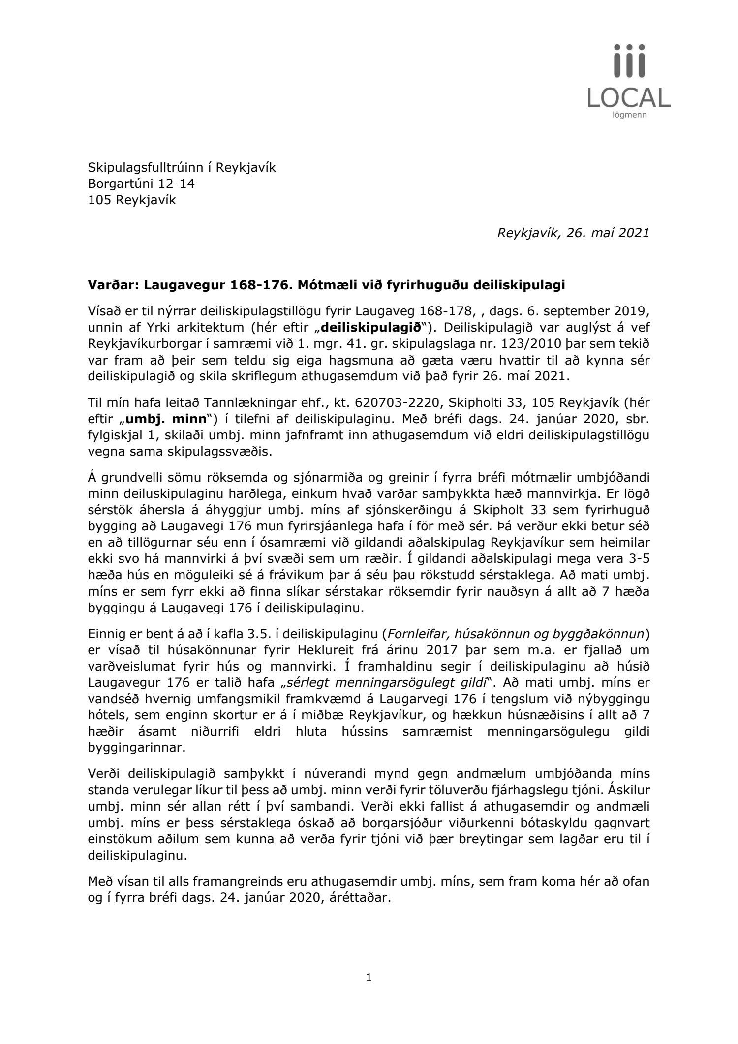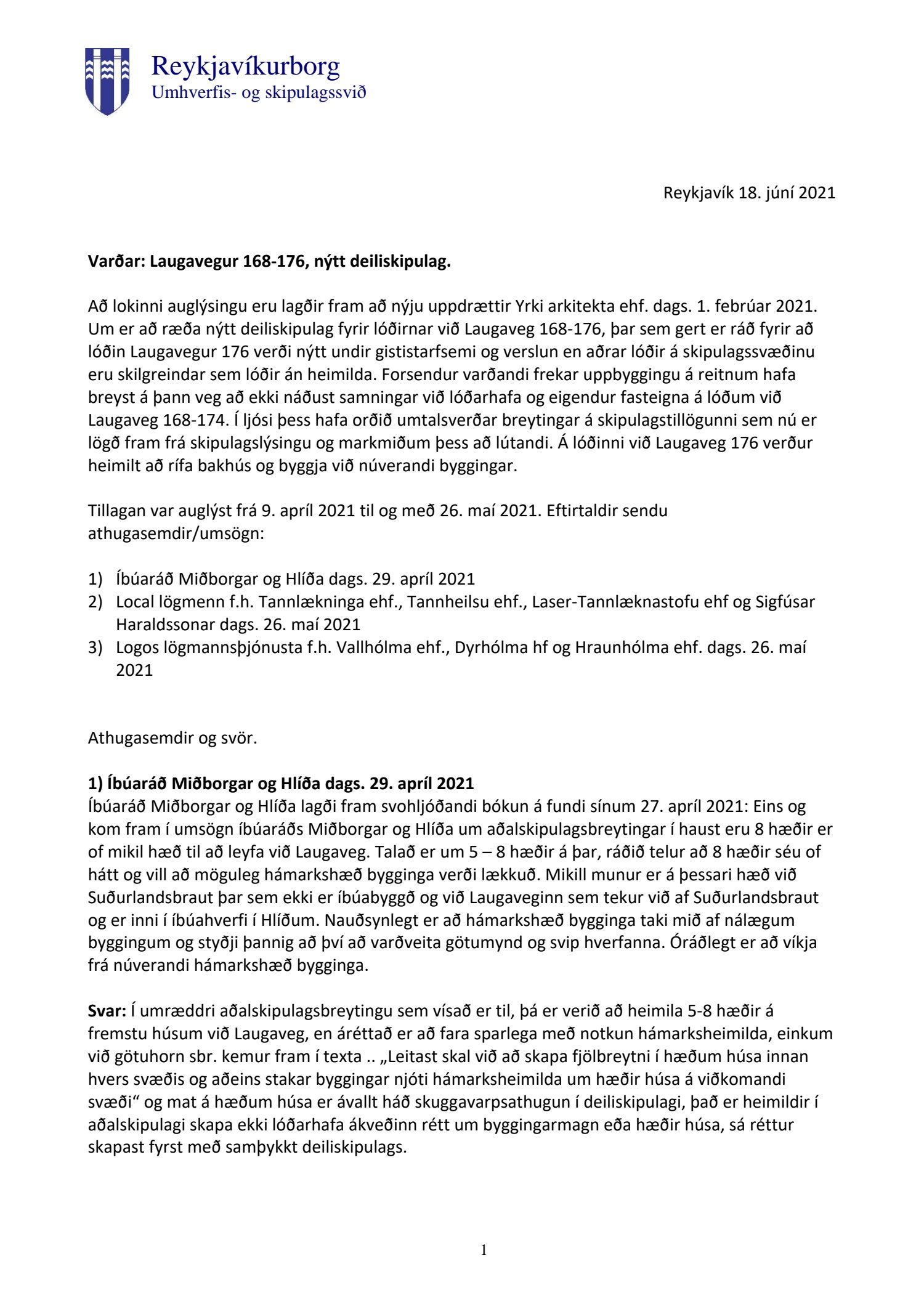 dags. 1. febrúar 2021. Um er að ræða nýtt deiliskipulag fyrir lóðirnar við Laugaveg 168-176, þar sem gert er ráð fyrir að lóðin Laugavegur 176 verði nýtt undir gististarfsemi og verslun en aðrar lóðir á skipulagssvæðinu eru skilgreindar sem lóðir án heimilda. Á lóðinni við Laugaveg 176 verður heimilt að rífa bakhús og byggja við núverandi byggingar, sjá nánar tillögu. Einnig er lagt fram minnisblað VSÓ ráðgjafar dags. 2. júlí 2019. Tillagan var auglýst frá 9. apríl 2021 til og með 26. maí 2021. Eftirtaldir sendur athugasemdir/umsögn: íbúaráð Miðborgar og Hlíða dags. 29. apríl 2021, Local lögmenn f.h. Tannlækninga ehf., Tannheilsu ehf., Laser-Tannlæknastofu ehf og Sigfúsar Haraldssonar dags. 26. maí 2021 og Logos lögmannsþjónusta f.h. Vallhólma ehf., Dyrhólma hf og Hraunhólma ehf. dags. 26. maí 2021. Einnig er lögð fram umsögn skipulagsfulltrúa, dags. 18. júní 2021.