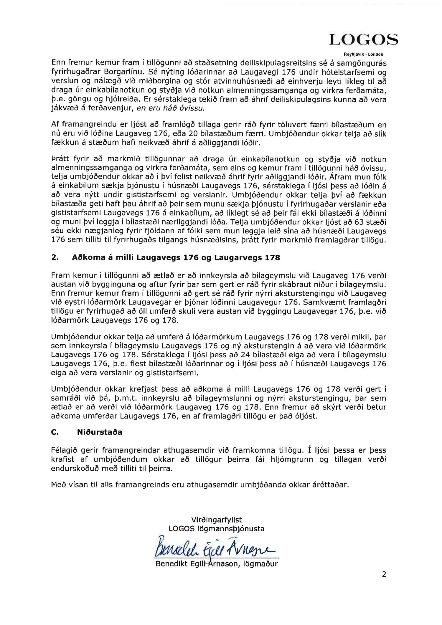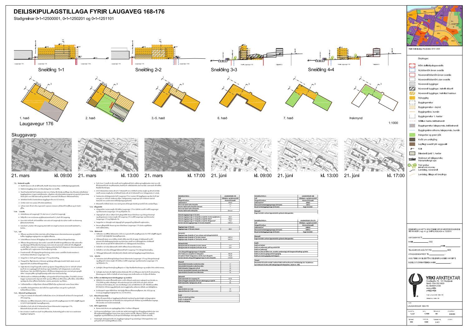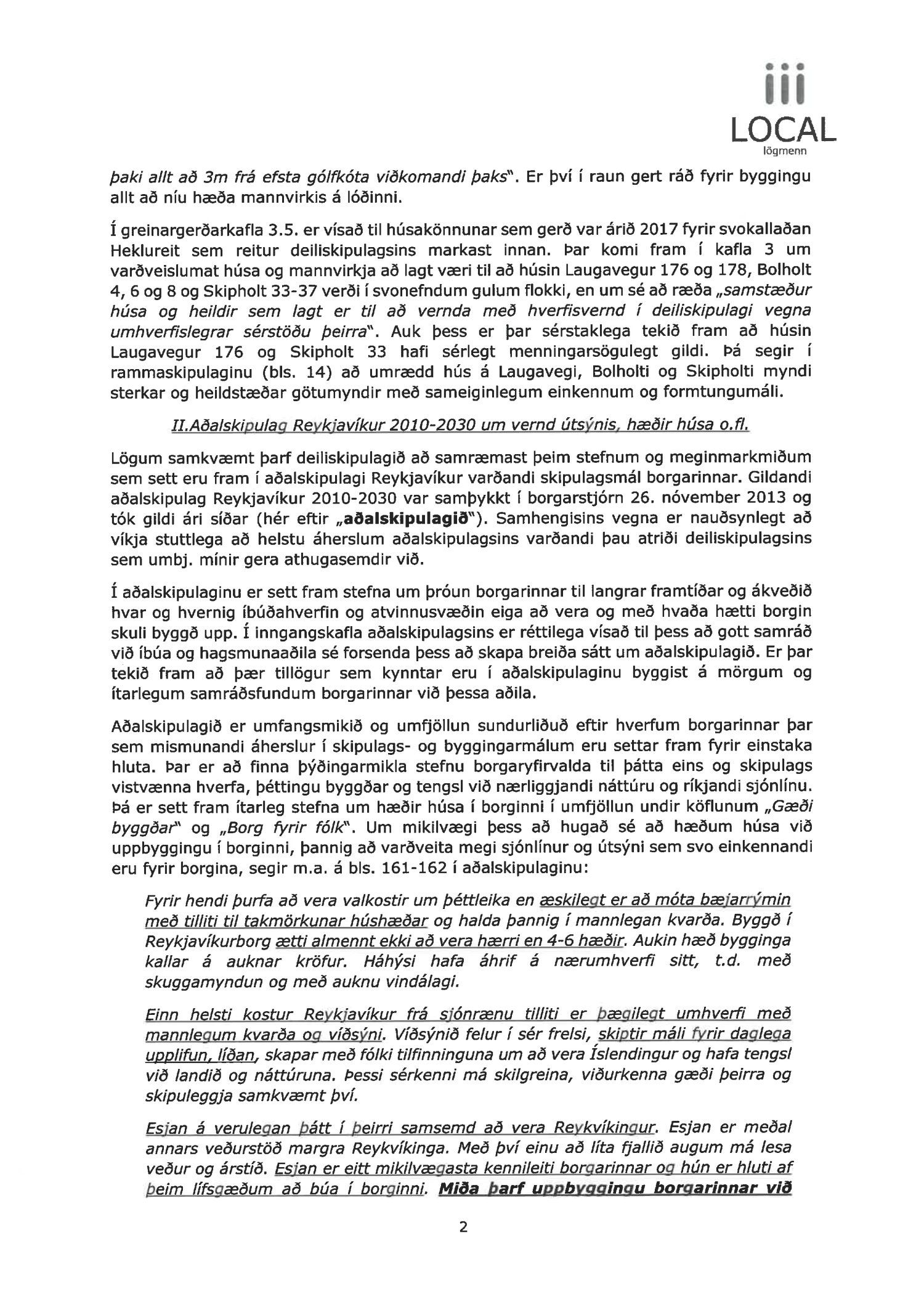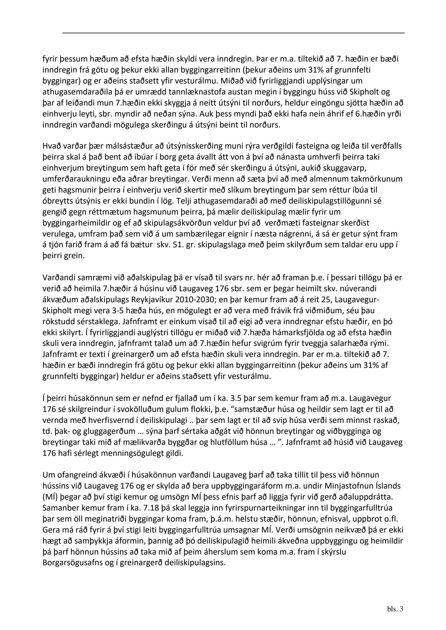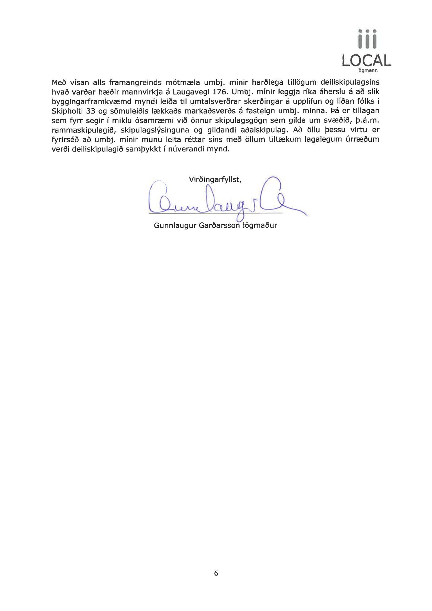 dags. 1. febrúar 2021. Um er að ræða nýtt deiliskipulag fyrir lóðirnar við Laugaveg 168-176, þar sem gert er ráð fyrir að lóðin Laugavegur 176 verði nýtt undir gististarfsemi og verslun en aðrar lóðir á skipulagssvæðinu eru skilgreindar sem lóðir án heimilda. Á lóðinni við Laugaveg 176 verður heimilt að rífa bakhús og byggja við núverandi byggingar, sjá nánar tillögu. Einnig er lagt fram minnisblað VSÓ ráðgjafar dags. 2. júlí 2019. Tillagan var auglýst frá 9. apríl 2021 til og með 26. maí 2021. Eftirtaldir sendur athugasemdir/umsögn: íbúaráð Miðborgar og Hlíða dags. 29. apríl 2021, Local lögmenn f.h. Tannlækninga ehf., Tannheilsu ehf., Laser-Tannlæknastofu ehf og Sigfúsar Haraldssonar dags. 26. maí 2021 og Logos lögmannsþjónusta f.h. Vallhólma ehf., Dyrhólma hf og Hraunhólma ehf. dags. 26. maí 2021. Einnig er lögð fram umsögn skipulagsfulltrúa, dags. 18. júní 2021.