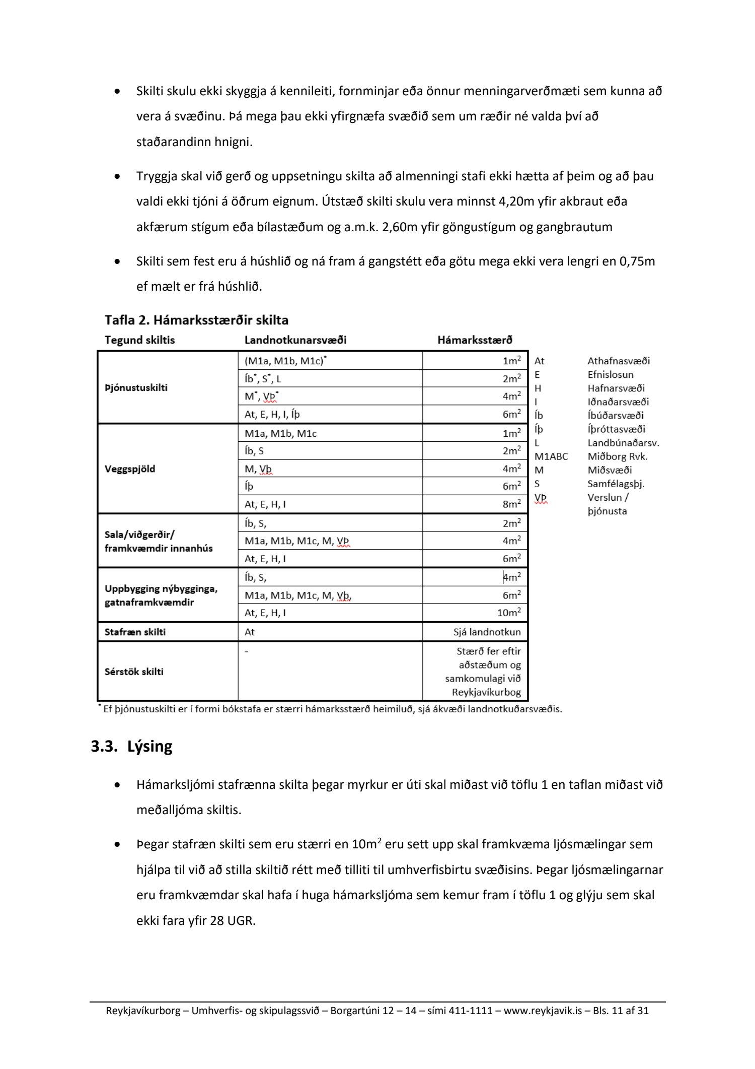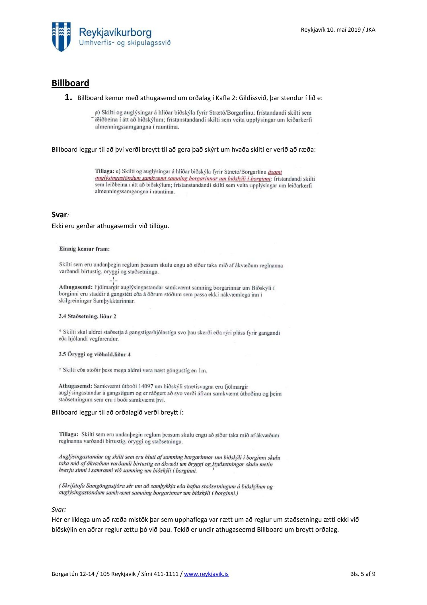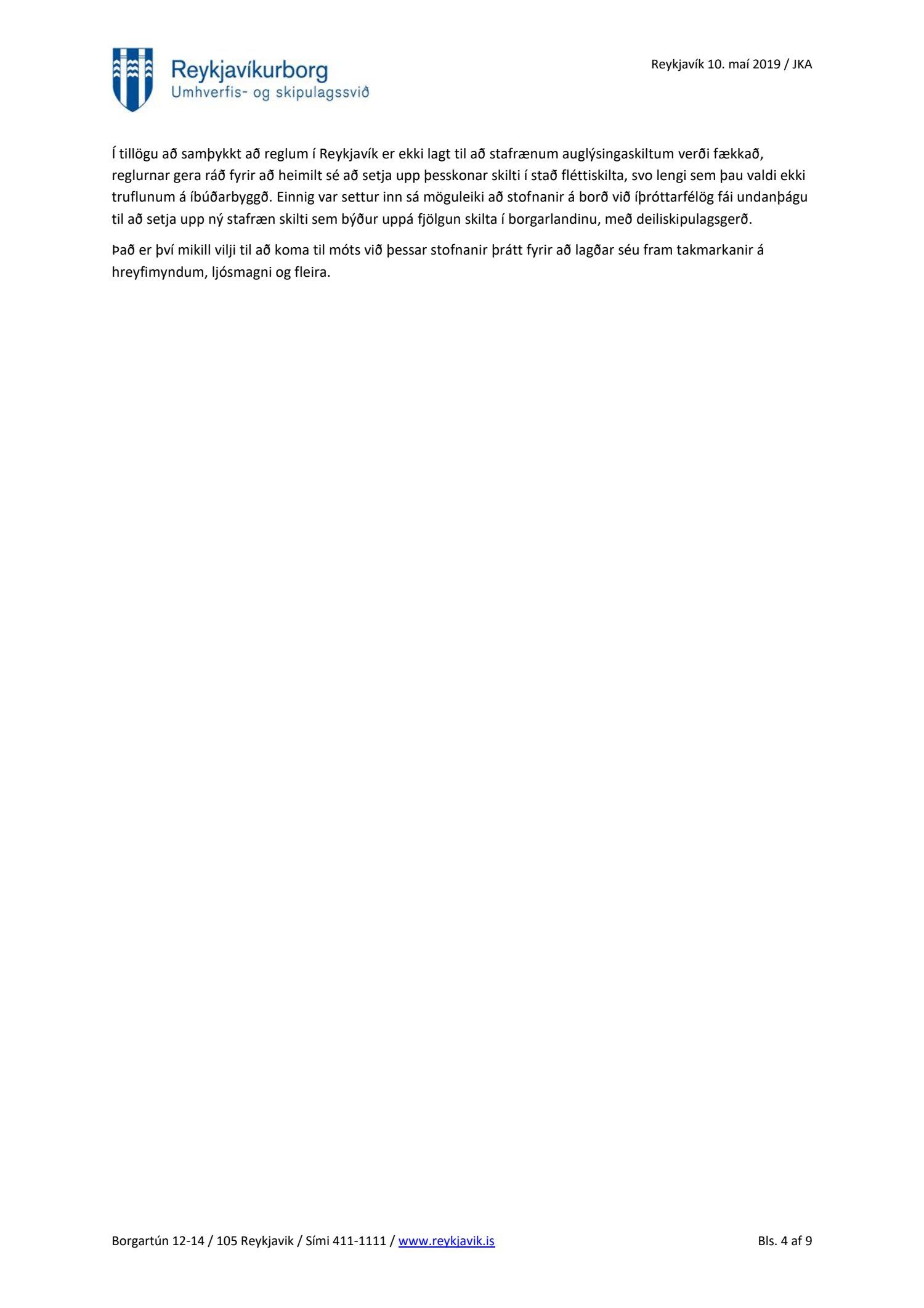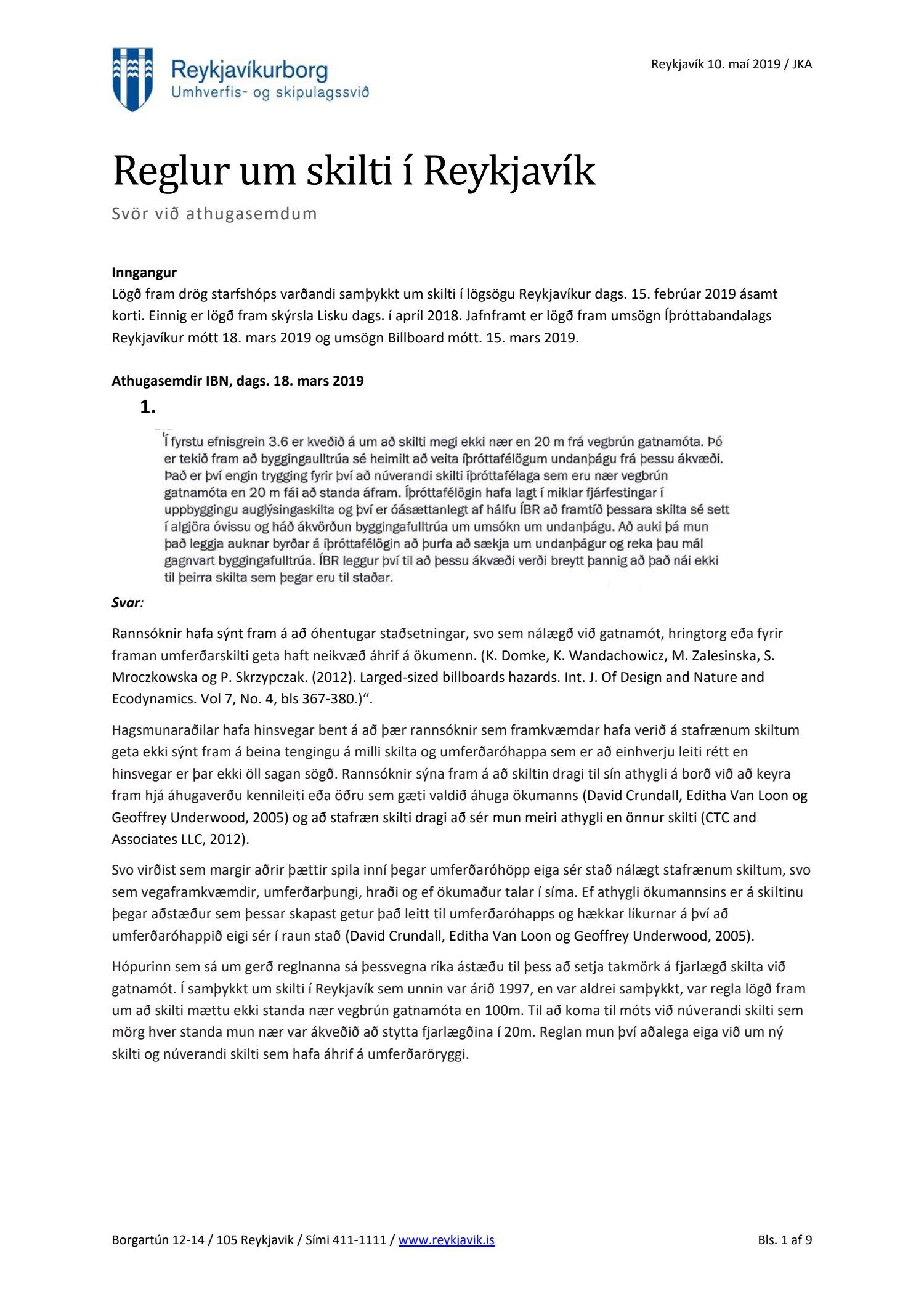 Lagt fram minnisblað umhverfis- og skipulagssviðs dags. 9. mars 2020, varðandi samþykkt um skilti í lögsögu Reykjavíkur dags. 10. maí 2019, ásamt korti, þar sem lagðar eru til breytingar á samþykktinni. Einnig er lögð fram skýrsla Lisku dags. í apríl 2018, umsögn Íþróttabandalags Reykjavíkur mótt. 18. mars 2019 og umsögn Billboard mótt. 18. mars 2019 og umsögn skipulagsfulltrúa dags. 10. maí 2019.