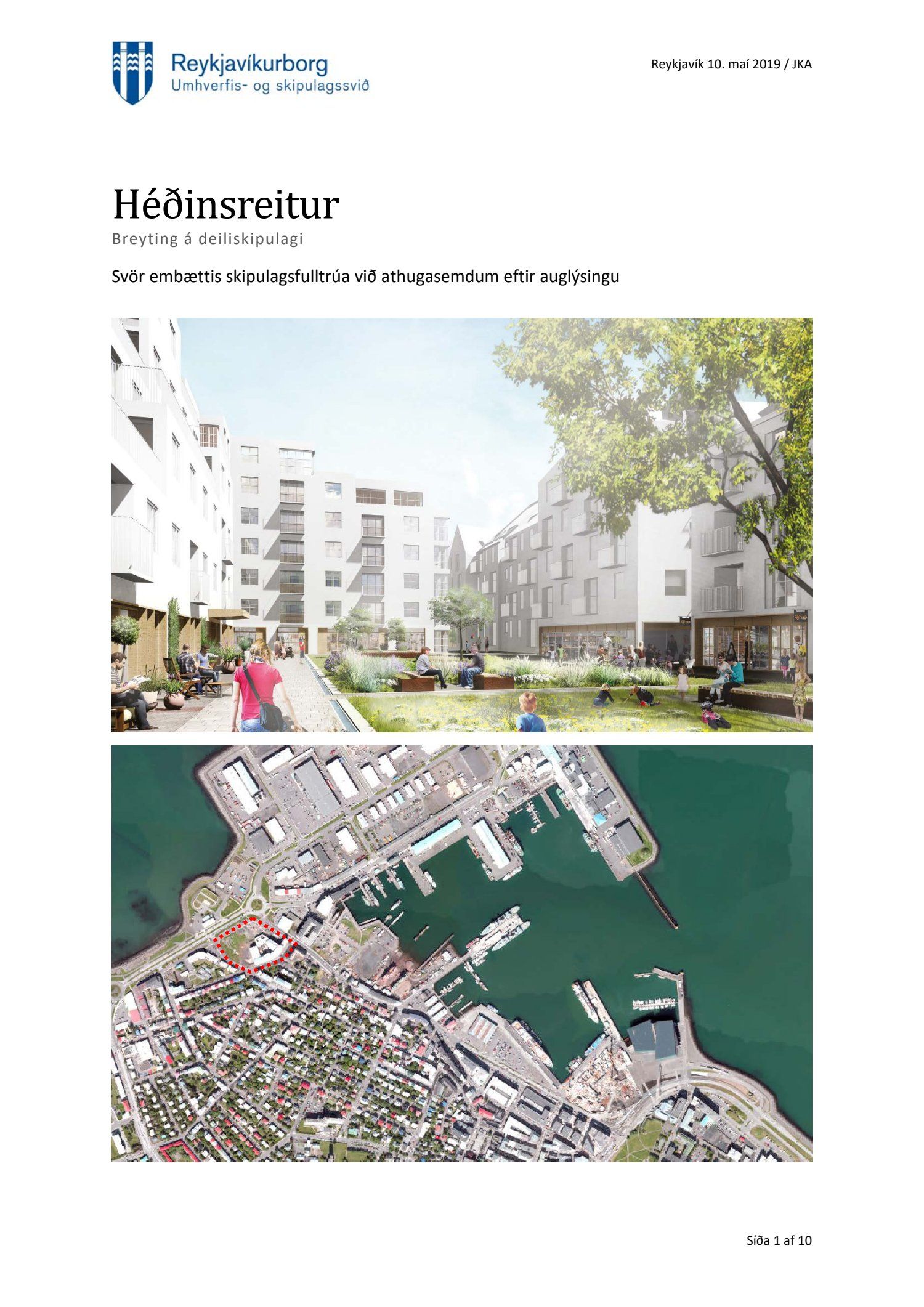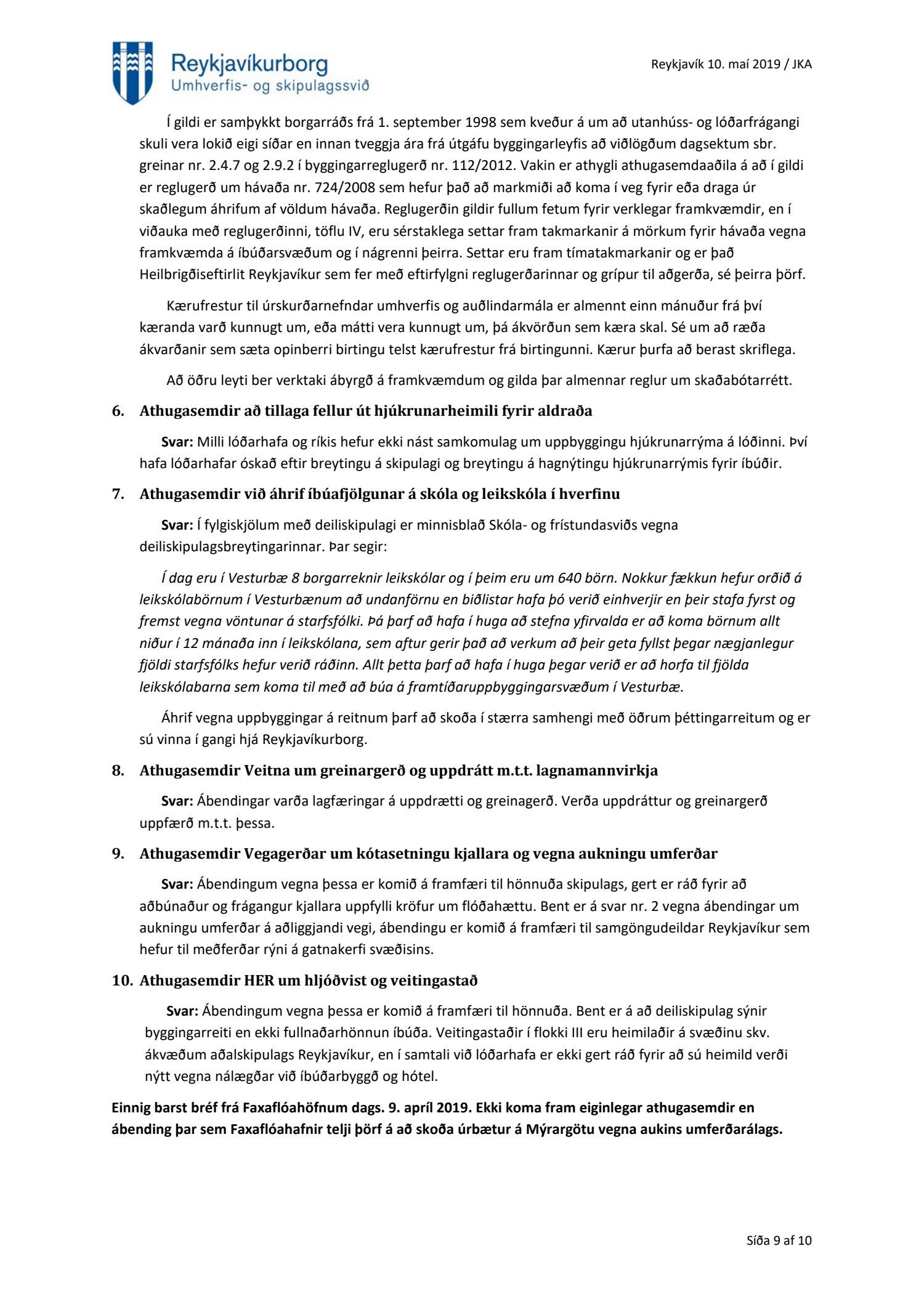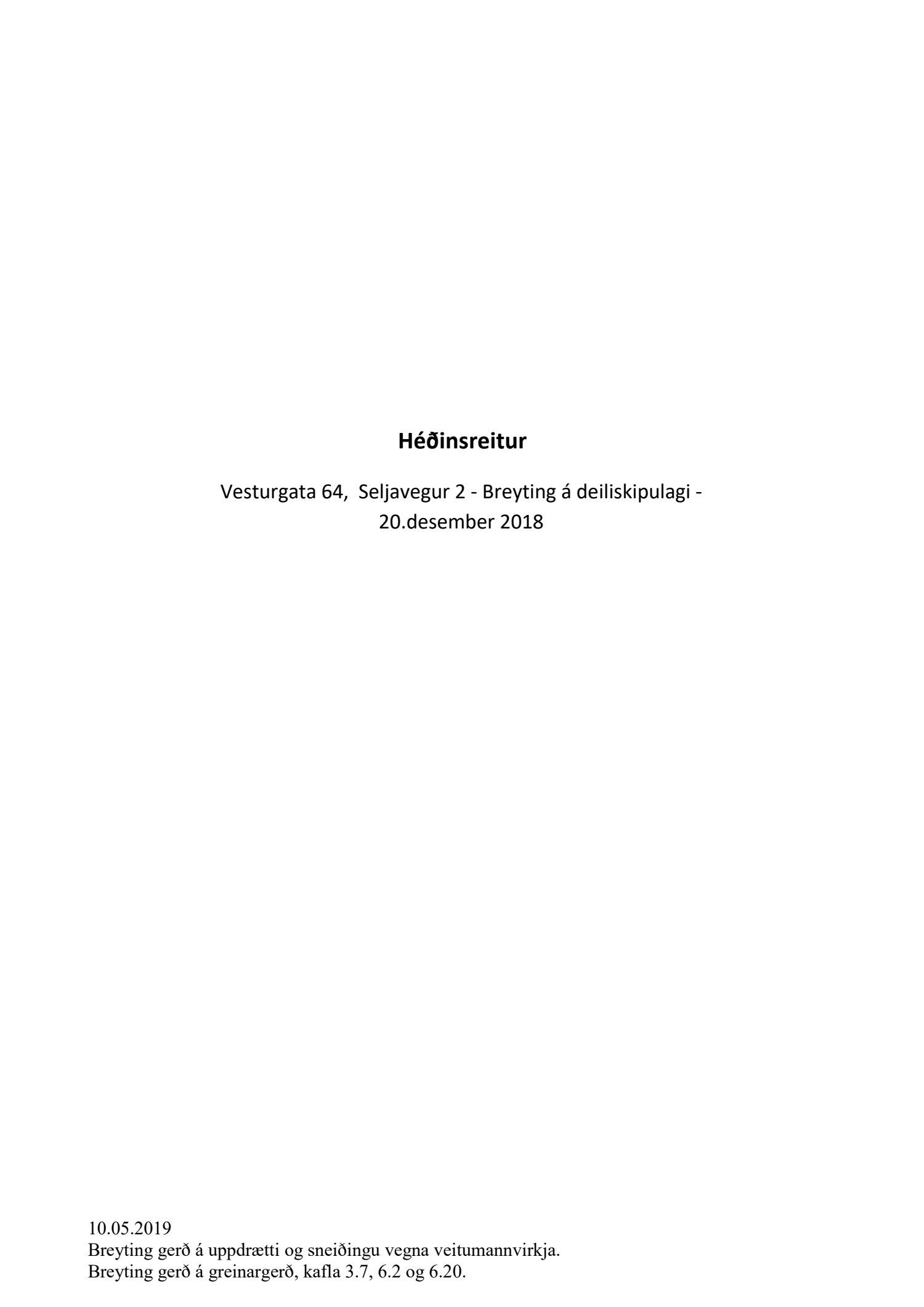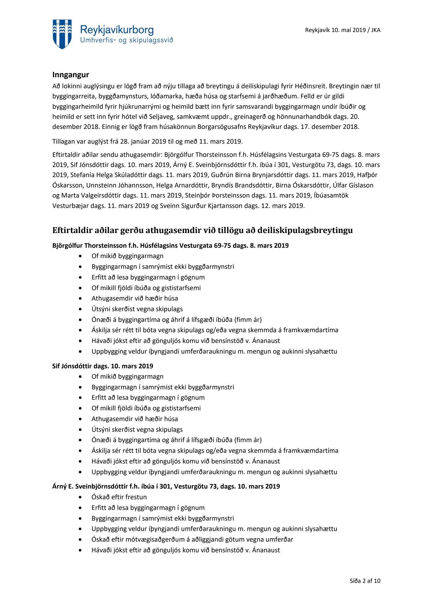 Að lokinni auglýsingu er lögð fram að nýju tillaga að breytingu á deiliskipulagi fyrir Héðinsreit. Breytingin nær til byggingarreita, byggðamynsturs, lóðamarka, hæða húsa og starfsemi á jarðhæðum. Felld er úr gildi byggingarheimild fyrir hjúkrunarrými og heimild bætt inn fyrir samsvarandi byggingarmagn undir íbúðir og heimild er sett inn fyrir hótel við Seljaveg, samkvæmt uppdr., greinagerð og hönnunarhandbók dags. 20. desember 2018. Einnig er lögð fram húsakönnun Borgarsögusafns Reykjavíkur dags. 17. desember 2018. Tillagan var auglýst frá 28. janúar 2019 til og með 11. mars 2019. Eftirtaldir aðilar sendu athugasemdir: Björgólfur Thorsteinsson f.h. Húsfélagsins Vesturgata 69-75 dags. 8. mars 2019, Sif Jónsdóttir dags. 10. mars 2019, Árný E. Sveinbjörnsdóttir f.h. íbúa í 301, Vesturgötu 73, dags. 10. mars 2019, Stefanía Helga Skúladóttir dags. 11. mars 2019, Guðrún Birna Brynjarsdóttir dags. 11. mars 2019, Hafþór Óskarsson, Unnsteinn Jóhannsson, Helga Arnardóttir, Bryndís Brandsdóttir, Birna Óskarsdóttir, Úlfar Gíslason og Marta Valgeirsdóttir dags. 11. mars 2019, Steinþór Þorsteinsson dags. 11. mars 2019, Íbúasamtök Vesturbæjar dags. 11. mars 2019 og Sveinn Sigurður Kjartansson dags. 12. mars 2019. Einnig er lögð fram umsögn Veitna dags. 29. mars 2019, umögn Vegagerðarinnar dags. 4. apríl 2019, umsögn Heilbirgðiseftirlits Reykjavíkur dags. 4. apríl 2019 og umsögn Faxaflóahafna dags. 9. apríl 2019. Jafnframt eru lagðir fram lagfærðir uppdrættir Jvantspijker og Teikn arkitektaþjónustu dags. 20. desember 2018, síðast breytt 10. maí 2019 og lagfærð greinargerð Jvantspijker og Teikn arkitektaþjónustu dags. 20. desember 2018 síðast breytt 10, maí 2019. Einnig er lögð fram umsögn skipulagsfulltrúa dags. 10. maí 2019.