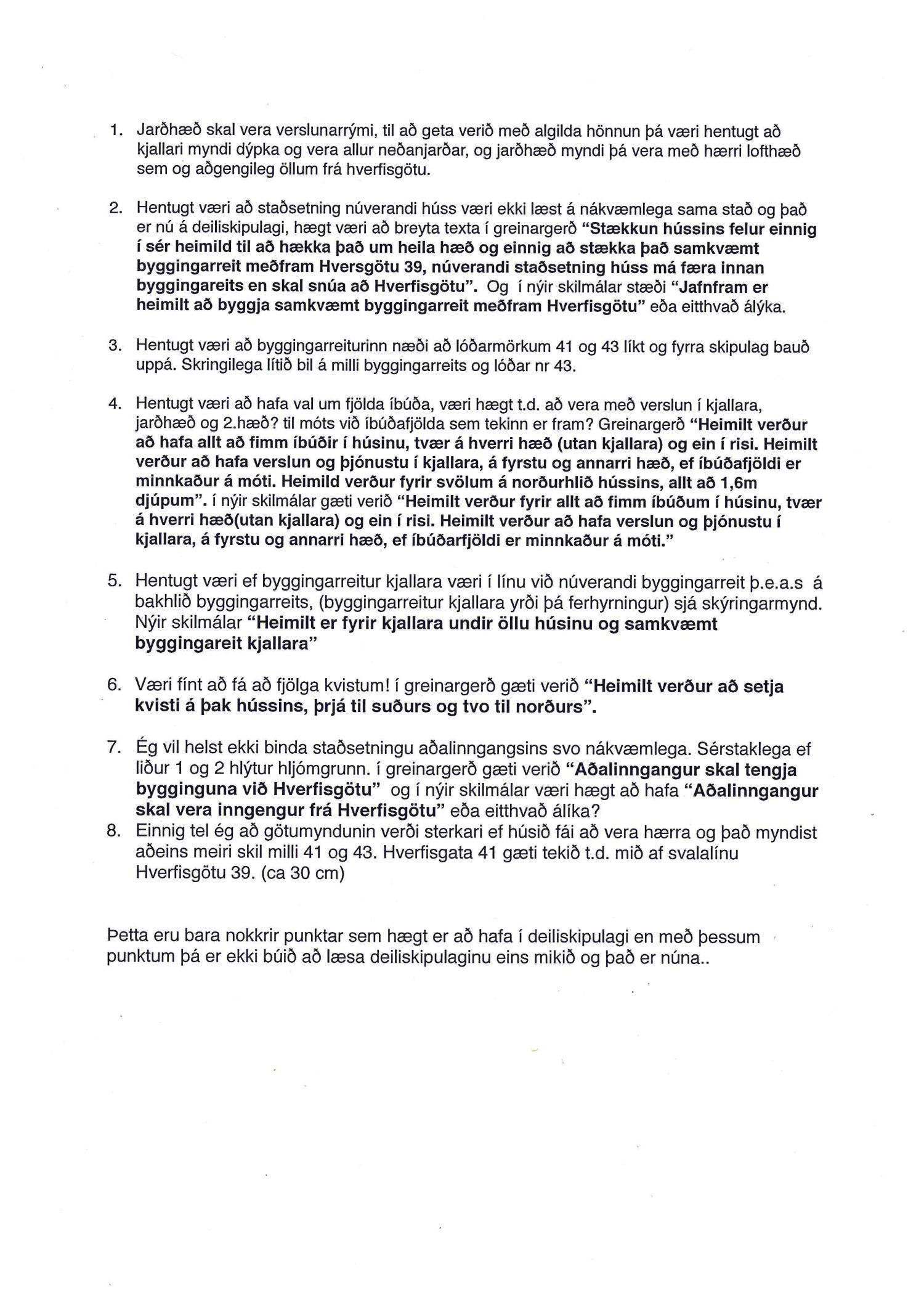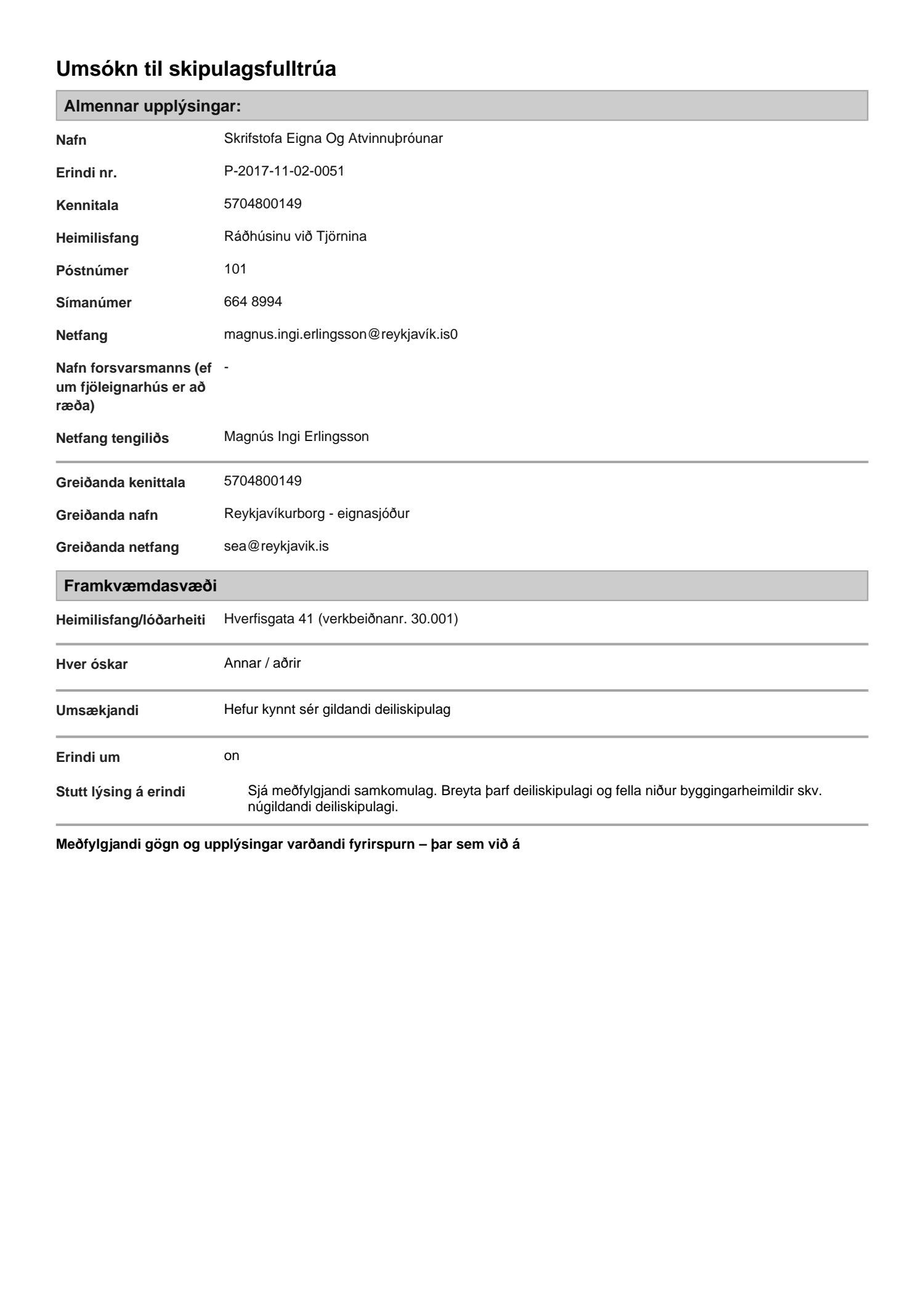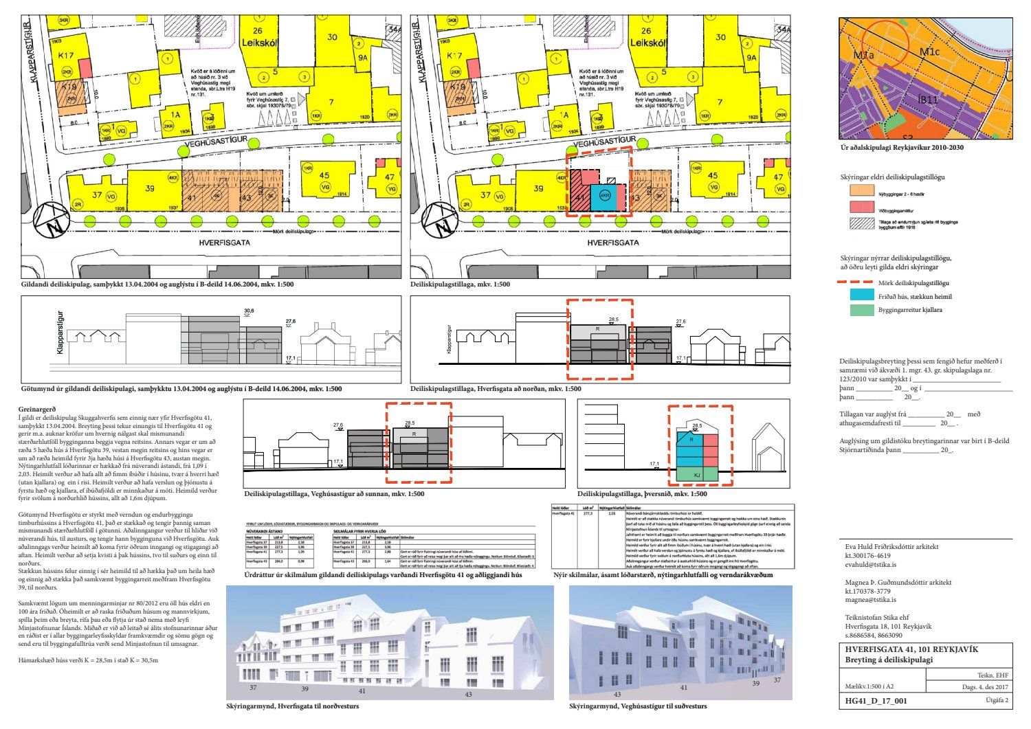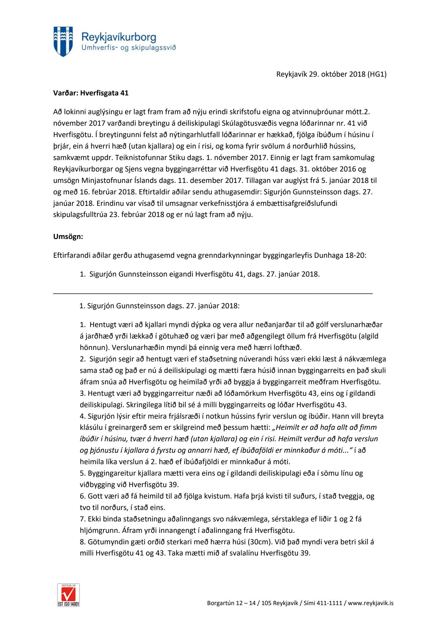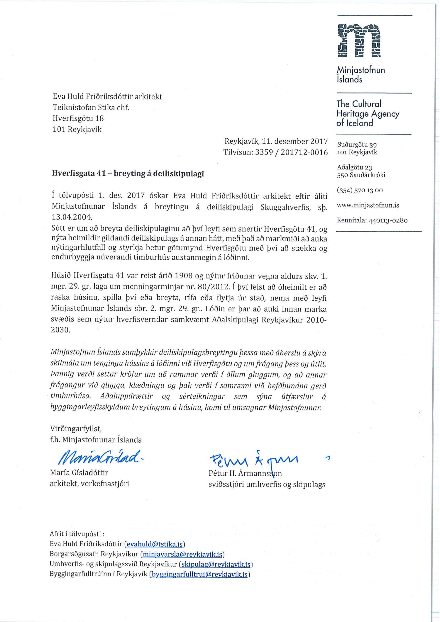 Að lokinni auglýsingu er lagt fram að nýju erindi skrifstofu eigna og atvinnuþróunar mótt.2. nóvember 2017 varðandi breytingu á deiliskipulagi Skuggahverfis vegna lóðarinnar nr. 41 við Hverfisgötu. Í breytingunni felst að nýtingarhlutfall lóðarinnar er hækkað, fjölga íbúðum í húsinu í þrjár, ein á hverri hæð (utan kjallara) og ein í risi, og koma fyrir svölum á norðurhlið hússins, samkvæmt uppdr. Teiknistofunnar Stiku dags. 1. nóvember 2017. Einnig er lagt fram samkomulag Reykjavíkurborgar og Sjens vegna byggingarréttar við Hverfisgötu 41 dags. 31. október 2016 og umsögn Minjastofnunar Íslands dags. 11. desember 2017. Tillagan var auglýst frá 5. janúar 2018 til og með 16. febrúar 2018. Eftirtaldir aðilar sendu athugasemdir: Sigurjón Gunnsteinsson dags. 27. janúar 2018. Einnig er lögð fram umsögn skipulagsfulltrúa dags. 12. nóvember 2018.
