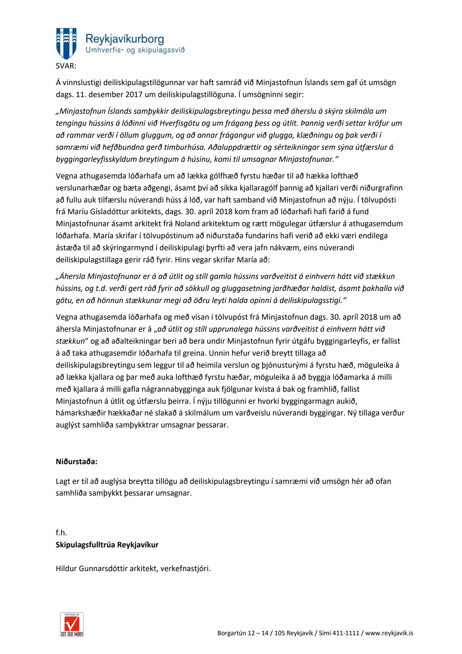 Tillagan samþykkt með fjórum atkvæðum fulltrúa Pírata Sigurborgar Óskar Haraldsdóttur, fulltrúa Samfylkingar Aronar Levís Becks og Hjálmars Sveinssonar og fulltrúa Viðreisnar Gunnlaugs Braga Björnssonar, fulltrúar Sjálfstæðisflokksins Eyþórs Laxdal Arnalds, Hildur Björnsdóttir og Valgerðar Sigurðardóttur sem sitja hjá.