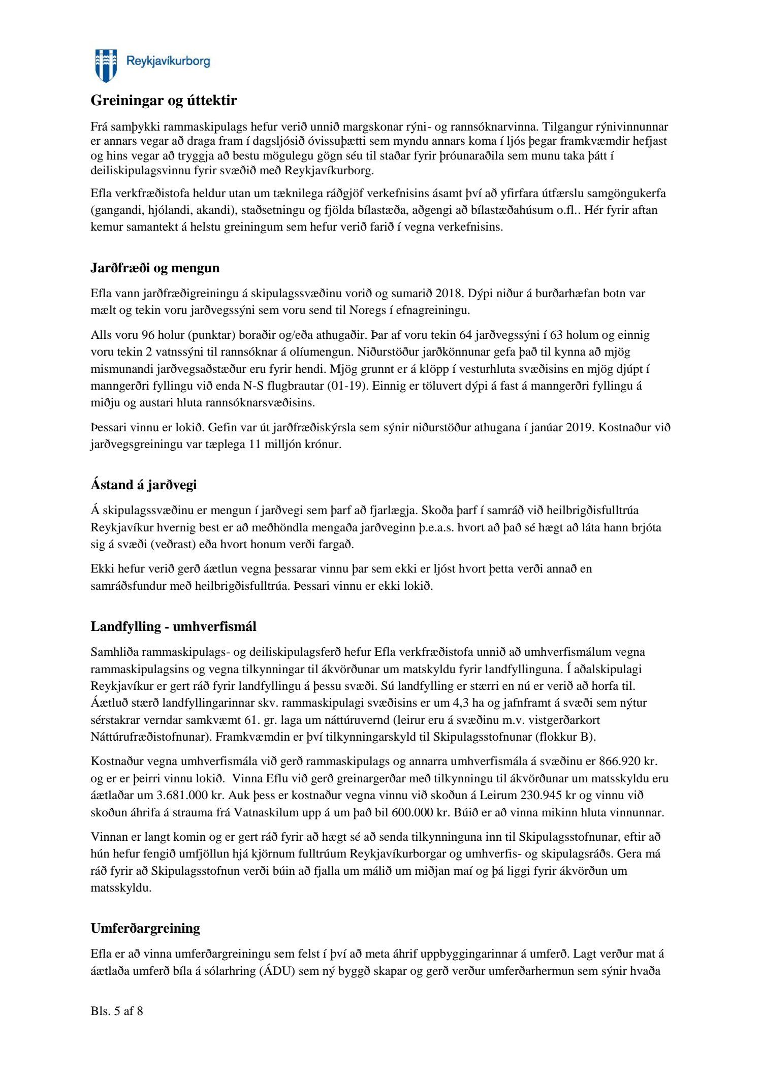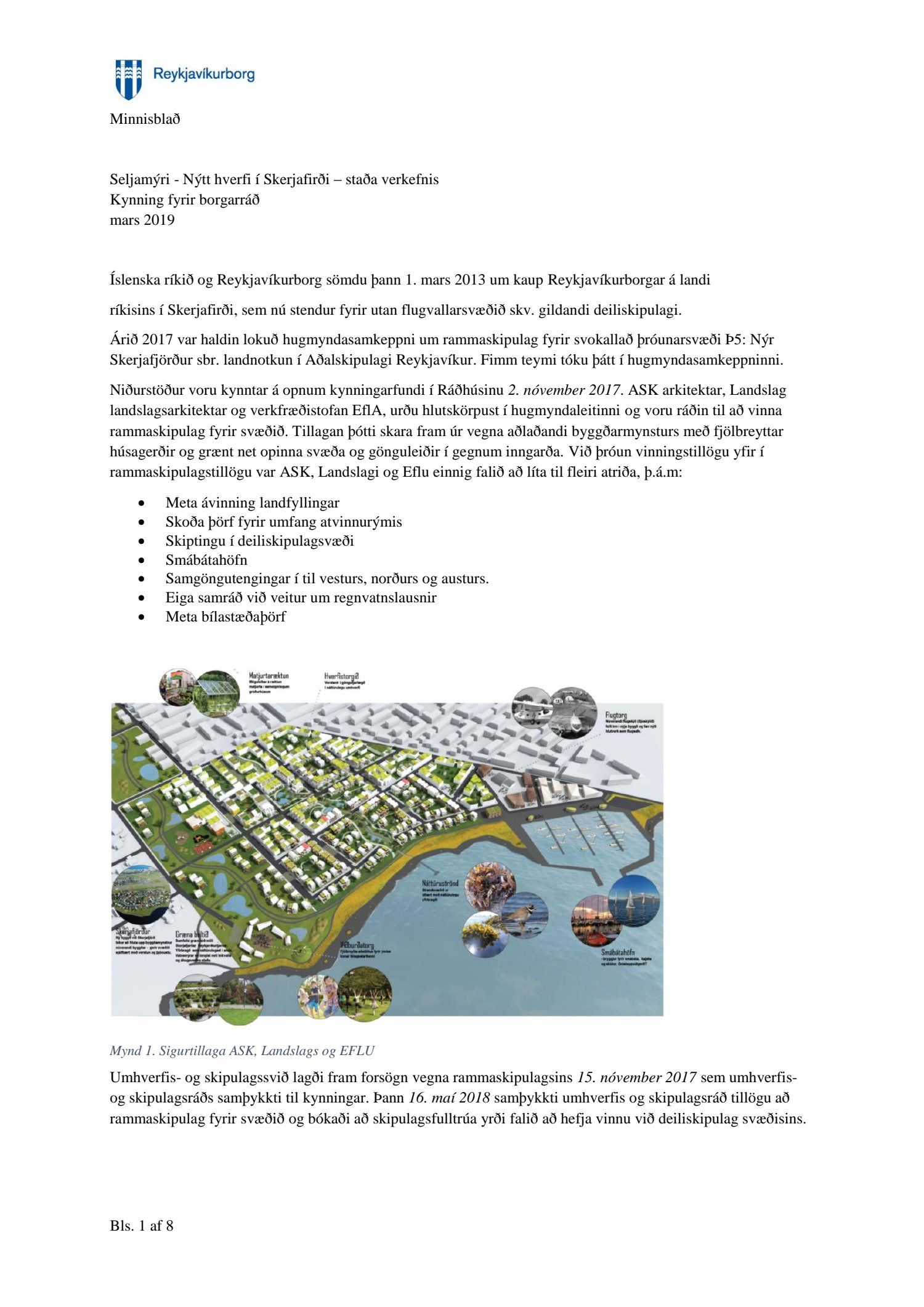 Kynnt staða á vinnu við gerð deiliskipulags fyrir nýjan Skerjafjörð. Einnig er lagt fram minnisblað verkefnastjóra dags. mars 2019