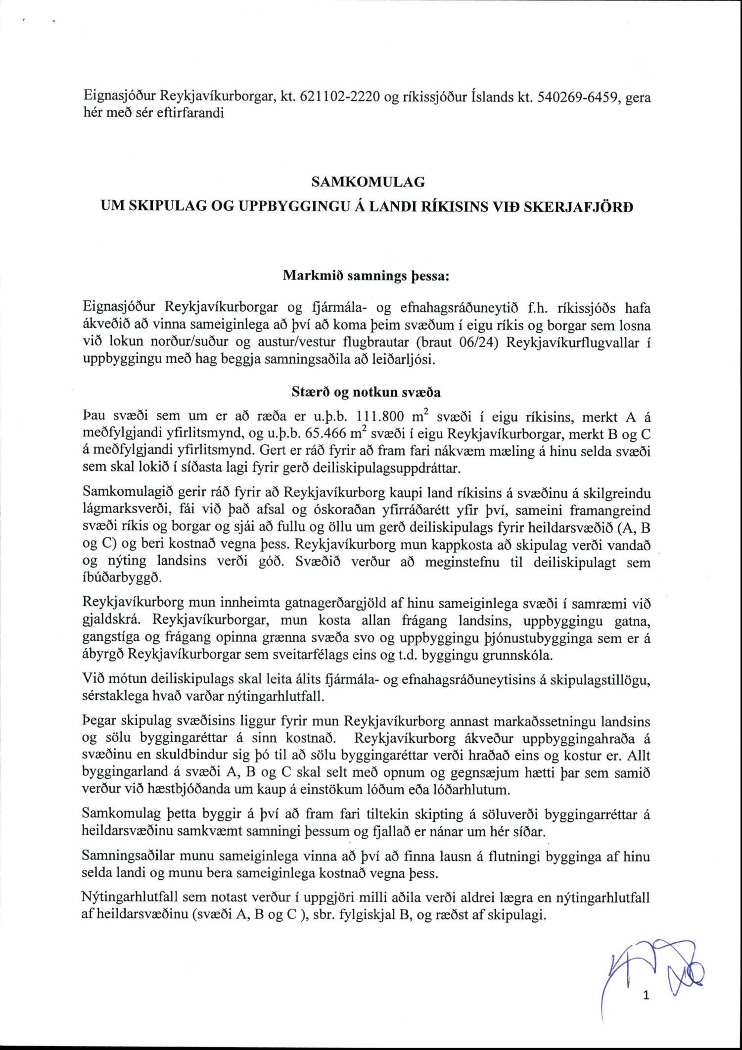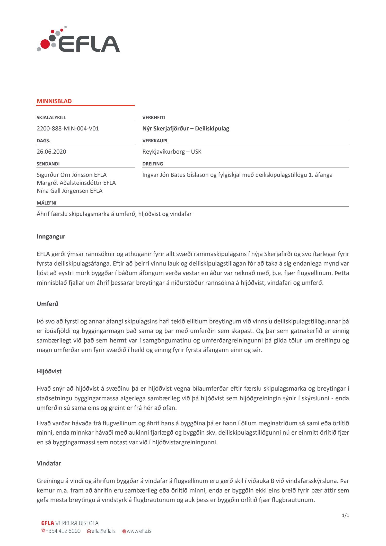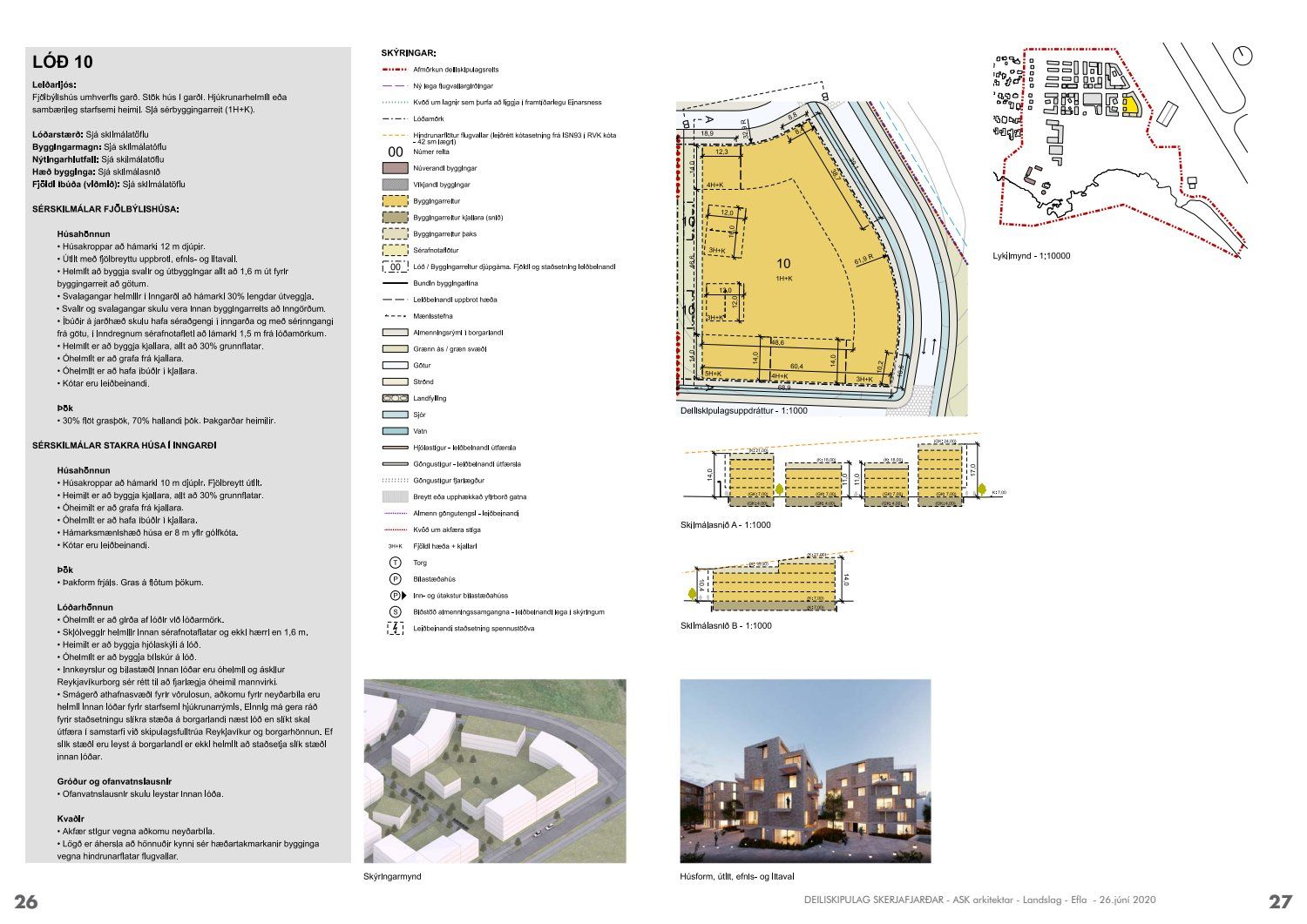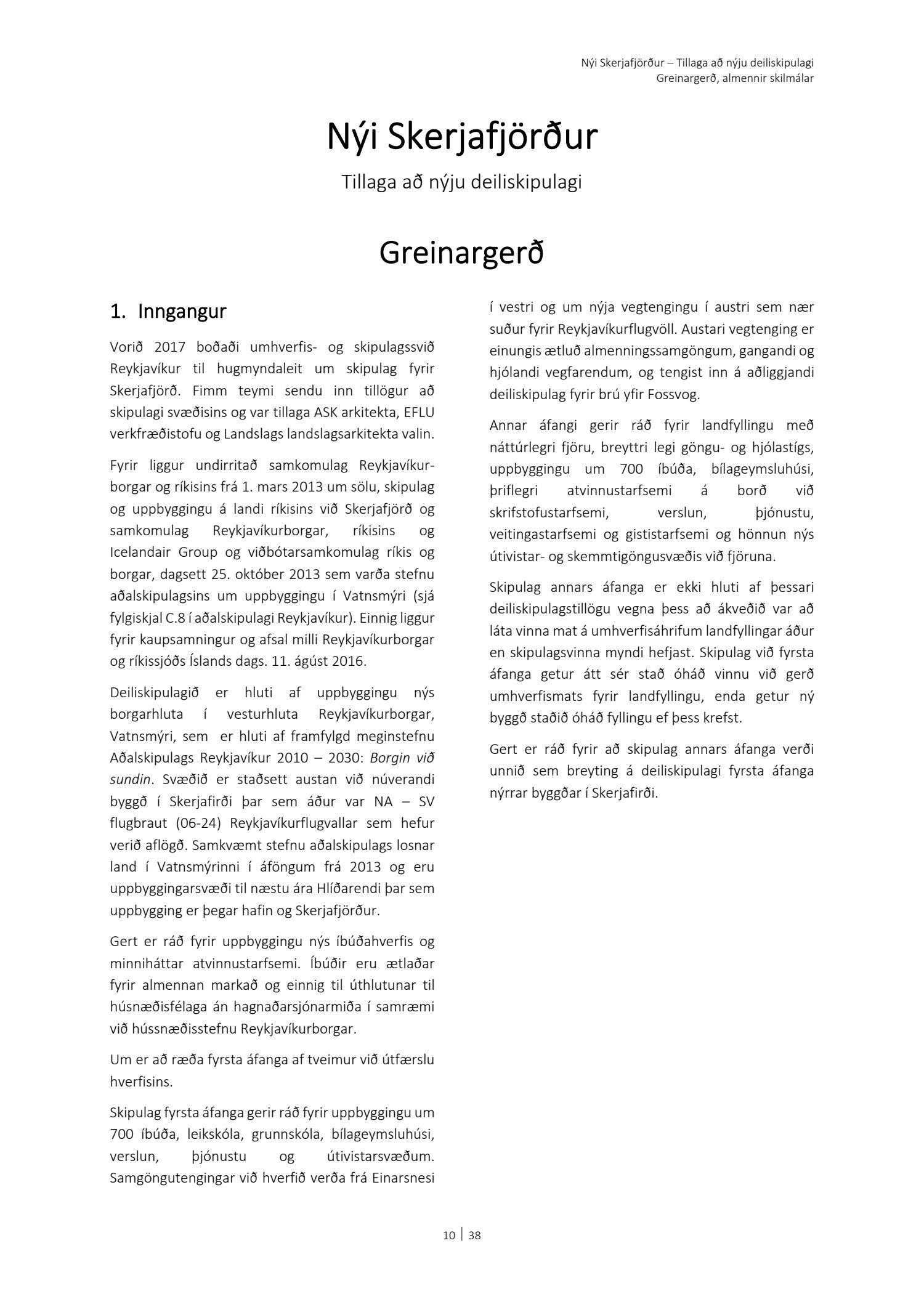 Lögð fram tillaga umhverfis- og skipulagssviðs, skipulagsfulltrúa, að nýju deiliskipulagi fyrir Nýja Skerjafjörð. Tillagan gerir ráð fyrir uppbyggingu um 700 íbúða, leikskóla, grunnskóla, bílageymsluhúsi, verslun, þjónustu og útivistarsvæðum. Tillagan gerir einnig ráð fyrir nýjum vegtengingum til austurs, suður fyrir Reykjavíkurflugvöll, sem er eingöngu ætluð almenningssamgöngum, gangandi og hjólandi vegfarendum. Einnig eru lagðir fram deiliskipulags-, skýringar- og skuggavarpsuppdr. ASK Arkitekta, EFLU og Landslags dags. 26. júní 2020, greinargerð og almennir skipulagsskilmálar dags. 26. júní 2020, sérskilmálar dags. 26. júní 2020, hönnunarleiðbeiningar dags. 26. júní 2020, skýrsla Minjasafns Reykjavíkur nr. 161 frá 2013 (byggðakönnun, fornleifaskrá og húsakönnun), drög að skýrslu Borgarsögusafns Reykjavíkur nr. 204 frá 2020 (fornleifaskrá og húsakönnun), fjórir undirritaðir samningar: samkomulega um skipulag og uppbygging á landi ríkisins við Skerjafjörð dags 1. mars 2013, samkomulag um endurbætur á aðstöðu fyrir farþega og þjónustuaðila á Reykjavíkurflugvelli dags. 19. apríl 2013, samkomulag um innanlandsflug dags. 25. október 2013 og kaupsamningur og afsal í framhaldi af formlegri lokun ríkisins á norður/suður og austur/vestur flugbrautar (braut (06/24) á Reykjavíkurflugvelli dags. 11. ágúst 2016. Jafnframt eru lögð fram ítargögn: skýrsla Eflu um jarðkönnun og mengunarrannsóknir í jarðvegi Skerjafjarðar dags. 29. janúar 2019, skýrsla Eflu um hljóðvist dags. 12. september 2019, samgöngumat Eflu dags. 26. júní 2020, skýrsla Eflu um vindgreiningu dags. 7. janúar 2020, minnisblað Eflu vindgreining - viðauki A dags. 16. júní 2020, minnisblað Eflu Vindgreining - viðauki B dags. 26. júní 2020 og minnisblað Eflu vegna færslu skipulagsmarka (áhrif færslu skipulagsmarka á umferð, hljóðvist og vindafar) dags. 26. júní 2020.