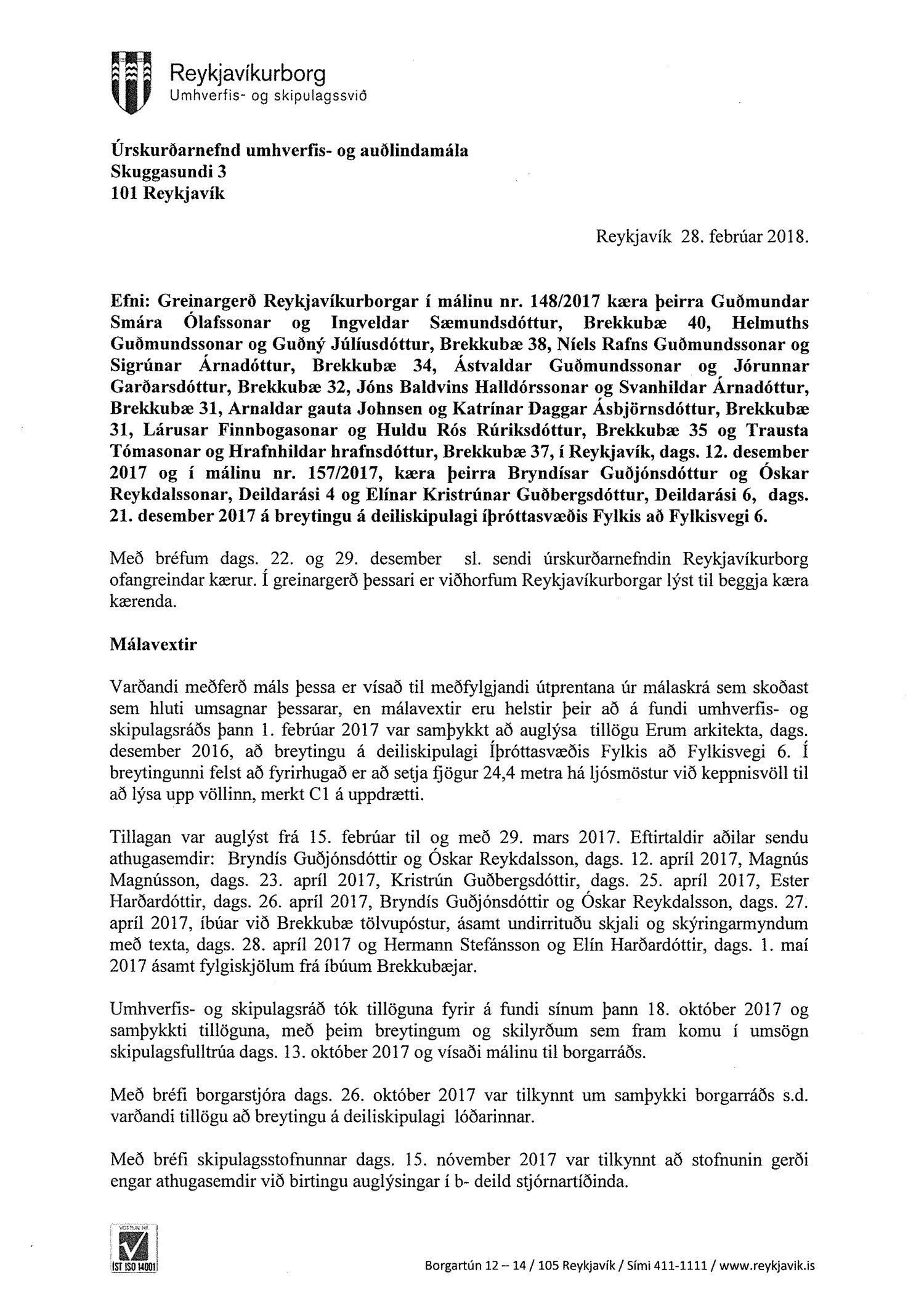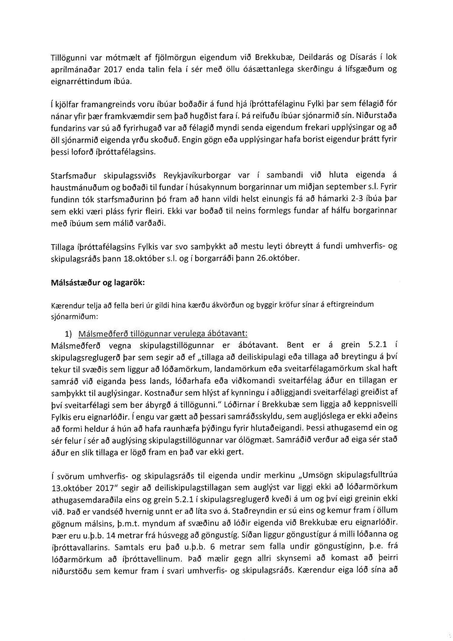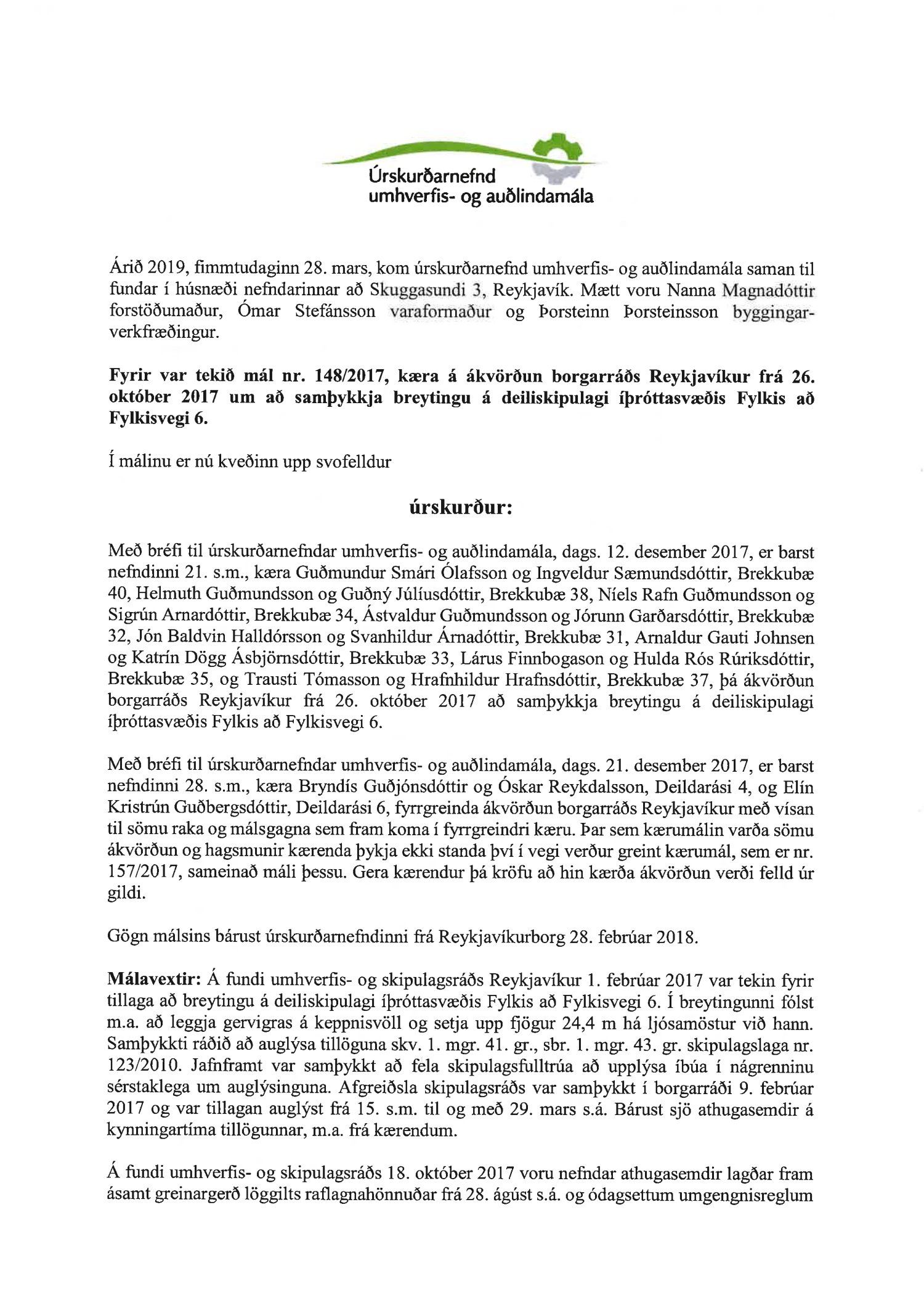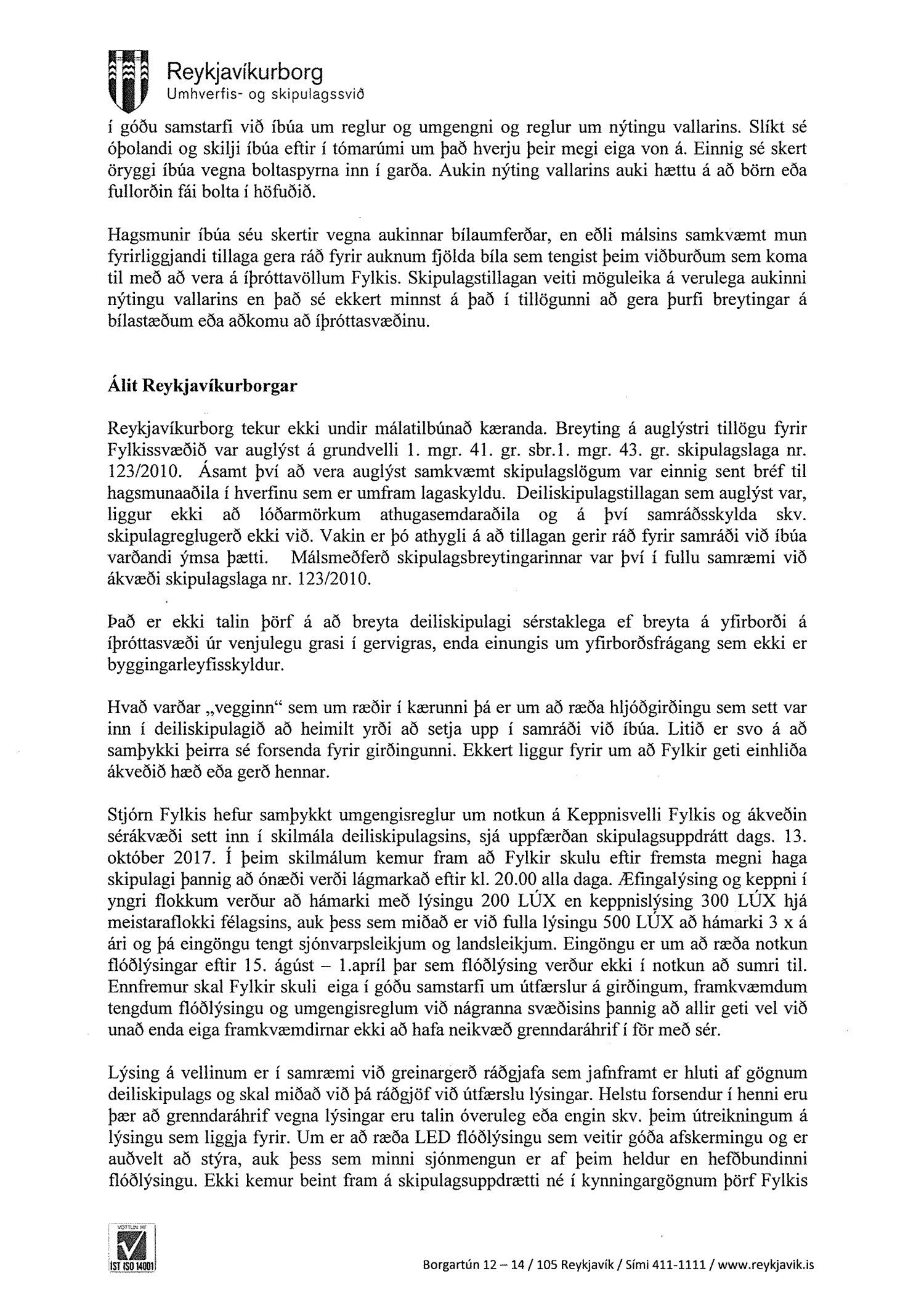 Hafnað er kröfu annarra kærenda um ógildingu ákvörðunar borgarráðs Reykjavíkur frá 26. október 2017 um að samþykkja breytingu á deiliskipulagi íþróttasvæðis Fylkis að Fylkisvegi 6.