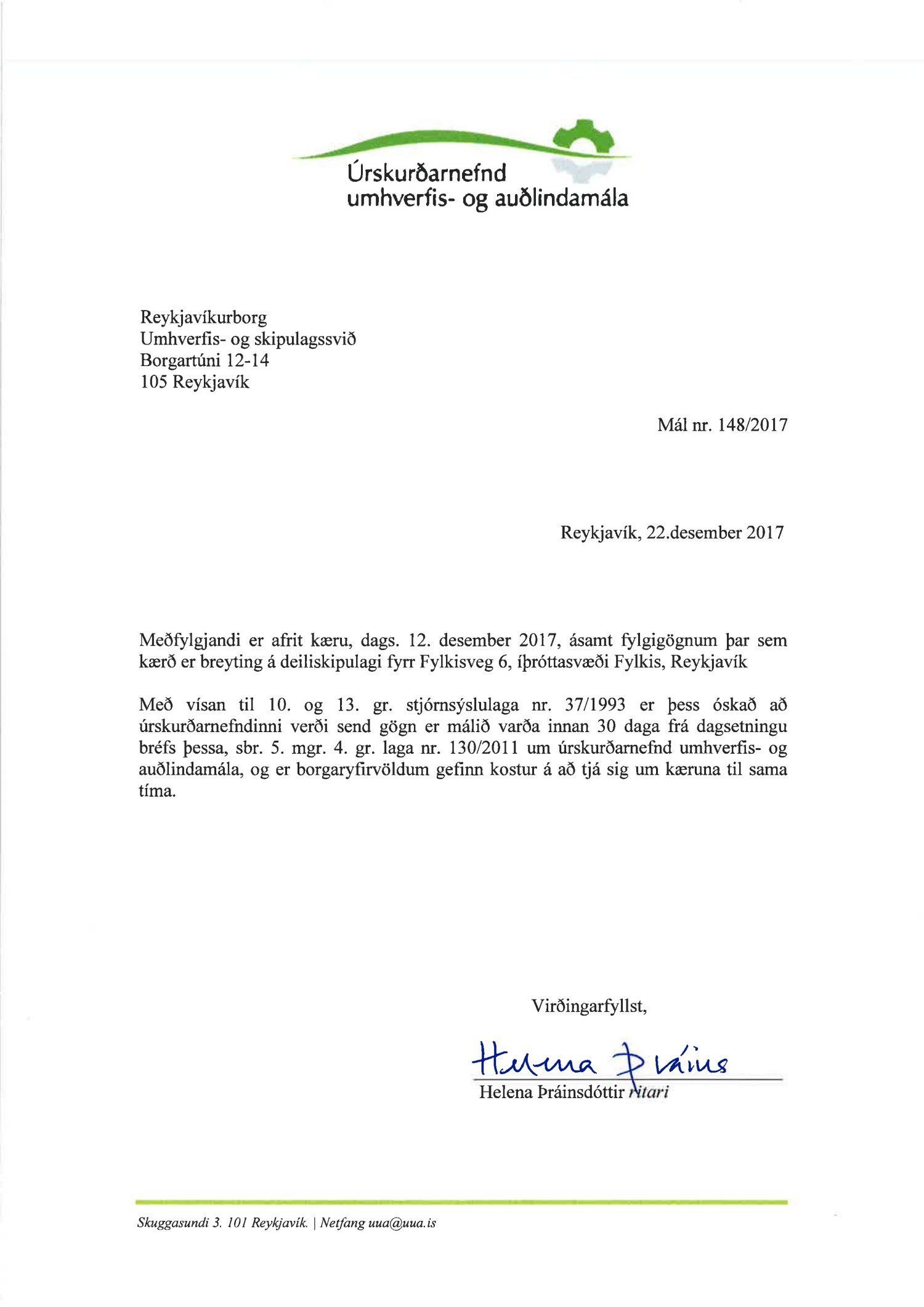 Lagt fram bréf úrskurðarnefndar umhverfis- og auðlindamála dags. 22. desember 2017 ásamt kæru dags. 12. desember 2017 þar sem kærð er breyting á deiliskipulagi fyrir Fylkisveg 6, íþróttasvæði Fylkis. Einnig er lögð fram umsögn skrifstofu sviðsstjóra dags. 28. febrúar 2018. Jafnframt er lagður fram úrskurður úrskurðarnefndar umhverfis- og auðlindamála frá 28. mars 2019. Úrskurðarorð: Kröfum Kærenda að Deildarási 4 og 6 er vísað frá úrskurðarnefndinni.