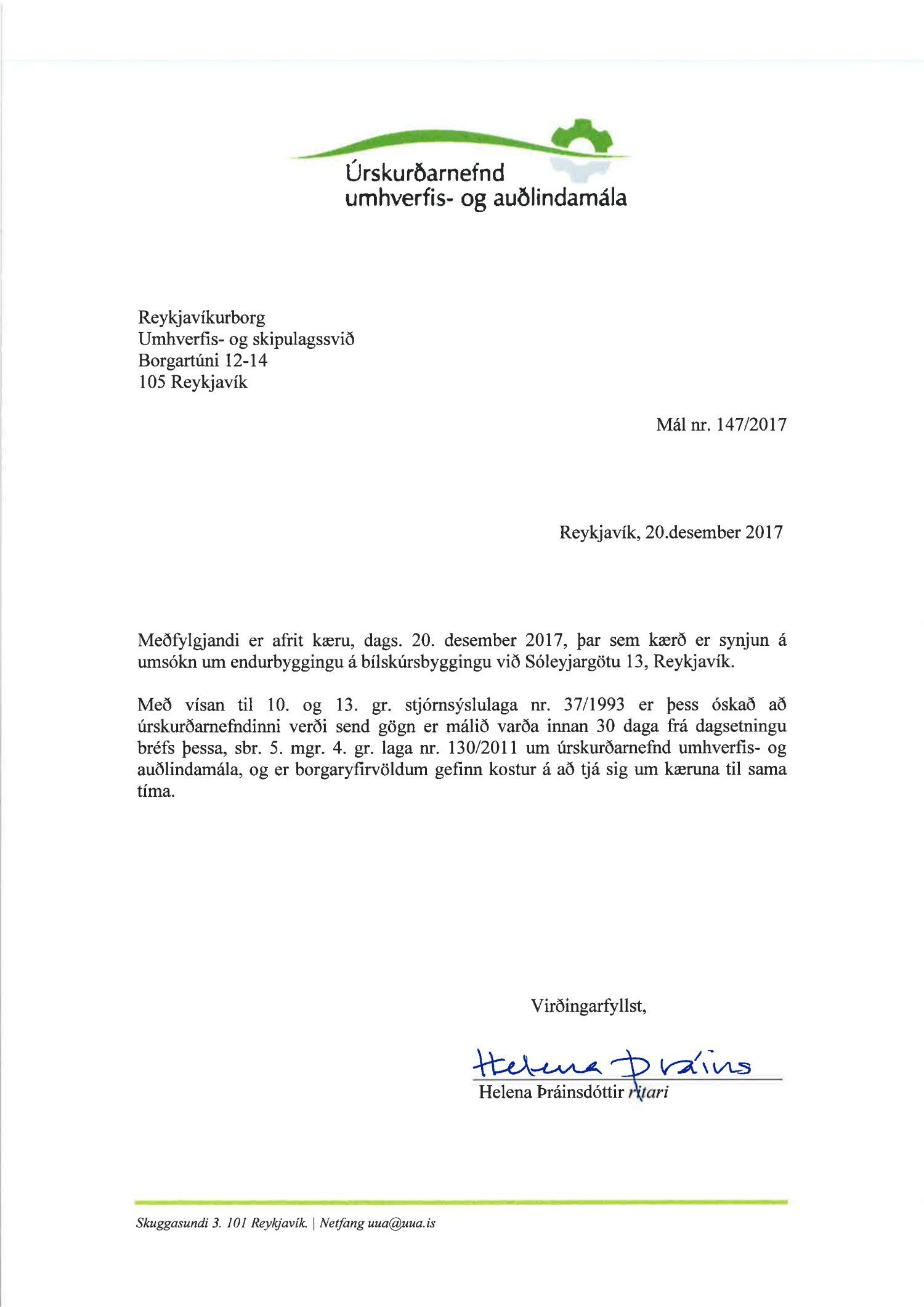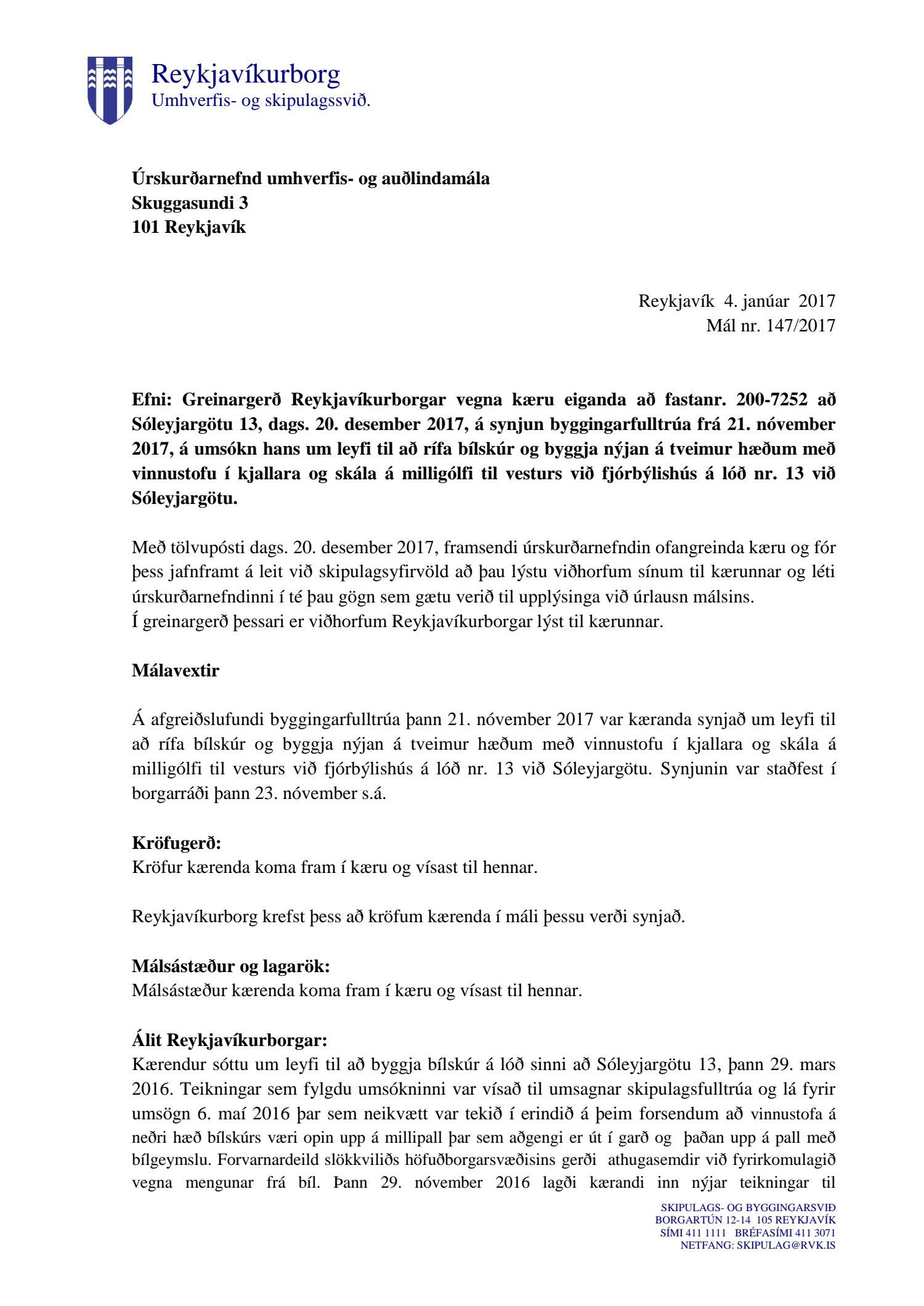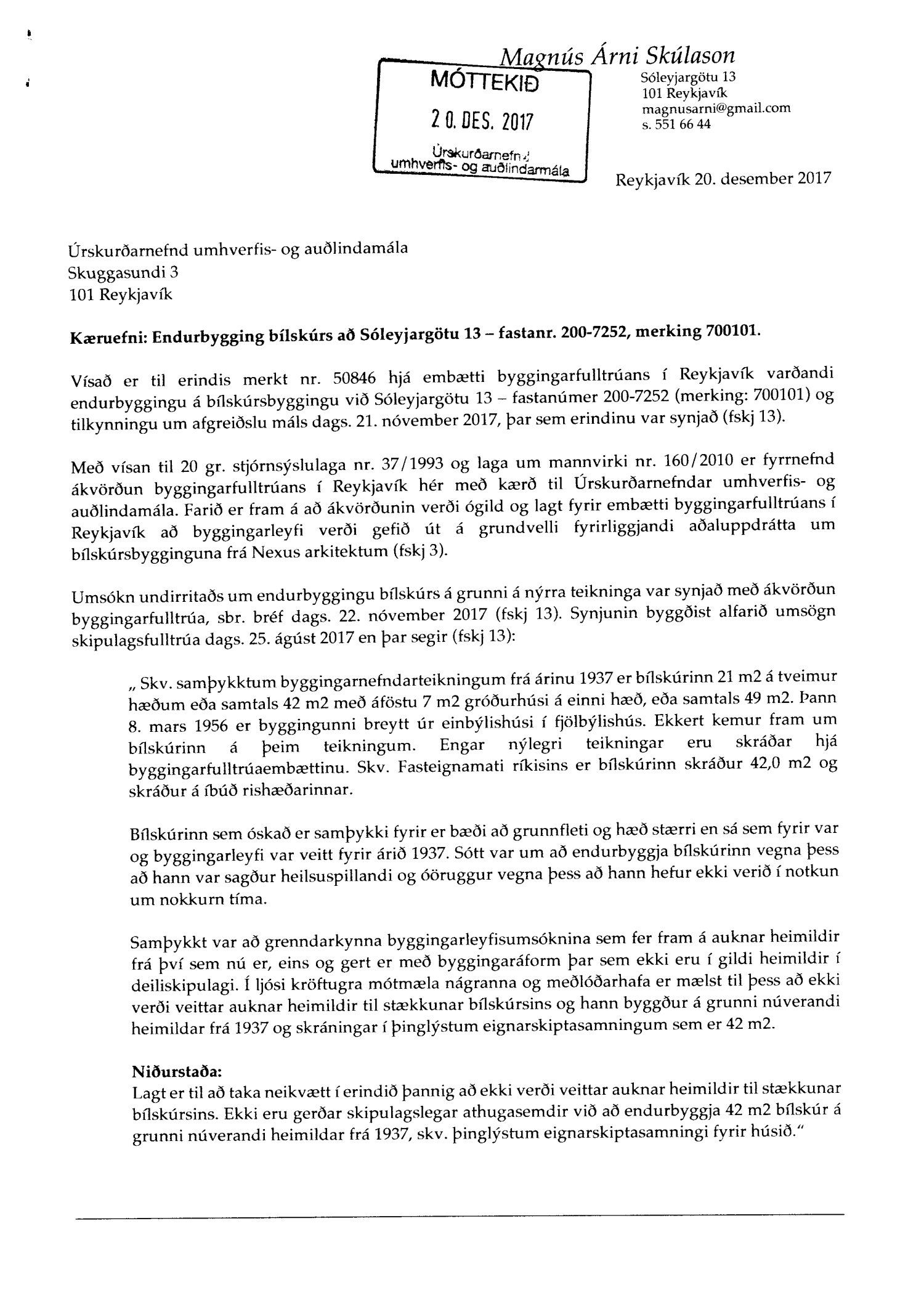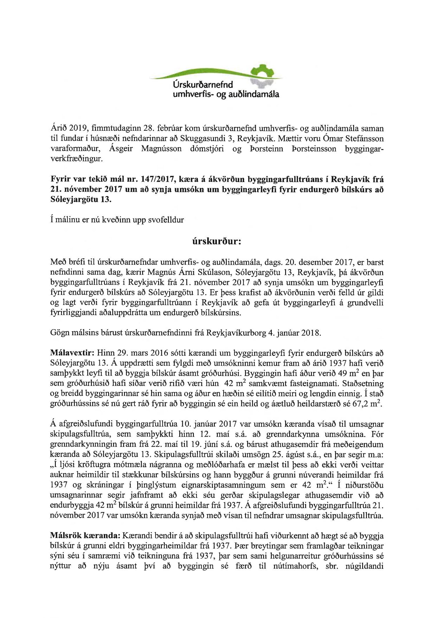 Lagt fram bréf umhverfis- og auðlindamála dags. 20. desember 2017 ásamt kæru dags. 20. desember 2017 þar sem kærð er synjun á umsókn um endurbyggingu á bílskúrsbyggingu við Sóleyjargötu 13. Einnig er lögð fram umsögn skrifstofu sviðsstjóra dags. 4. janúar 2018. Jafnframt er lagður fram úrskurður úrskurðarnefndar umhverfis- og auðlindamála frá 28. febrúar 2019. Úrskurðarorð: Hafnað er kröfu kæranda um ógildingu ákvörðunar byggingarfulltrúans í Reykjavík frá 21. nóvember 2017 um að synja umsókn um byggingarleyfi fyrir endurgerð bílskúrs að Sóleyjargötu 13.