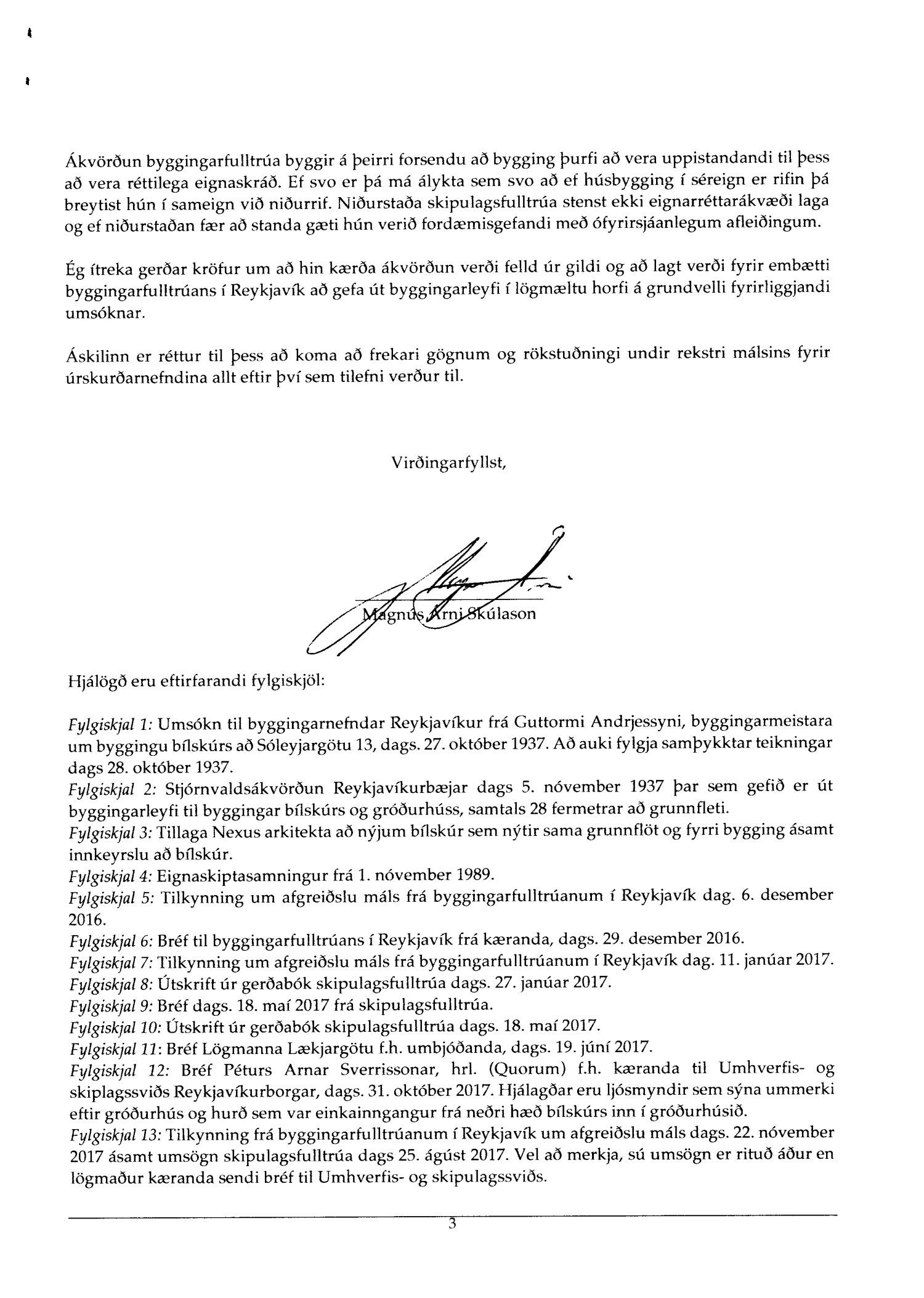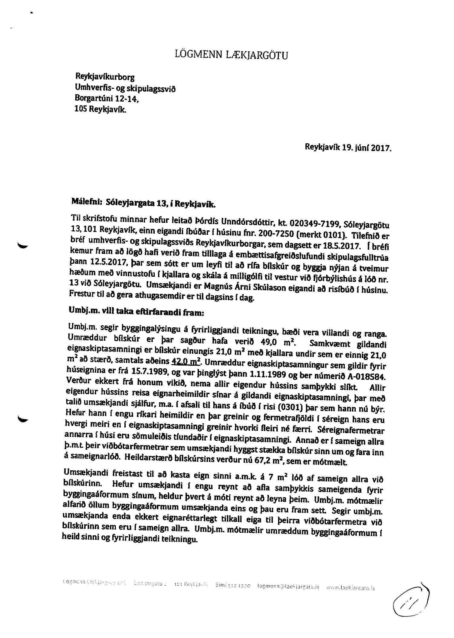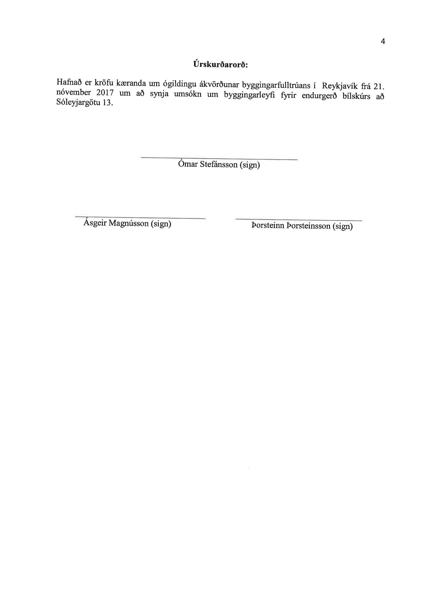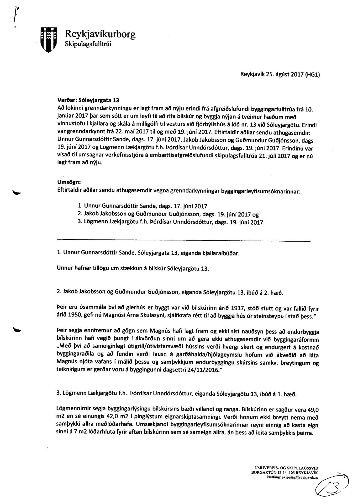 Lagt fram bréf umhverfis- og auðlindamála dags. 20. desember 2017 ásamt kæru dags. 20. desember 2017 þar sem kærð er synjun á umsókn um endurbyggingu á bílskúrsbyggingu við Sóleyjargötu 13. Einnig er lögð fram umsögn skrifstofu sviðsstjóra dags. 4. janúar 2018. Jafnframt er lagður fram úrskurður úrskurðarnefndar umhverfis- og auðlindamála frá 28. febrúar 2019. Úrskurðarorð: Hafnað er kröfu kæranda um ógildingu ákvörðunar byggingarfulltrúans í Reykjavík frá 21. nóvember 2017 um að synja umsókn um byggingarleyfi fyrir endurgerð bílskúrs að Sóleyjargötu 13.