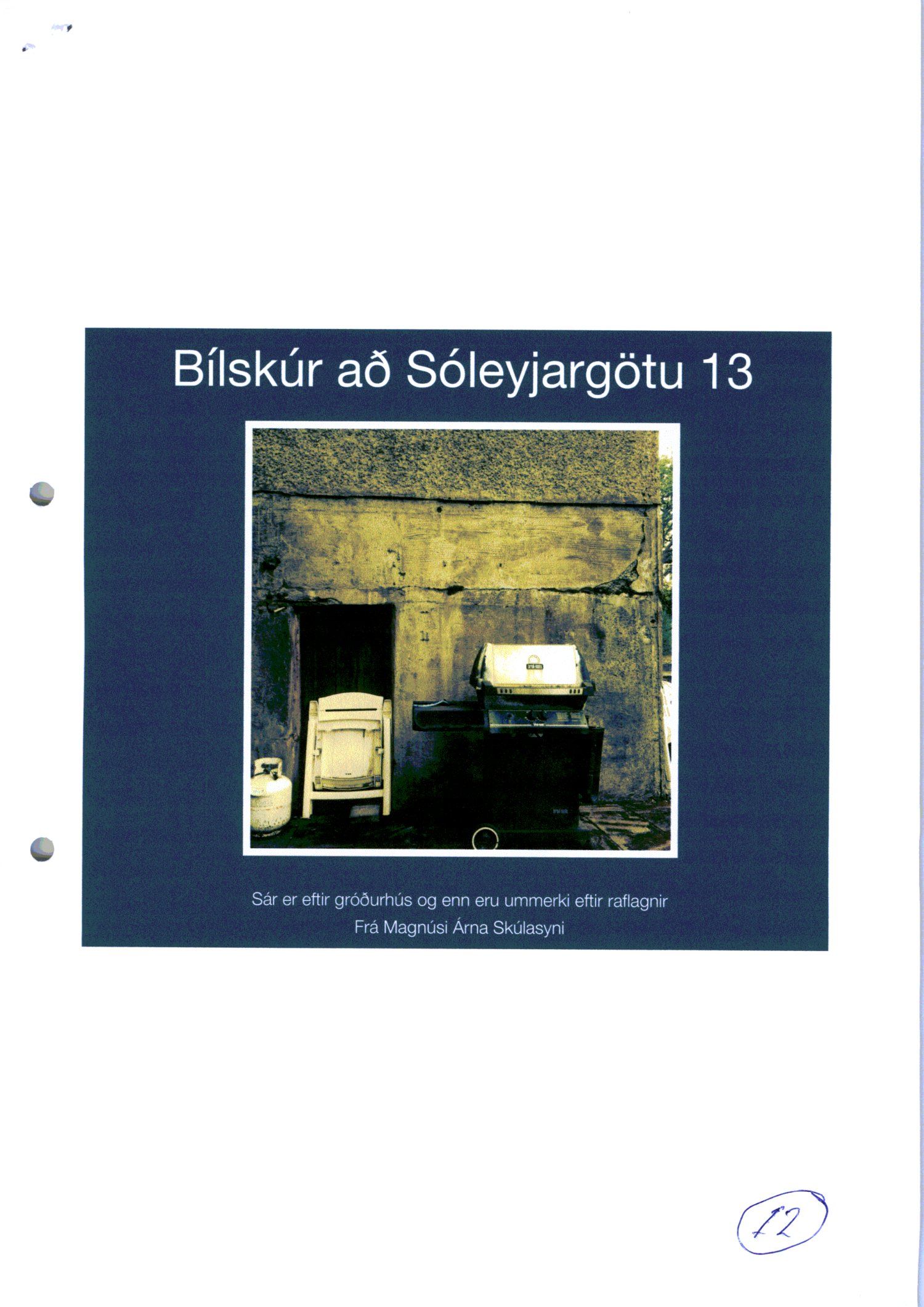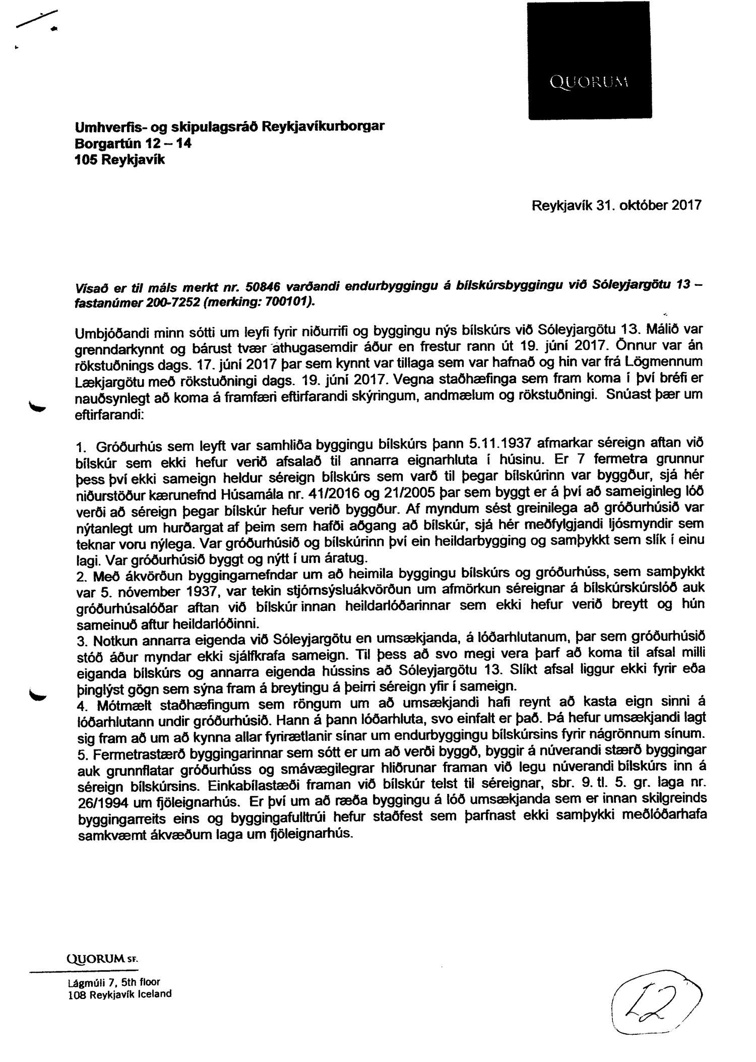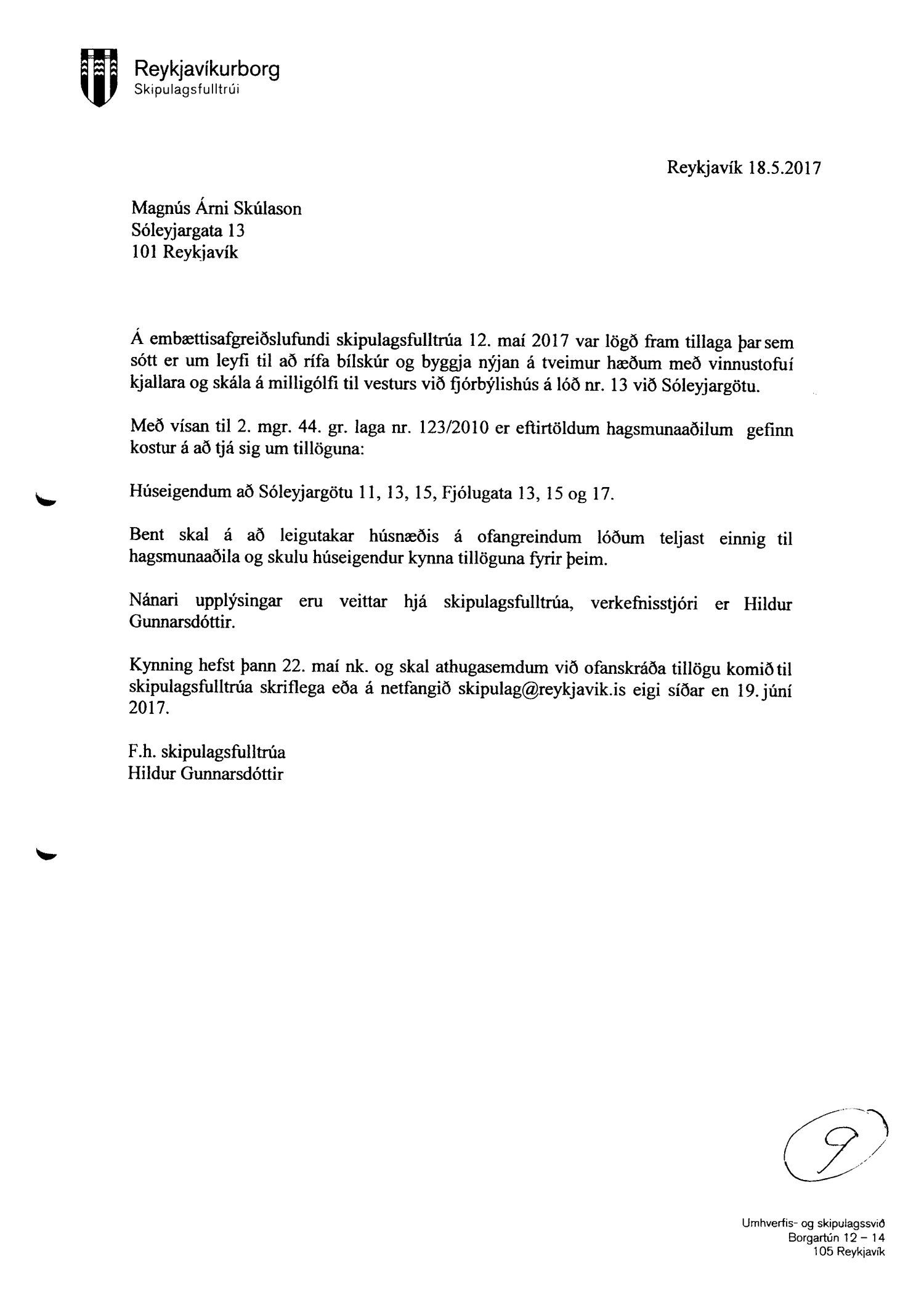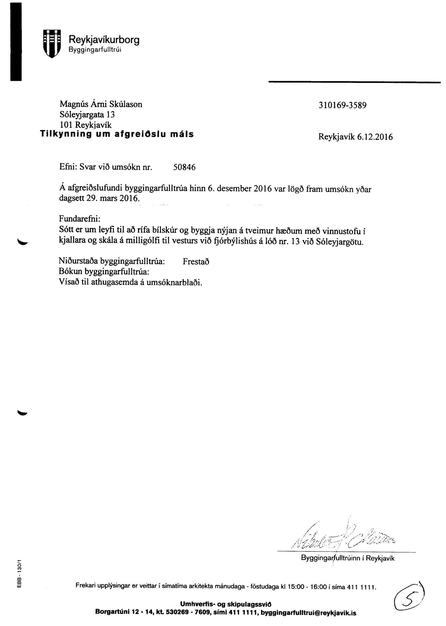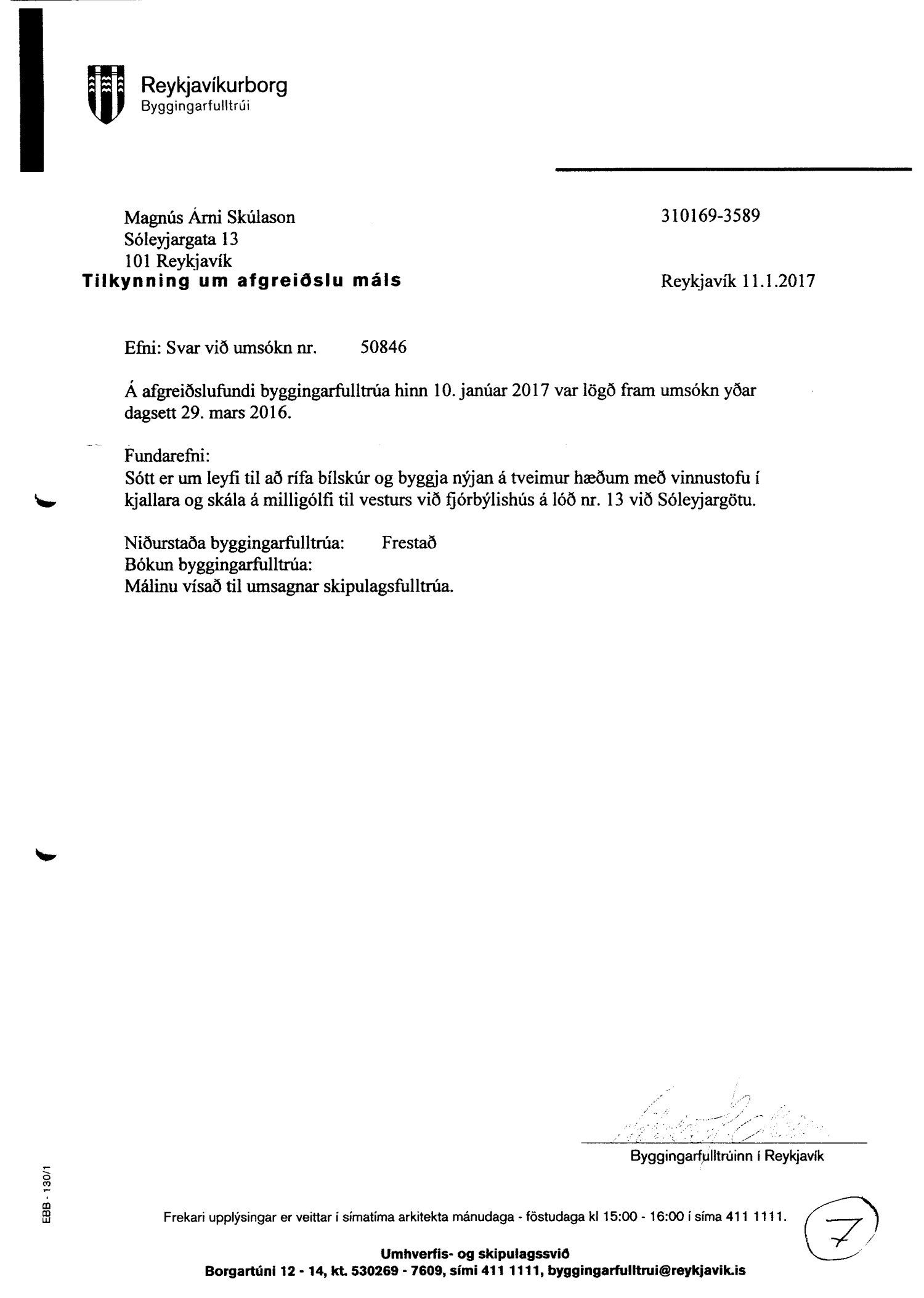 Lagt fram bréf umhverfis- og auðlindamála dags. 20. desember 2017 ásamt kæru dags. 20. desember 2017 þar sem kærð er synjun á umsókn um endurbyggingu á bílskúrsbyggingu við Sóleyjargötu 13. Einnig er lögð fram umsögn skrifstofu sviðsstjóra dags. 4. janúar 2018. Jafnframt er lagður fram úrskurður úrskurðarnefndar umhverfis- og auðlindamála frá 28. febrúar 2019. Úrskurðarorð: Hafnað er kröfu kæranda um ógildingu ákvörðunar byggingarfulltrúans í Reykjavík frá 21. nóvember 2017 um að synja umsókn um byggingarleyfi fyrir endurgerð bílskúrs að Sóleyjargötu 13.