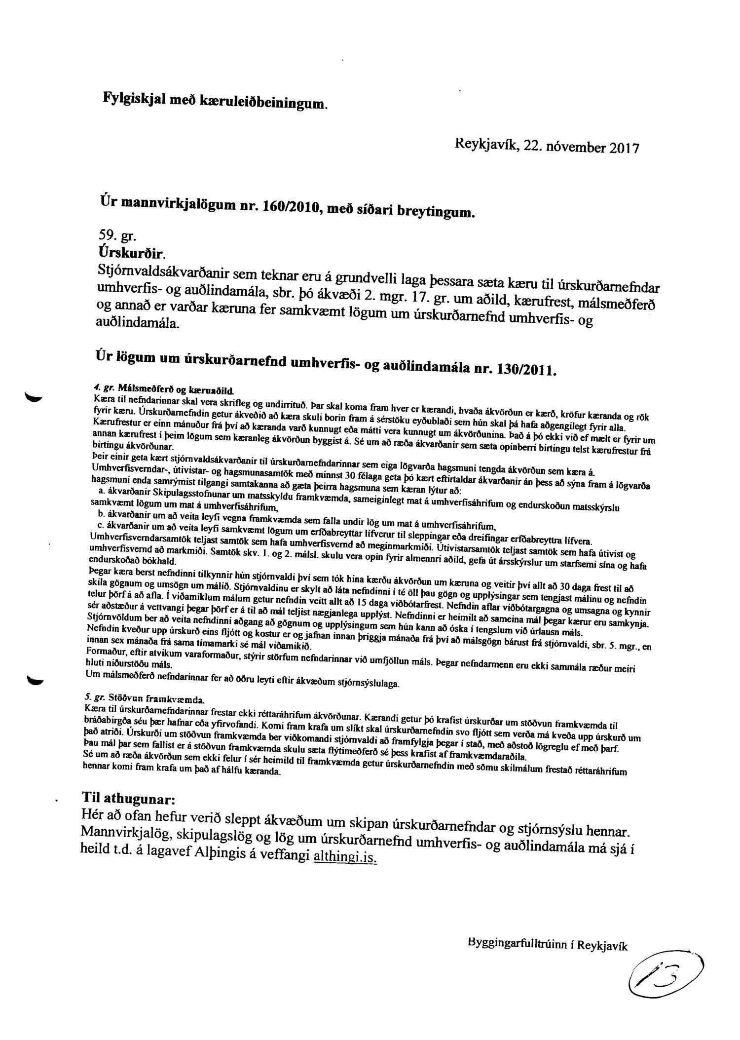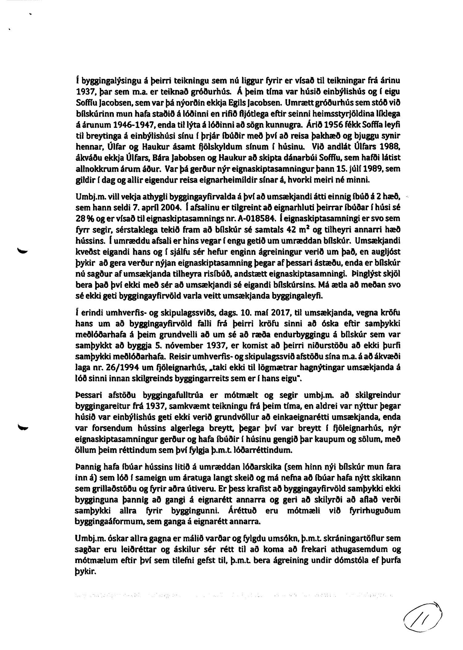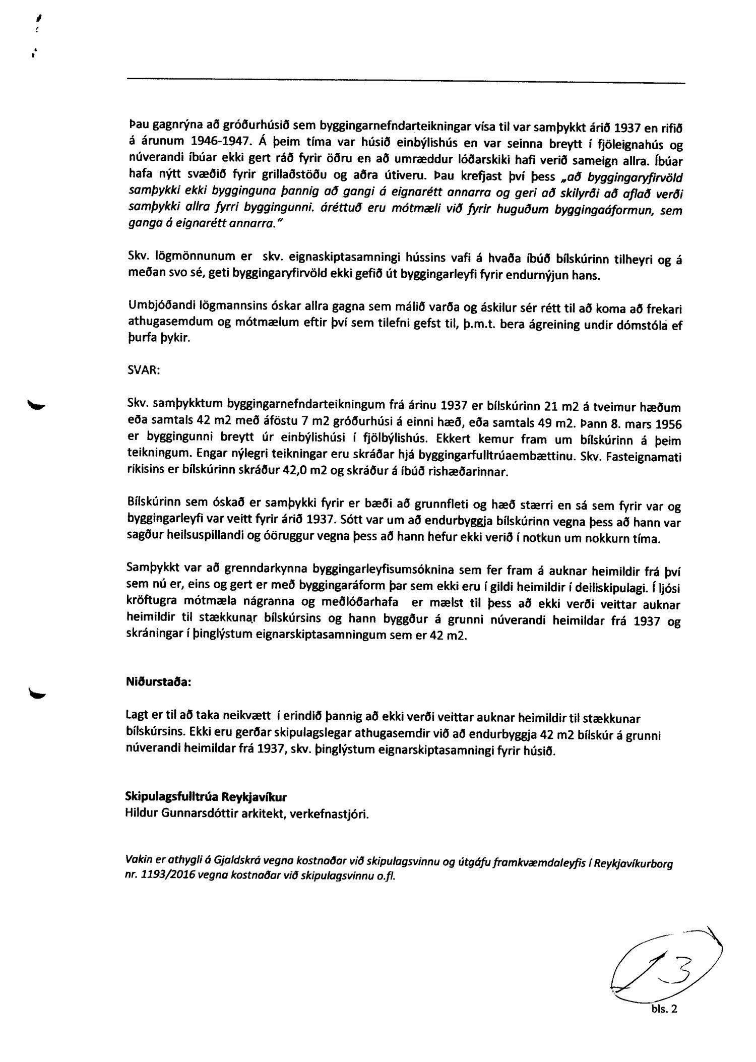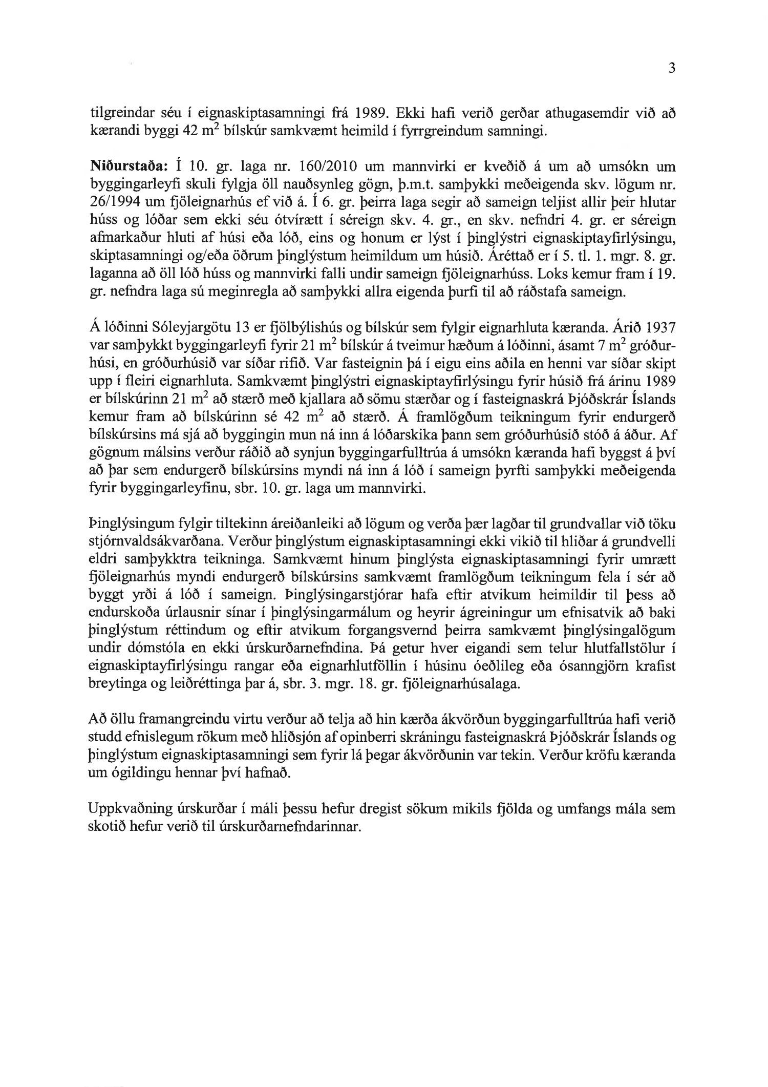 Lagt fram bréf umhverfis- og auðlindamála dags. 20. desember 2017 ásamt kæru dags. 20. desember 2017 þar sem kærð er synjun á umsókn um endurbyggingu á bílskúrsbyggingu við Sóleyjargötu 13. Einnig er lögð fram umsögn skrifstofu sviðsstjóra dags. 4. janúar 2018. Jafnframt er lagður fram úrskurður úrskurðarnefndar umhverfis- og auðlindamála frá 28. febrúar 2019. Úrskurðarorð: Hafnað er kröfu kæranda um ógildingu ákvörðunar byggingarfulltrúans í Reykjavík frá 21. nóvember 2017 um að synja umsókn um byggingarleyfi fyrir endurgerð bílskúrs að Sóleyjargötu 13.