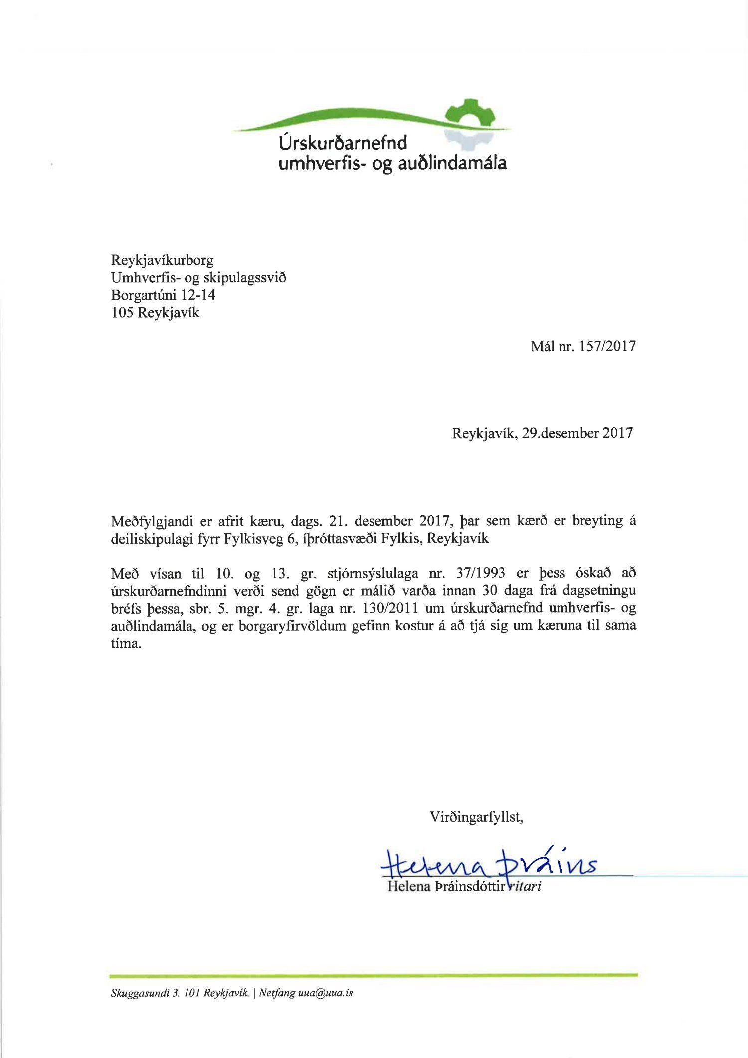 Lagt fram bréf úrskurðarnefndar umhverfis- og auðlindamála dags. 29. desember 2017 ásamt kæru dags. 21. desember 2017 þar sem kærð er breyting á deiliskipulagi fyrir fylkisveg 6, íþróttasvæði Fylkis. Einnig er lögð fram umsögn skrifstofu sviðsstjóra dags. 28. febrúar 2018. Jafnframt er lagður fram úrskurður úrskurðarnefndar umhverfis- og auðlindamála frá 28. mars 2019. Úrskurðarorð: Kröfum Kærenda að Deildarási 4 og 6 er vísað frá úrskurðarnefndinni.