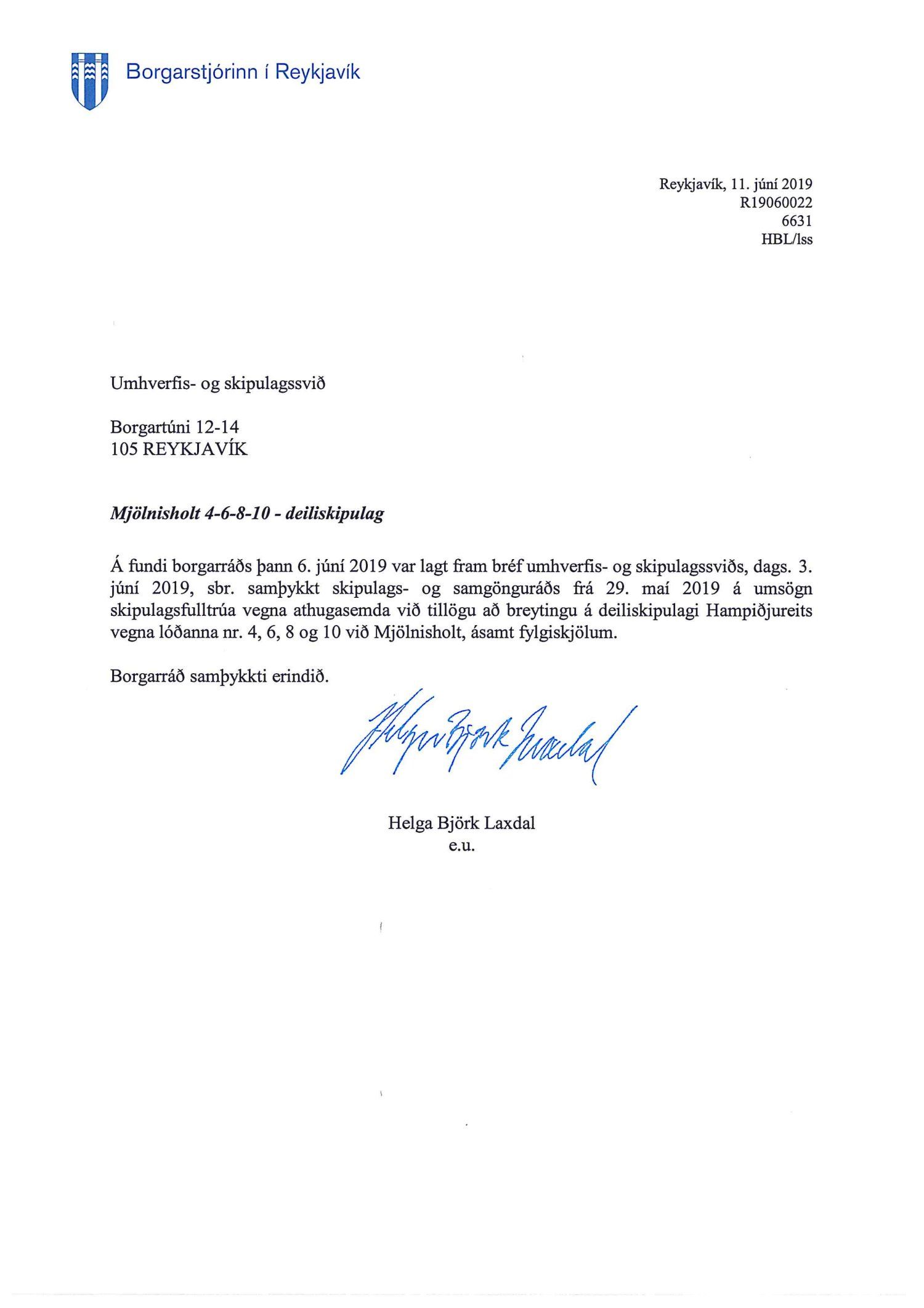 Lagt fram bréf borgarstjóra dags. 11. júní 2019 vegna samþykktar borgarráðs frá 6. júní 2019 á umsögn skipulagsfulltrúa vegna athugasemda við tillögu að breytingu á deiliskipulagi Hampiðjureits vegna lóðanna nr. 4, 6, 8 og 10 við Mjölnisholt.