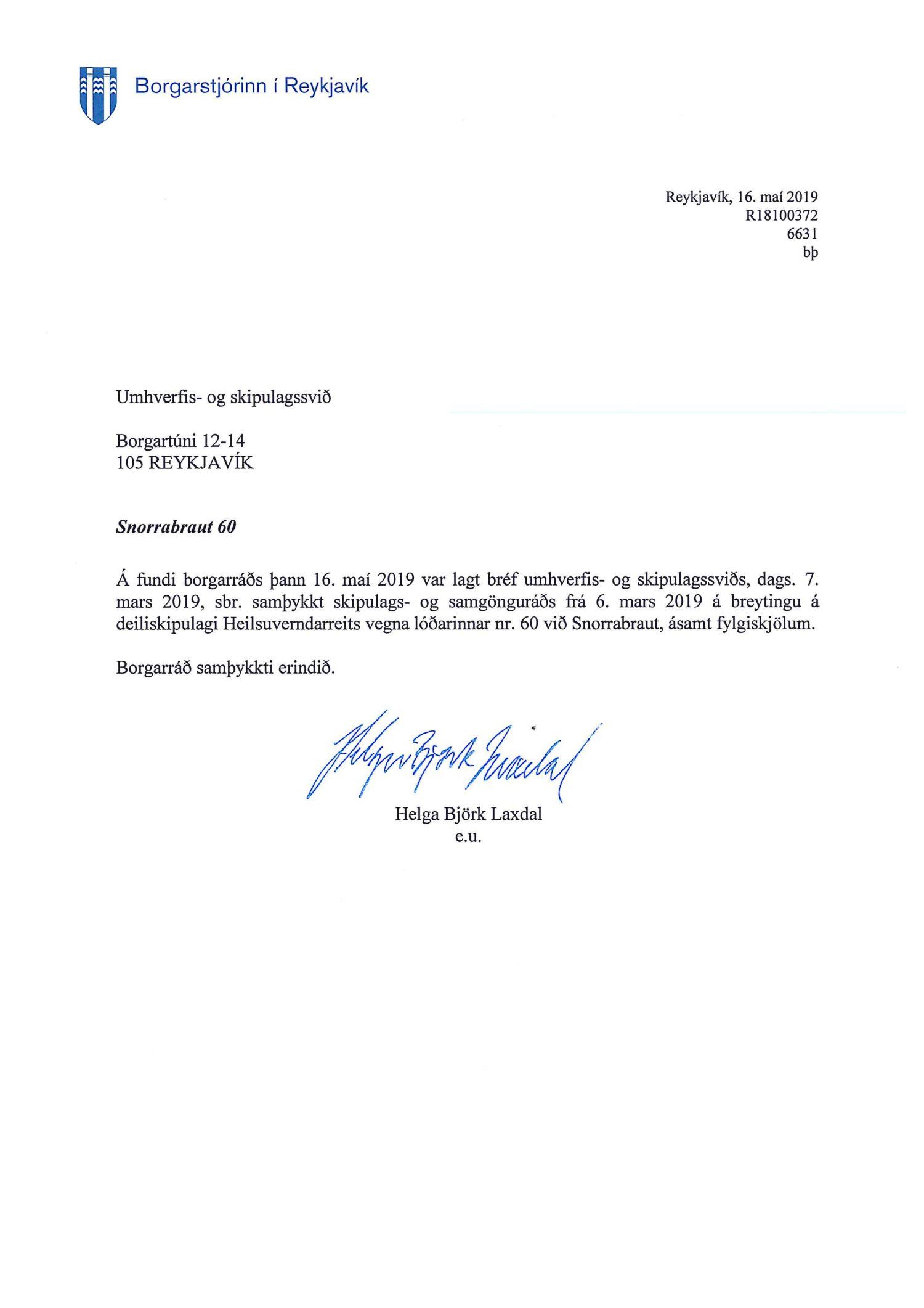 Lagt fram bréf borgarstjóra dags. 16. maí 2019 vegna samþykktar borgarráðs s.d. á breytingu á deiliskipulagi Heilsuverndarreits vegna lóðarinnar nr. 60 við Snorrabraut.