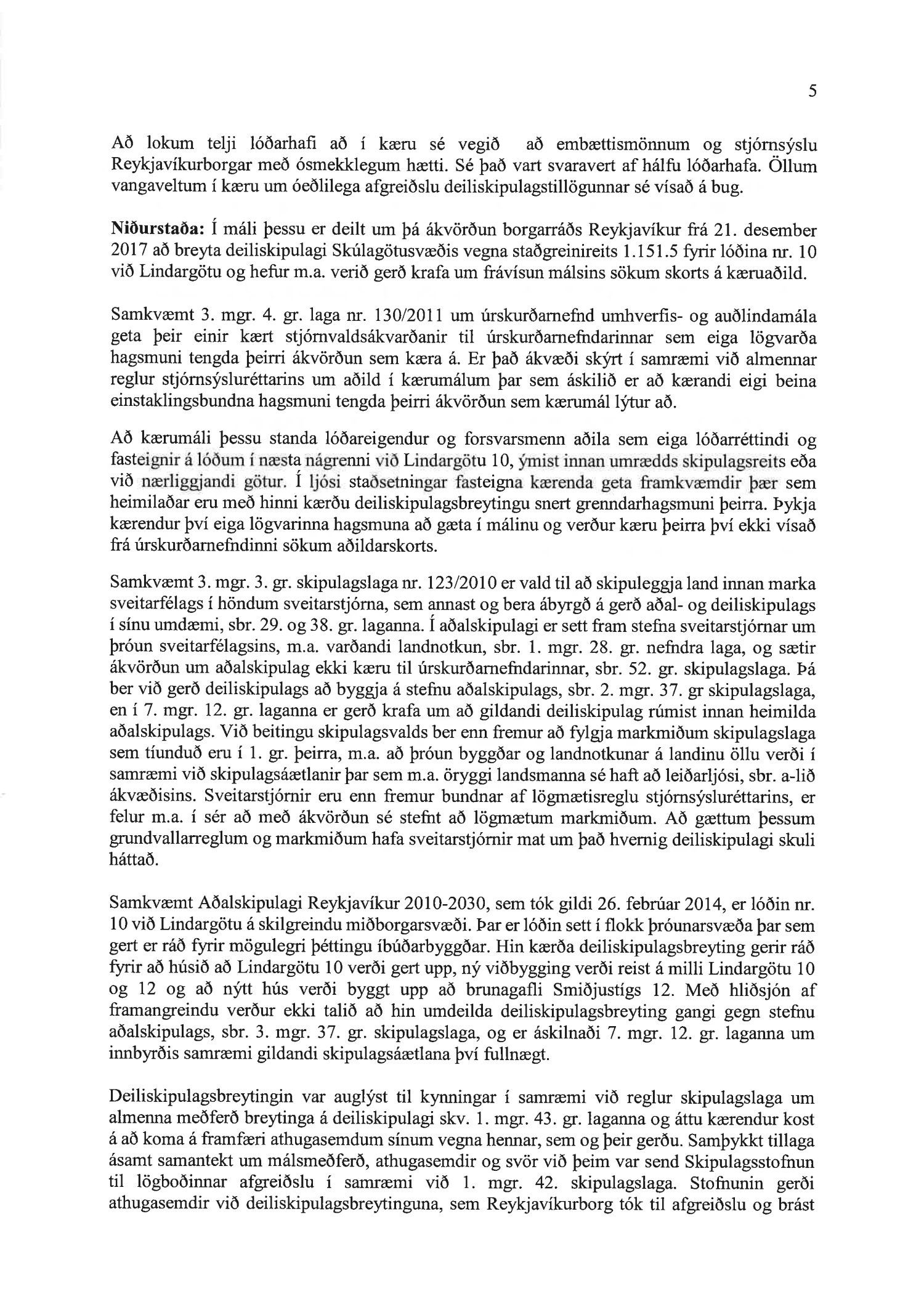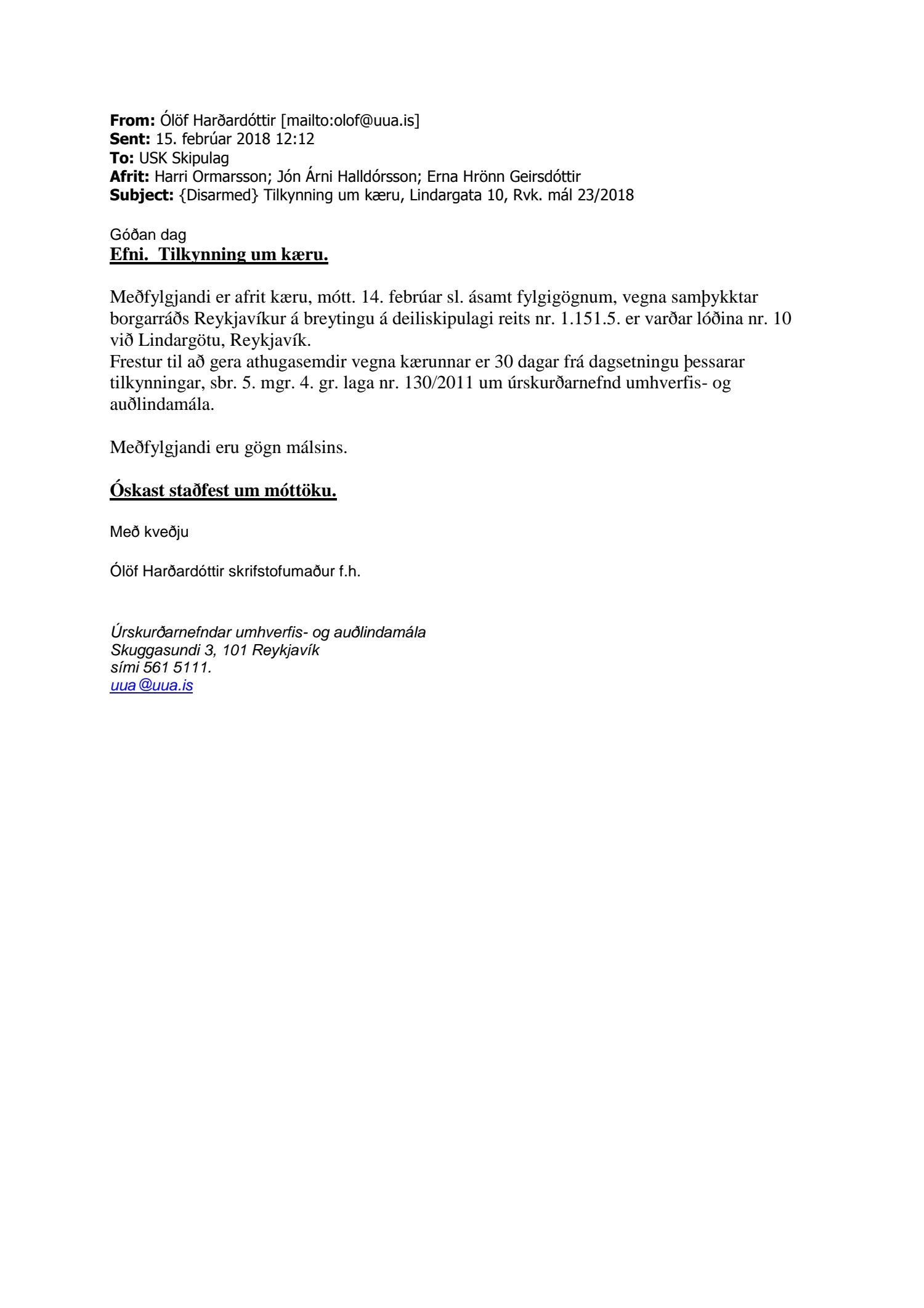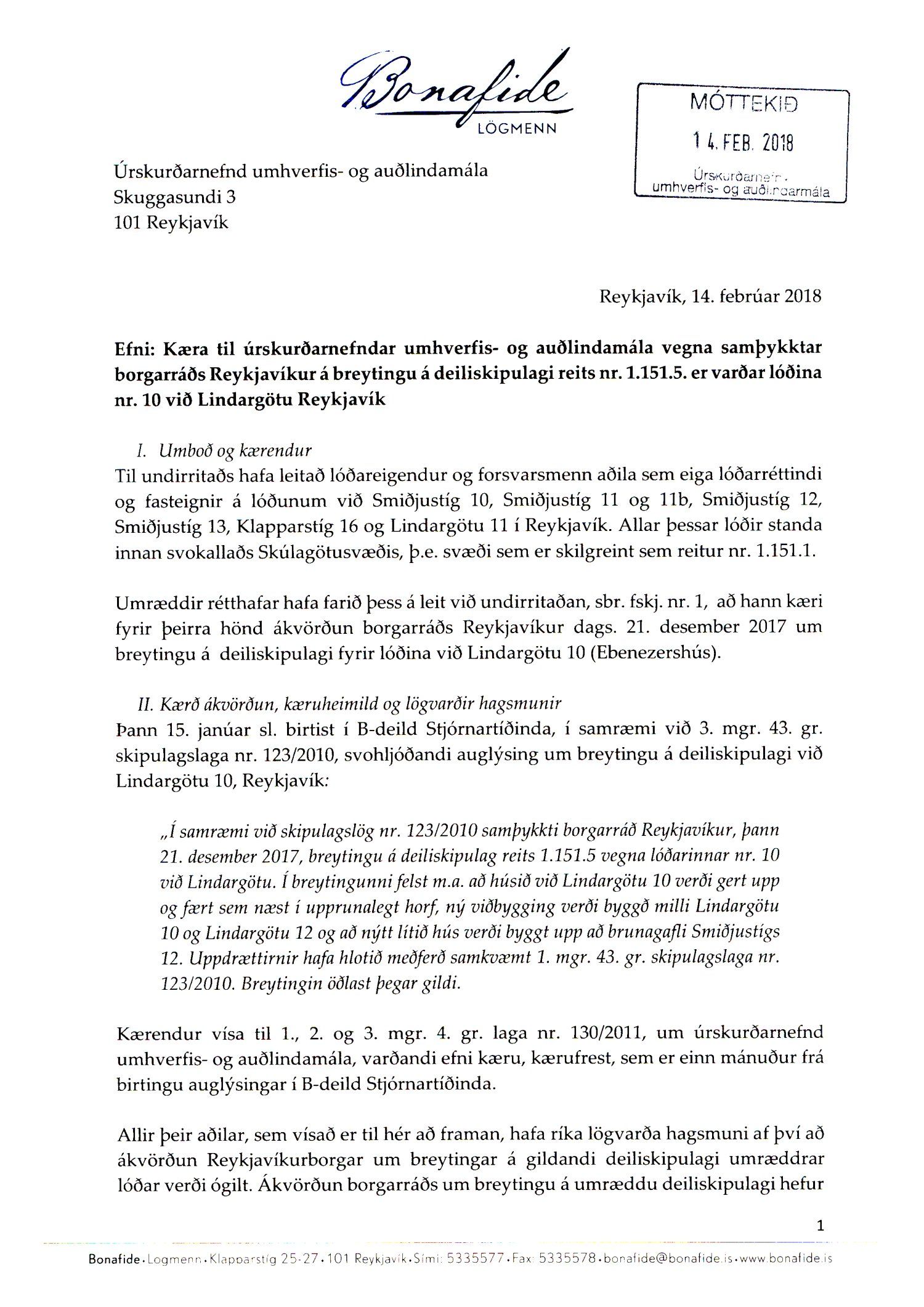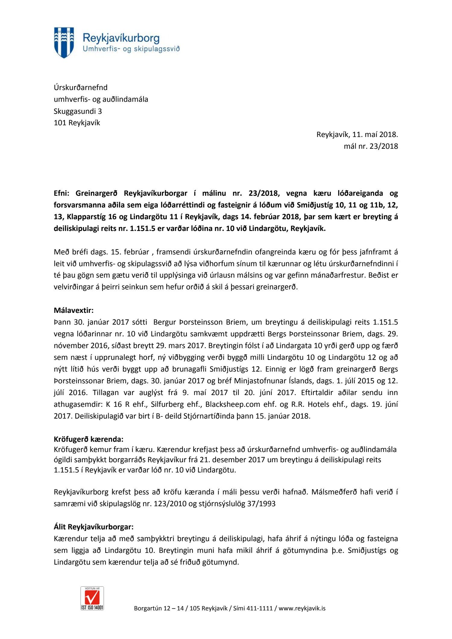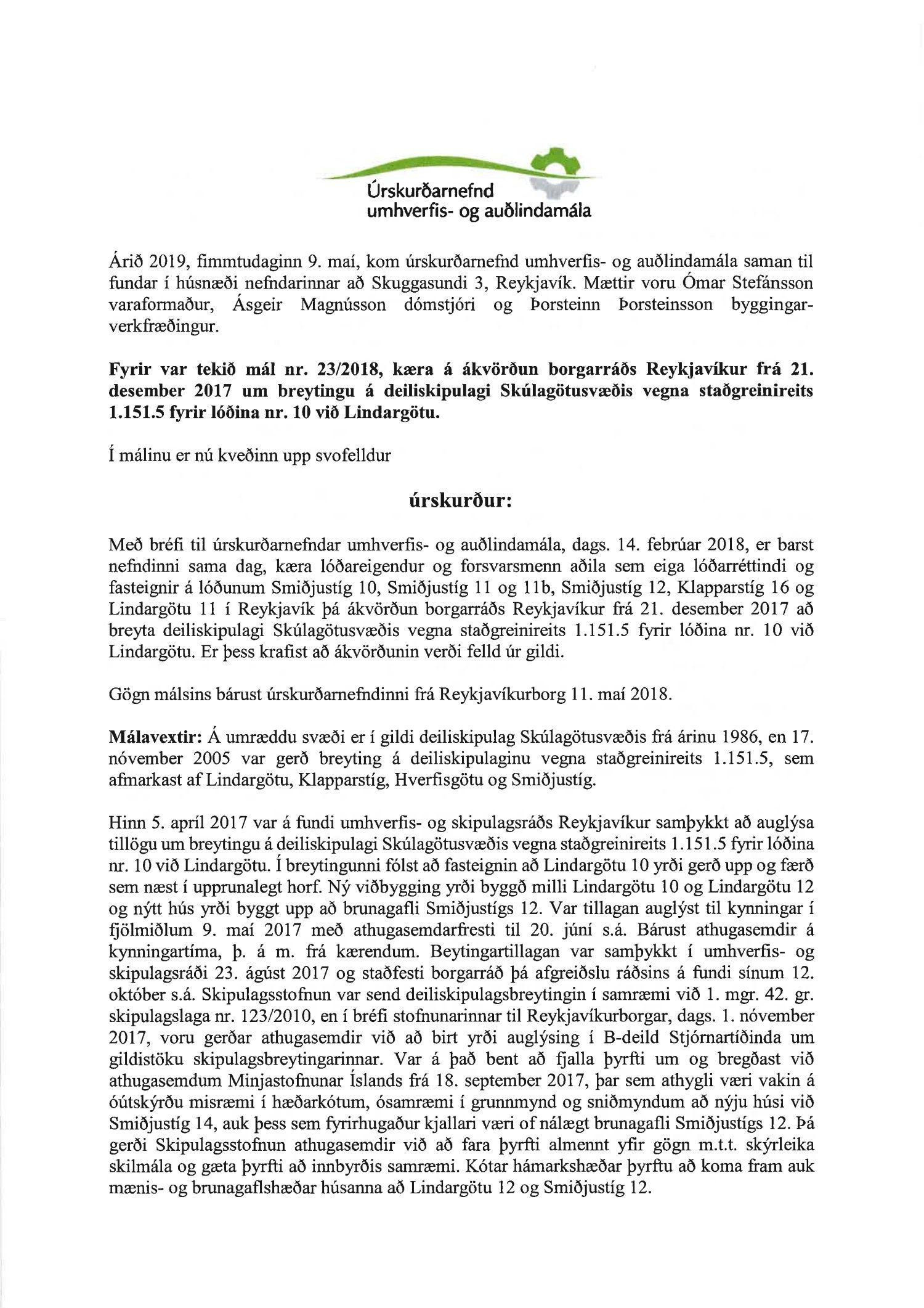 Lagt fram erindi frá úrskurðarnefnd umhverfis- og auðlindamála dags. 15. febrúar 2018 ásamt kæru dags. 14. febrúar 2018 þar sem kærð er samþykkt borgarráðs Reykjavíkur á breytingu á deiliskipulagi reits nr. 1.151.5. er varðar lóðina nr. 10 við Lindargötu. Einnig er lögð fram umsögn skrifstofu sviðsstjóra dags. 11. maí 2018. Jafnframt er lagður fram úrskurður úrskurðarnefndar umhverfis- og auðlindamála frá 9. maí 2019. Úrskurðarorð: Hafnað er kröfu kærenda um ógildingu á ákvörðun borgarráðs Reykjavíkur frá 21. desember 2017 um breytingu á deiliskipulagi Skúlagötusvæðis vegna staðgreinireits 1.151.5 fyrir lóðina nr. 10 við Lindargötu.