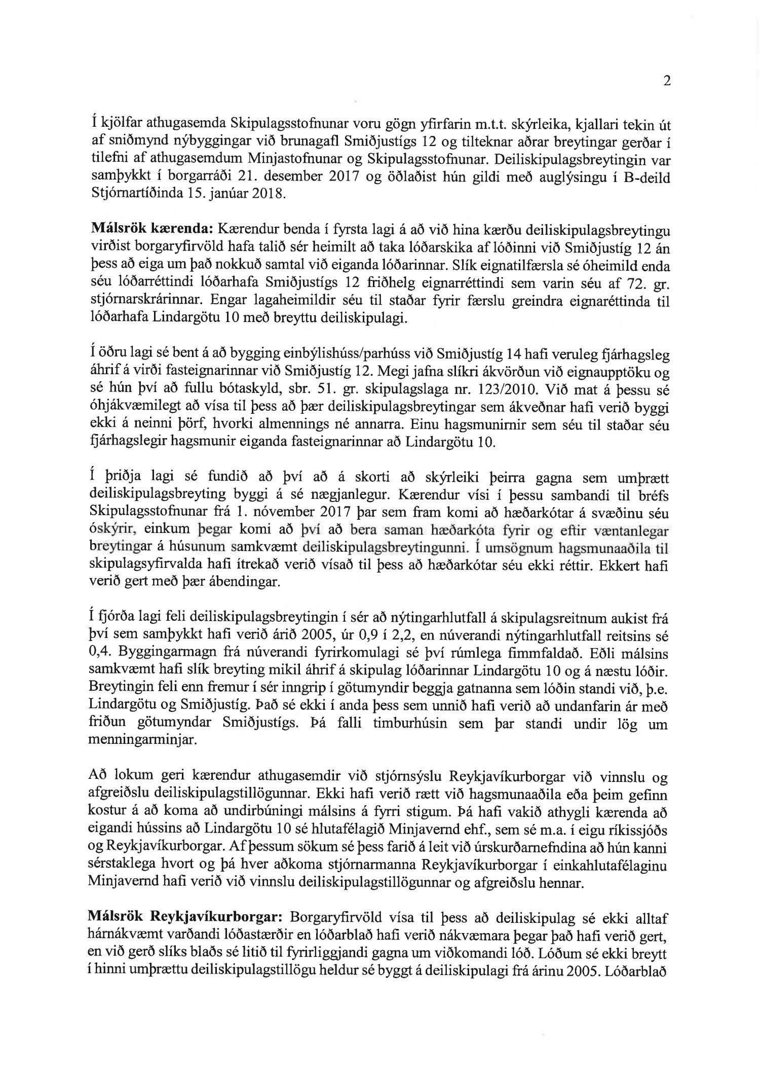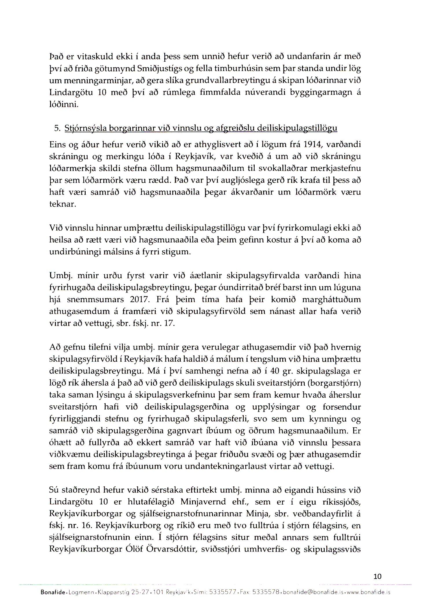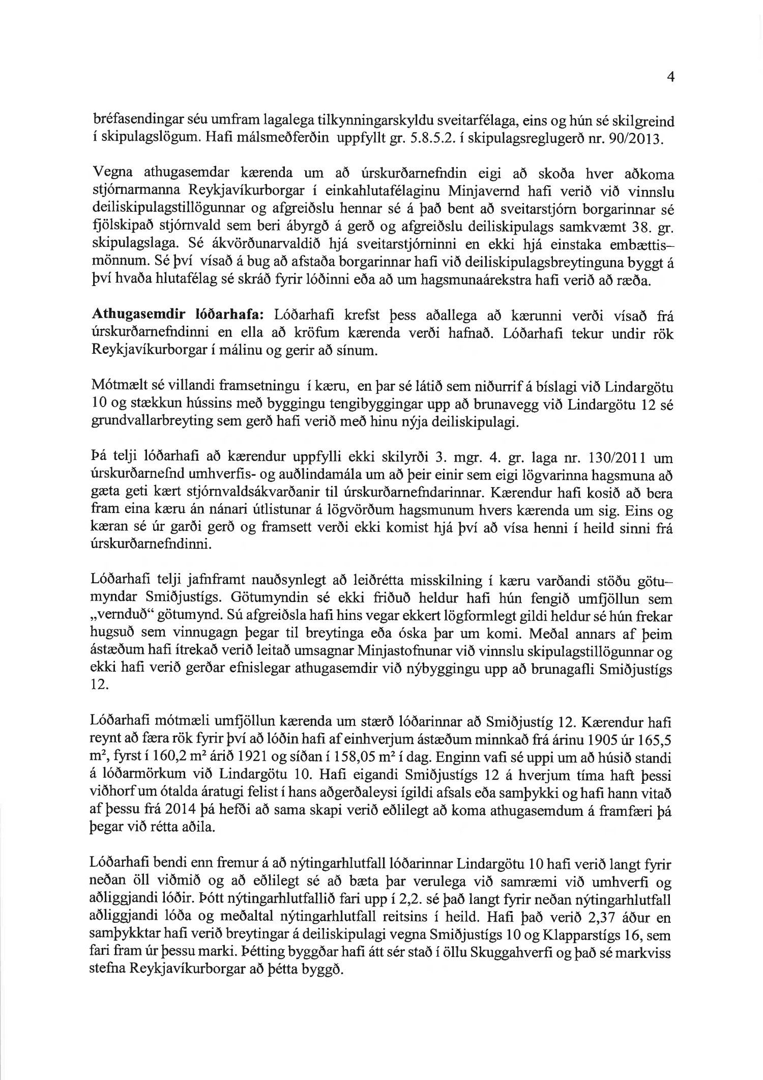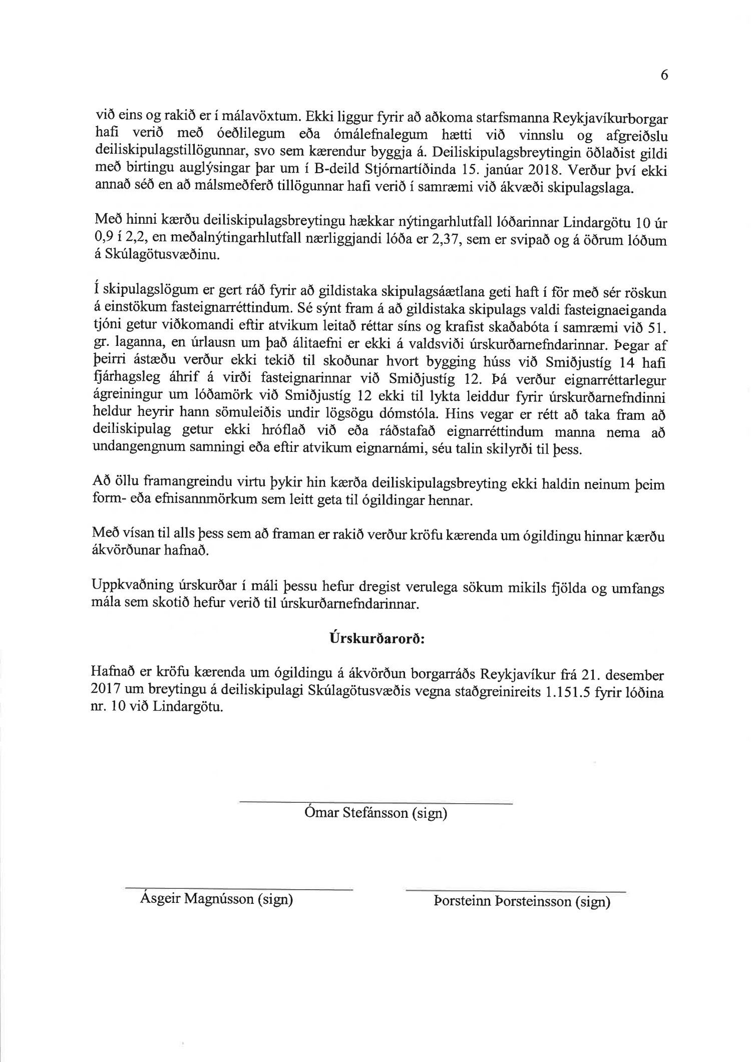 Lagt fram erindi frá úrskurðarnefnd umhverfis- og auðlindamála dags. 15. febrúar 2018 ásamt kæru dags. 14. febrúar 2018 þar sem kærð er samþykkt borgarráðs Reykjavíkur á breytingu á deiliskipulagi reits nr. 1.151.5. er varðar lóðina nr. 10 við Lindargötu. Einnig er lögð fram umsögn skrifstofu sviðsstjóra dags. 11. maí 2018. Jafnframt er lagður fram úrskurður úrskurðarnefndar umhverfis- og auðlindamála frá 9. maí 2019. Úrskurðarorð: Hafnað er kröfu kærenda um ógildingu á ákvörðun borgarráðs Reykjavíkur frá 21. desember 2017 um breytingu á deiliskipulagi Skúlagötusvæðis vegna staðgreinireits 1.151.5 fyrir lóðina nr. 10 við Lindargötu.