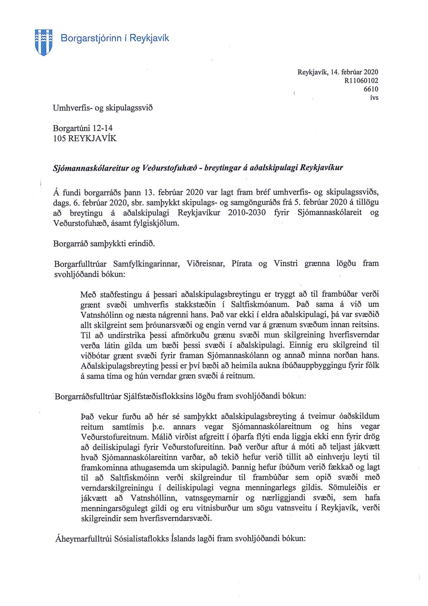 Lagt fram bréf borgarstjóra dags. 14. febrúar 2020 vegna samþykktar borgarráðs frá 13. febrúar 2020 á tillögu að breytingu á aðalskipulagi Reykjavíkur 2010-2030 fyrir Sjómannaskólareit og Veðurstofuhæð.