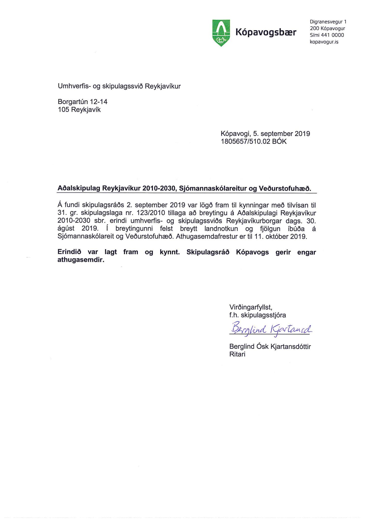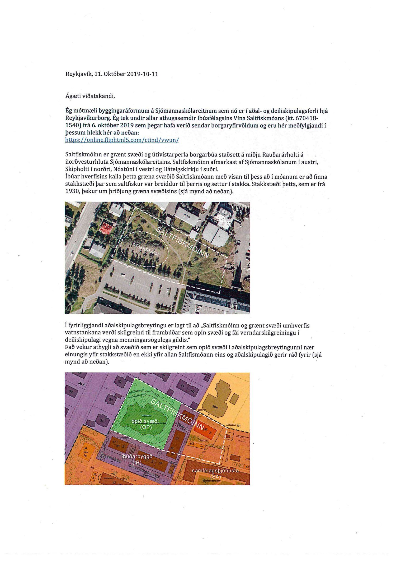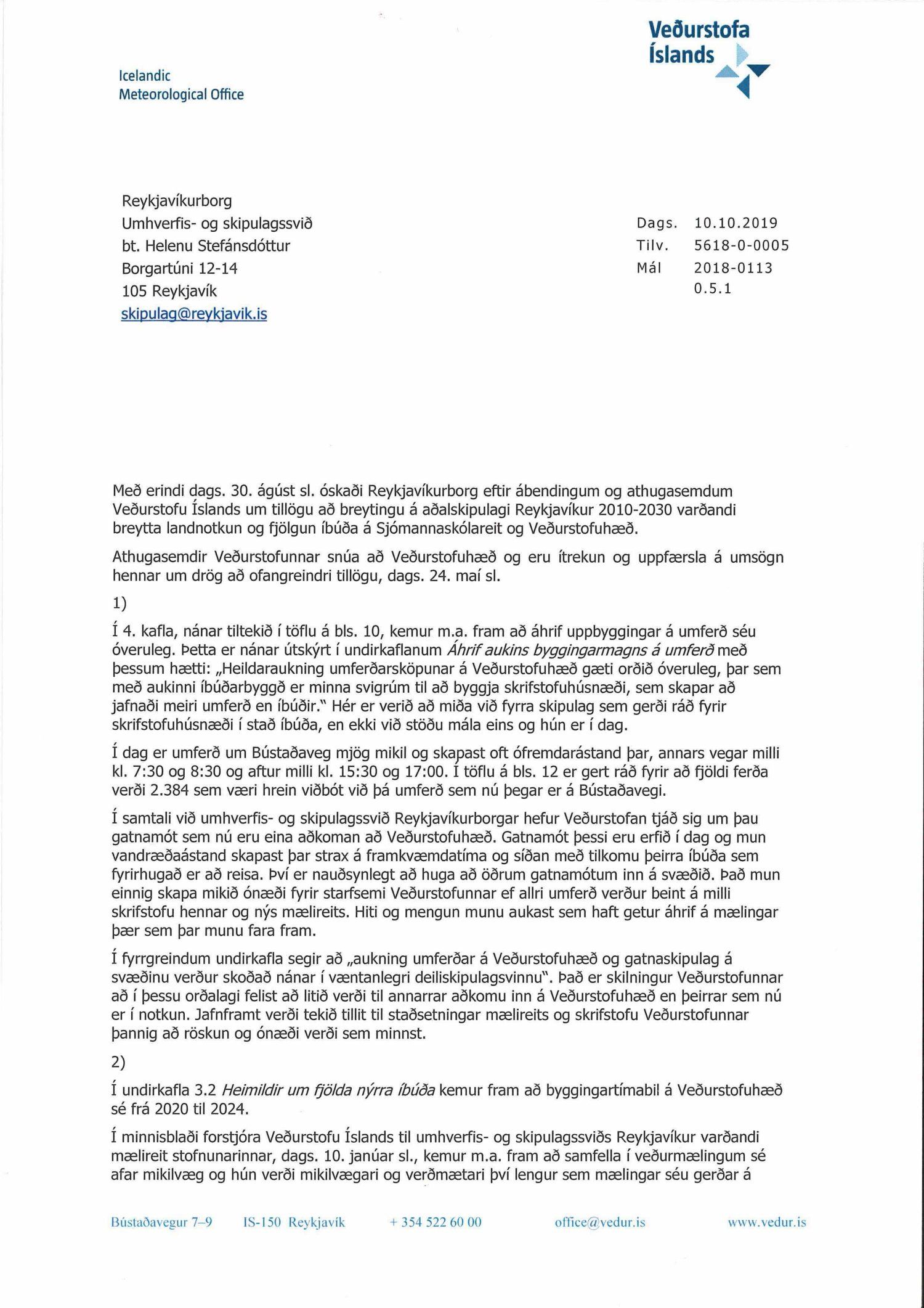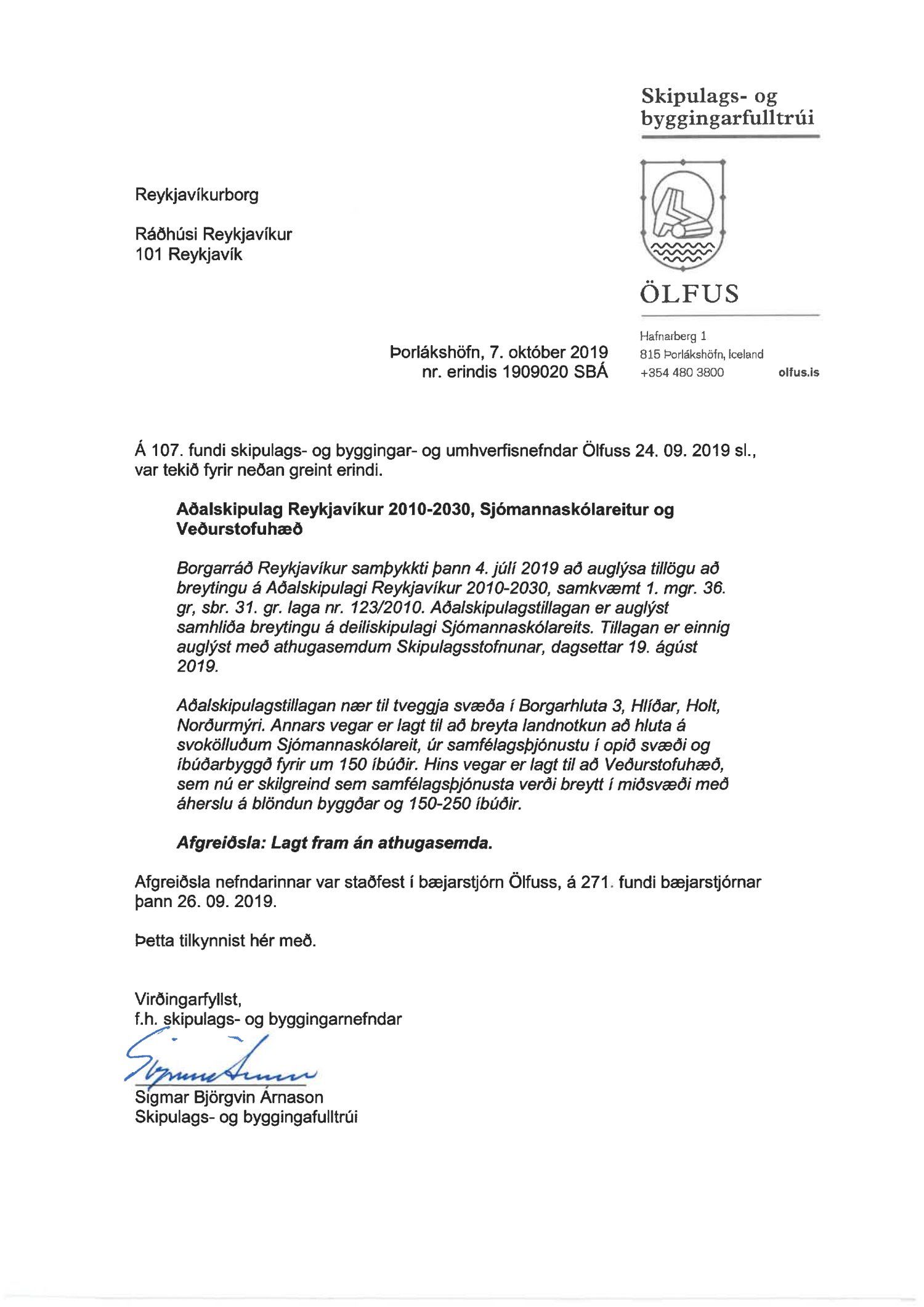 Að lokinni auglýsingu eru lagðar fram til kynningar innsendar athugasemdir við tillögu umhverfis- og skipulagssviðs dags. í júní 2019 uppf. 22. ágúst 2019 fyrir breytingu á aðalskipulagi fyrir Sjómannaskólareit og Veðurstofuhæð.Í breytingunni felst breytt landnotkun og fjölgun íbúða á svæðinu. Einnig er lagt fram bréf Skipulagsstofnunar dags. 19. ágúst 2019. Tillagan var auglýst frá 30. ágúst 2019 til og með 11. október 2019. Eftirtaldir sendu athugasemdir: Vinir Vatnshólsins dags. 1. október 2019 ásamt undirskriftarlista 261 aðila, Íbúafélagið Vinir Saltfiskmóans dags. 6. október 2019, Guðrún Steinarsdóttir dags. 8. október 2019, Jóhann Davíð Snorrason dags. 8. október 2019, María Dóra Björnsdóttir dags. 8. október 2019, Karl Thoroddsen dags. 9. október 2019, Perla Dís Kristinsdóttir dags. 9. október 2019, Réttur f.h. Ingu Birgittu Spur dags. 11. október 2019, Réttur f.h. Nóatún 31, húsfélag, dags. 11. október 2019, Sunna Dögg Ásgeirsdóttir dags. 10. október 2019, Lóa Margrét Hauksdóttir ásamt undirskriftarlista dags. 11. og 22. október 2019, Marcos Zotes dags. 11. október 2019, Kristinn Pálsson dags. 11. október 2019 og Gerður Sveinsdóttir f.h. Húsfélagsins Skipholti 44-50 dags. 11. október 2019. Einnig eru lagðar fram umsagnir frá eftirfarandi stofnunum: Bláskógabyggð dags. 5. september 2019, Kópavogsbær dags. 5. september 2019, Garðabær dags. 23. september 2019, Ölfus dags. 7. október 2019, Veðurstofa Íslands dags. 10. október 2019 og Vegagerðin dags. 14. október 2019.