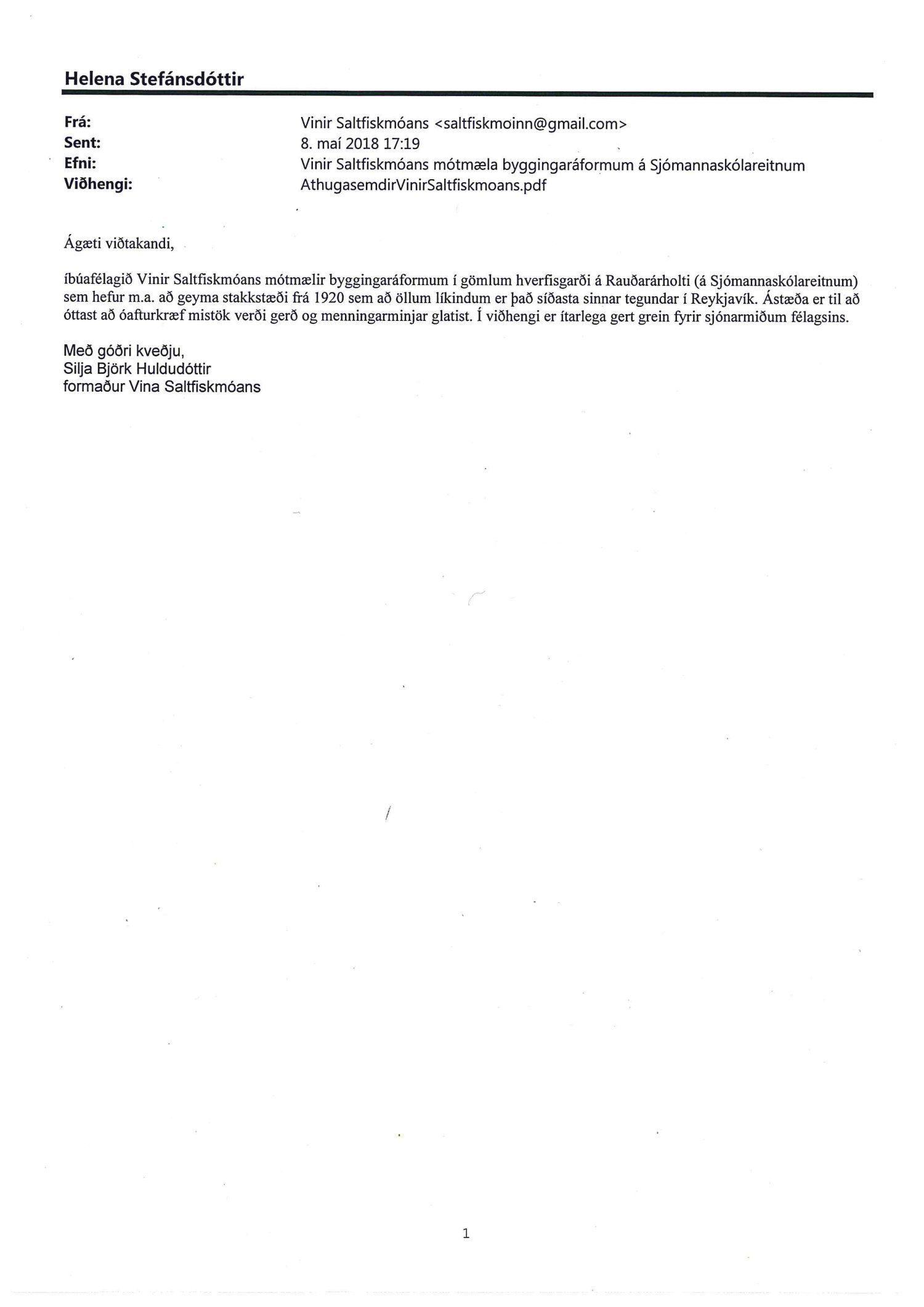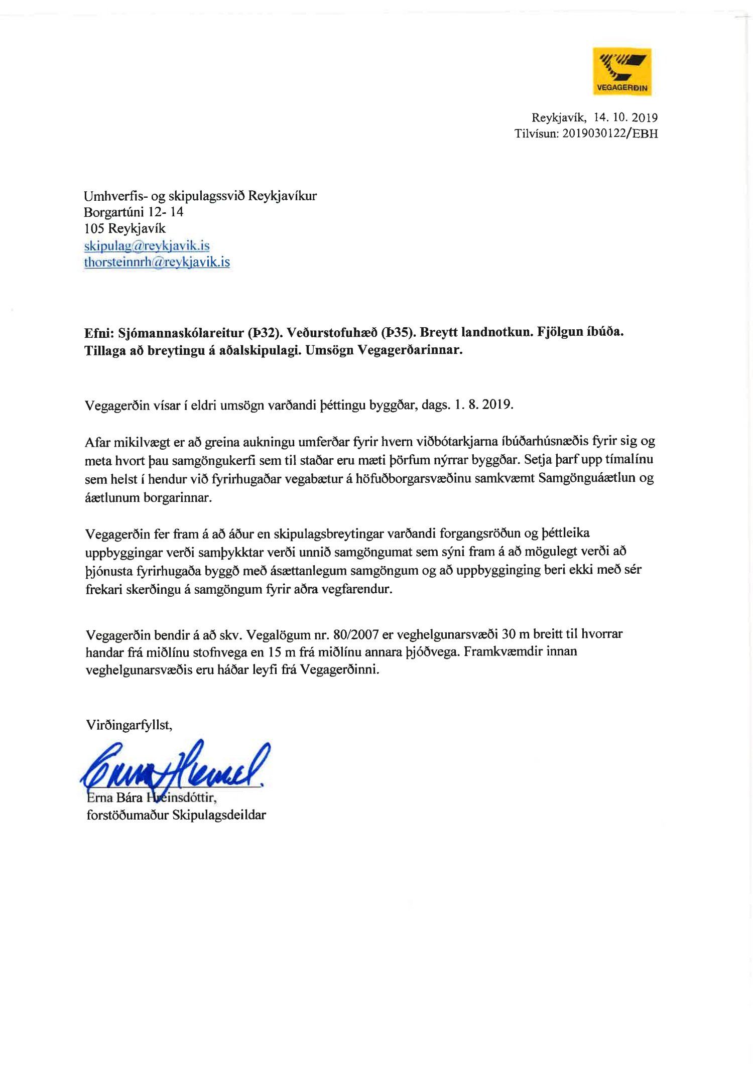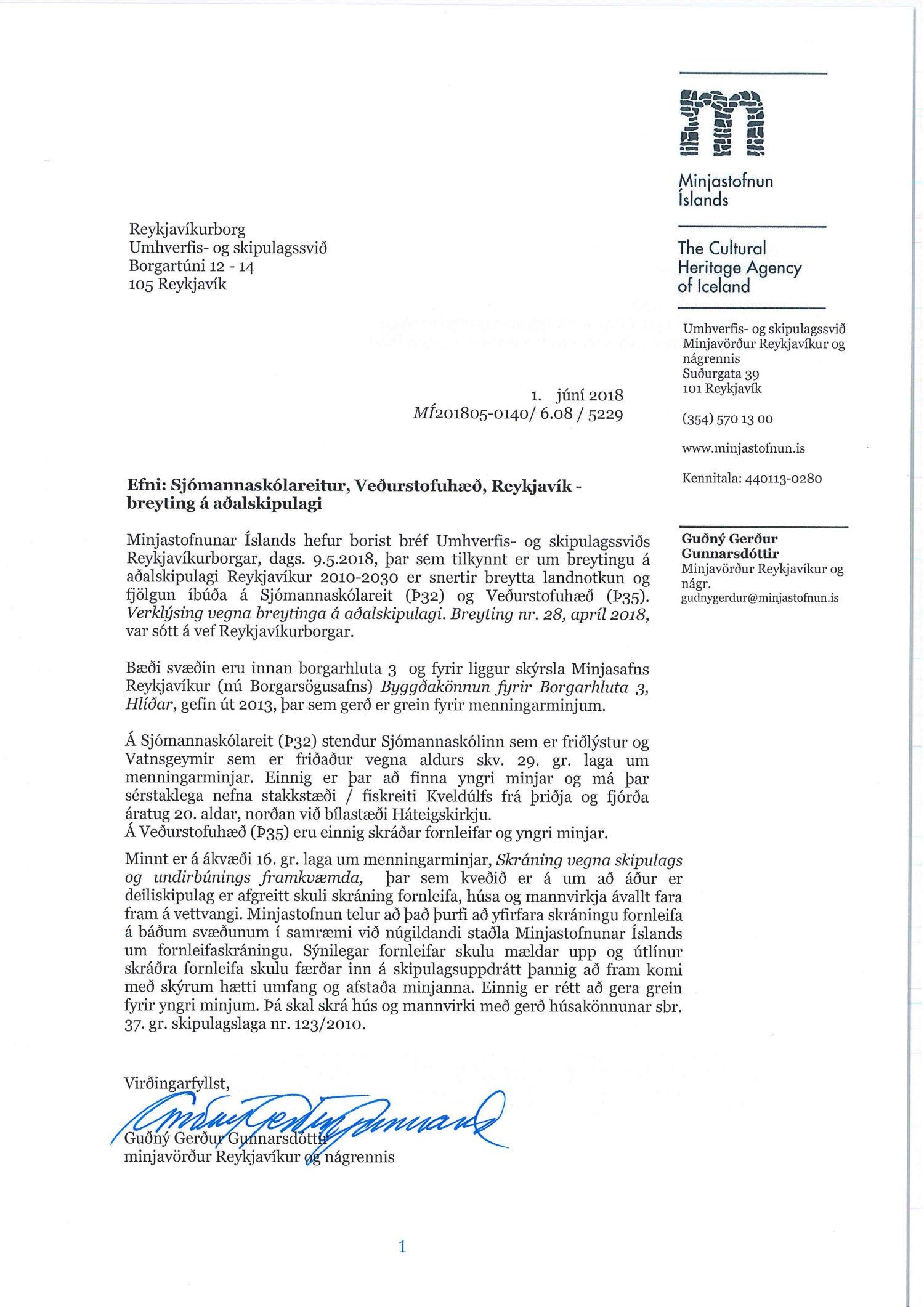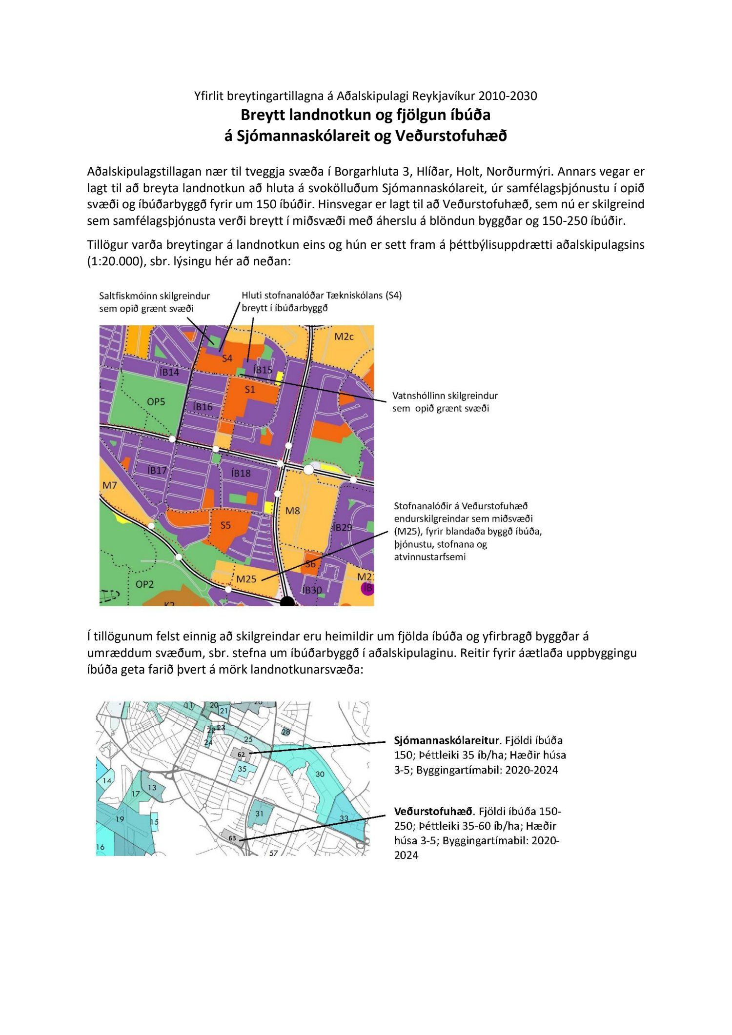 Að lokinni auglýsingu eru lagðar fram til kynningar innsendar athugasemdir við tillögu umhverfis- og skipulagssviðs dags. í júní 2019 uppf. 22. ágúst 2019 fyrir breytingu á aðalskipulagi fyrir Sjómannaskólareit og Veðurstofuhæð.Í breytingunni felst breytt landnotkun og fjölgun íbúða á svæðinu. Einnig er lagt fram bréf Skipulagsstofnunar dags. 19. ágúst 2019. Tillagan var auglýst frá 30. ágúst 2019 til og með 11. október 2019. Eftirtaldir sendu athugasemdir: Vinir Vatnshólsins dags. 1. október 2019 ásamt undirskriftarlista 261 aðila, Íbúafélagið Vinir Saltfiskmóans dags. 6. október 2019, Guðrún Steinarsdóttir dags. 8. október 2019, Jóhann Davíð Snorrason dags. 8. október 2019, María Dóra Björnsdóttir dags. 8. október 2019, Karl Thoroddsen dags. 9. október 2019, Perla Dís Kristinsdóttir dags. 9. október 2019, Réttur f.h. Ingu Birgittu Spur dags. 11. október 2019, Réttur f.h. Nóatún 31, húsfélag, dags. 11. október 2019, Sunna Dögg Ásgeirsdóttir dags. 10. október 2019, Lóa Margrét Hauksdóttir ásamt undirskriftarlista dags. 11. og 22. október 2019, Marcos Zotes dags. 11. október 2019, Kristinn Pálsson dags. 11. október 2019 og Gerður Sveinsdóttir f.h. Húsfélagsins Skipholti 44-50 dags. 11. október 2019. Einnig eru lagðar fram umsagnir frá eftirfarandi stofnunum: Bláskógabyggð dags. 5. september 2019, Kópavogsbær dags. 5. september 2019, Garðabær dags. 23. september 2019, Ölfus dags. 7. október 2019, Veðurstofa Íslands dags. 10. október 2019 og Vegagerðin dags. 14. október 2019.