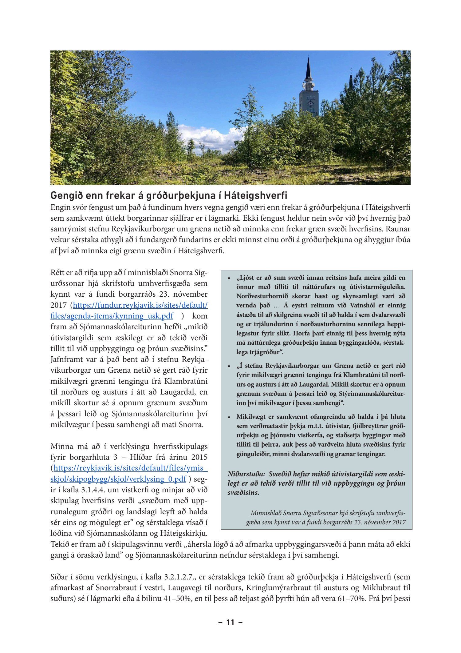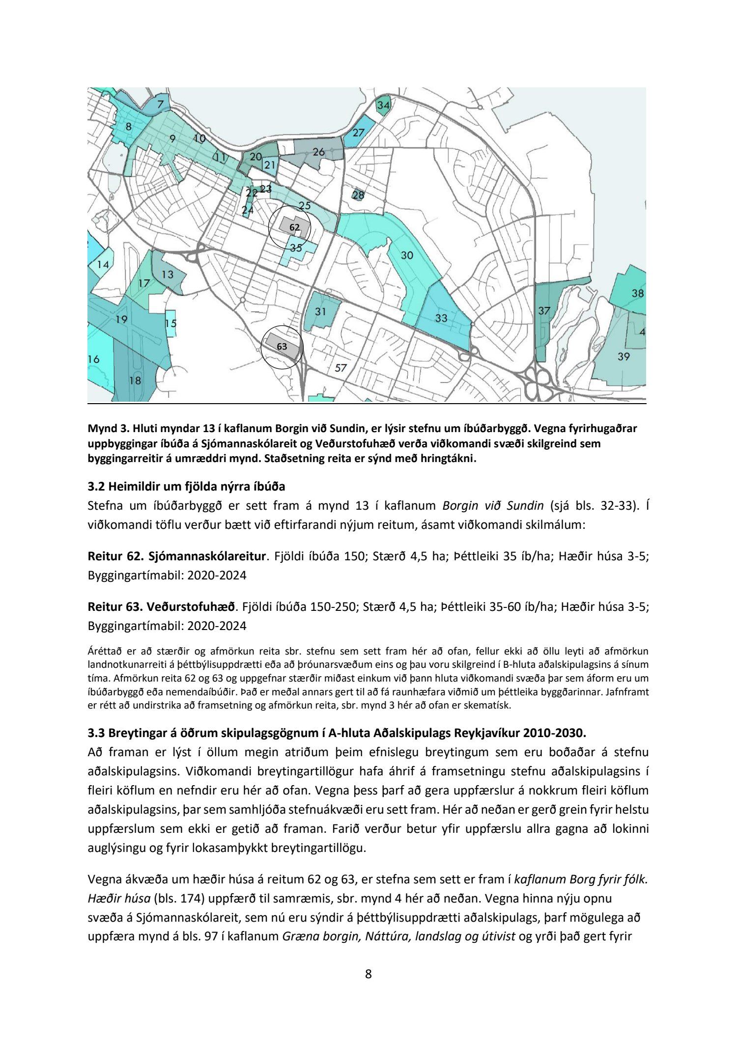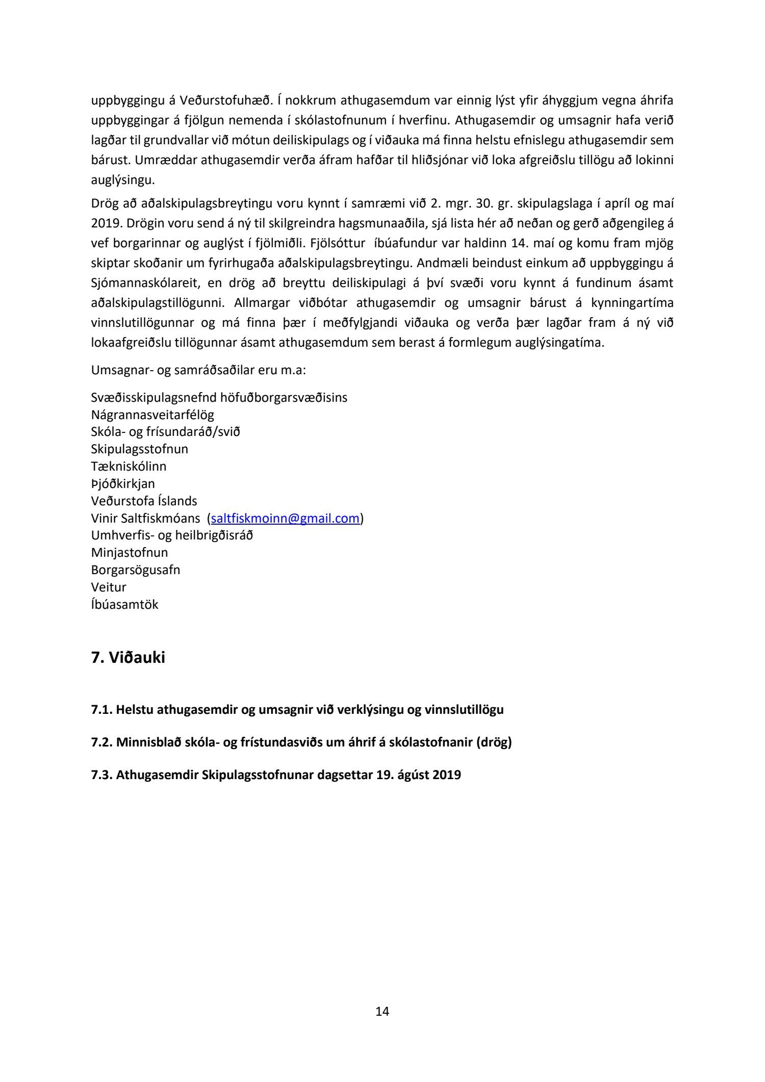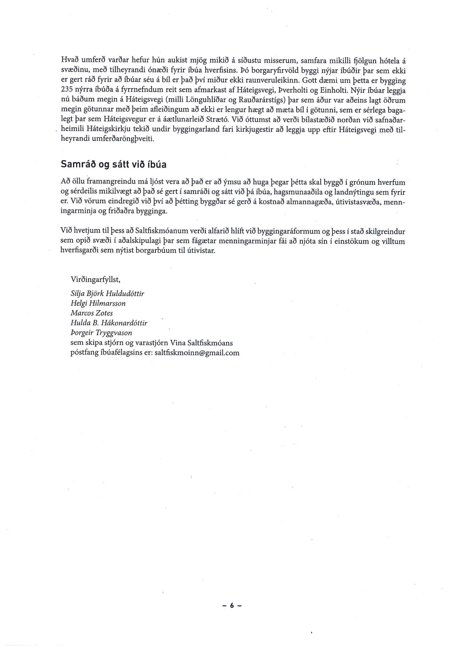 Að lokinni auglýsingu eru lagðar fram til kynningar innsendar athugasemdir við tillögu umhverfis- og skipulagssviðs dags. í júní 2019 uppf. 22. ágúst 2019 fyrir breytingu á aðalskipulagi fyrir Sjómannaskólareit og Veðurstofuhæð.Í breytingunni felst breytt landnotkun og fjölgun íbúða á svæðinu. Einnig er lagt fram bréf Skipulagsstofnunar dags. 19. ágúst 2019. Tillagan var auglýst frá 30. ágúst 2019 til og með 11. október 2019. Eftirtaldir sendu athugasemdir: Vinir Vatnshólsins dags. 1. október 2019 ásamt undirskriftarlista 261 aðila, Íbúafélagið Vinir Saltfiskmóans dags. 6. október 2019, Guðrún Steinarsdóttir dags. 8. október 2019, Jóhann Davíð Snorrason dags. 8. október 2019, María Dóra Björnsdóttir dags. 8. október 2019, Karl Thoroddsen dags. 9. október 2019, Perla Dís Kristinsdóttir dags. 9. október 2019, Réttur f.h. Ingu Birgittu Spur dags. 11. október 2019, Réttur f.h. Nóatún 31, húsfélag, dags. 11. október 2019, Sunna Dögg Ásgeirsdóttir dags. 10. október 2019, Lóa Margrét Hauksdóttir ásamt undirskriftarlista dags. 11. og 22. október 2019, Marcos Zotes dags. 11. október 2019, Kristinn Pálsson dags. 11. október 2019 og Gerður Sveinsdóttir f.h. Húsfélagsins Skipholti 44-50 dags. 11. október 2019. Einnig eru lagðar fram umsagnir frá eftirfarandi stofnunum: Bláskógabyggð dags. 5. september 2019, Kópavogsbær dags. 5. september 2019, Garðabær dags. 23. september 2019, Ölfus dags. 7. október 2019, Veðurstofa Íslands dags. 10. október 2019 og Vegagerðin dags. 14. október 2019.