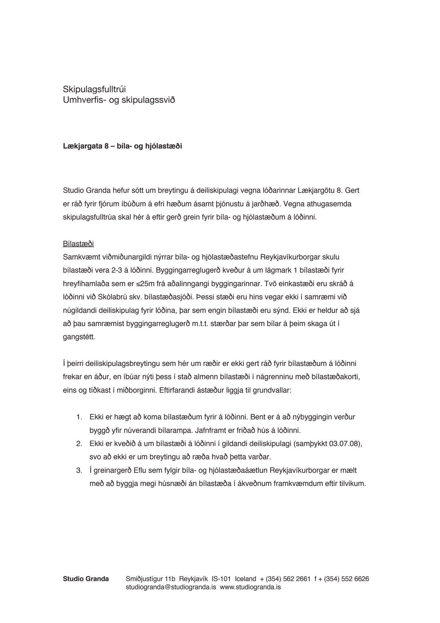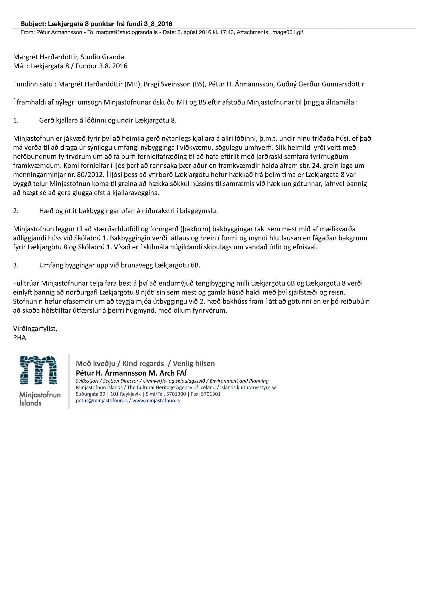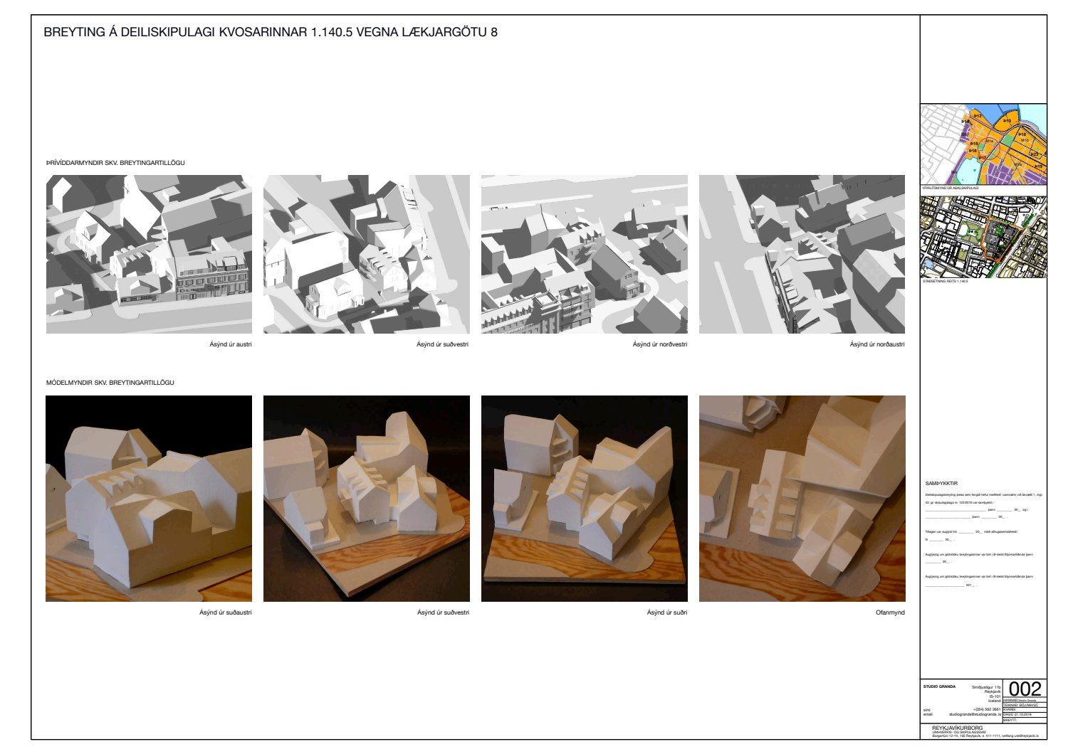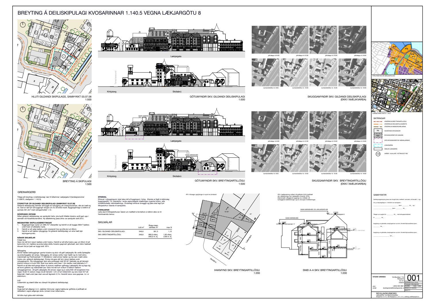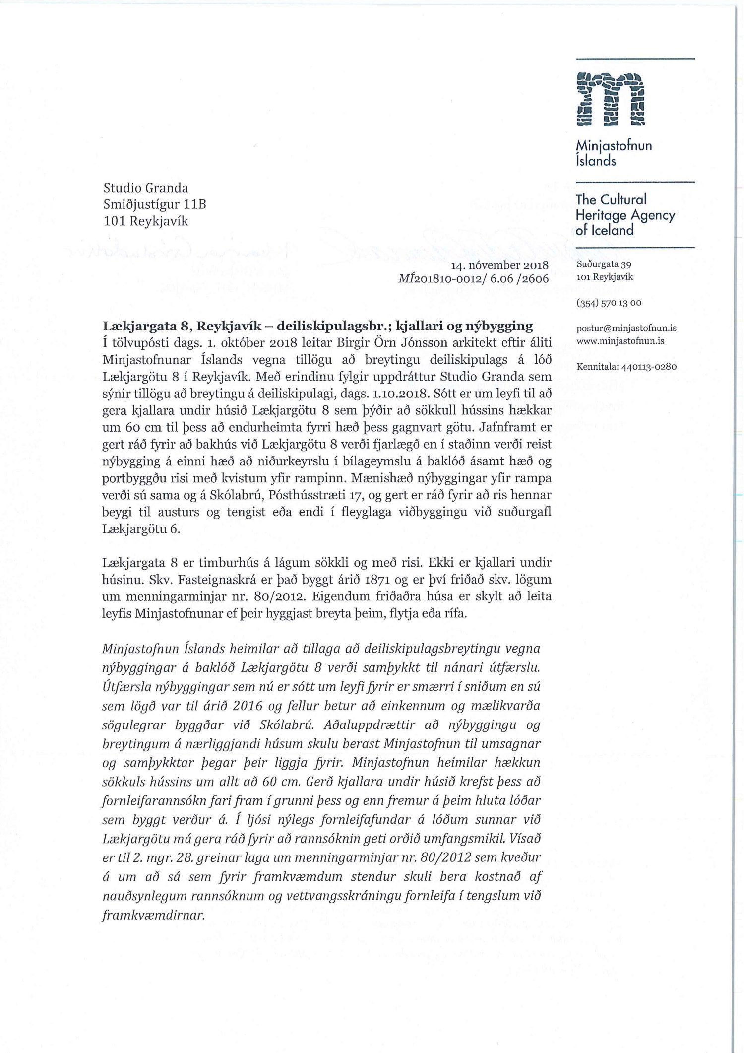 Lögð er fram umsókn Studio Granda ehf. dags. 3. maí 2018 varðandi breytingu á deiliskipulagi reits 1.140.5, Pósthússtrætisreits, vegna lóðarinnar nr. 8 við Lækjargötu. Í breytingunni felst m.a. að einnar hæðar bakbyggingar gamla hússins og skúr við gafl Lækjargötu 6b verði fjarlægðar og endurbyggðar að hluta, byggðar eru 2 hæðir og portbyggt ris með kvistum yfir innkeyrsluramp auk þess sem byggt er upp að gafli Lækjargötu 6b. Gert er ráð fyrir kjallara undir gamla húsinu og nýbyggingu, samkvæmt deiliskipulags- og skuggavarpsuppdr. Studio Granda ehf. dags. 1. október. Jafnframt er lögð fram umsögn Minjastofnunar Íslands dags. 14. nóvember 2018 og bréf Studio Granda ehf. dags. 22. janúar 2019.