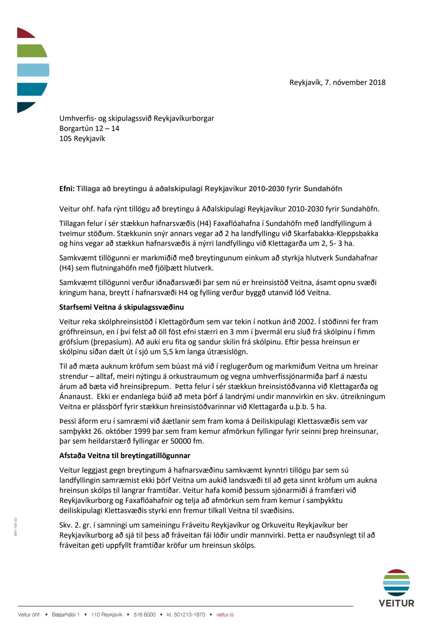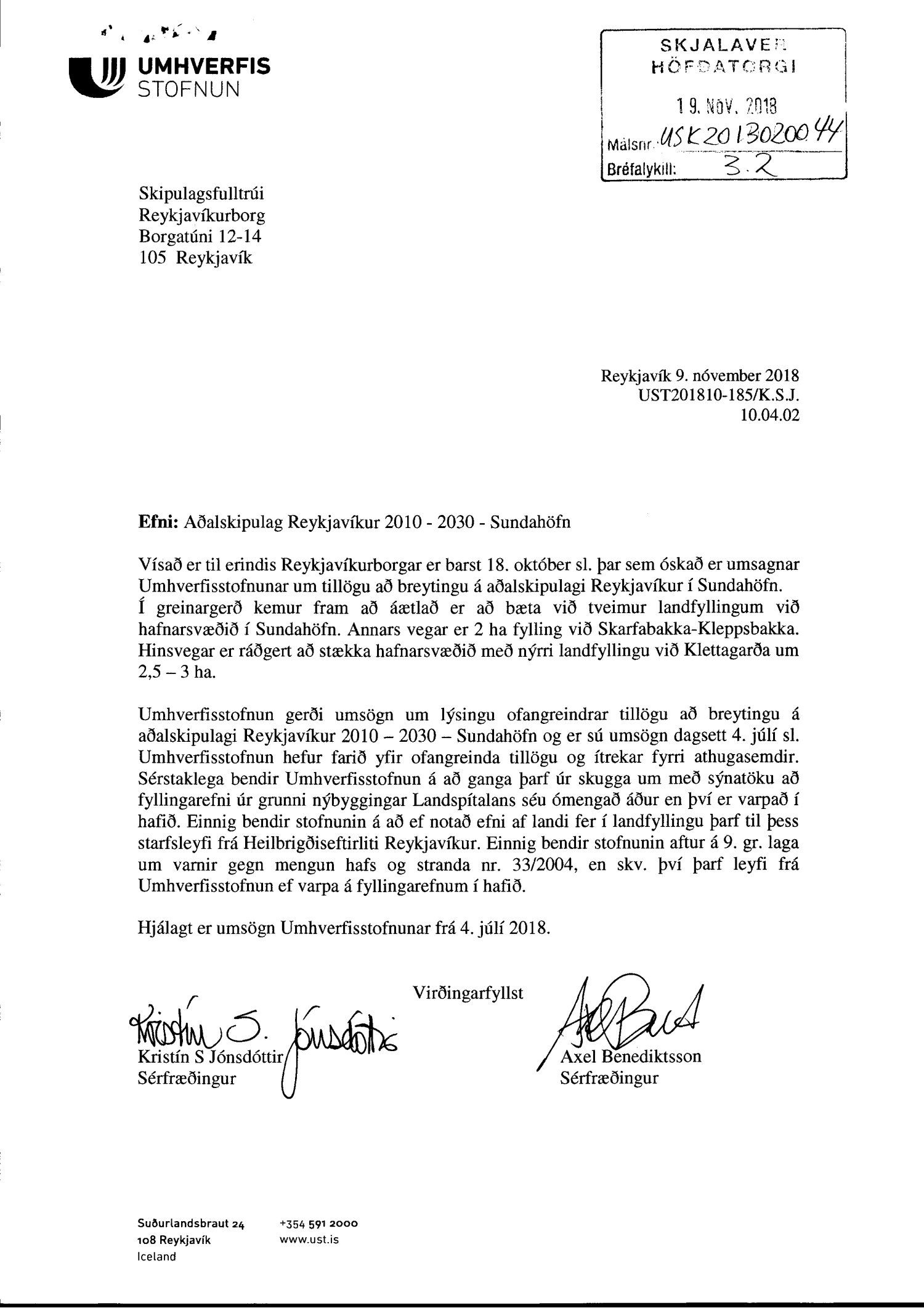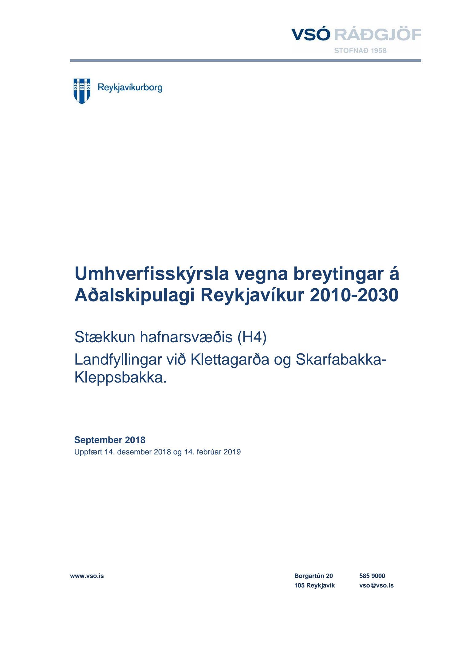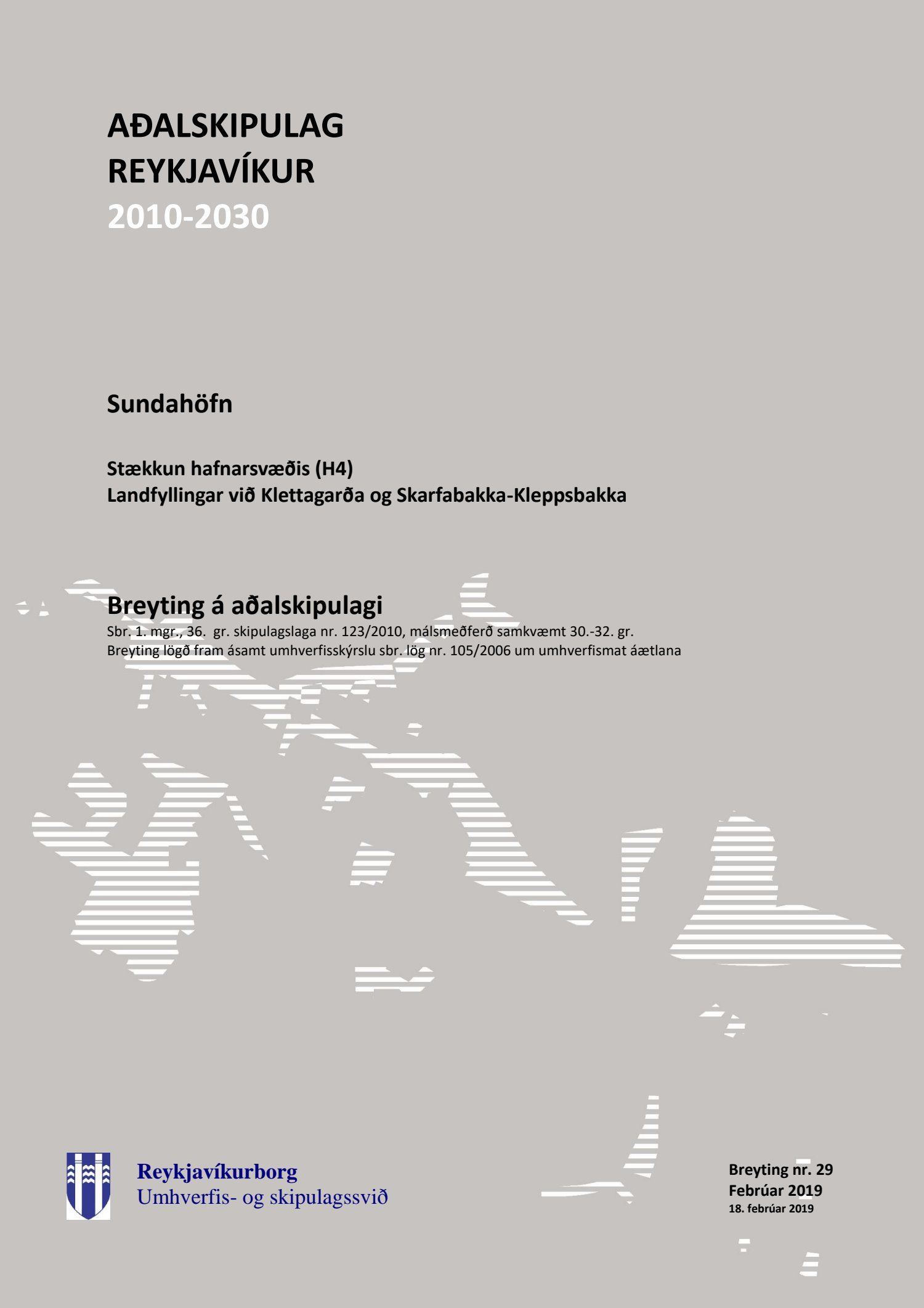 Að lokinni auglýsingu er lögð fram til kynningar tillaga umhverfis- og skipulagssviðs dags í nóvember 2018, uppf. 13. desember 2018, að breytingu á aðalskipulagi Reykjavíkur 2010-2030 fyrir Sundahöfn vegna landfyllingar við Klettagarða ásamt umhverfisskýrsla VSÓ ráðgjafar dags. í september 2018, uppf. 14. desember 2018. Einnig er lögð fram greinargerð