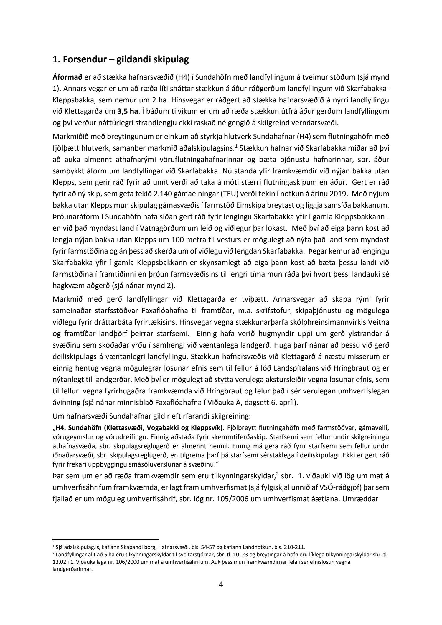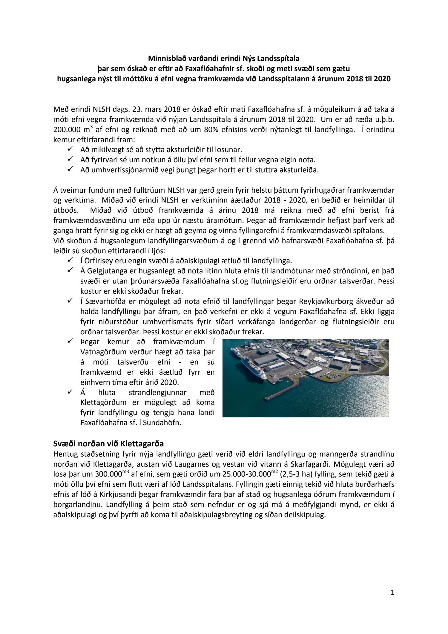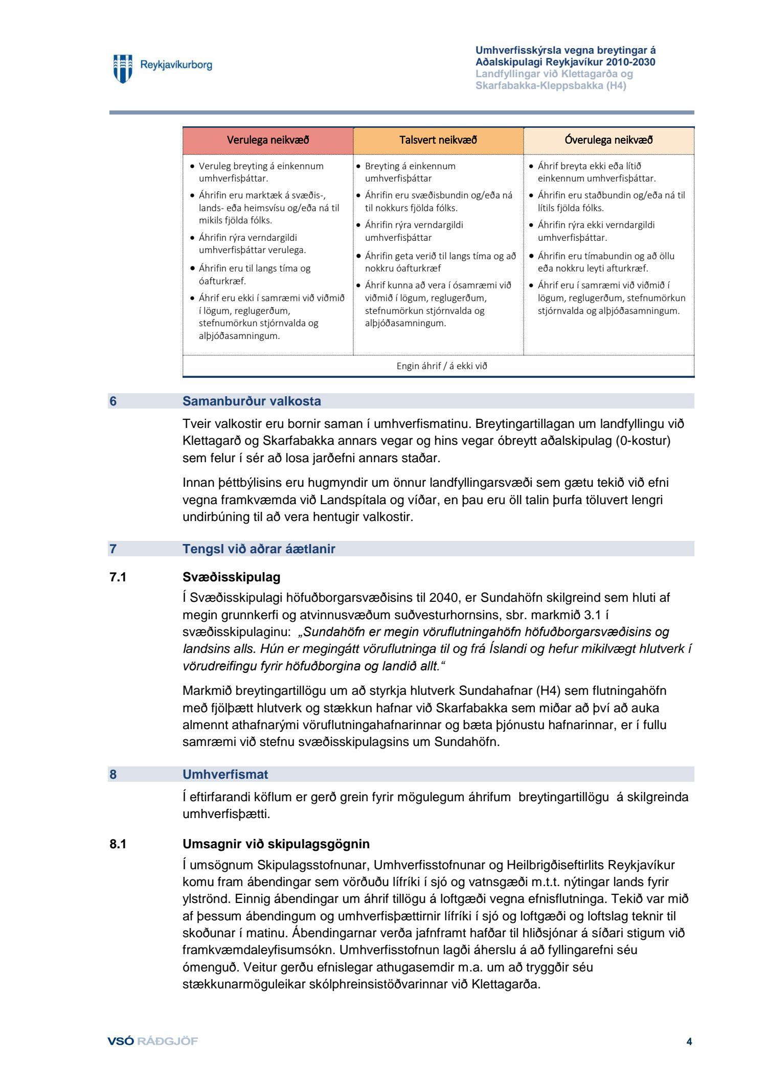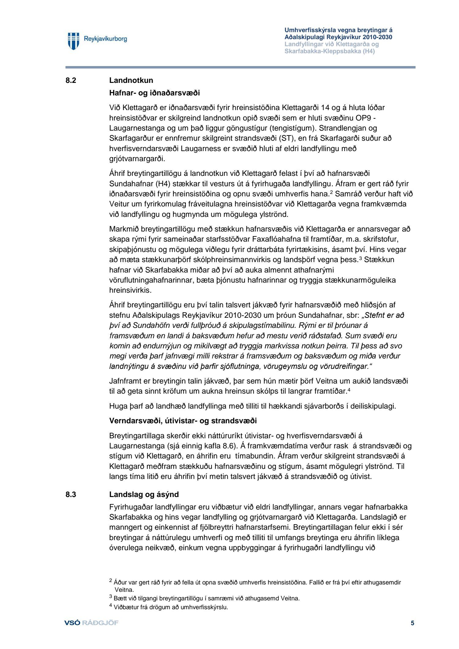Að lokinni auglýsingu er lögð fram til kynningar tillaga umhverfis- og skipulagssviðs dags í nóvember 2018, uppf. 13. desember 2018, að breytingu á aðalskipulagi Reykjavíkur 2010-2030 fyrir Sundahöfn vegna landfyllingar við Klettagarða ásamt umhverfisskýrsla VSÓ ráðgjafar dags. í september 2018, uppf. 14. desember 2018. Einnig er lögð fram greinargerð