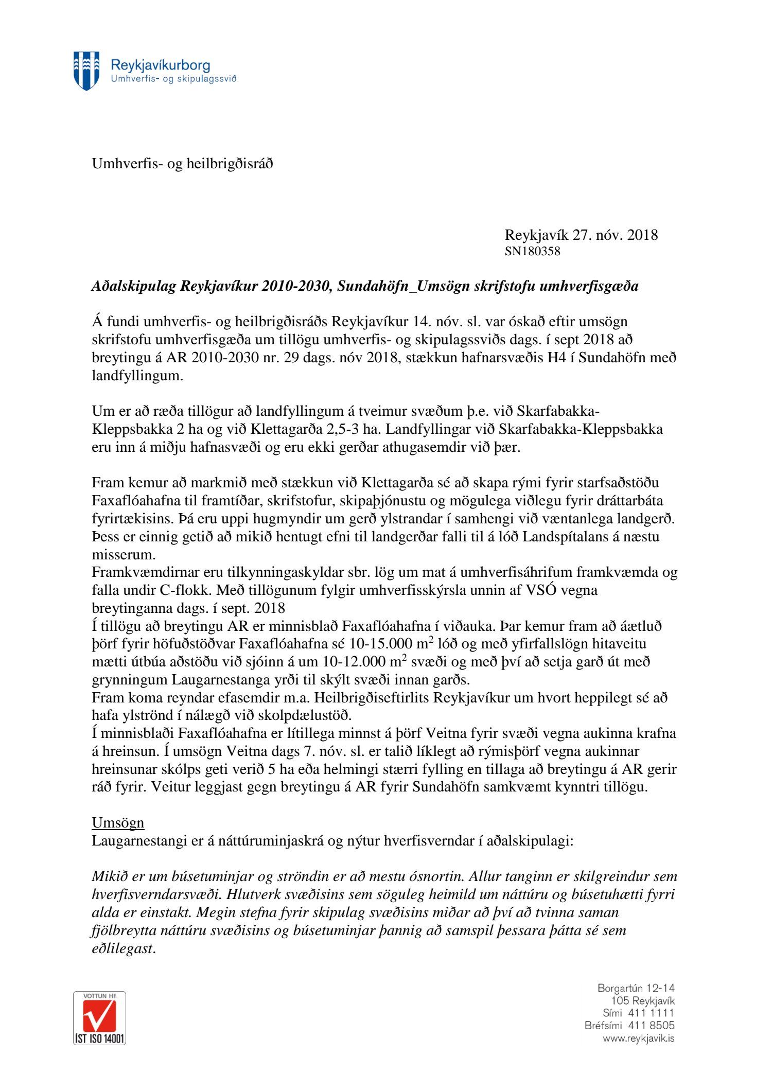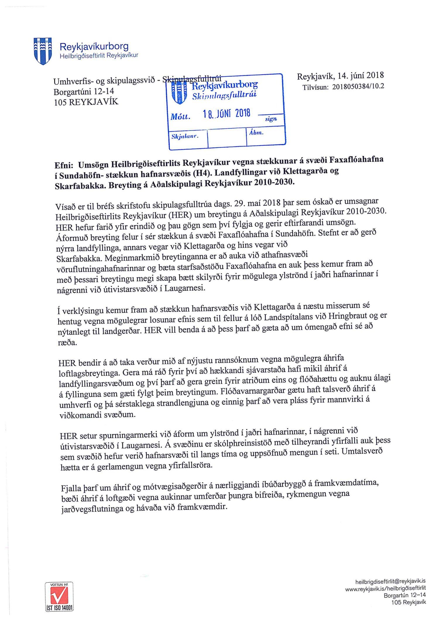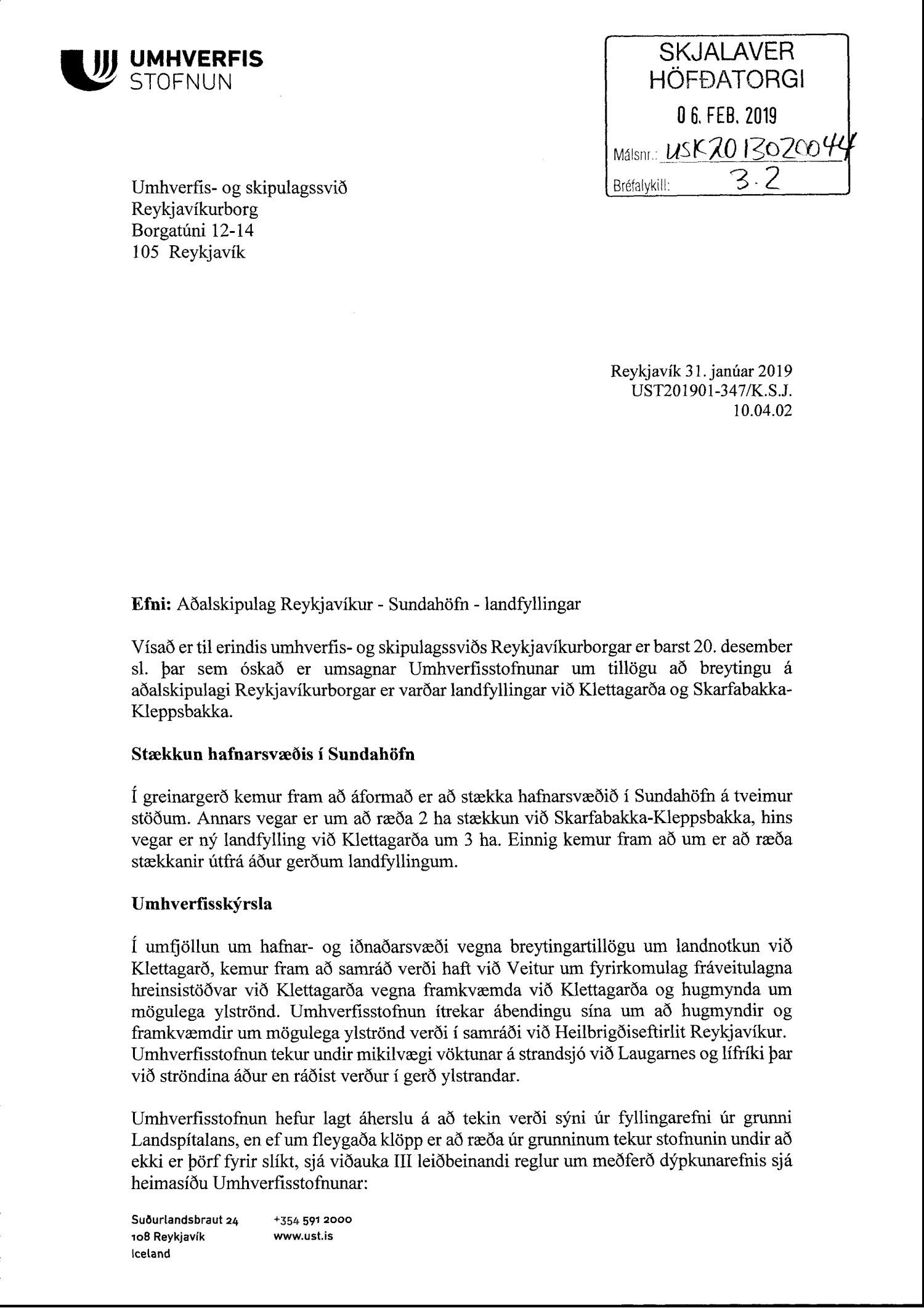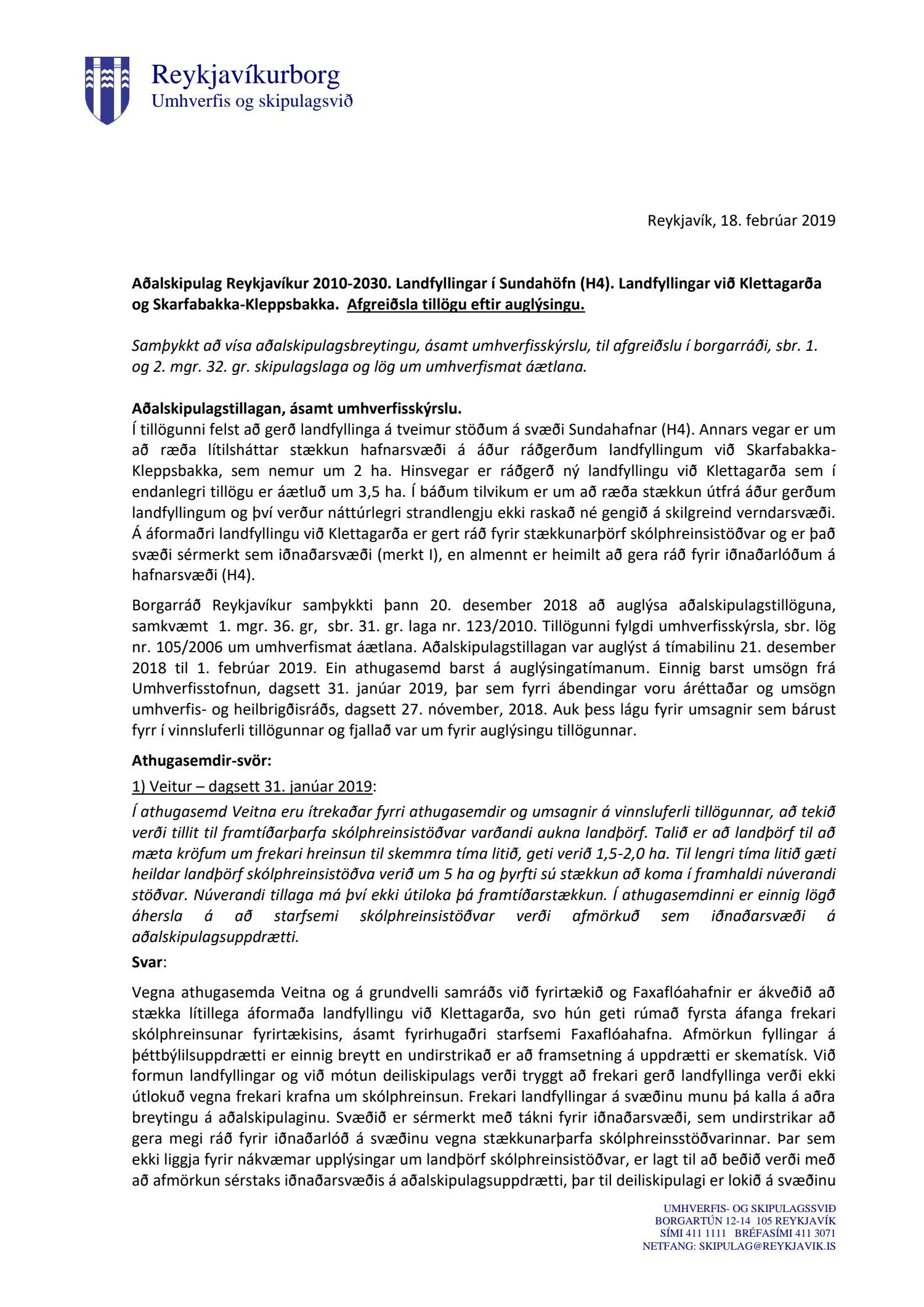 dags. 1. febrúar 2019 og Umhverfisstofnun dags. 31. janúar 2019. Einnig er lögð fram tillaga umhverfis- og skipulagssviðs dags 18. febrúar 2019, umhverfisskýrsla VSÓ ráðgjafar dags. í september 2018 síðast uppf. 14. febrúar 2019 og umsögn umhverfis- og skipulagssviðs, deildarstjóra aðalskipulags Reykjavíkur, dags. 18. febrúar 2019.