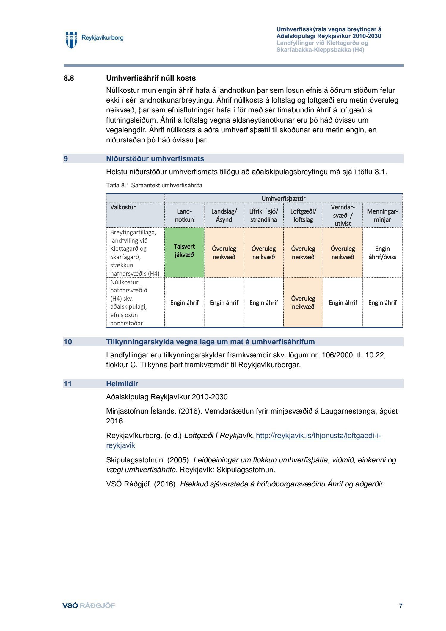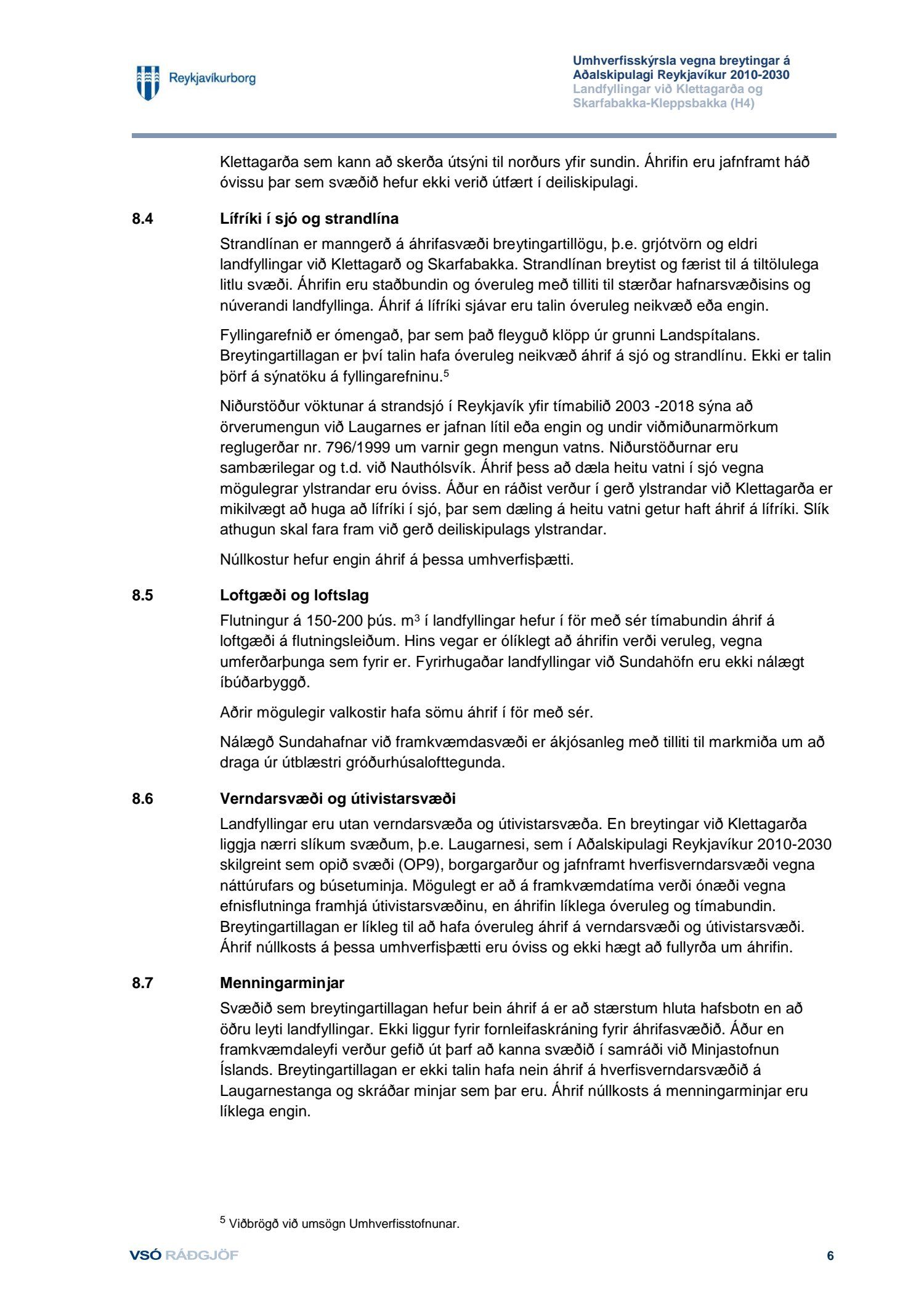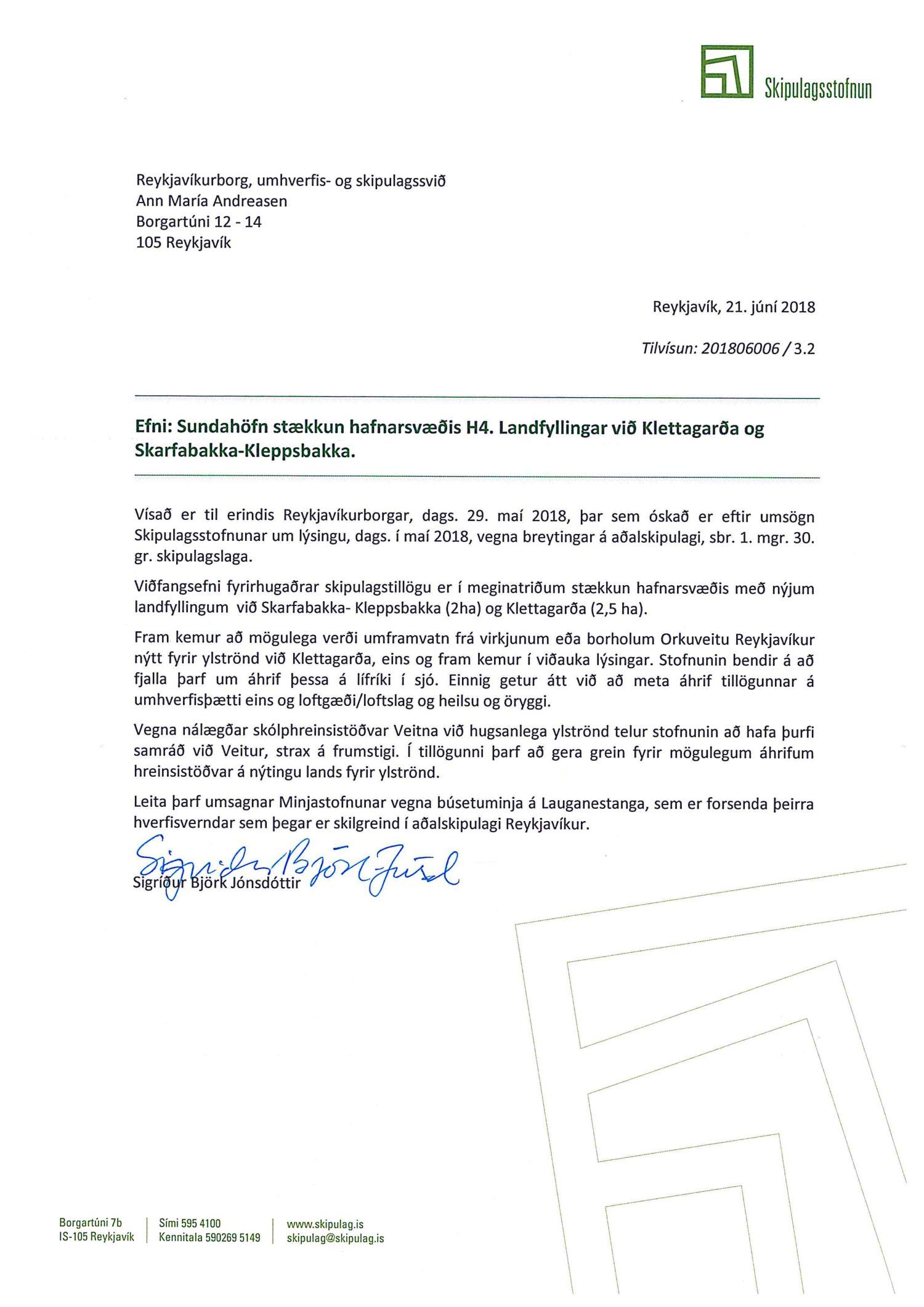 dags. 1. febrúar 2019 og Umhverfisstofnun dags. 31. janúar 2019. Einnig er lögð fram tillaga umhverfis- og skipulagssviðs dags 18. febrúar 2019, umhverfisskýrsla VSÓ ráðgjafar dags. í september 2018 síðast uppf. 14. febrúar 2019 og umsögn umhverfis- og skipulagssviðs, deildarstjóra aðalskipulags Reykjavíkur, dags. 18. febrúar 2019.