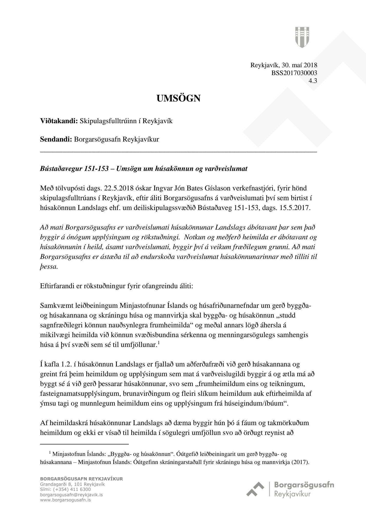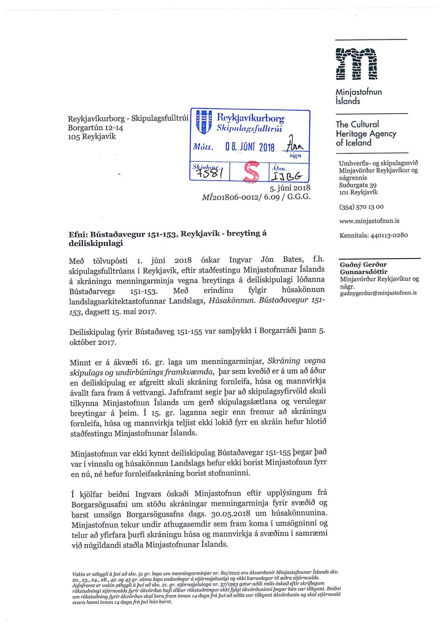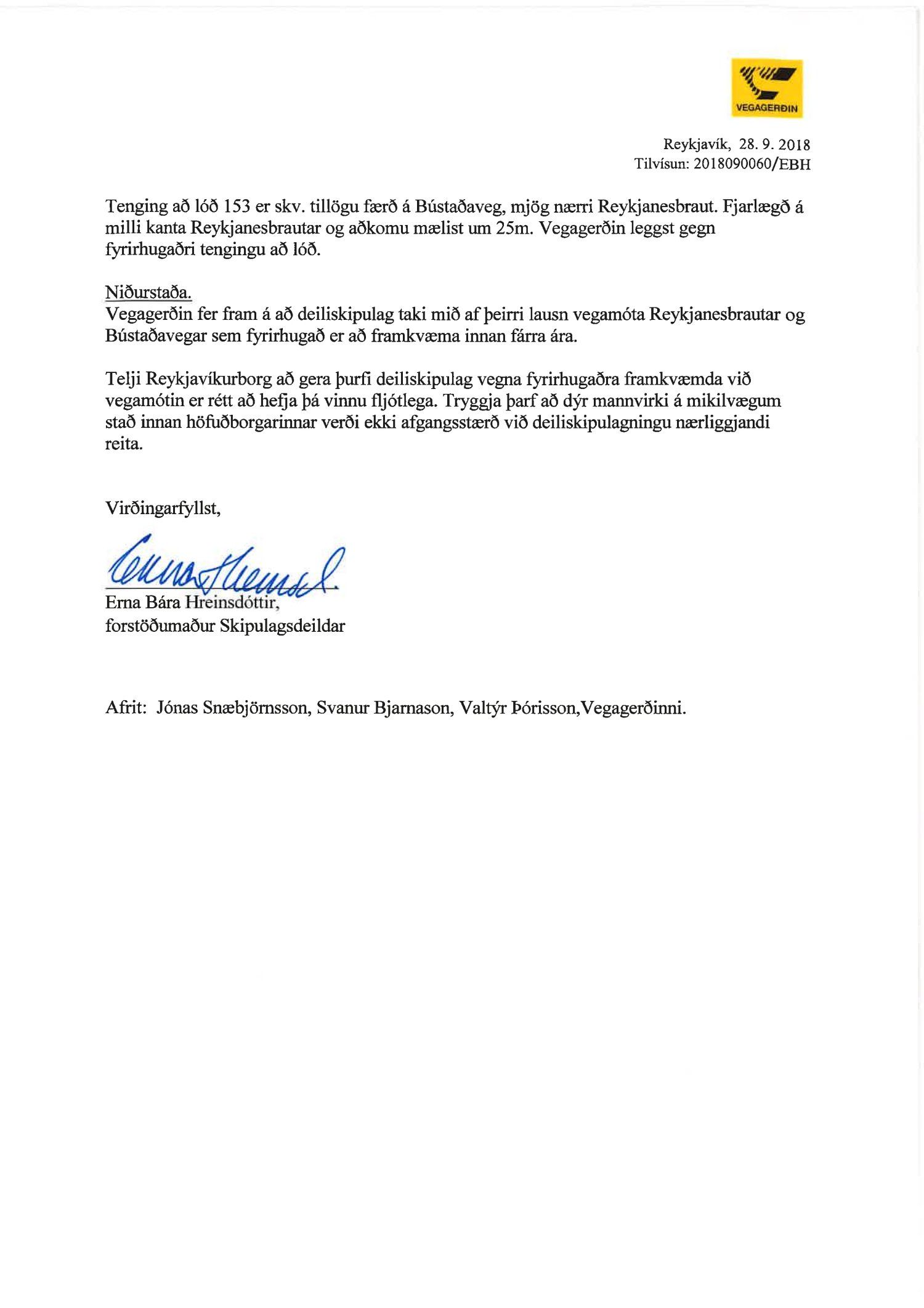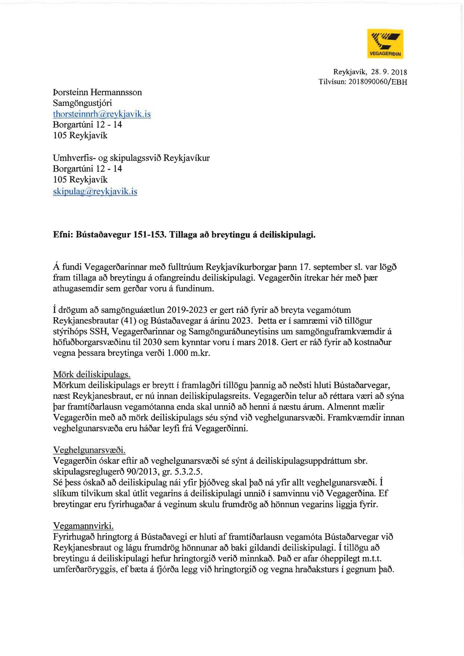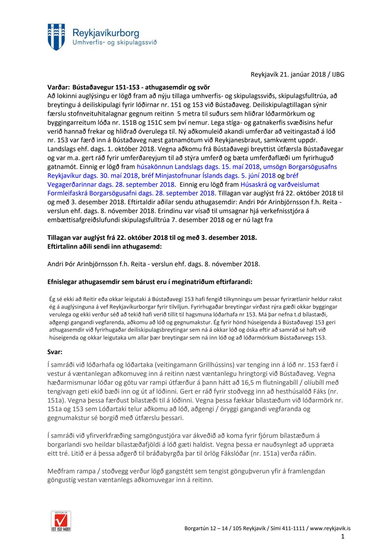 dags. 1. október 2018, br. 18. janúar 2019. Vegna aðkomu frá Bústaðavegi breyttist útfærsla Bústaðavegar og var m.a. gert ráð fyrir umferðareyjum til að stýra umferð og bæta umferðaflæði um fyrirhuguð gatnamót. Einnig er lögð fram húsakönnun Landslags dags. 15. maí 2018, umsögn Borgarsögusafns Reykjavíkur dags. 30. maí 2018, bréf Minjastofnunar Íslands dags. 5. júní 2018 og bréf Vegagerðarinnar dags. 28. september 2018. Einnig eru lögð fram Húsaskrá og varðveislumat Formleifaskrá Borgarsögusafni dags. 28. september 2018. Tillagan var auglýst frá 22. október 2018 til og með 3. desember 2018. Eftirtaldir aðilar sendu athugasemdir: Andri Þór Arinbjörnsson f.h. Reita - verslun ehf. dags. 8. nóvember 2018. Einnig er lögð fram umsögn skipulagsfulltrúa dags. 21. janúar 2019.