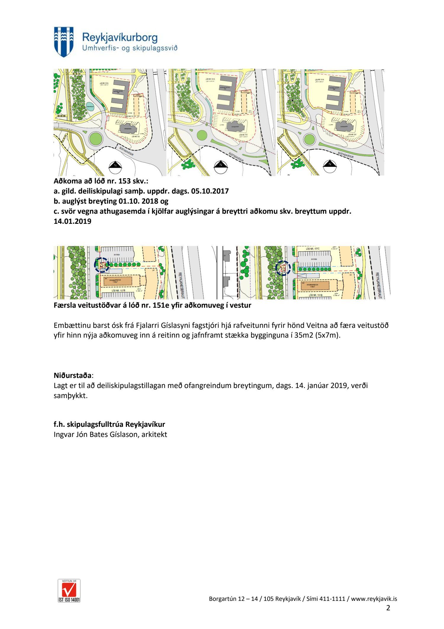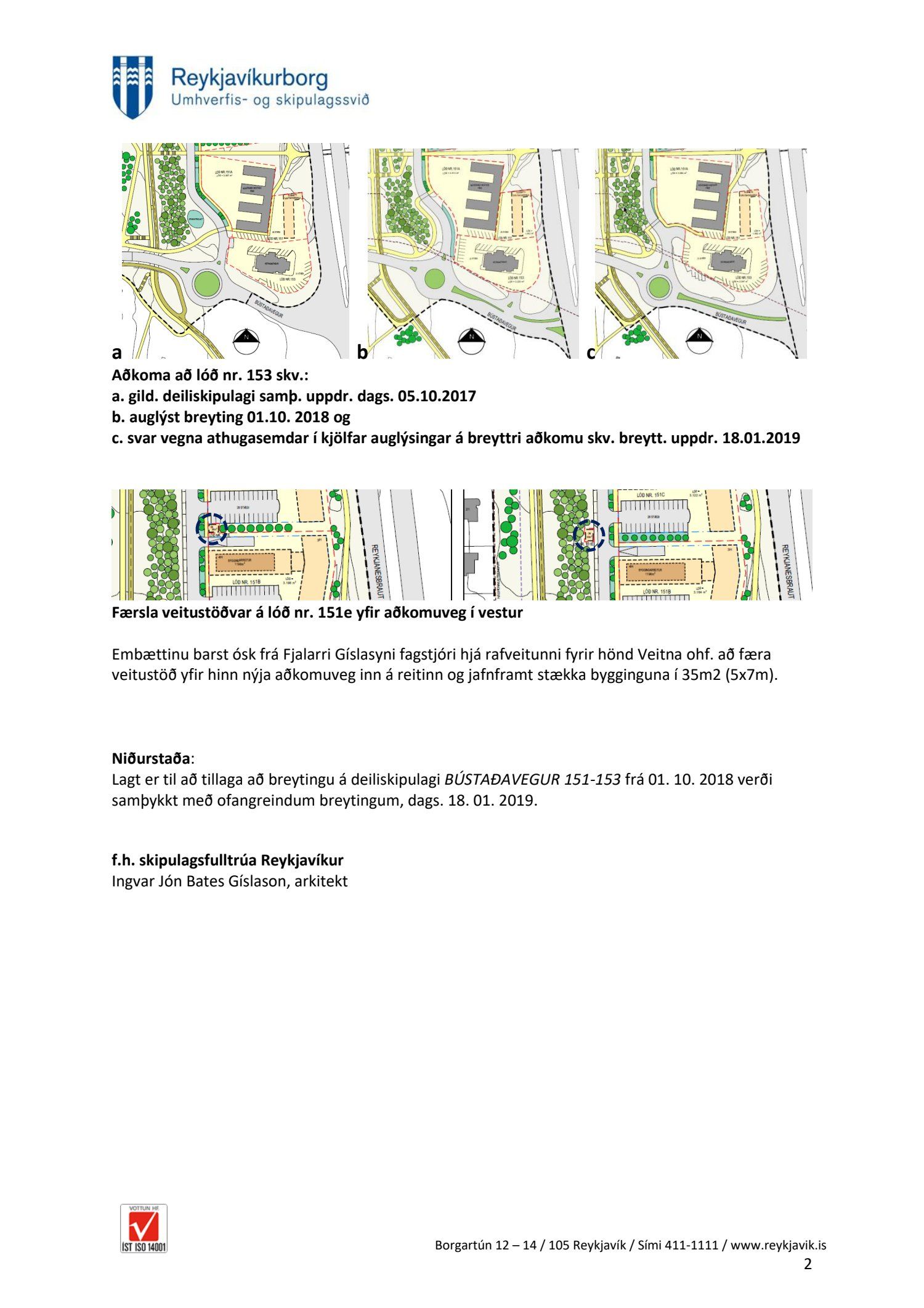 Að lokinni auglýsingu er lögð fram að nýju tillaga umhverfis- og skipulagssviðs, skipulagsfulltrúa, að breytingu á deiliskipulagi fyrir lóðirnar nr. 151 og 153 við Bústaðaveg. Deiliskipulagtillagan sýnir færslu stofnveituhitalagnar gegnum reitinn 5 metra til suðurs sem hliðrar lóðarmörkum og byggingarreitum lóða nr. 151B og 151C sem því nemur. Lega stíga- og gatnakerfis svæðisins hefur verið hannað frekar og hliðrað óverulega til. Ný aðkomuleið akandi umferðar að veitingastað á lóð nr. 153 var færð inn á Bústaðaveg næst gatnamótum við Reykjanesbraut, samkvæmt uppdr.