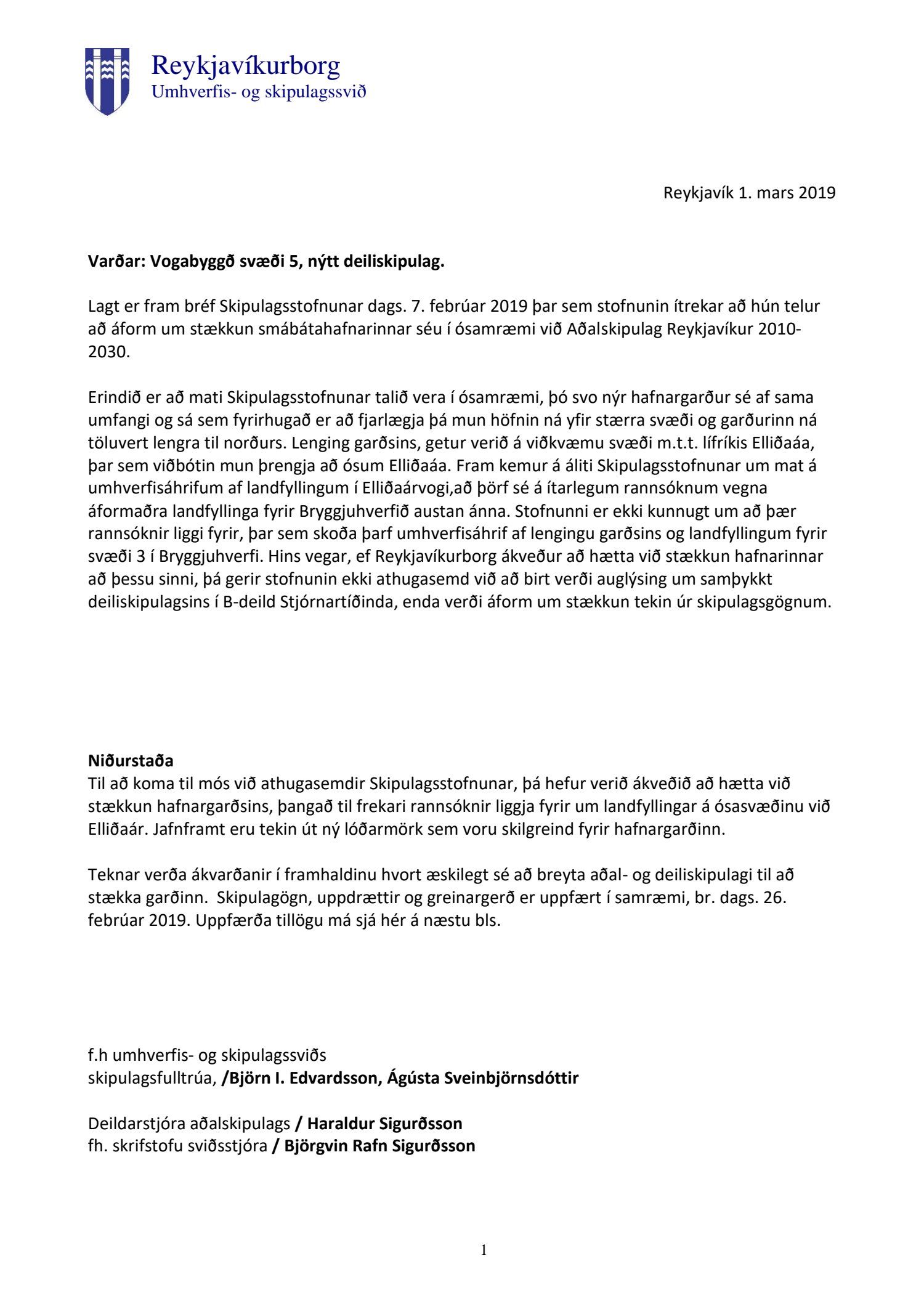 Fulltrúar Sjálfstæðisflokksins sitja hjá við afgreiðslu málsins og bóka: Skipulagsstofnun taldi þörf á ítarlegum rannsóknum vegna áformaðra landfyllinga. Þeim hefur ekki verið lokið. Mikilvægt er að skoða hvaða áhrif þessar framkvæmdir og stórfelldar landfyllingar hafa á lífríki Elliðaáa. Þá segir í umsögn Hafrannsóknarstofnunar að nauðsyn sé að skoða vatnasvið Elliðaáa í heild. Það hefur ekki verið gert. Á meðan svo er rétt að bíða með frekari samþykktir. Þess er óskað að fá kynningu á þeim rannsóknum sem kunna að vera í gangi.