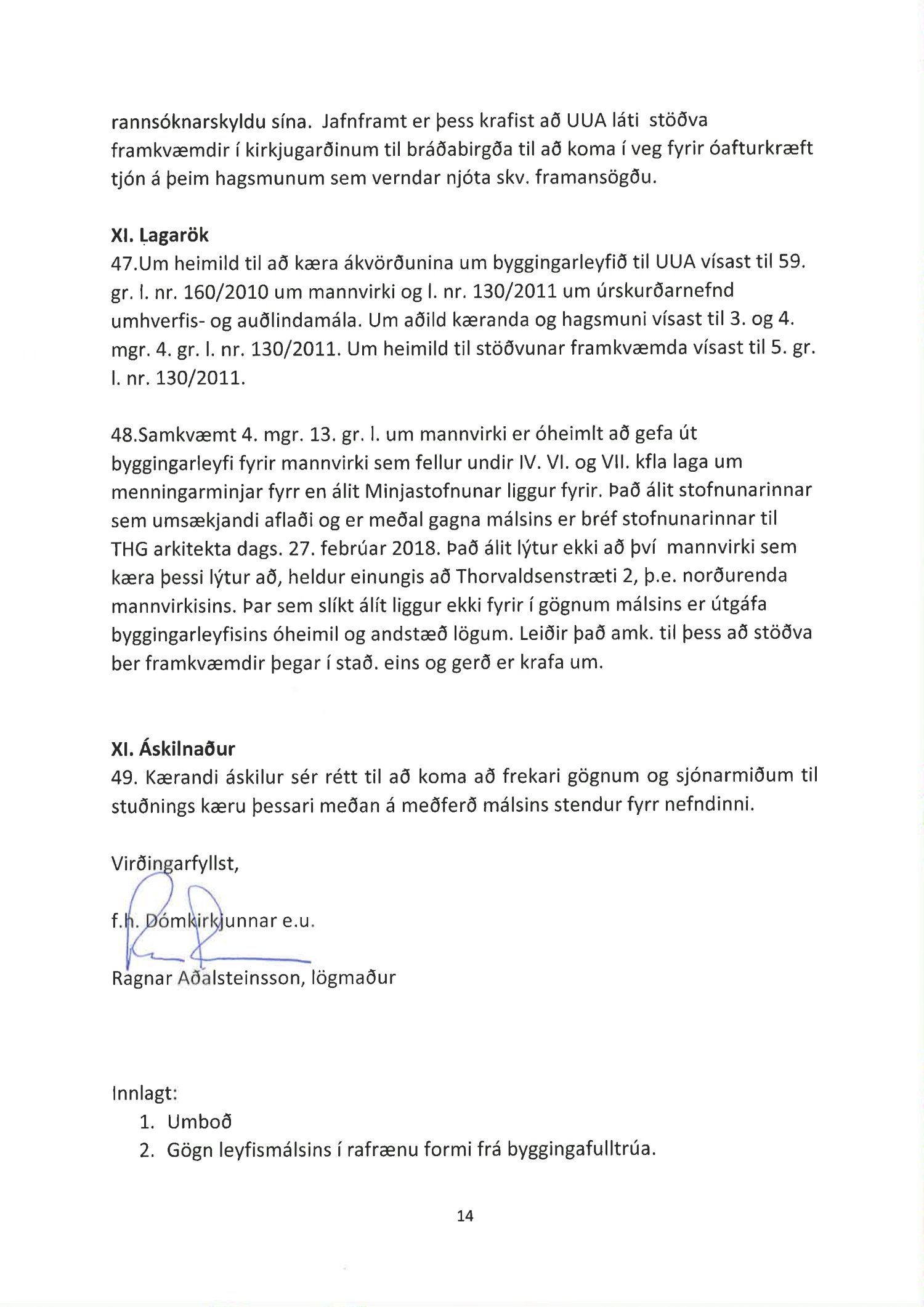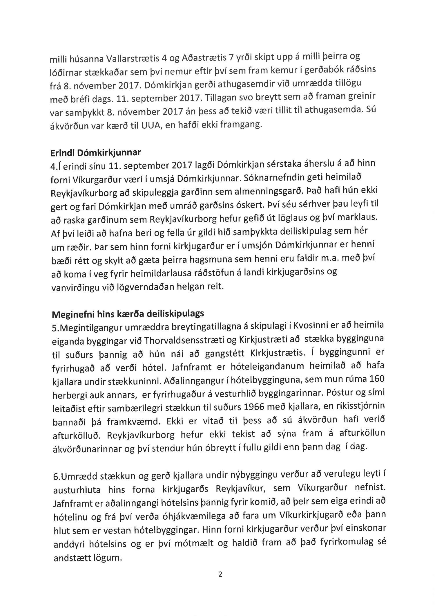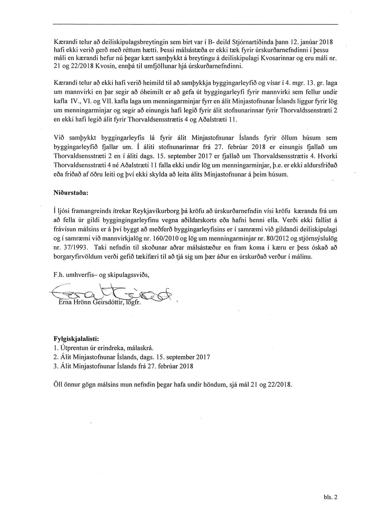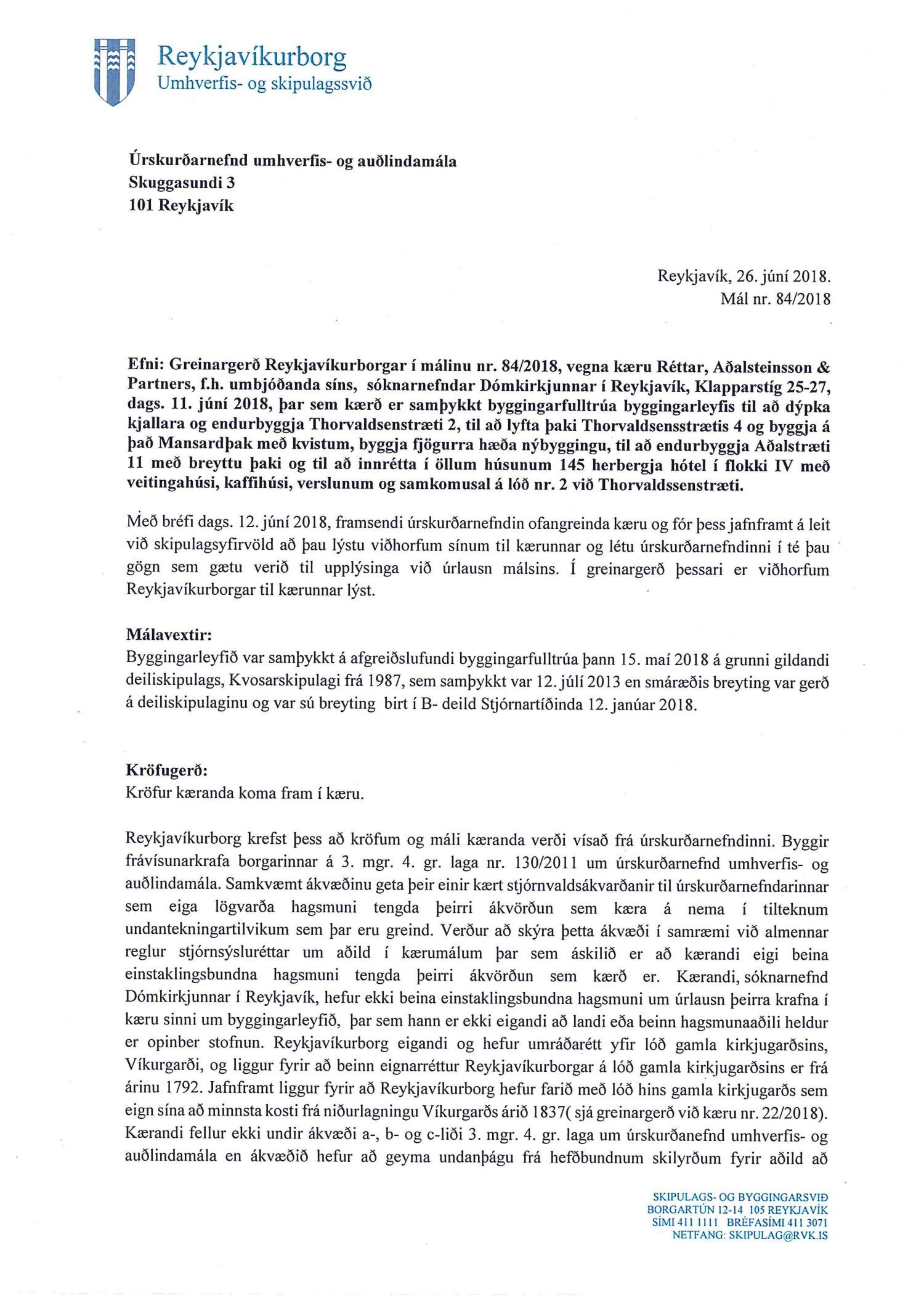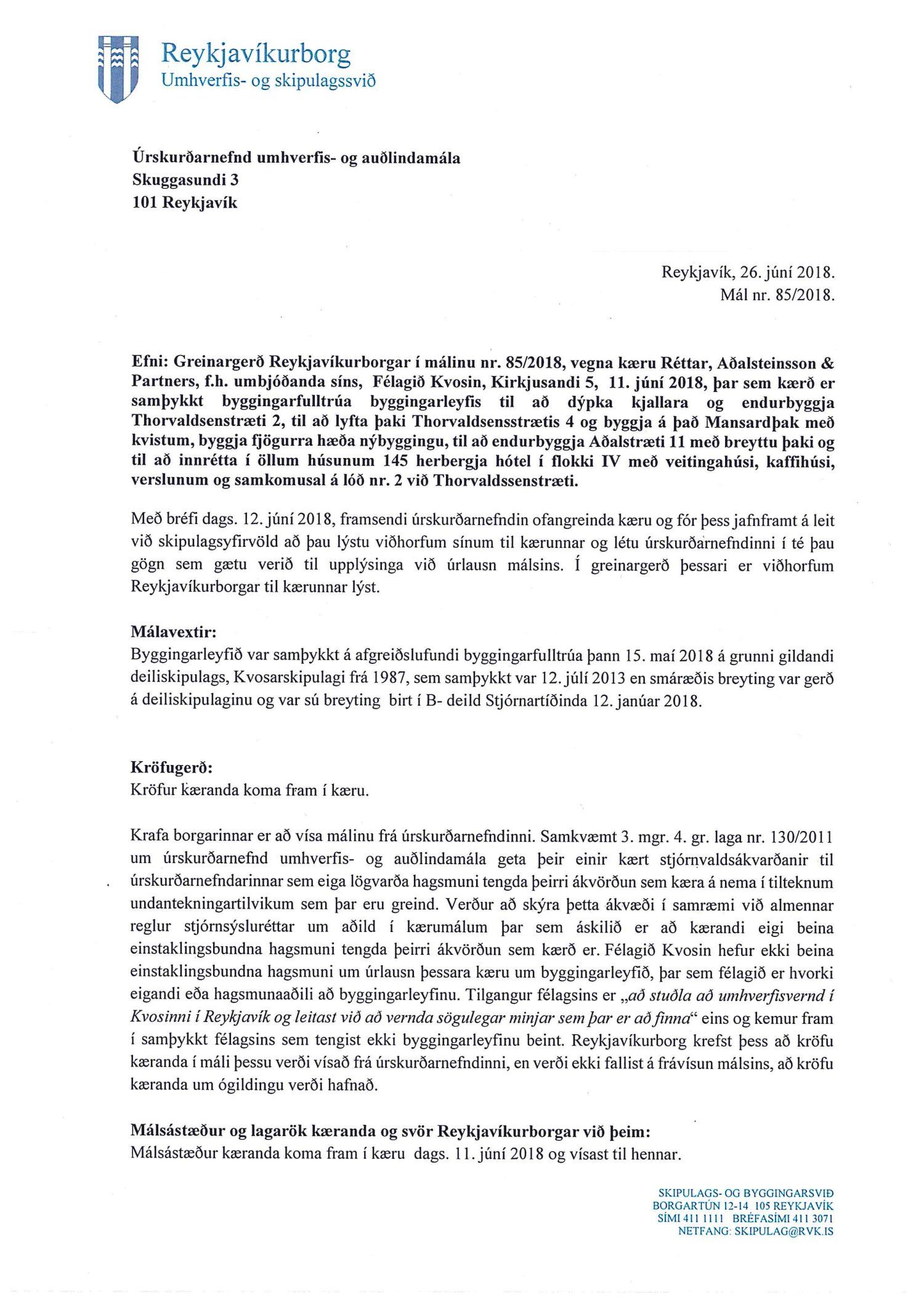 Lagt fram erindi úrskurðarnefndar umhverfis- og auðlindamála dags. 12. júní 2018 ásamt kæru dags. 11. júní 2018 þar sem kærð er samþykkt byggingarfulltrúa varðandi útgáfu byggingarleyfis að Thorvaldsensstræti 2. Jafnframt er gerð krafa um stöðvun framkvæmda. Einnig er lögð fram umsögn skrifstofu sviðsstjóra dags. 26. júní 2018. Jafnframt er lagður fram úrskurður úrskurðarnefndar umhverfis- og auðlindamála frá 8. nóvember 2018. Úrskurðarorð: Kærumáli þessu er vísað frá úrskurðarnefndinni.