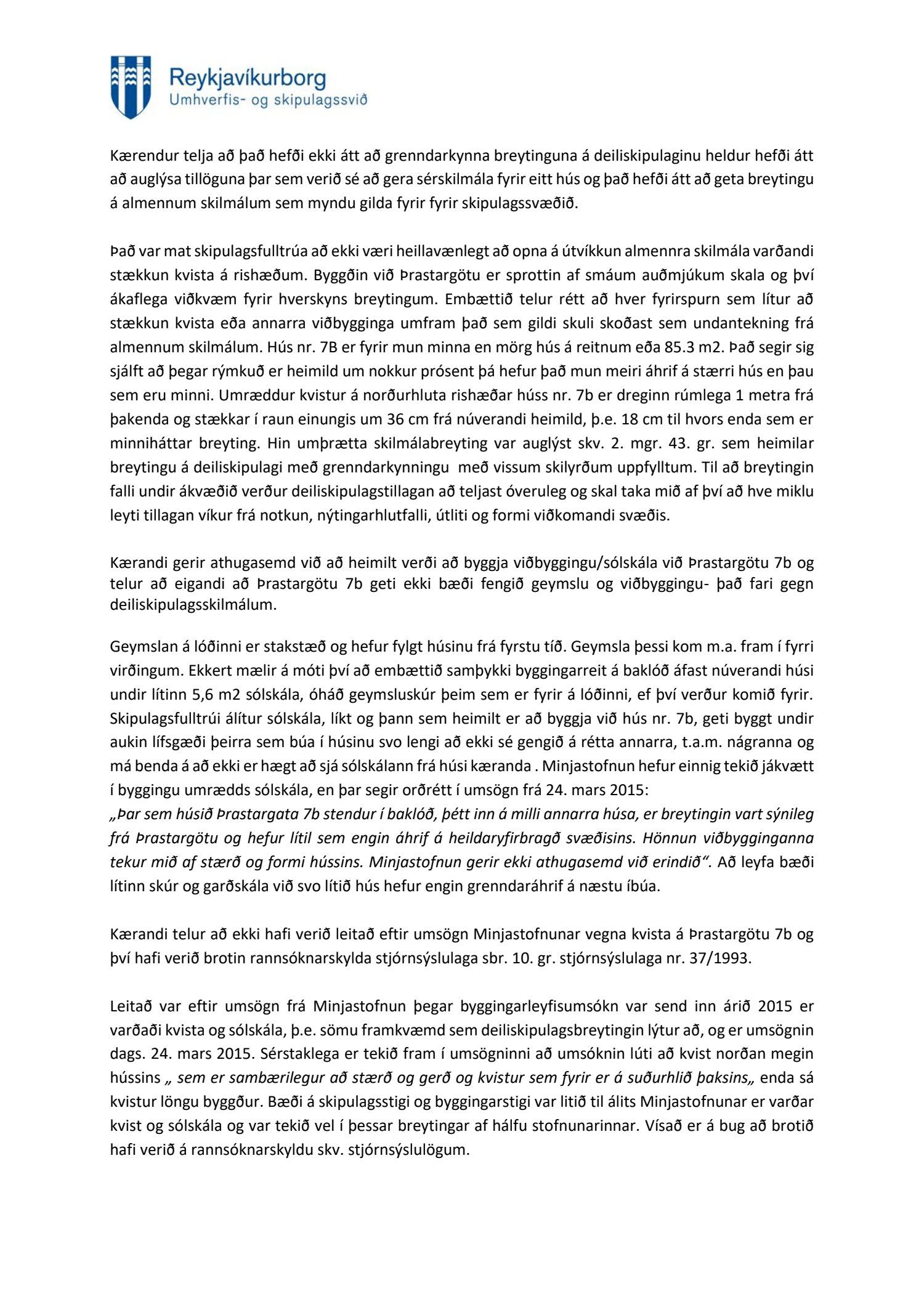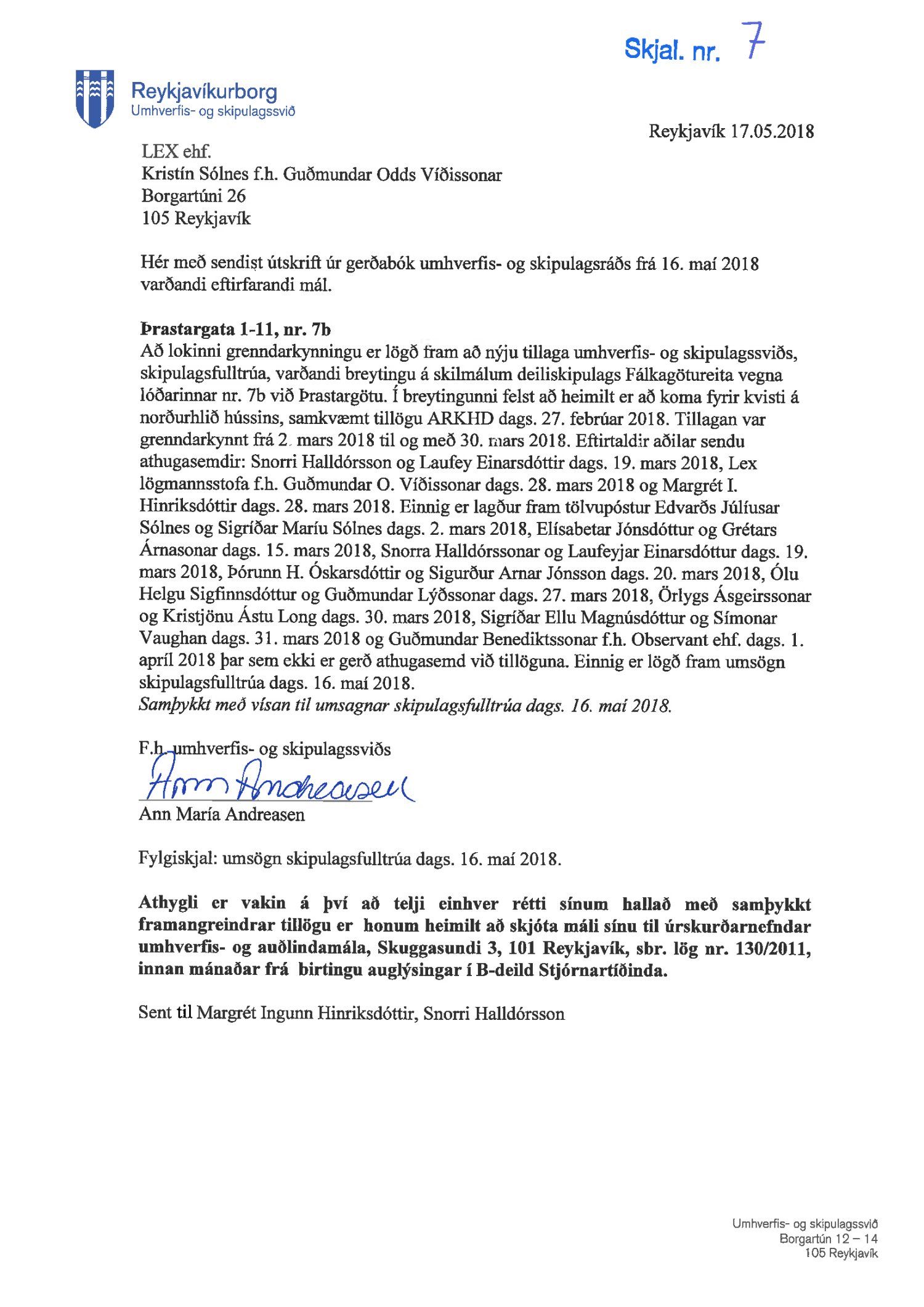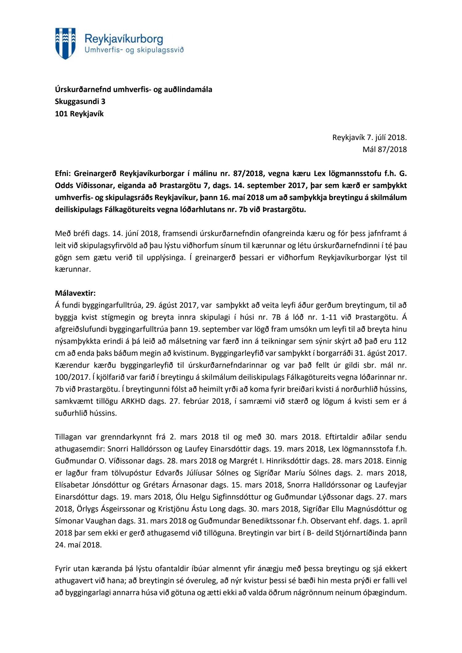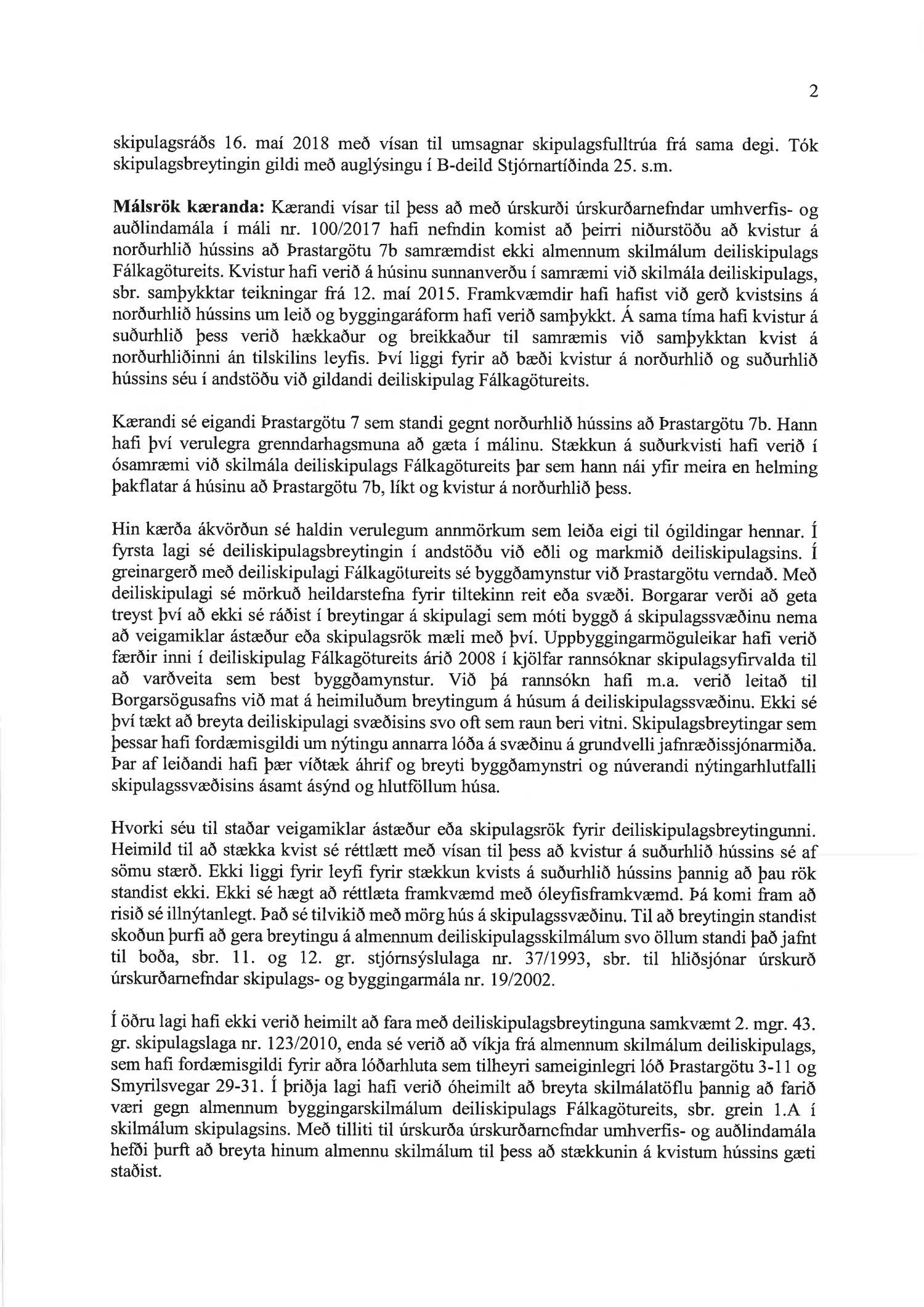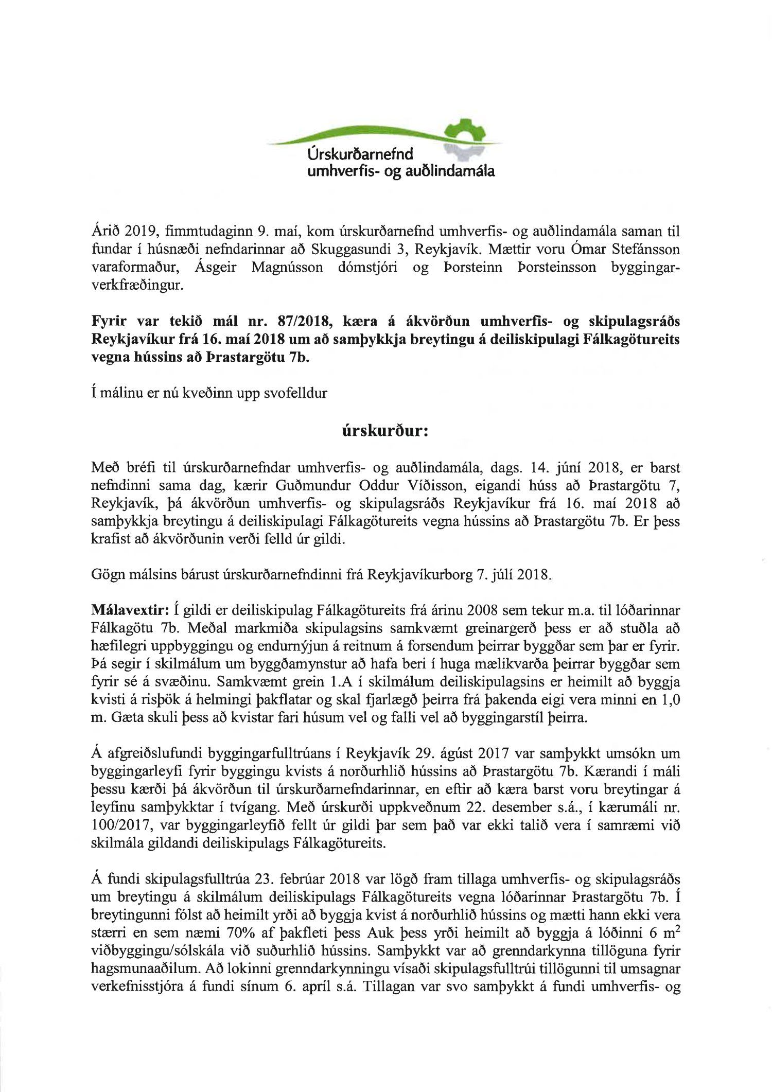 Lagt fram erindi úrskurðarnefndar umhverfis- og auðlindamála dags. 14. júní 2018 ásamt kæru dags. 14. júní 2018 þar sem kærð er samþykkt umhverfis- og skipulagsráðs frá 16. maí 2018 á breytingu á skilmálum deiliskipulags Fálkagötureist vegna lóðar nr. 7b við Þrastargötu. Einnig er lögð fram umsögn skrifstofu sviðsstjóra dags. 7. júlí 2018. Jafnframt er lagður fram úrskurður úrskurðarnefndar umhverfis- og auðlindamála frá 9. maí 2019.