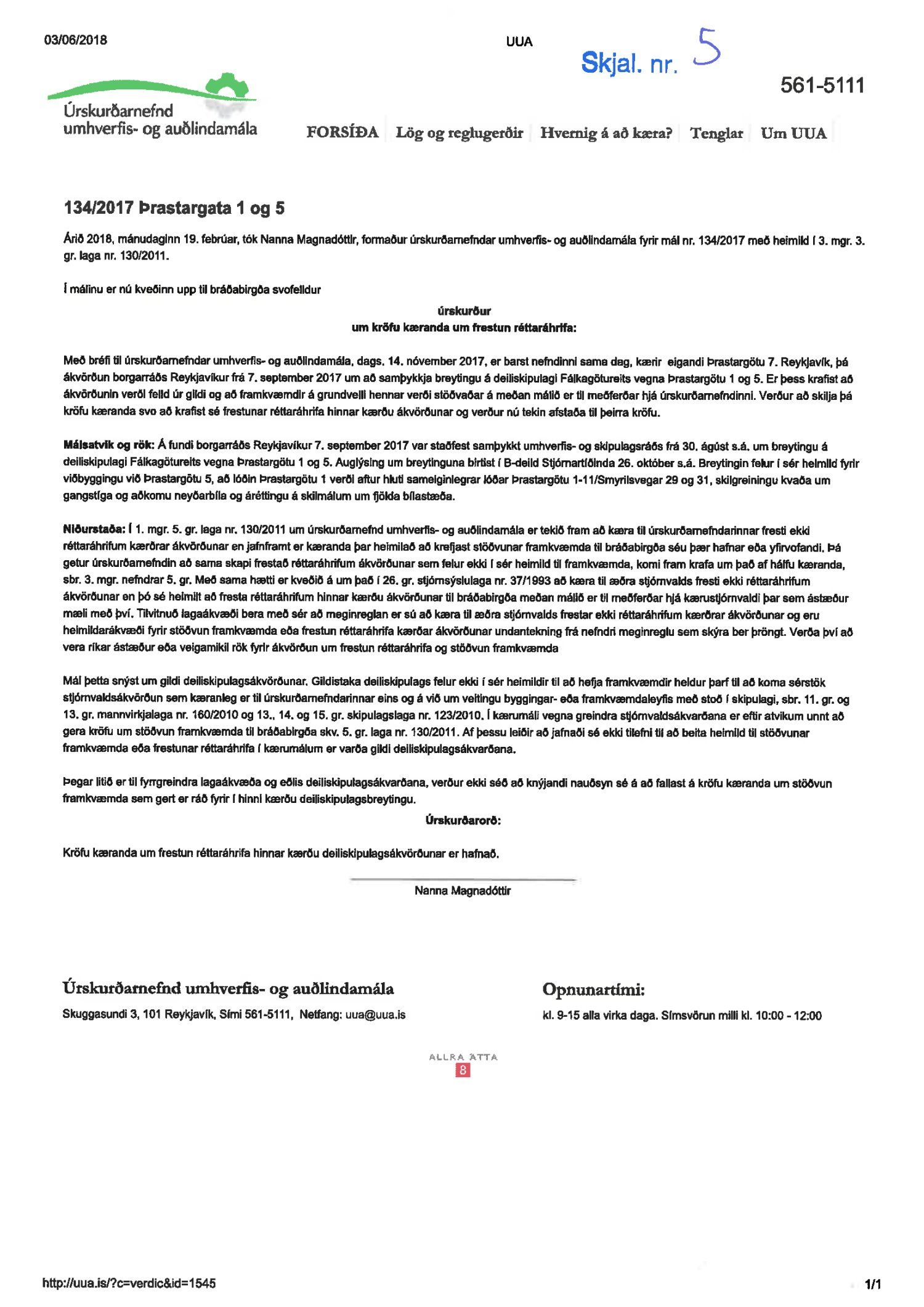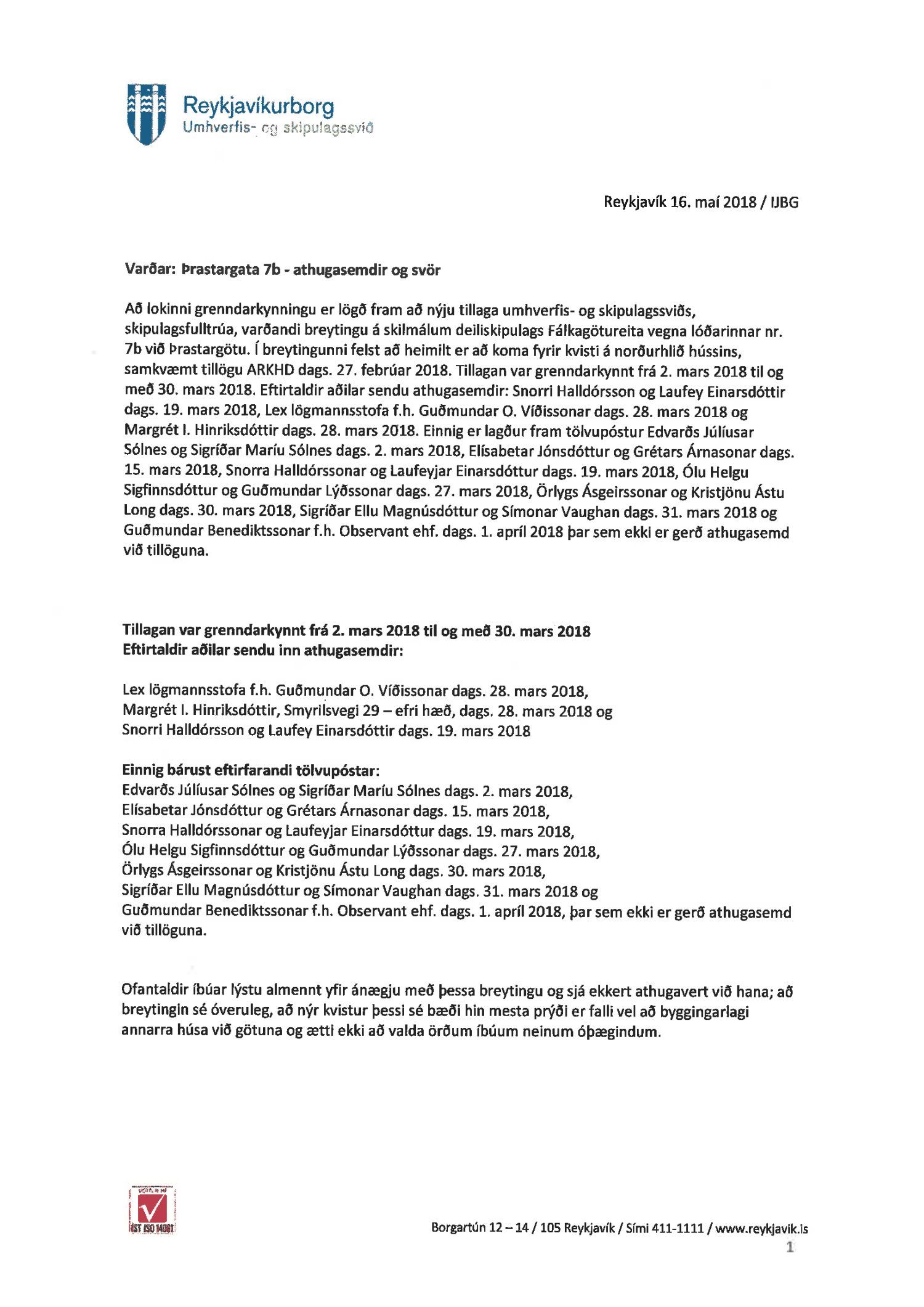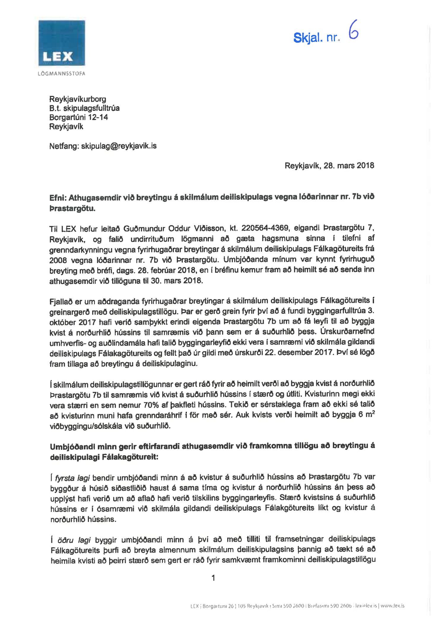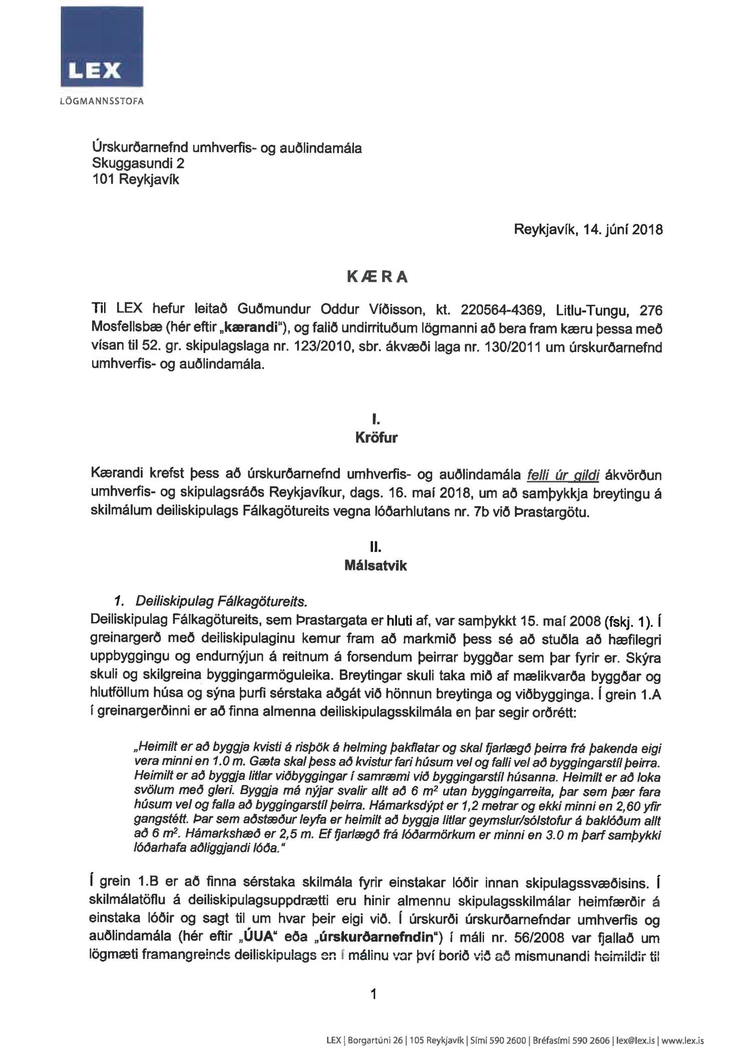 Lagt fram erindi úrskurðarnefndar umhverfis- og auðlindamála dags. 14. júní 2018 ásamt kæru dags. 14. júní 2018 þar sem kærð er samþykkt umhverfis- og skipulagsráðs frá 16. maí 2018 á breytingu á skilmálum deiliskipulags Fálkagötureist vegna lóðar nr. 7b við Þrastargötu. Einnig er lögð fram umsögn skrifstofu sviðsstjóra dags. 7. júlí 2018. Jafnframt er lagður fram úrskurður úrskurðarnefndar umhverfis- og auðlindamála frá 9. maí 2019.