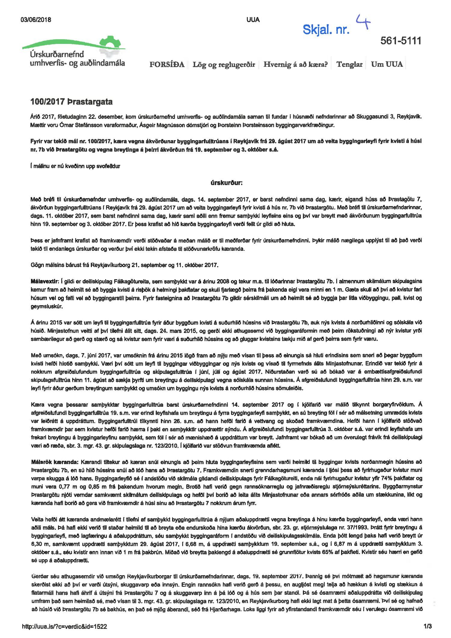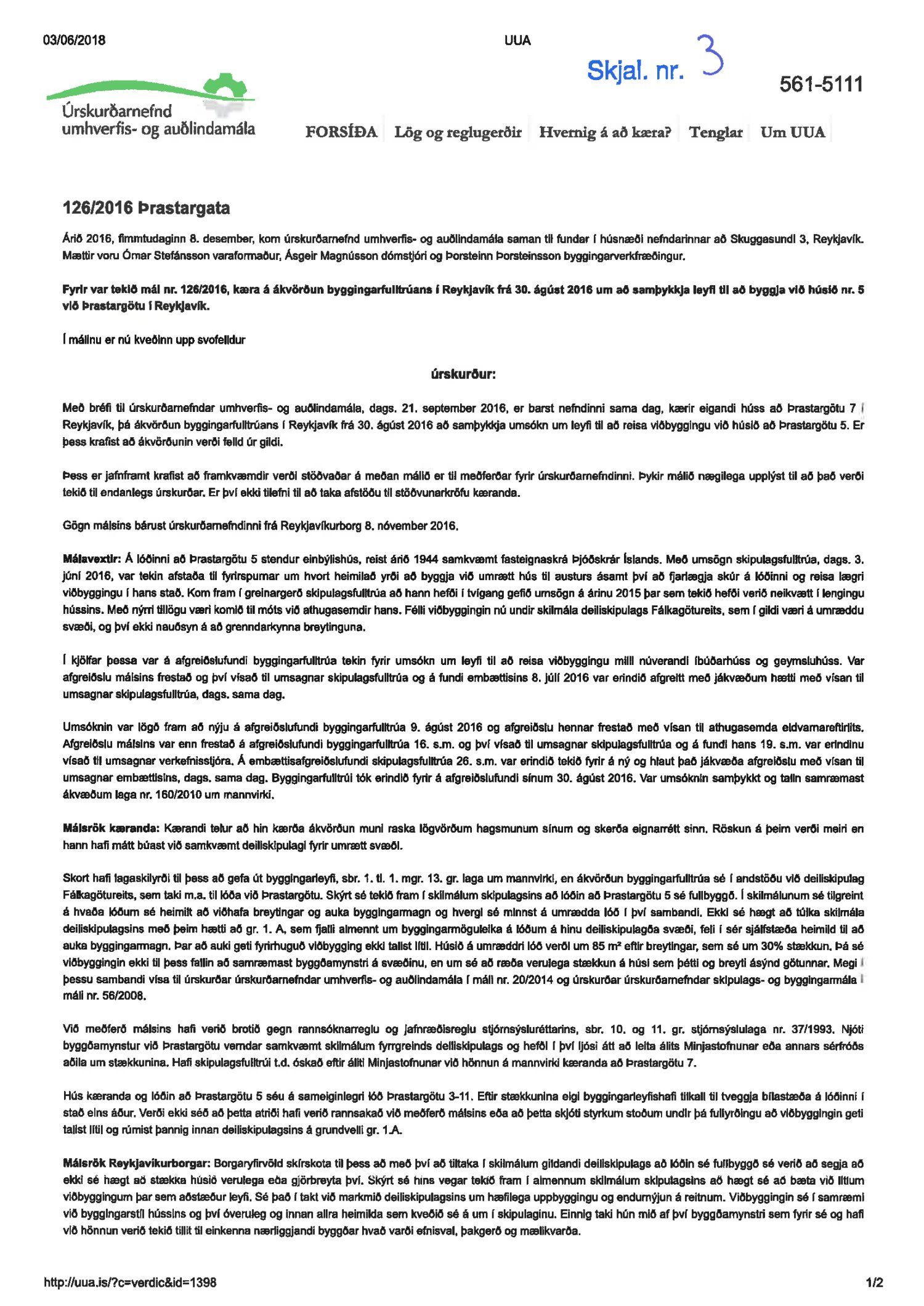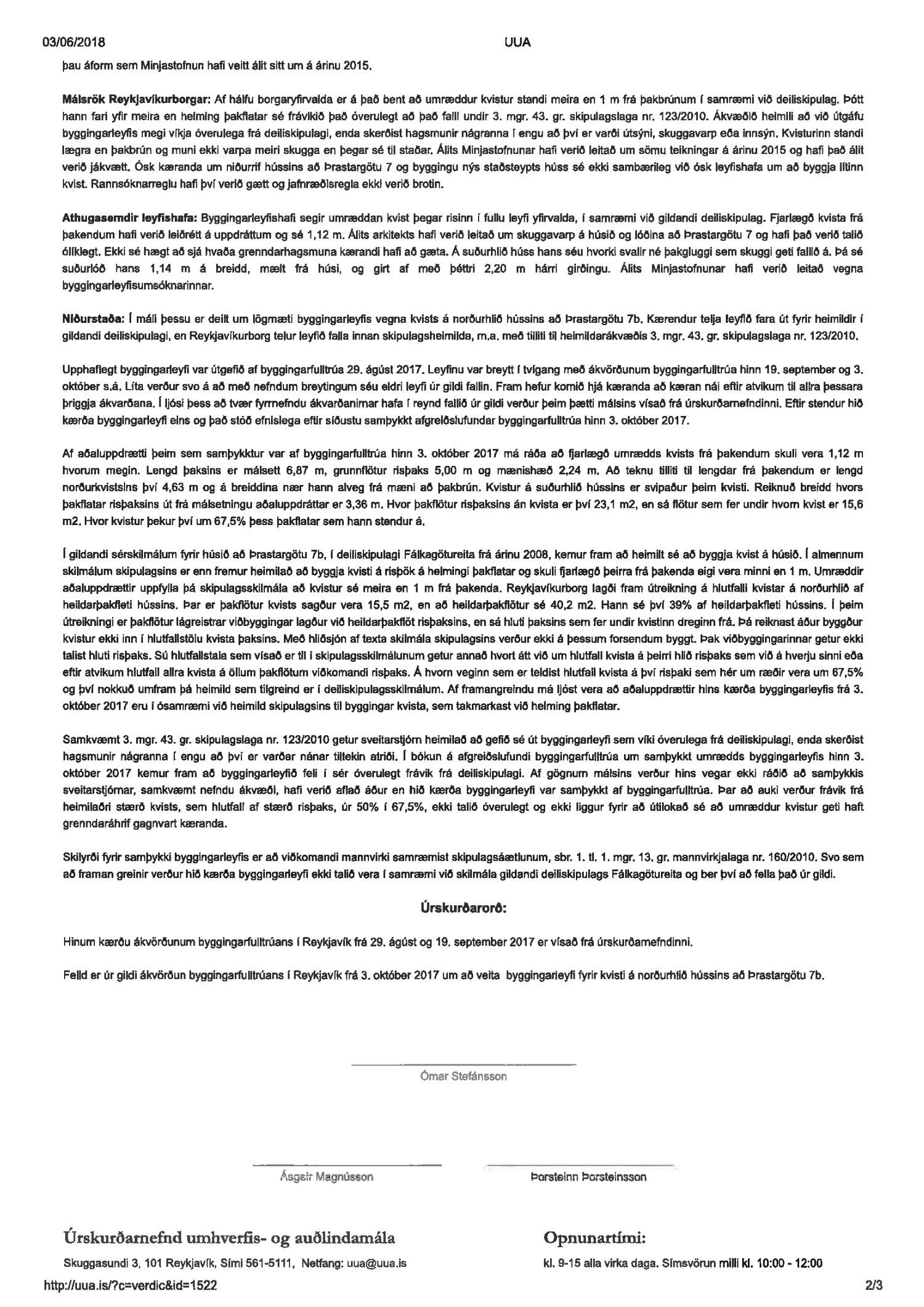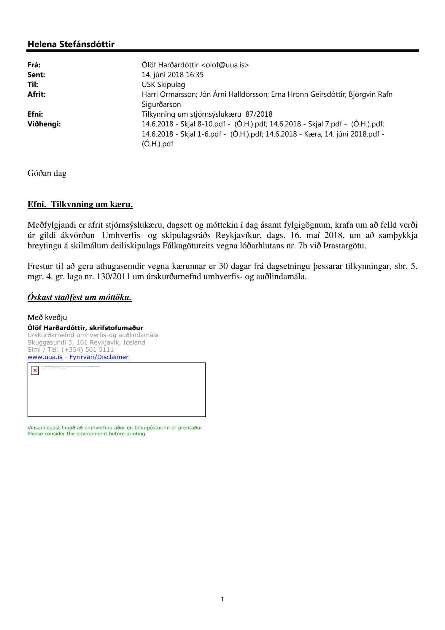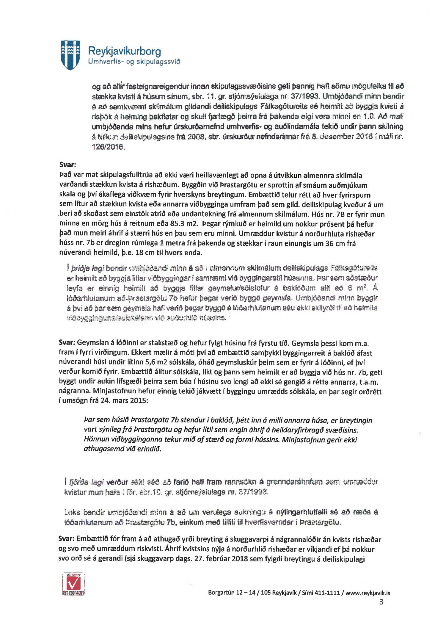 Lagt fram erindi úrskurðarnefndar umhverfis- og auðlindamála dags. 14. júní 2018 ásamt kæru dags. 14. júní 2018 þar sem kærð er samþykkt umhverfis- og skipulagsráðs frá 16. maí 2018 á breytingu á skilmálum deiliskipulags Fálkagötureist vegna lóðar nr. 7b við Þrastargötu. Einnig er lögð fram umsögn skrifstofu sviðsstjóra dags. 7. júlí 2018. Jafnframt er lagður fram úrskurður úrskurðarnefndar umhverfis- og auðlindamála frá 9. maí 2019.