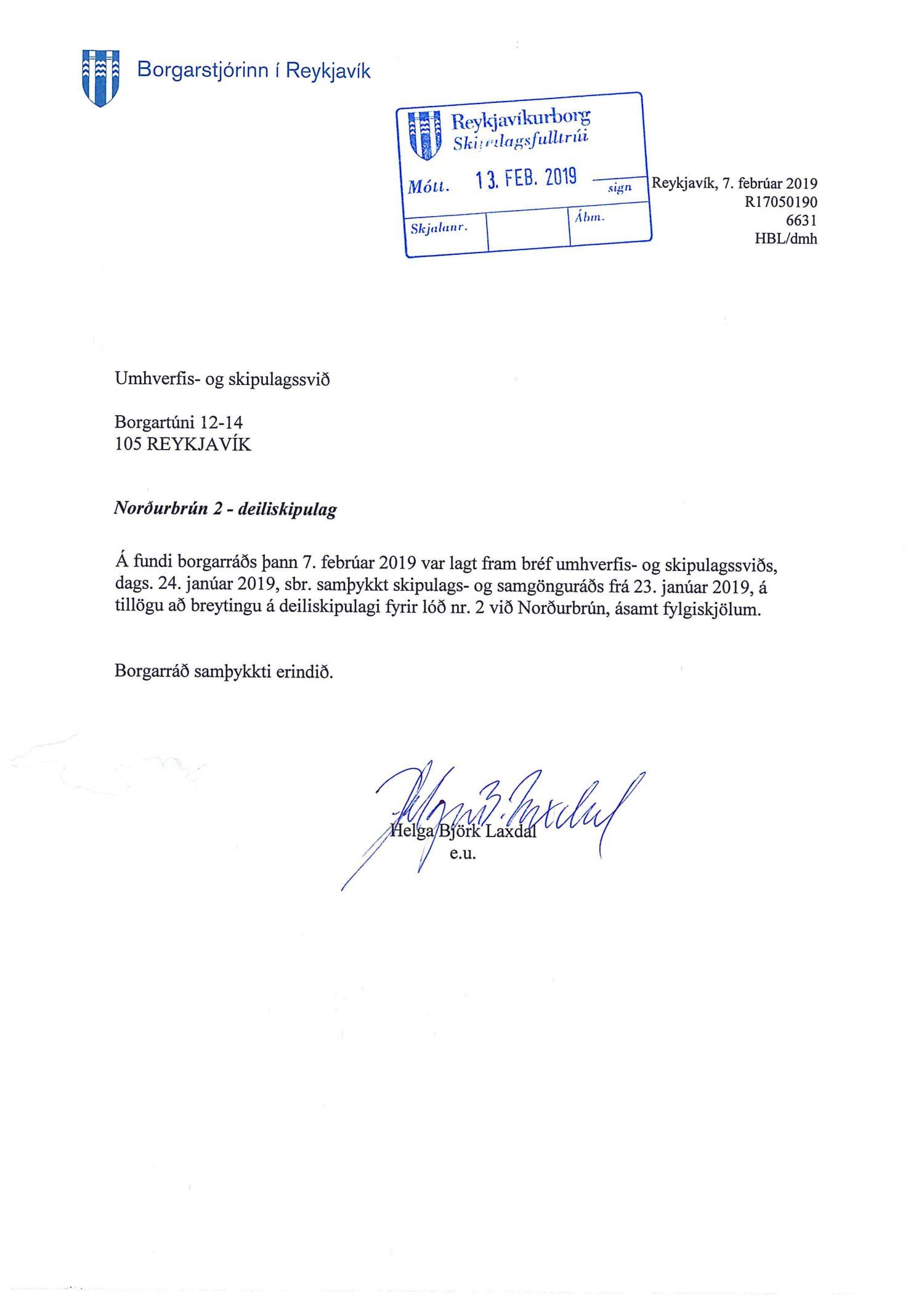 Lagt fram bréf borgarstjóra dags. 7. febrúar um samþykki borgarráðs s.d. vegna samþykkis á tillögu að breytingu á deiliskipulagi fyrir lóð nr. 2 við Norðurbrún.