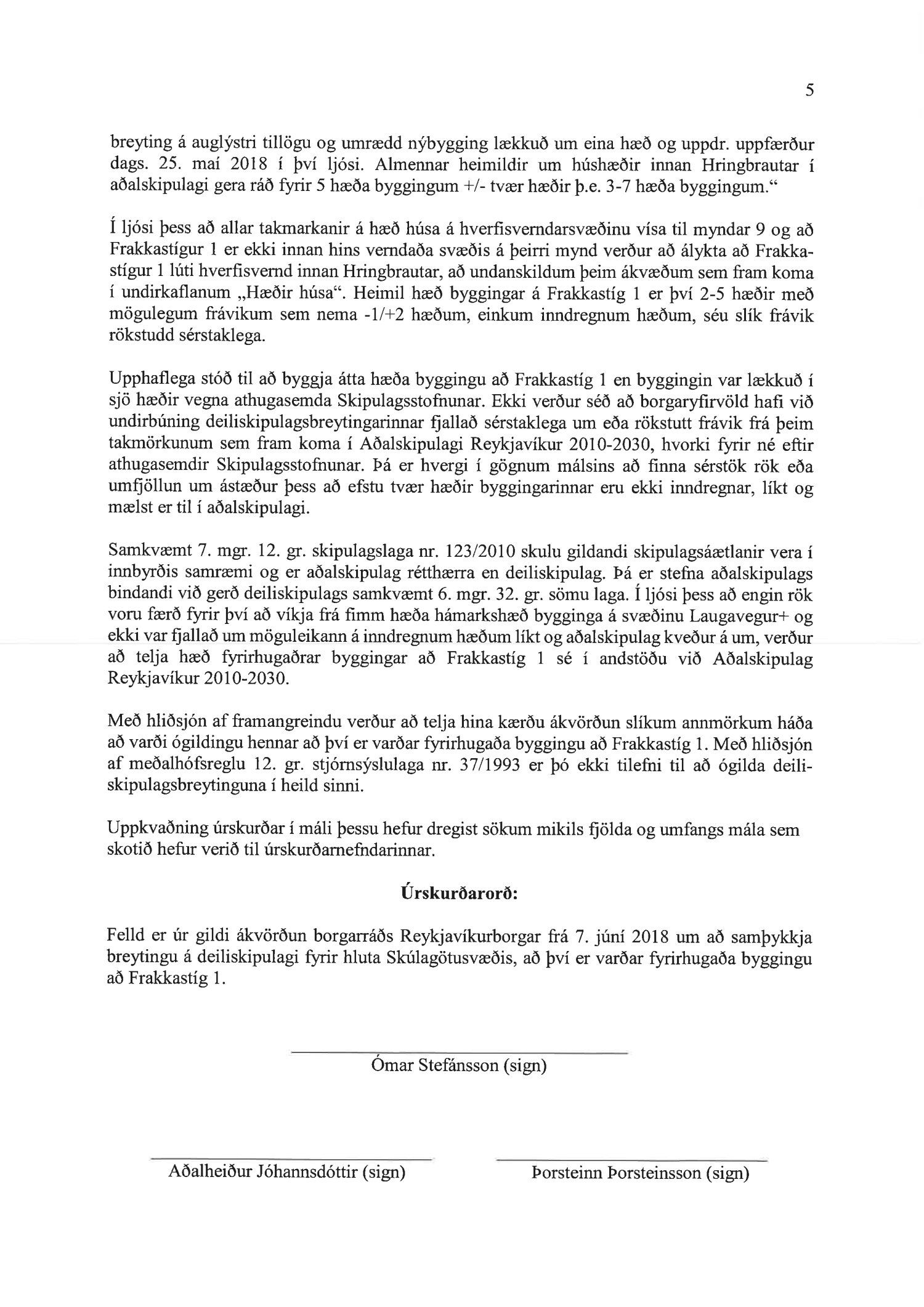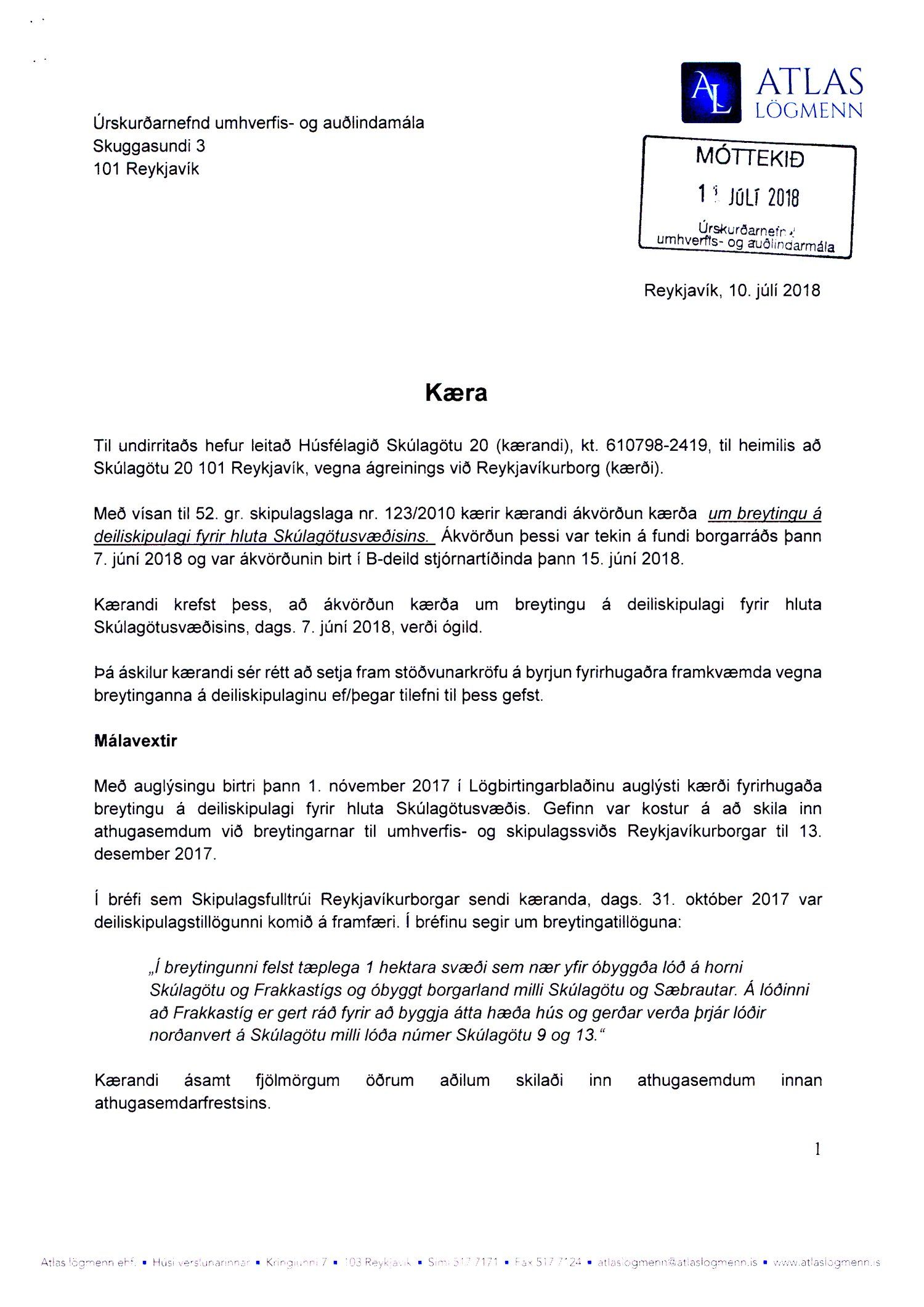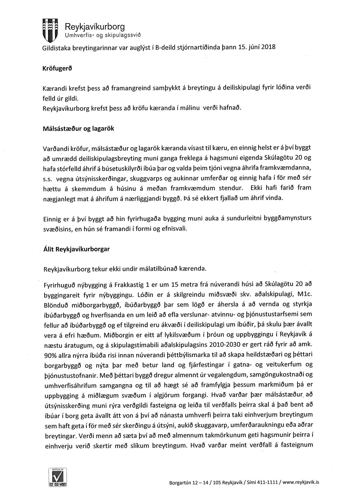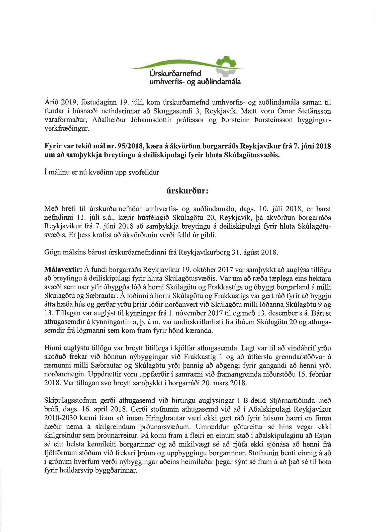 Lagt fram erindi úrskurðarnefndar umhverfis- og auðlindamála dags. 12. júlí 2018 ásamt kæru dags. 10. júlí 2018 þar sem kærð er ákvörðun um breytingu á deiliskipulagi fyrir hluta Skúlagötusvæðis, auglýst í B-deild Stjórnartíðinda 15. júní 2018. Einnig er lögð fram umsögn skipulagsfulltrúa dags. 30. ágúst 2018. Jafnframt er lagður fram úrskurður úrskurðarnefndar umhverfis- og auðlindamála frá 19. júlí 2019. Úrskurðarorð: Felld er úr gildi ákvörðun borgarráðs Reykjavíkurborgar frá 7. júní 2018 um að samþykkja breytingu á deiliskipulagi fyrir hluta Skúlagötusvæðis, að því er varðar fyrirhugaða byggingu að Frakkastíg 1.