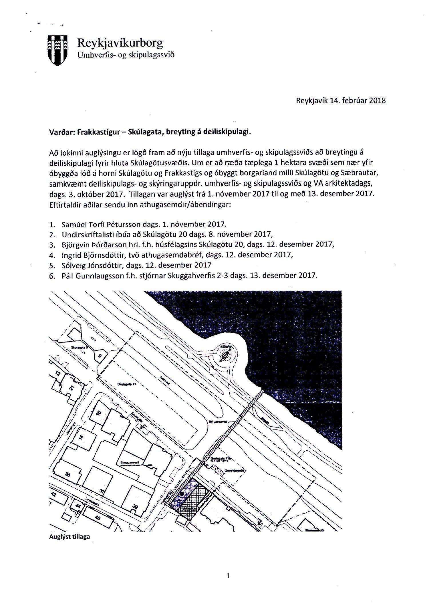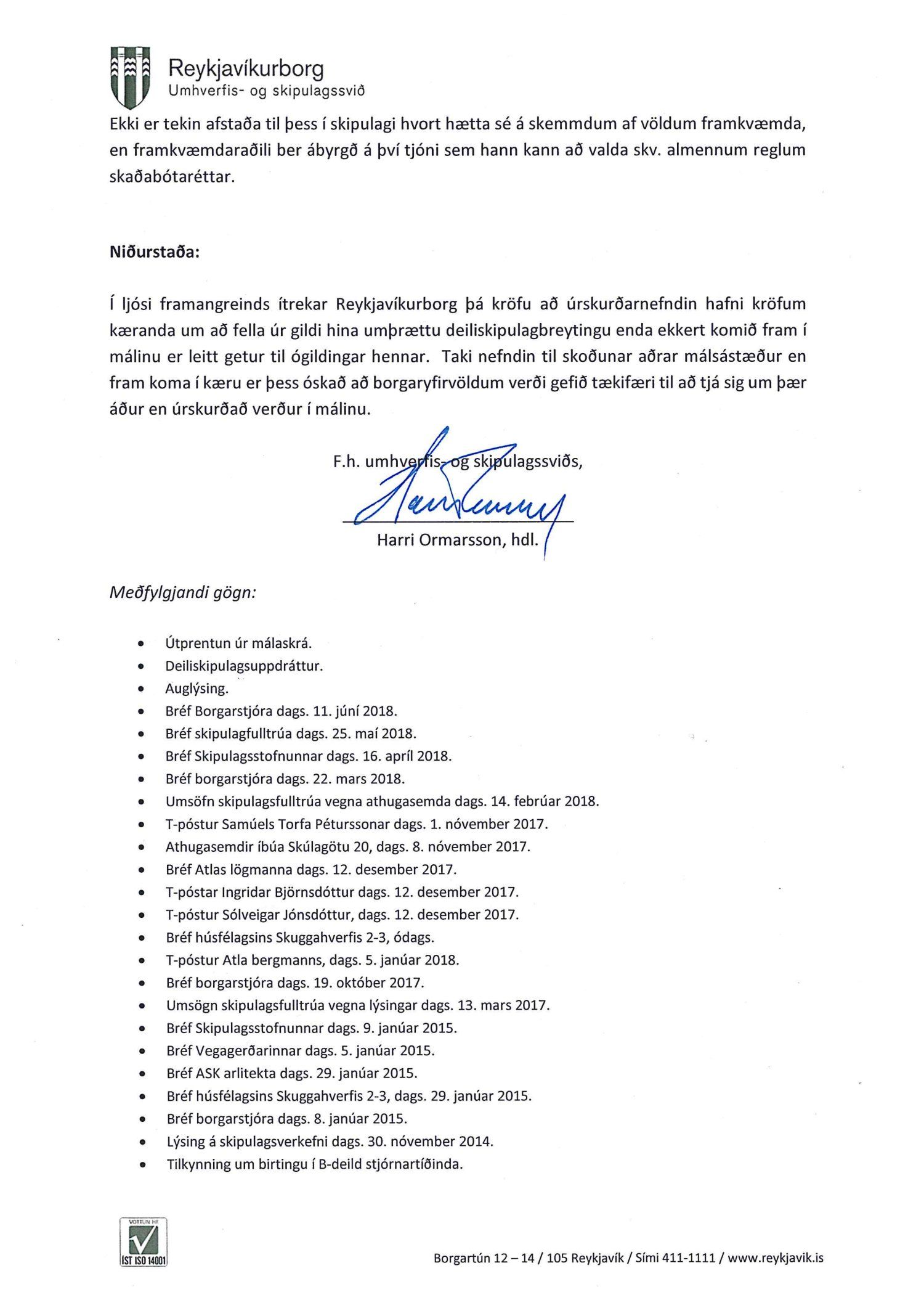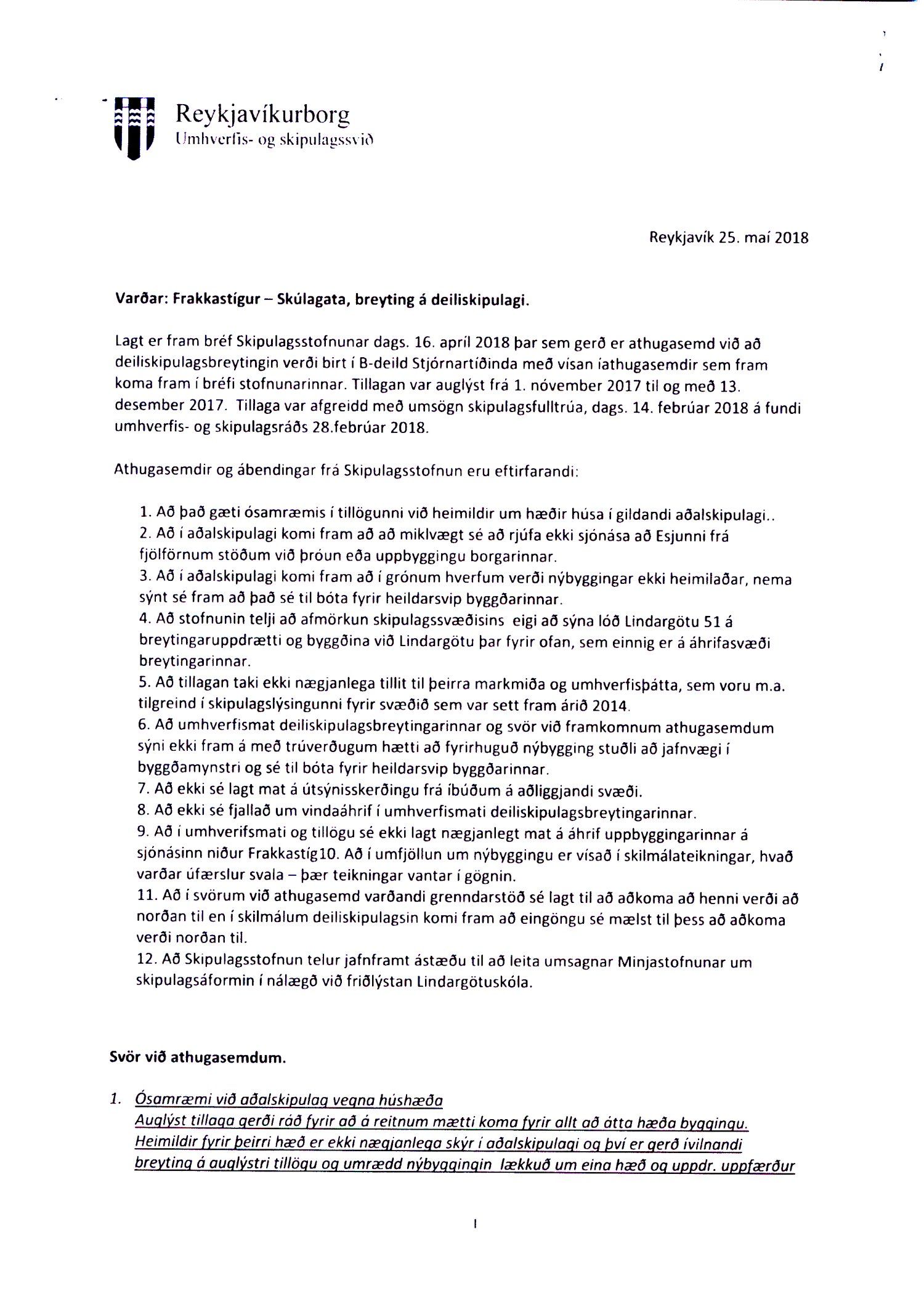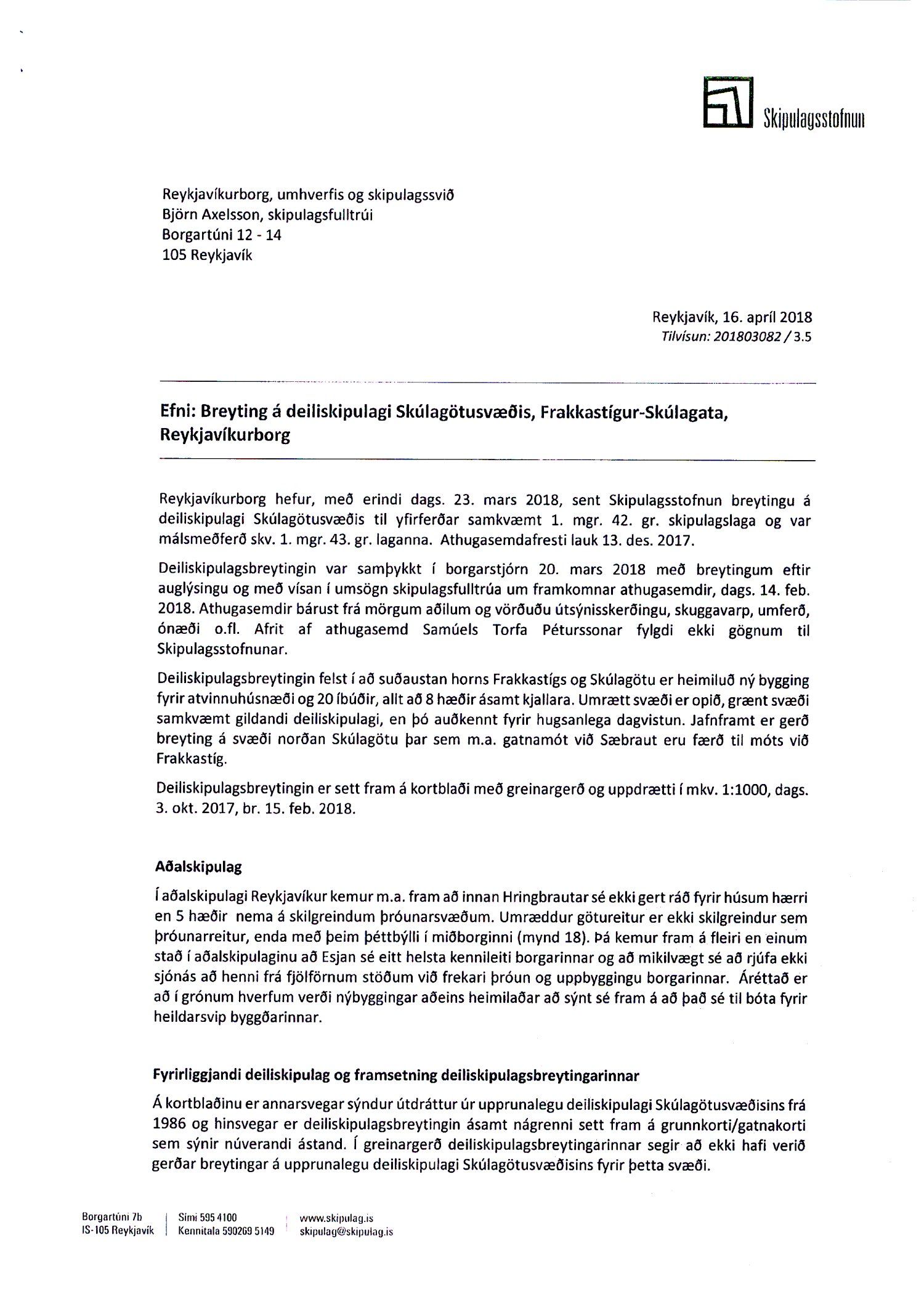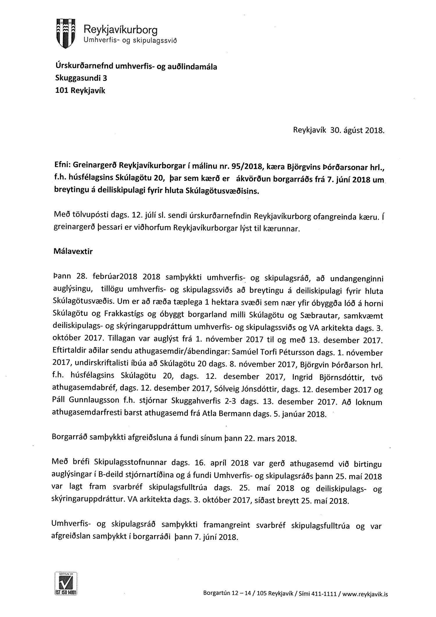 Lagt fram erindi úrskurðarnefndar umhverfis- og auðlindamála dags. 12. júlí 2018 ásamt kæru dags. 10. júlí 2018 þar sem kærð er ákvörðun um breytingu á deiliskipulagi fyrir hluta Skúlagötusvæðis, auglýst í B-deild Stjórnartíðinda 15. júní 2018. Einnig er lögð fram umsögn skipulagsfulltrúa dags. 30. ágúst 2018. Jafnframt er lagður fram úrskurður úrskurðarnefndar umhverfis- og auðlindamála frá 19. júlí 2019. Úrskurðarorð: Felld er úr gildi ákvörðun borgarráðs Reykjavíkurborgar frá 7. júní 2018 um að samþykkja breytingu á deiliskipulagi fyrir hluta Skúlagötusvæðis, að því er varðar fyrirhugaða byggingu að Frakkastíg 1.