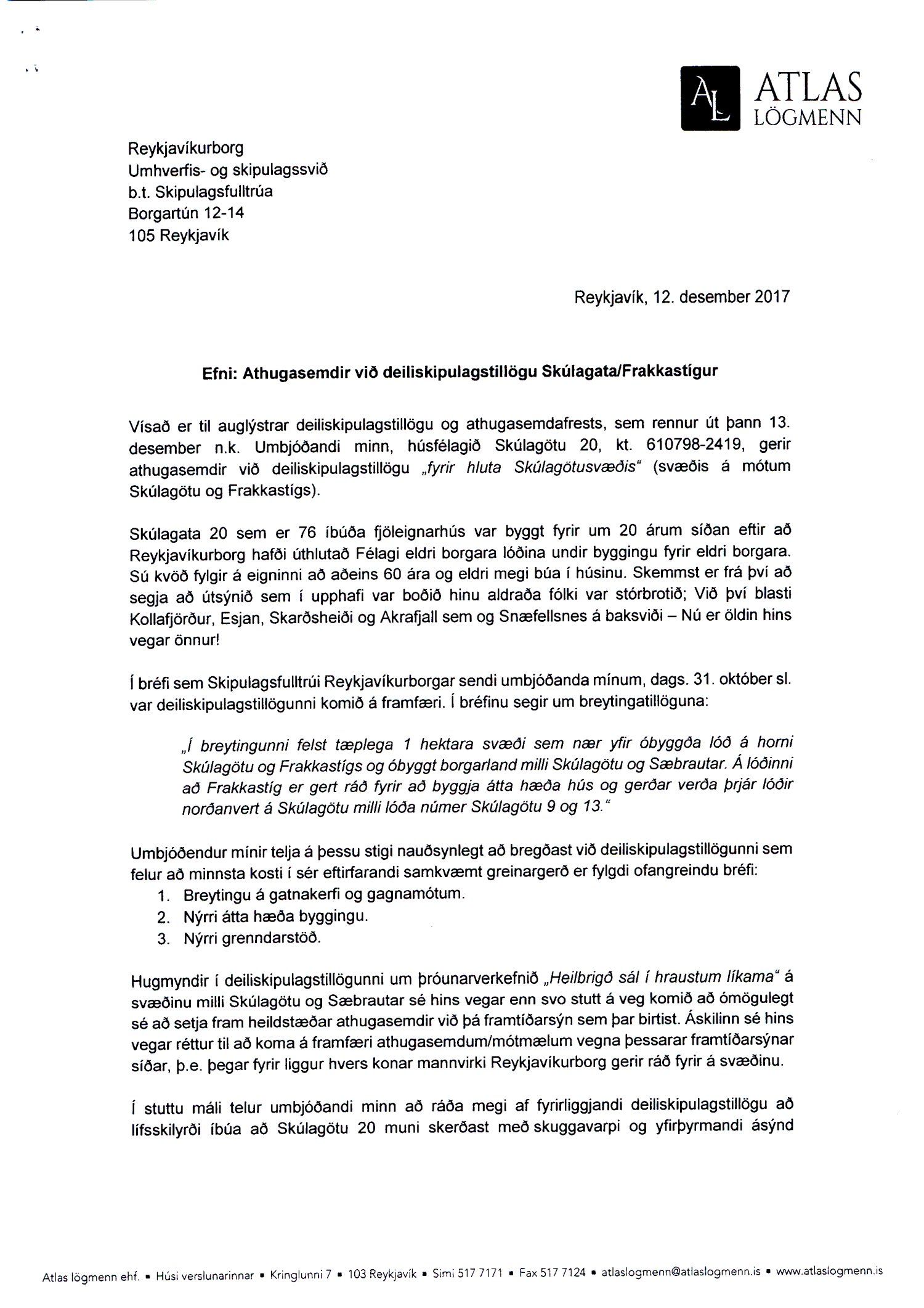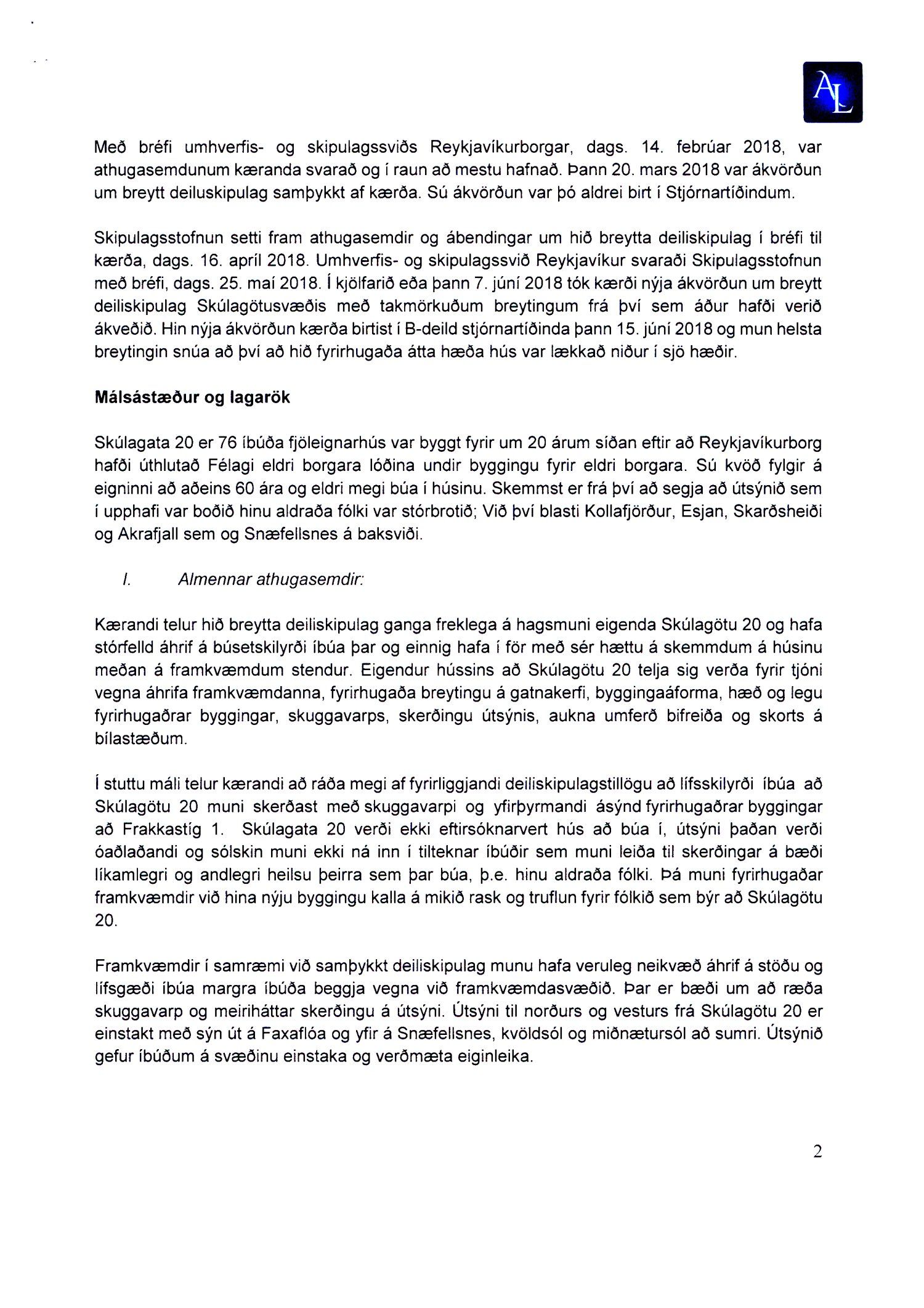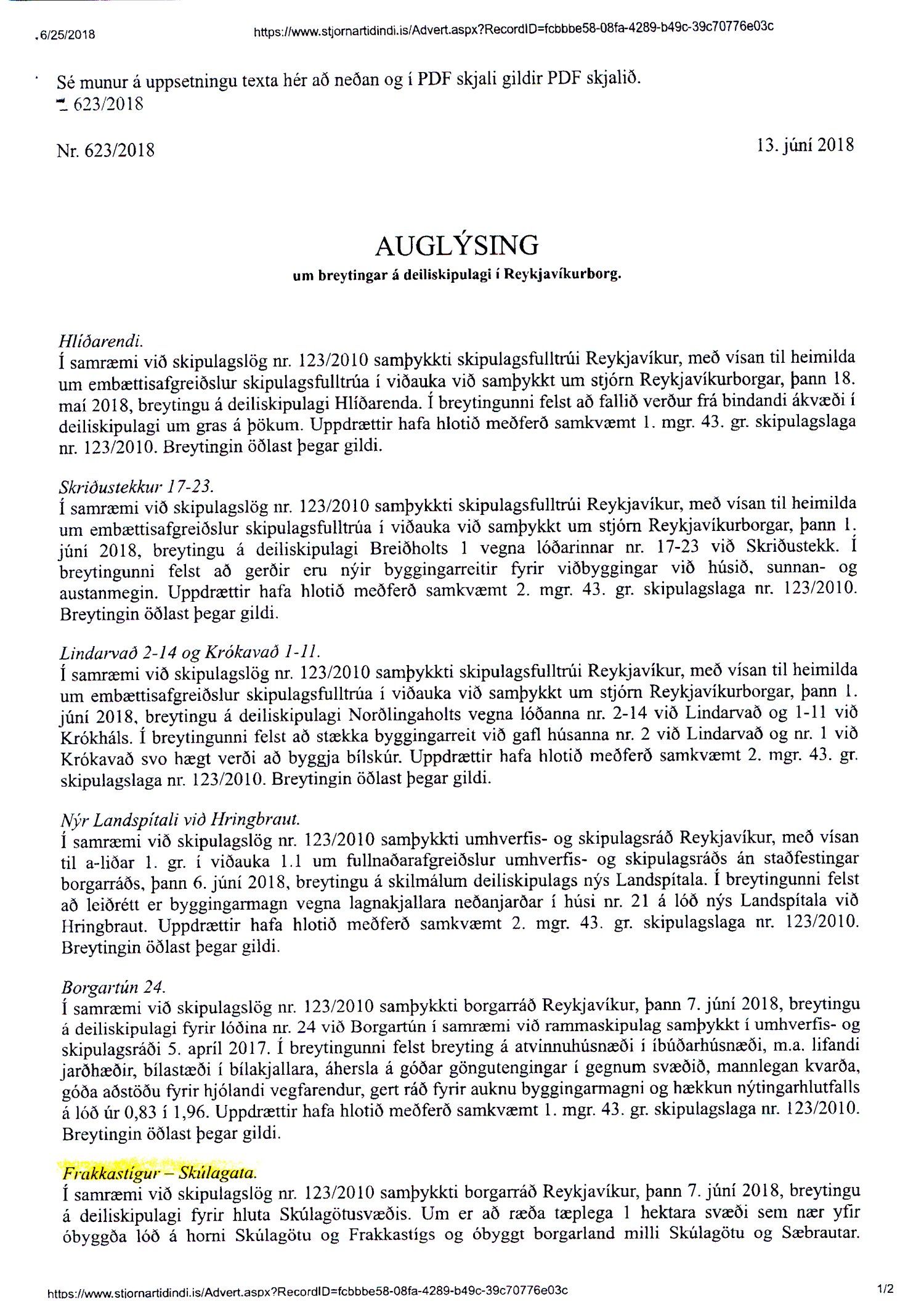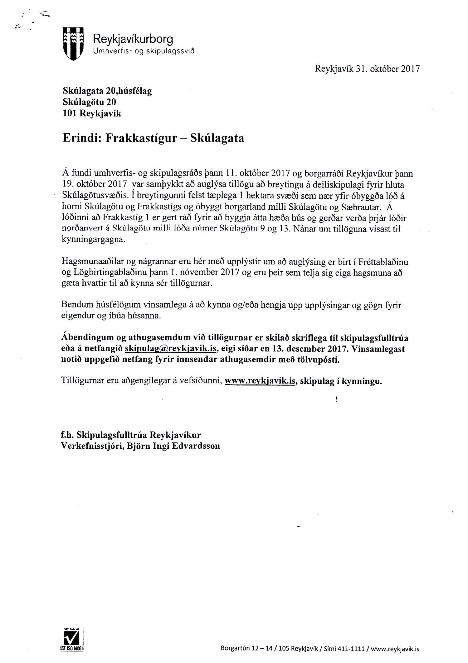 Lagt fram erindi úrskurðarnefndar umhverfis- og auðlindamála dags. 12. júlí 2018 ásamt kæru dags. 10. júlí 2018 þar sem kærð er ákvörðun um breytingu á deiliskipulagi fyrir hluta Skúlagötusvæðis, auglýst í B-deild Stjórnartíðinda 15. júní 2018. Einnig er lögð fram umsögn skipulagsfulltrúa dags. 30. ágúst 2018. Jafnframt er lagður fram úrskurður úrskurðarnefndar umhverfis- og auðlindamála frá 19. júlí 2019. Úrskurðarorð: Felld er úr gildi ákvörðun borgarráðs Reykjavíkurborgar frá 7. júní 2018 um að samþykkja breytingu á deiliskipulagi fyrir hluta Skúlagötusvæðis, að því er varðar fyrirhugaða byggingu að Frakkastíg 1.