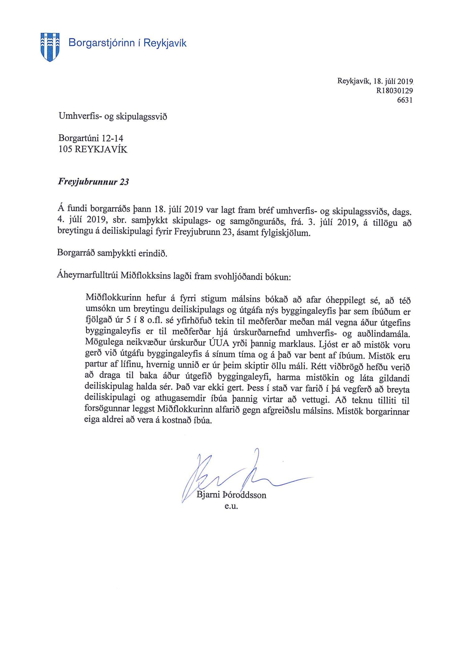 Lagt fram bréf borgarstjóra dags. 18. júlí 2019 vegna samþykktar borgarráðs s.d. á tillögu að breytingu á deiliskipulagi fyrir Freyjubrunn 23.