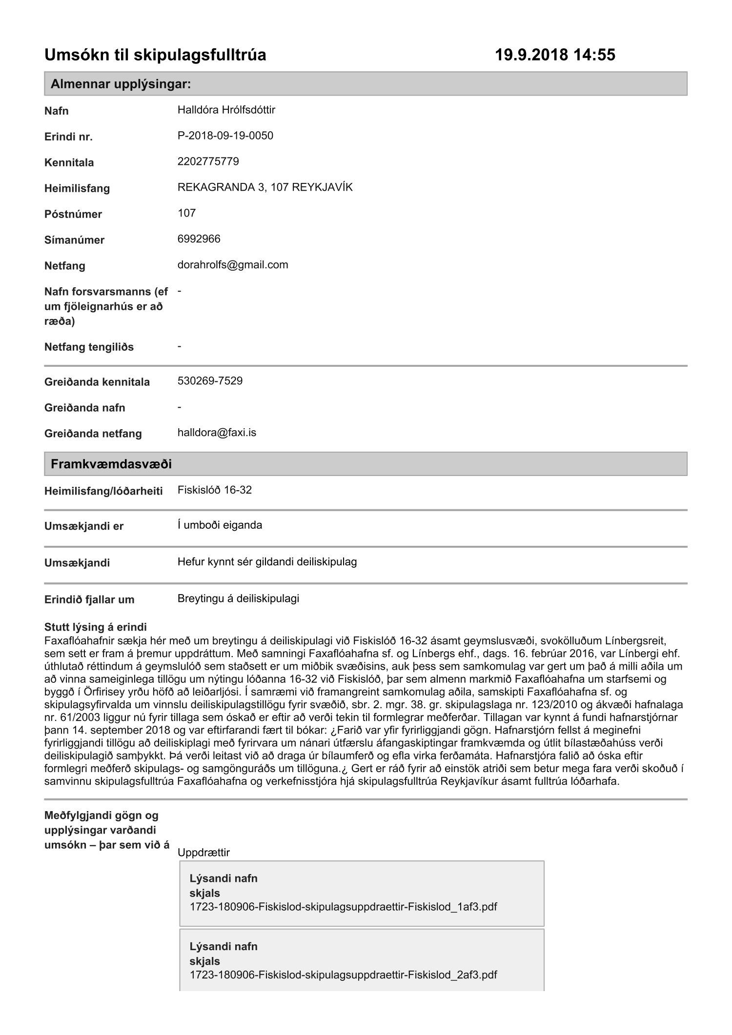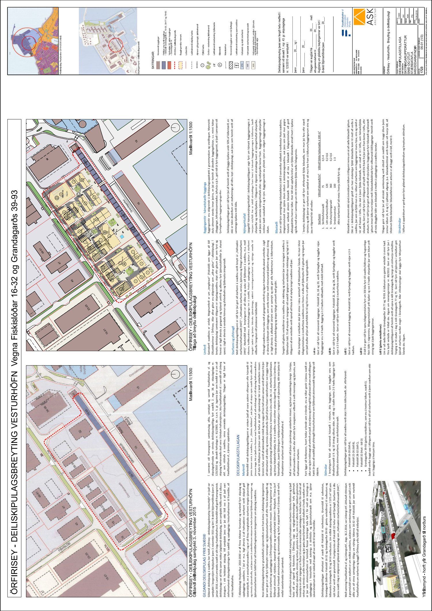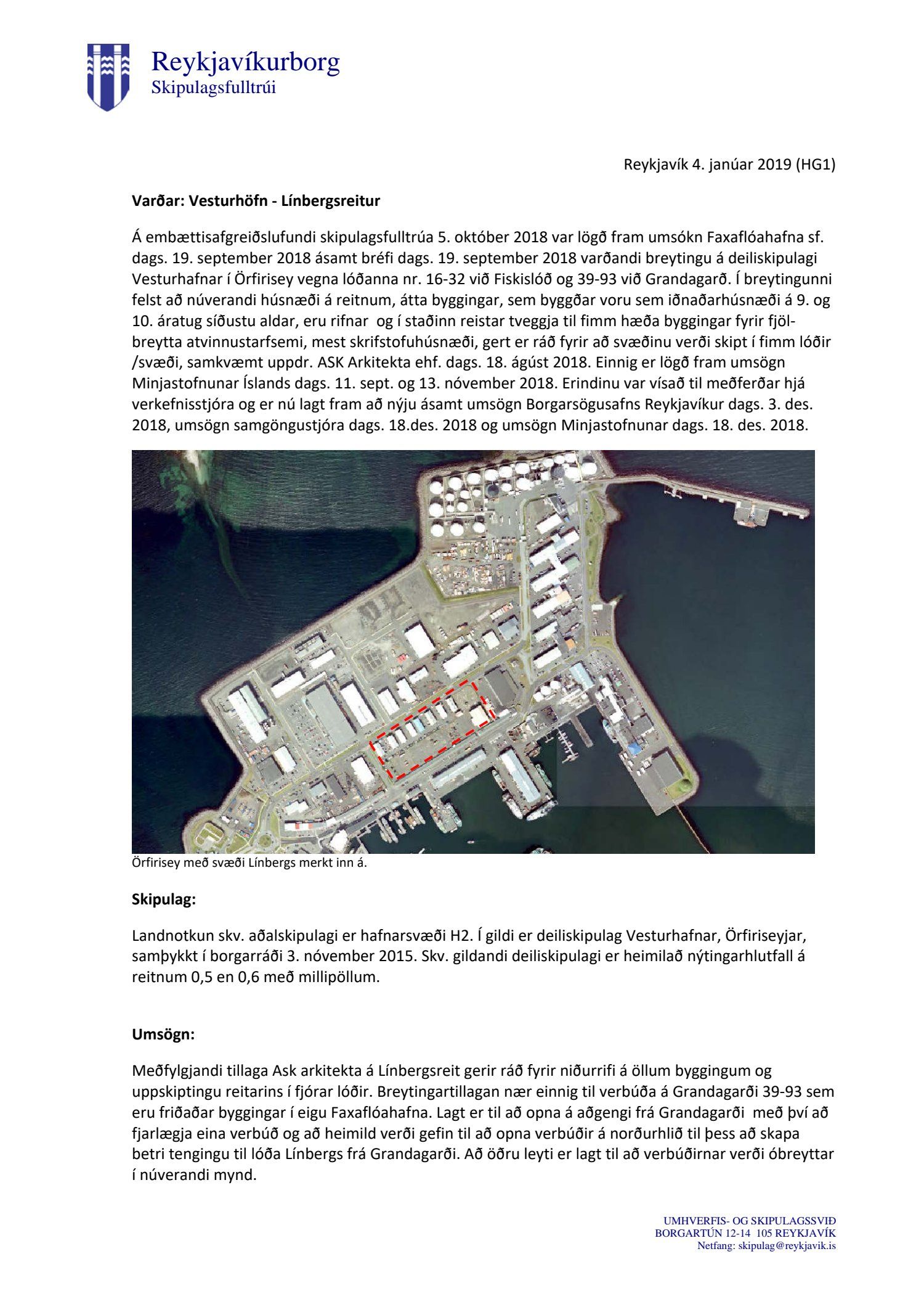 dags. 19. september 2018 ásamt bréfi dags. 19. september 2018 varðandi breytingu á deiliskipulagi Vesturhafnar í Örfirisey vegna lóðanna nr. 16-32 við Fiskislóð og 39-93 við Grandagarð. Í breytingunni felst að núverandi húsnæði á reitnum, átta byggingar, sem byggðar voru sem iðnaðarhúsnæði á 9. og 10. áratug síðustu aldar, eru rifnar og í staðinn reistar tveggja til fimm hæða byggingar fyrir fjölbreytta atvinnustarfsemi, mest skrifstofuhúsnæði, gert er ráð fyrir að svæðinu verði skipt í fimm lóðir/svæði, samkvæmt uppdr.
