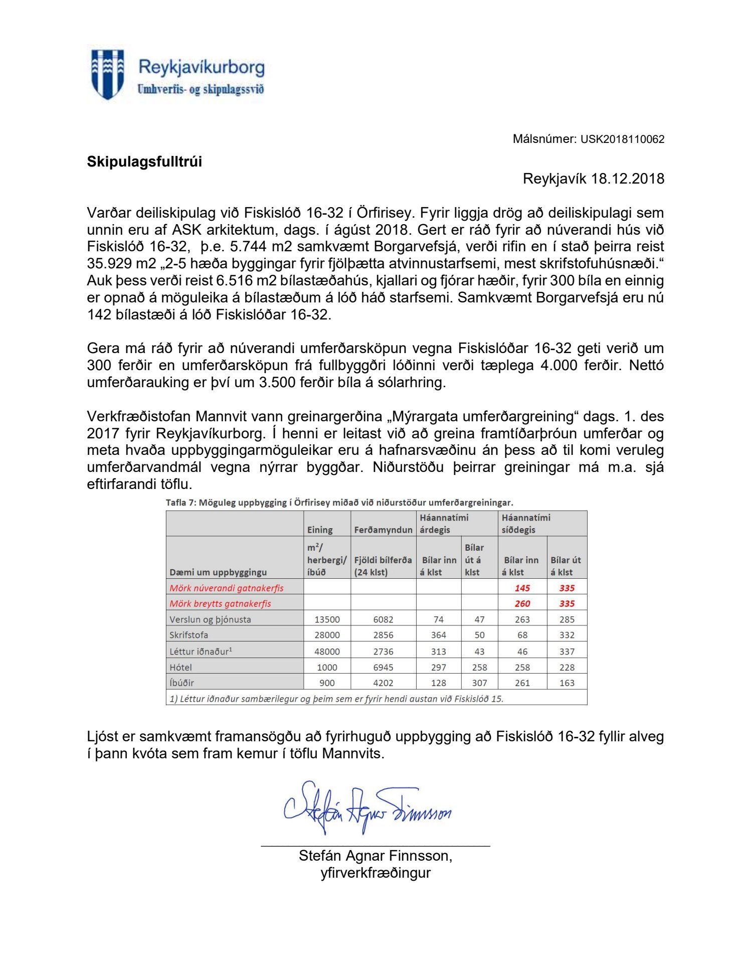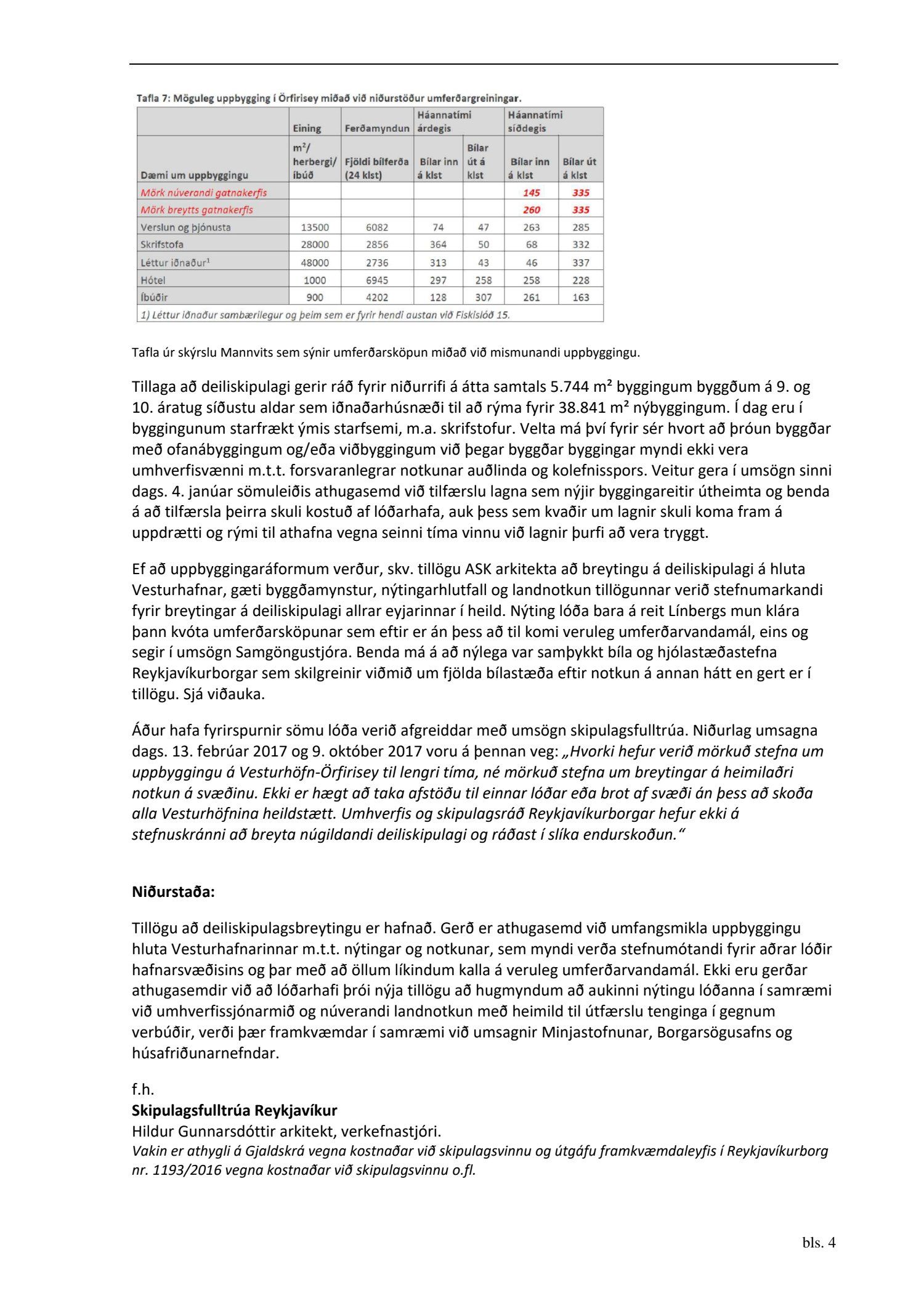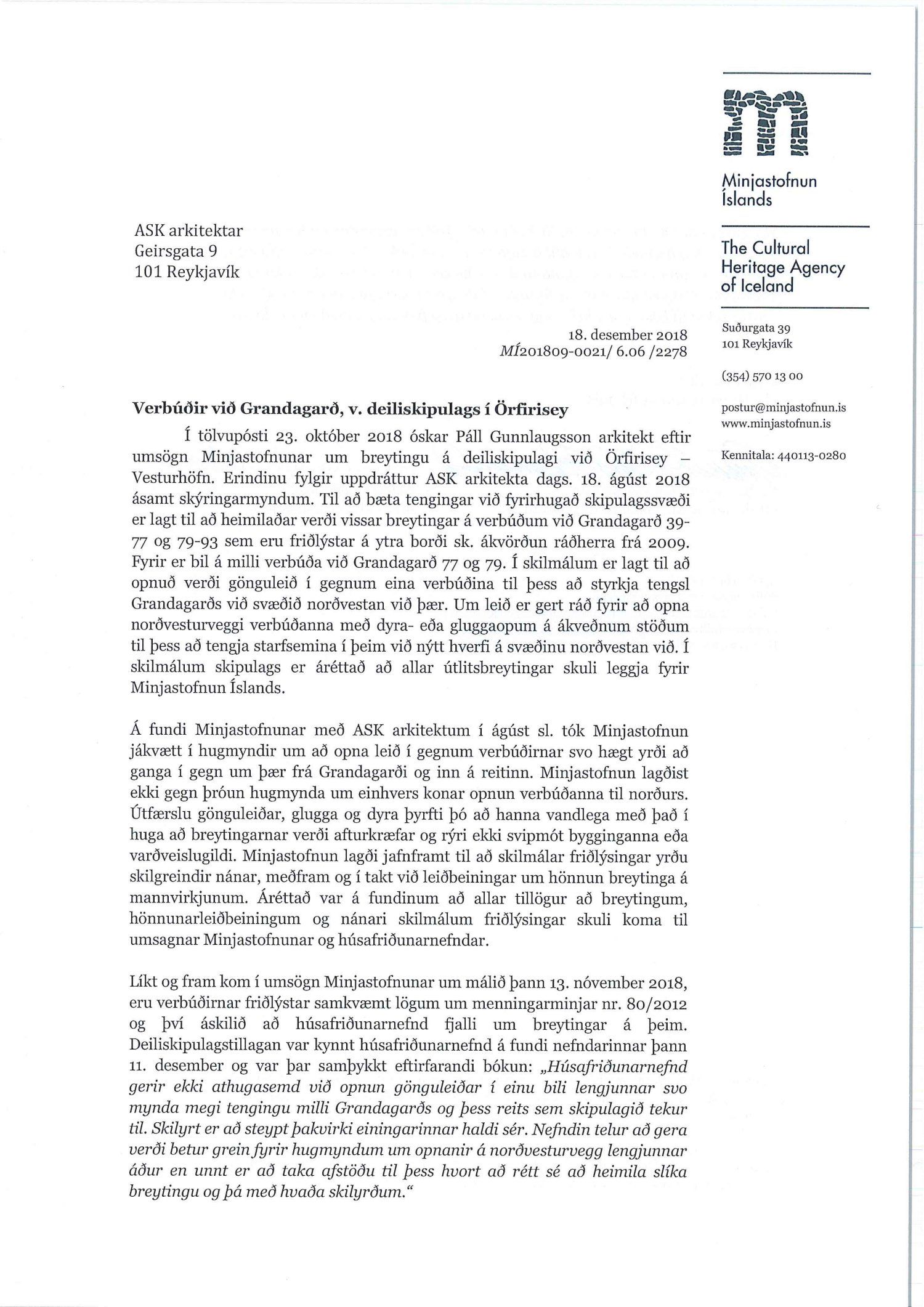dags. 19. september 2018 ásamt bréfi dags. 19. september 2018 varðandi breytingu á deiliskipulagi Vesturhafnar í Örfirisey vegna lóðanna nr. 16-32 við Fiskislóð og 39-93 við Grandagarð. Í breytingunni felst að núverandi húsnæði á reitnum, átta byggingar, sem byggðar voru sem iðnaðarhúsnæði á 9. og 10. áratug síðustu aldar, eru rifnar og í staðinn reistar tveggja til fimm hæða byggingar fyrir fjölbreytta atvinnustarfsemi, mest skrifstofuhúsnæði, gert er ráð fyrir að svæðinu verði skipt í fimm lóðir/svæði, samkvæmt uppdr.