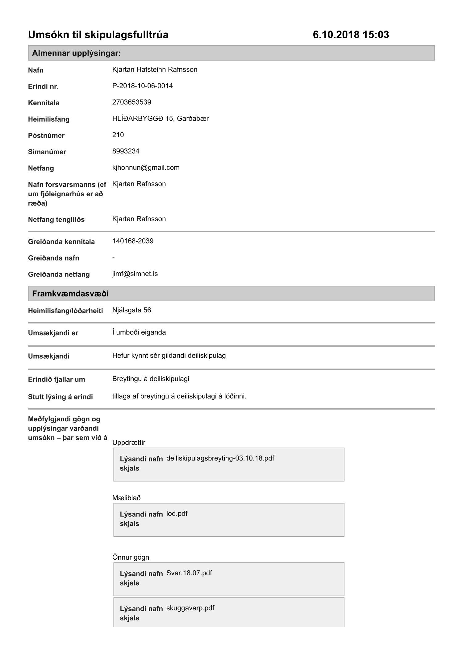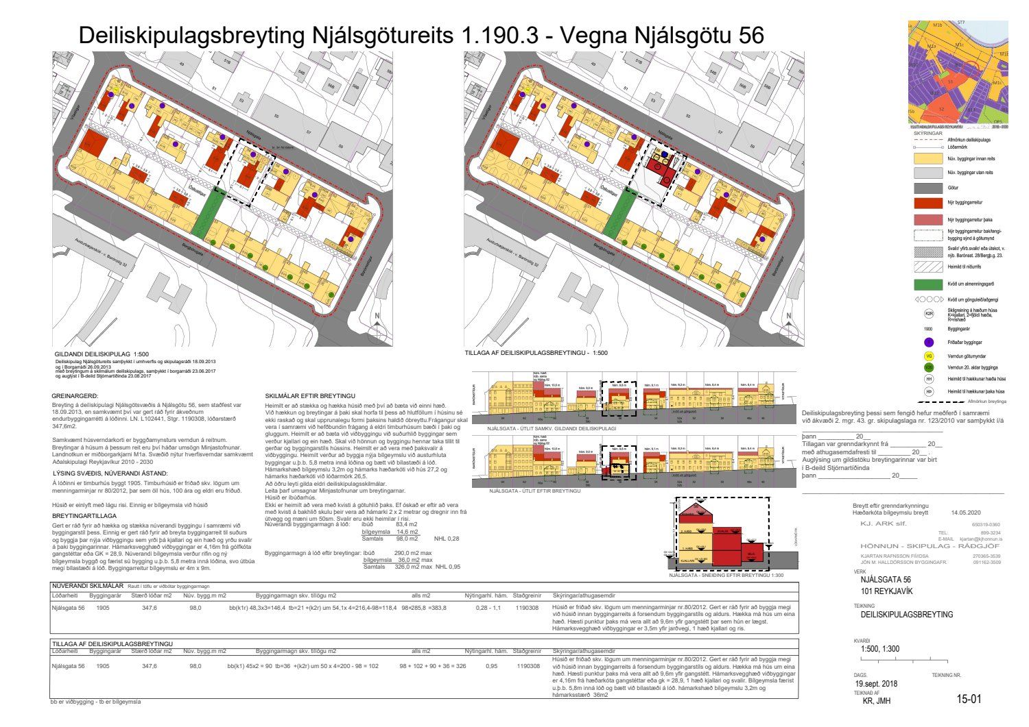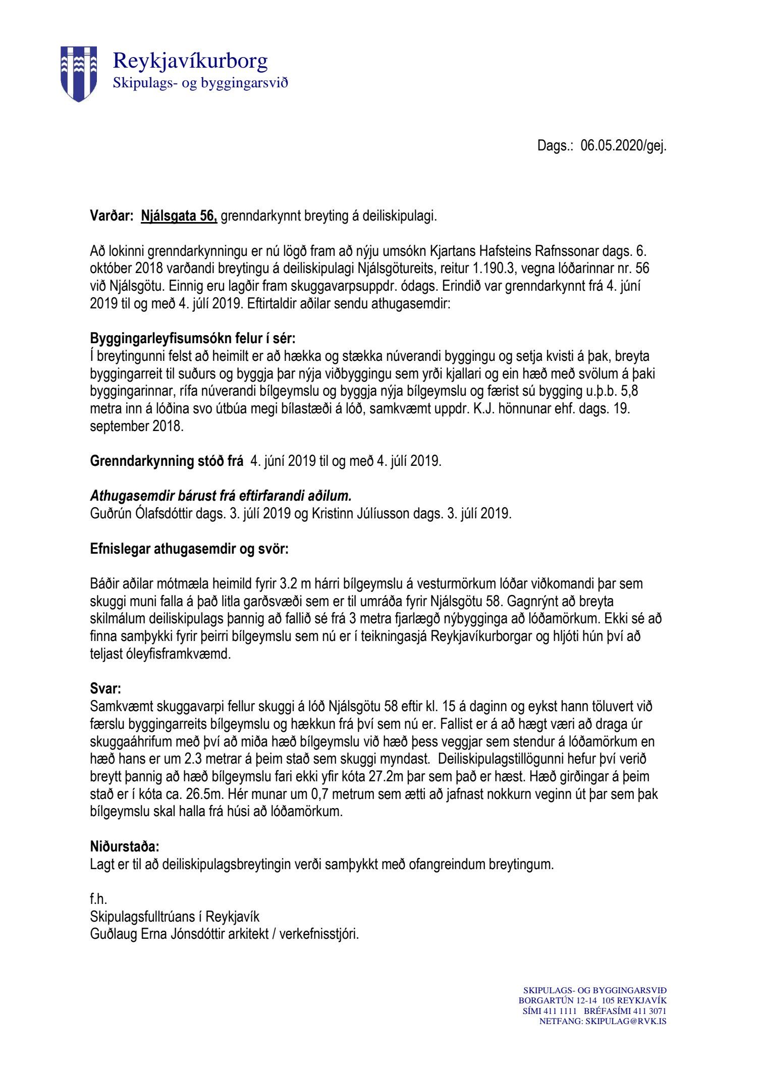 Lögð fram umsókn Kjartans Hafsteins Rafnssonar, dags. 6. október 2018, varðandi breytingu á deiliskipulagi Njálsgötureits, reitur 1.190.3, vegna lóðarinnar nr. 56 við Njálsgötu. Í breytingunni felst að heimilt er að hækka og stækka núverandi byggingu og setja kvisti á þak, breyta byggingarreit til suðurs og byggja þar nýja viðbyggingu sem yrði kjallari og ein hæð með svölum á þaki byggingarinnar, rífa núverandi bílgeymslu og byggja nýja bílgeymslu og færist sú bygging u.þ.b. 5,8 metra inn á lóðina svo útbúa megi bílastæði á lóð, samkvæmt uppdr. K.J. hönnunar ehf. dags. 19. september 2018 br. 14. maí 2020. Einnig eru lagðir fram skuggavarpsuppdr. ódags. Erindið var grenndarkynnt frá 4. júní 2019 til og með 4. júlí 2019. Eftirtaldir aðilar sendu athugasemdir: Guðrún Ólafsdóttir dags. 3. júlí 2019 og Kristinn Júlíusson dags. 3. júlí 2019. Einnig er lögð fram umsögn skipulagsfulltrúa, dags. 6. maí 2020.