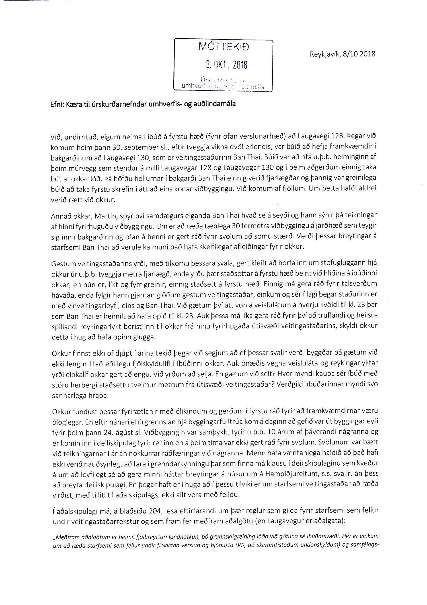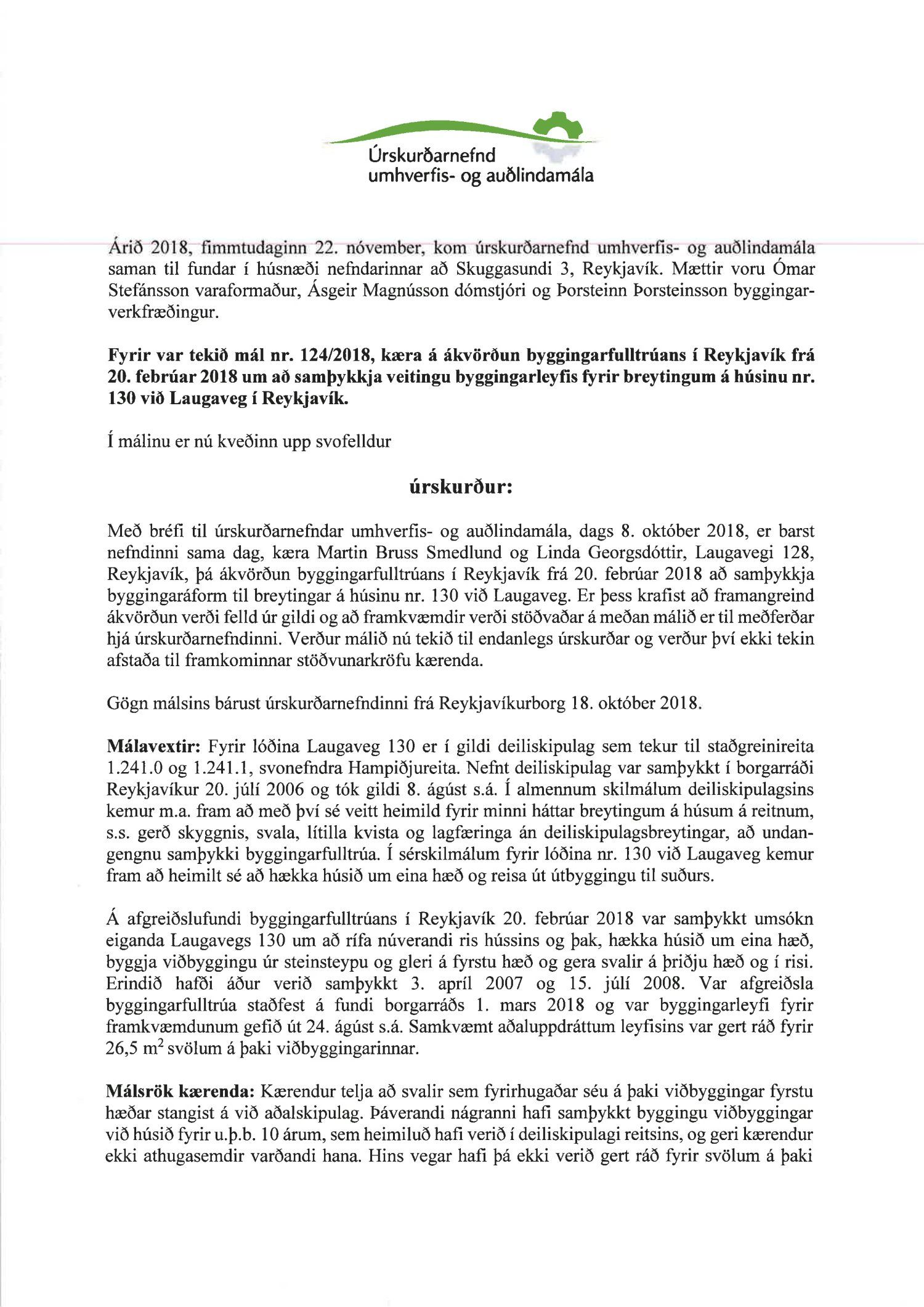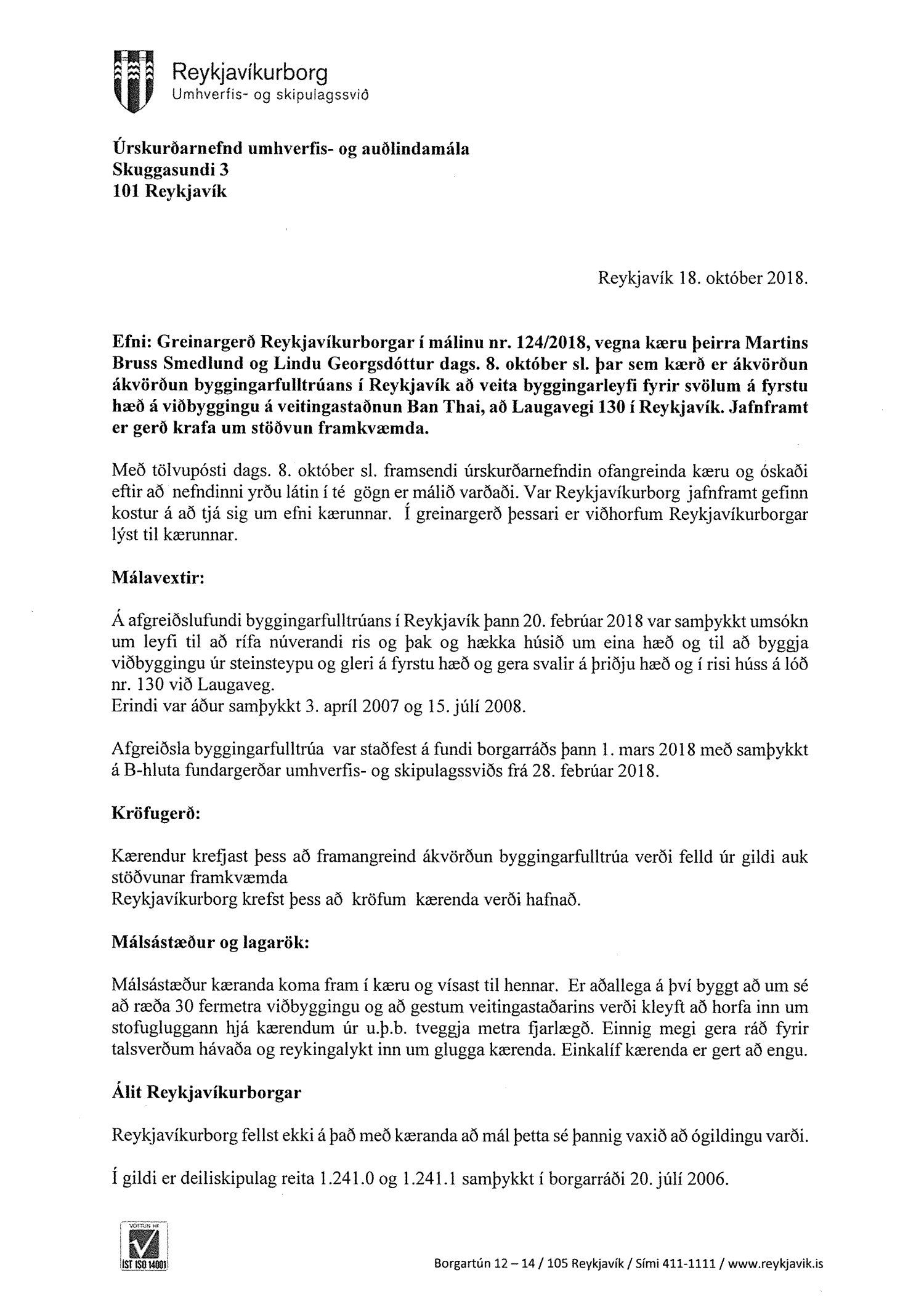 Lagt fram erindi úrskurðarnefndar umhverfis- og auðlindamála dags. 8. október 2018 ásamt kæru dags. 8. október 2018 þar sem kærð er ákvörðun um að beita byggingarleyfi fyrir svölum á fyrstu hæð á viðbyggingu á veitingastaðnum Ban Thai að Laugavegi 130. Einnig er lögð fram umsögn skrifstofu sviðsstjóra dags. 18. október 2018. Jafnframt er lagður fram úrskurður úrskurðarnefnda umhverfis- og auðlindamála frá 22. nóvember 2018. Úrskurðarorð: Hafnað er kröfu um ógildingu ákvörðunar byggingarfulltrúans í Reykjavík frá 20. febrúar 2018 um að veita byggingarleyfi til breytinga á húsinu nr. 130 við Laugaveg.