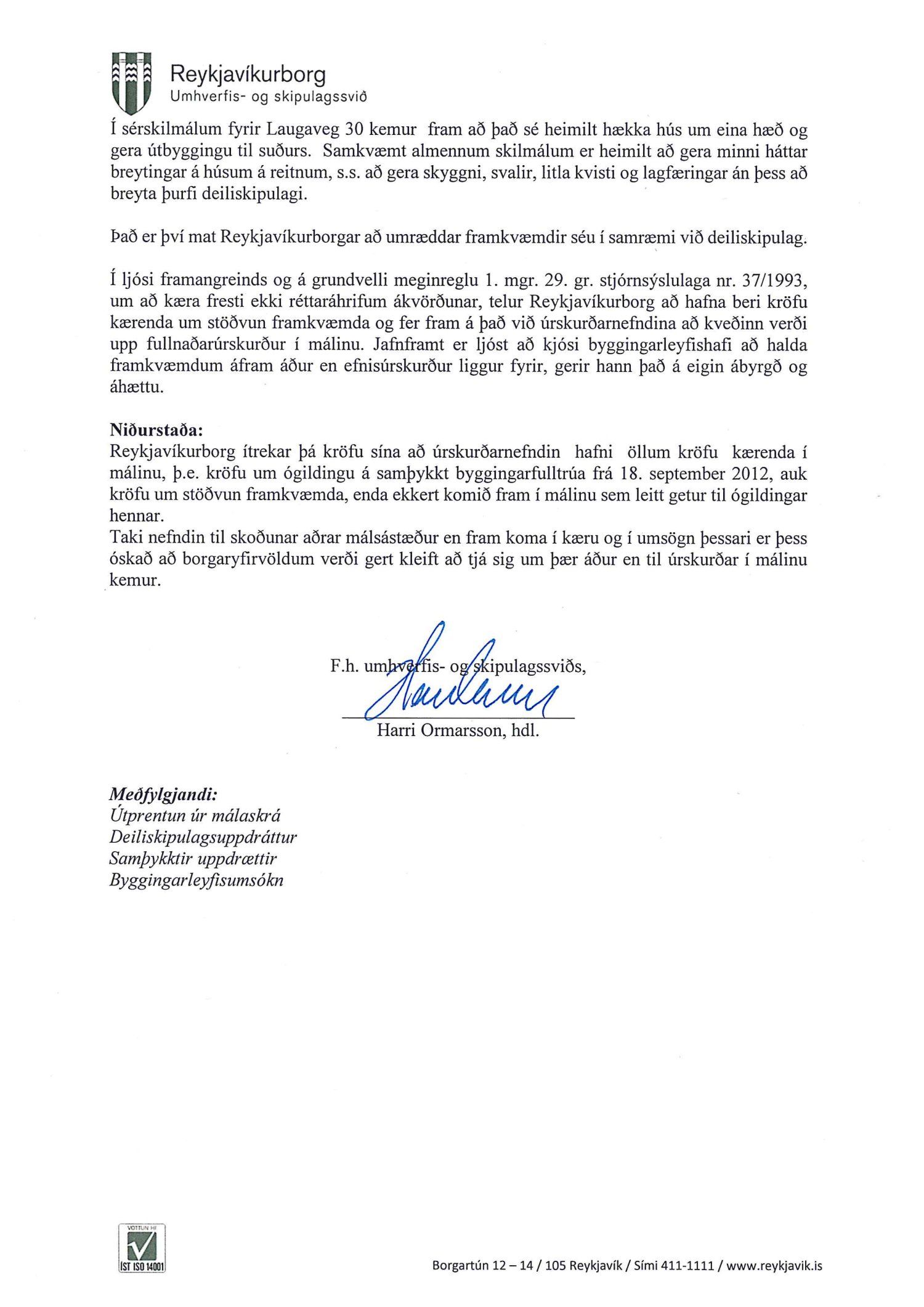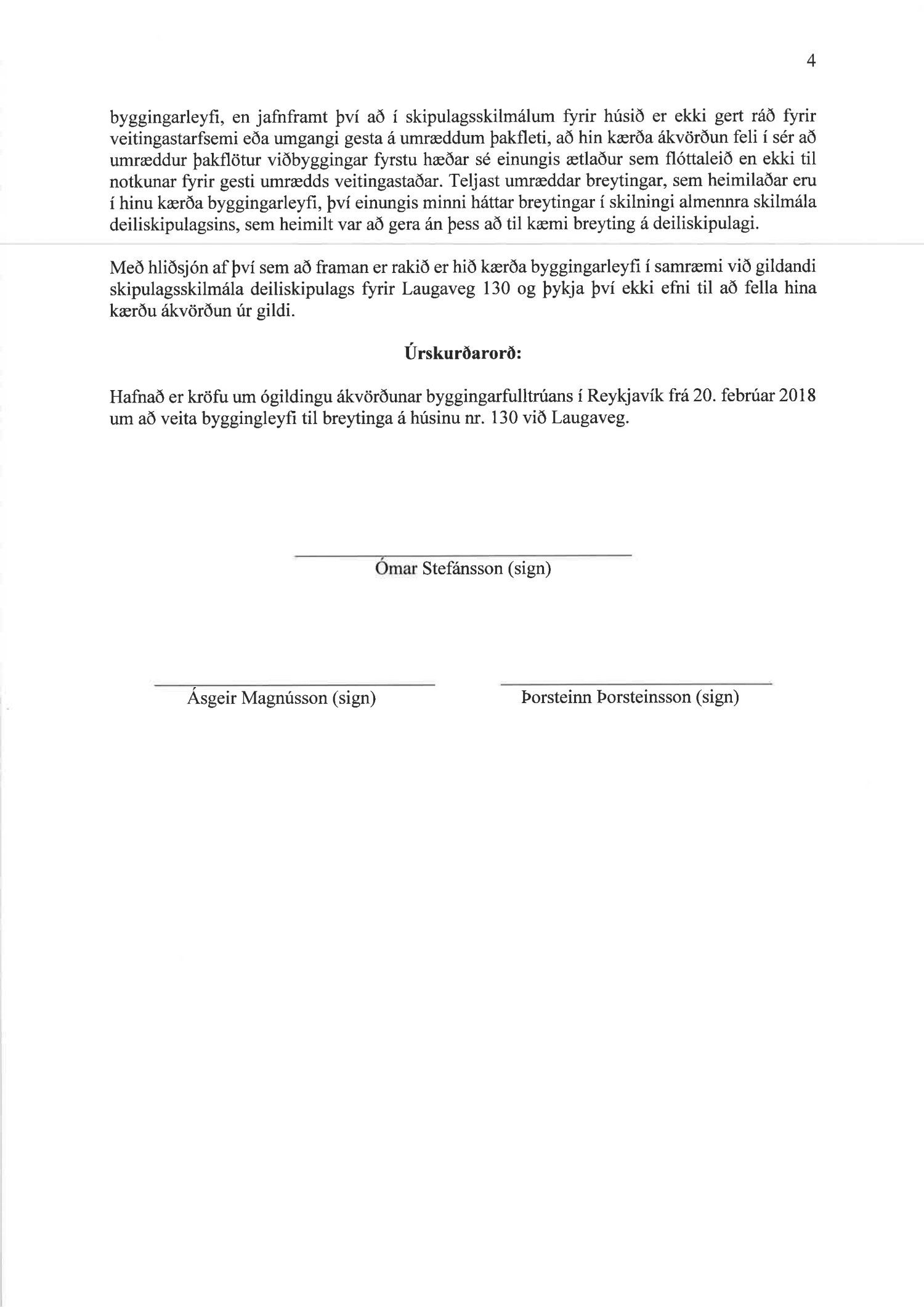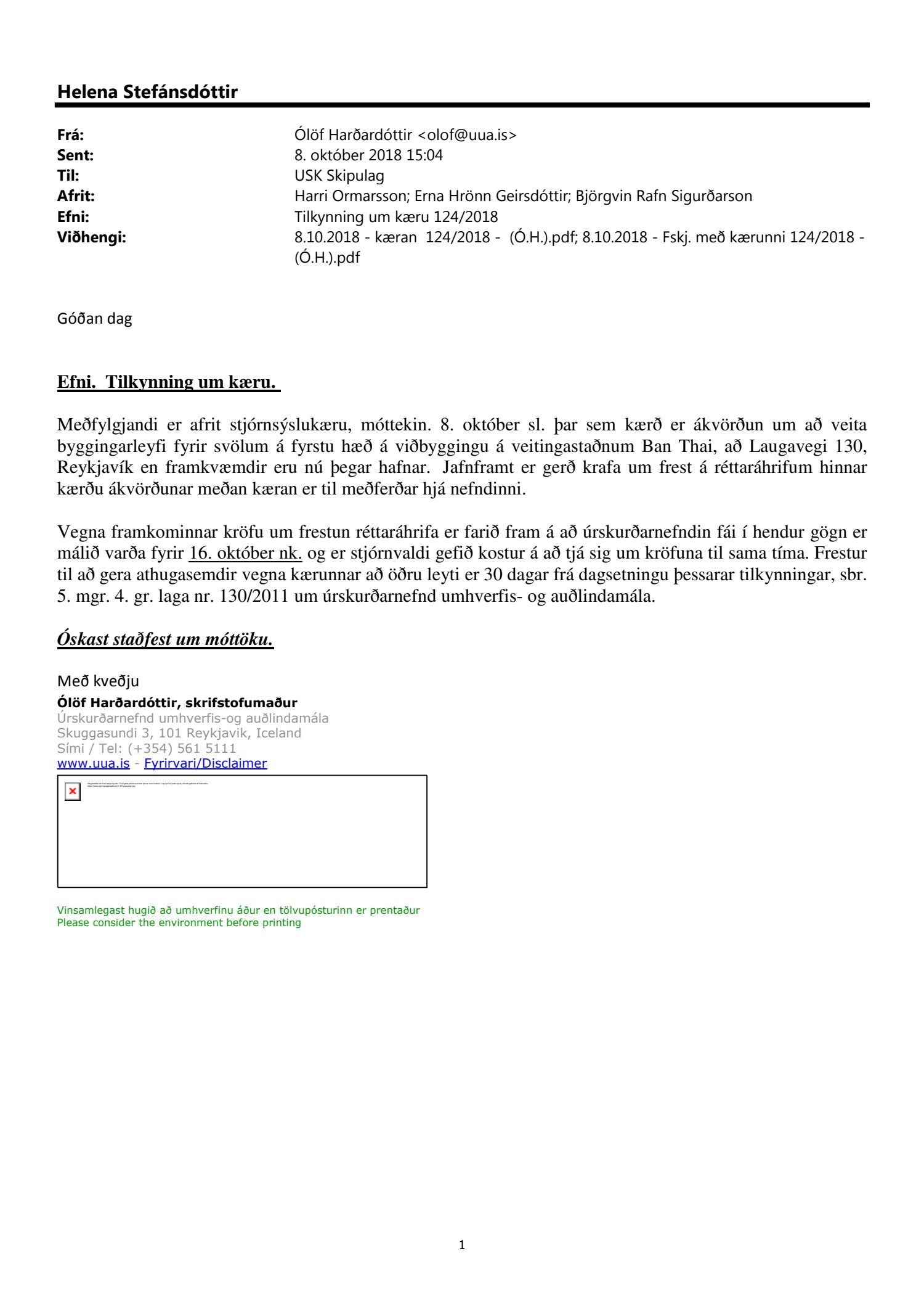 Lagt fram erindi úrskurðarnefndar umhverfis- og auðlindamála dags. 8. október 2018 ásamt kæru dags. 8. október 2018 þar sem kærð er ákvörðun um að beita byggingarleyfi fyrir svölum á fyrstu hæð á viðbyggingu á veitingastaðnum Ban Thai að Laugavegi 130. Einnig er lögð fram umsögn skrifstofu sviðsstjóra dags. 18. október 2018. Jafnframt er lagður fram úrskurður úrskurðarnefnda umhverfis- og auðlindamála frá 22. nóvember 2018. Úrskurðarorð: Hafnað er kröfu um ógildingu ákvörðunar byggingarfulltrúans í Reykjavík frá 20. febrúar 2018 um að veita byggingarleyfi til breytinga á húsinu nr. 130 við Laugaveg.