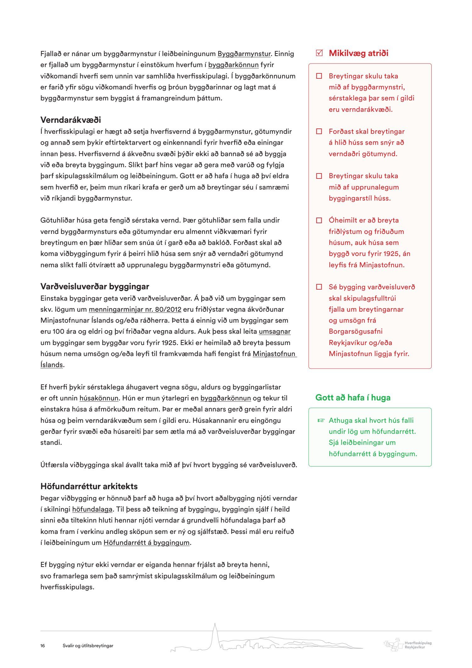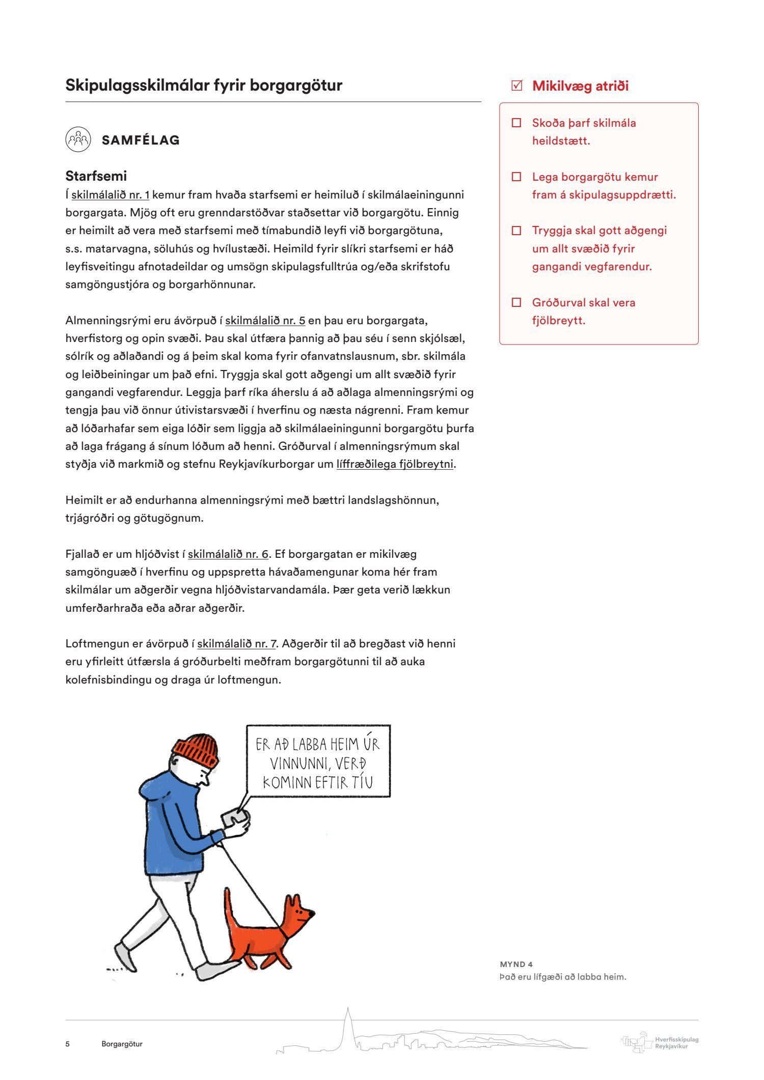 Lagðar fram og kynntar leiðbeiningar um 1. þakbreytingar, 2. svalir og útlitsbreytingar, 3. borgarbúskap, 4. almenningsrými og 5. borgargötur.