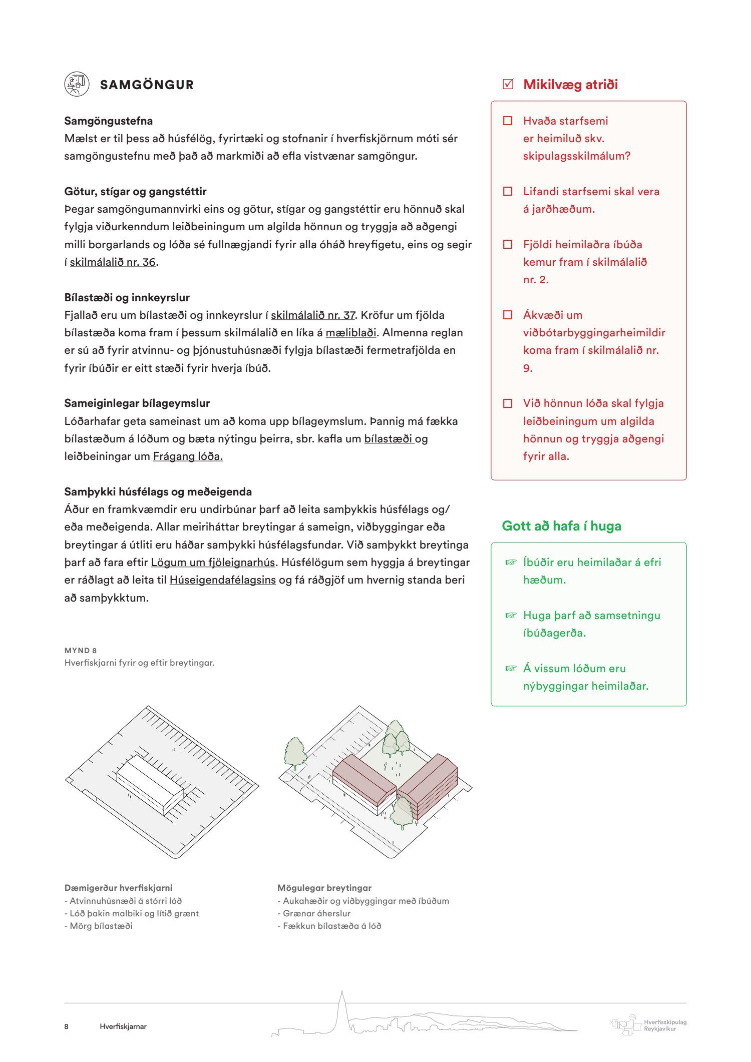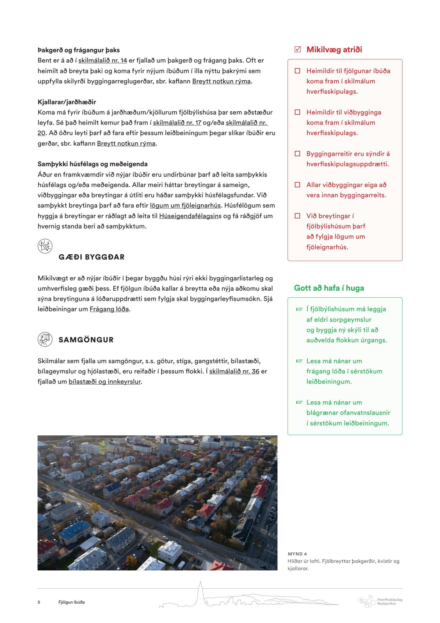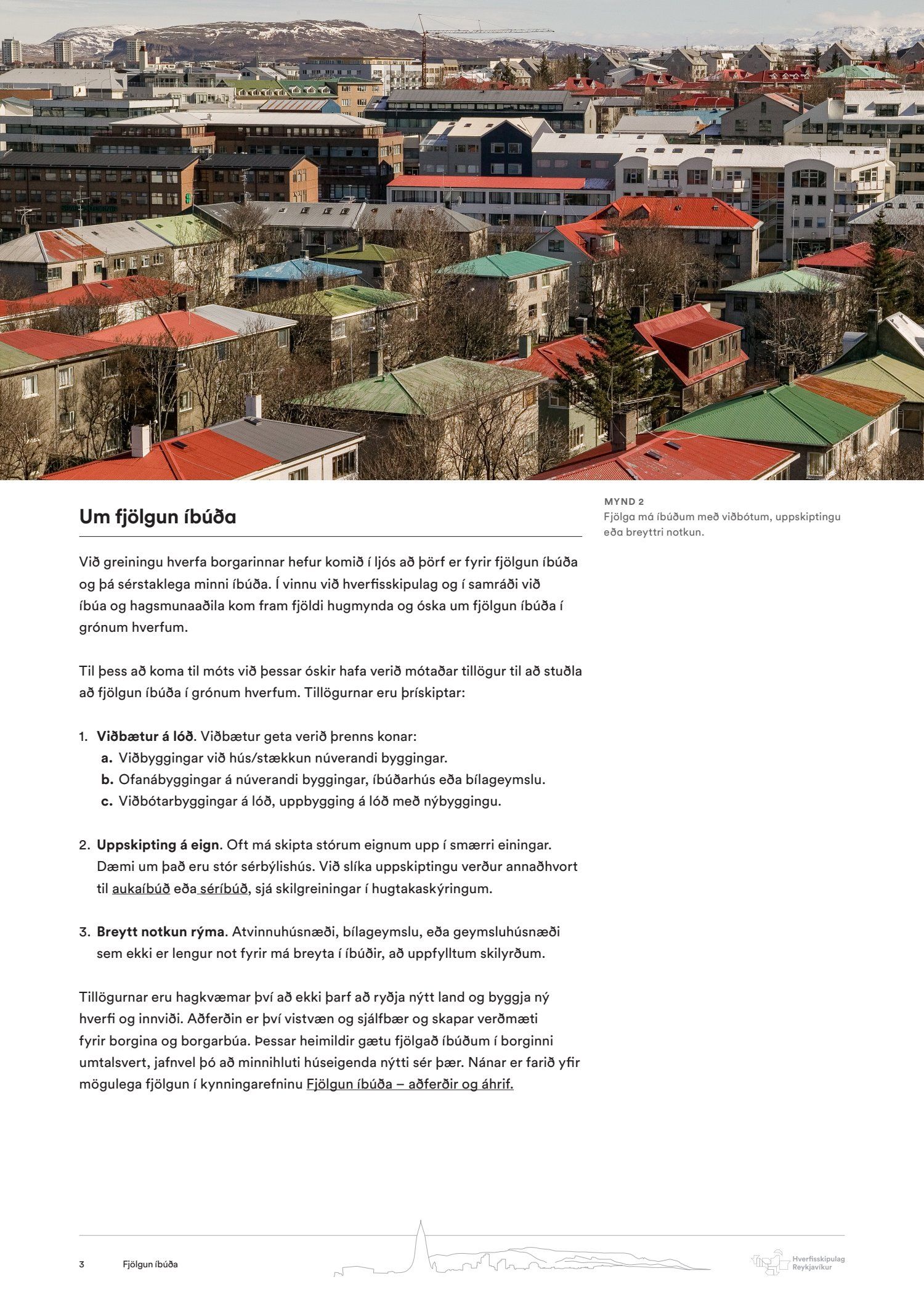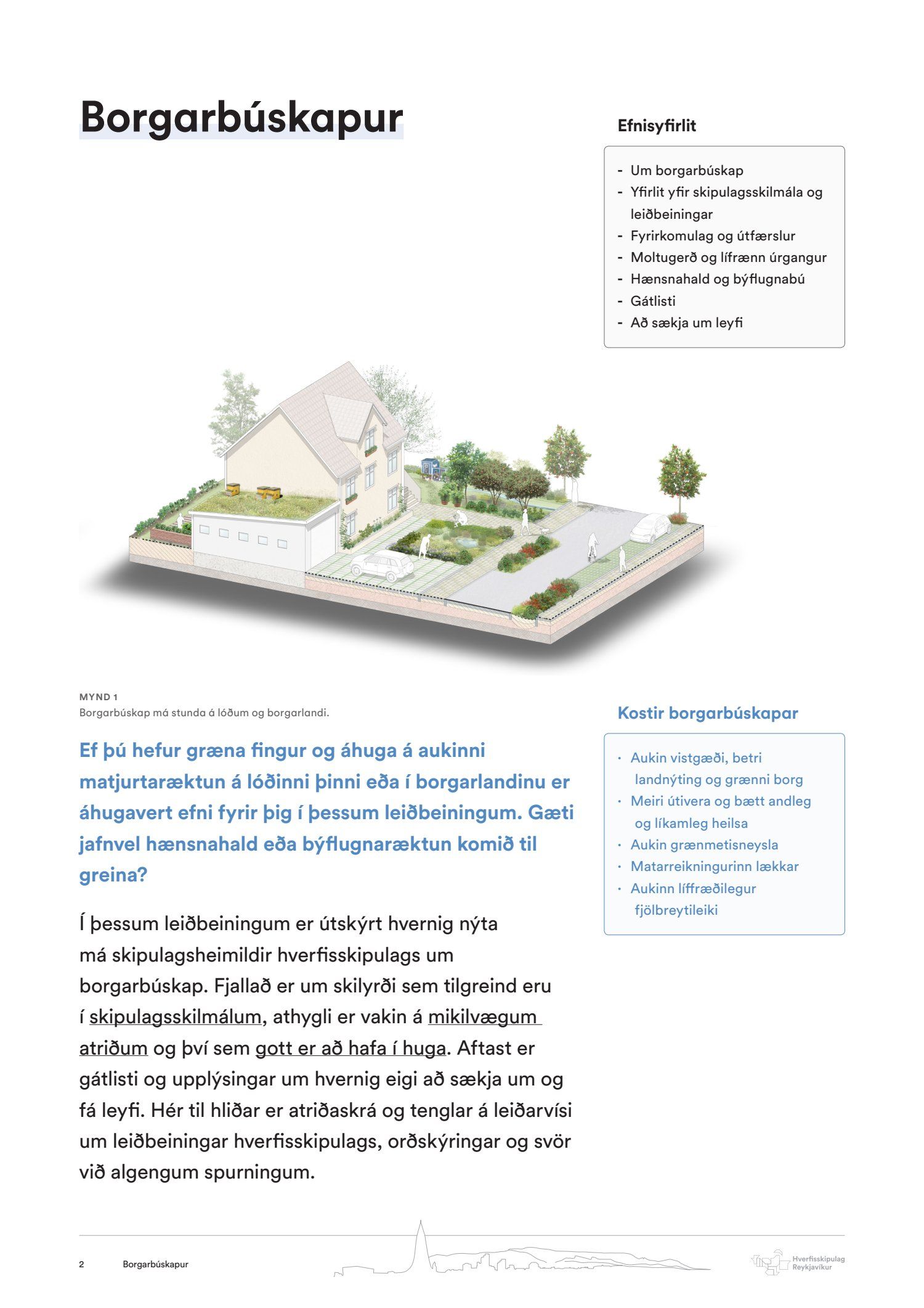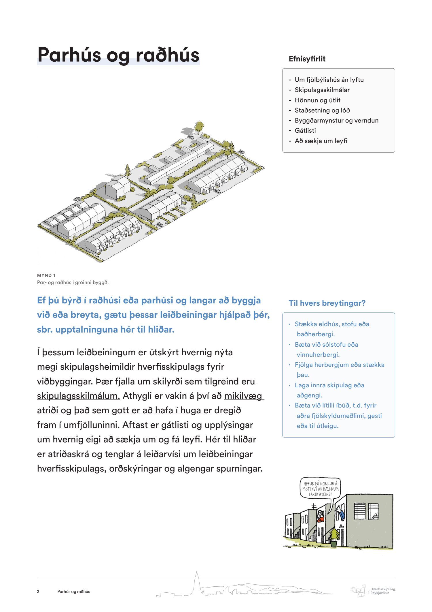 Lagðar fram leiðbeiningar um 1. Starfsemi í íbúðabyggð, 2. Fjölgun íbúða, 3. Viðbyggingar við einbýlishús, 4. Parhús og raðhús, 5. Fjölbýlishús án lyftu, 6. Borgarbúskapur, 7. Borgargötur, 8. Hverfiskjarnar, 9. Þakbreytingar, 10. svalir og útlitsbreytingar á húsum, 11. Almenningsrými, 12. Ljósvist, 13. Útfærsla lóða og 14. Blágrænar ofanvatnslausnir.